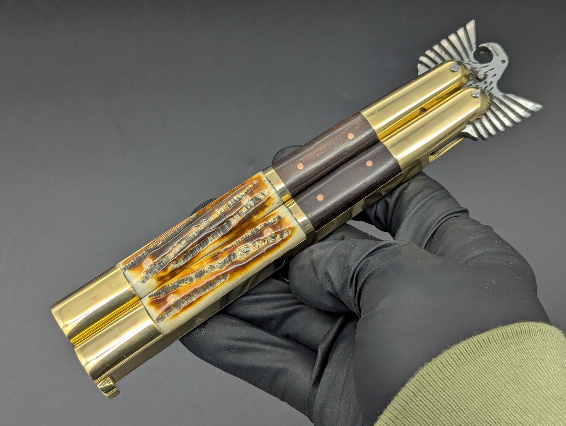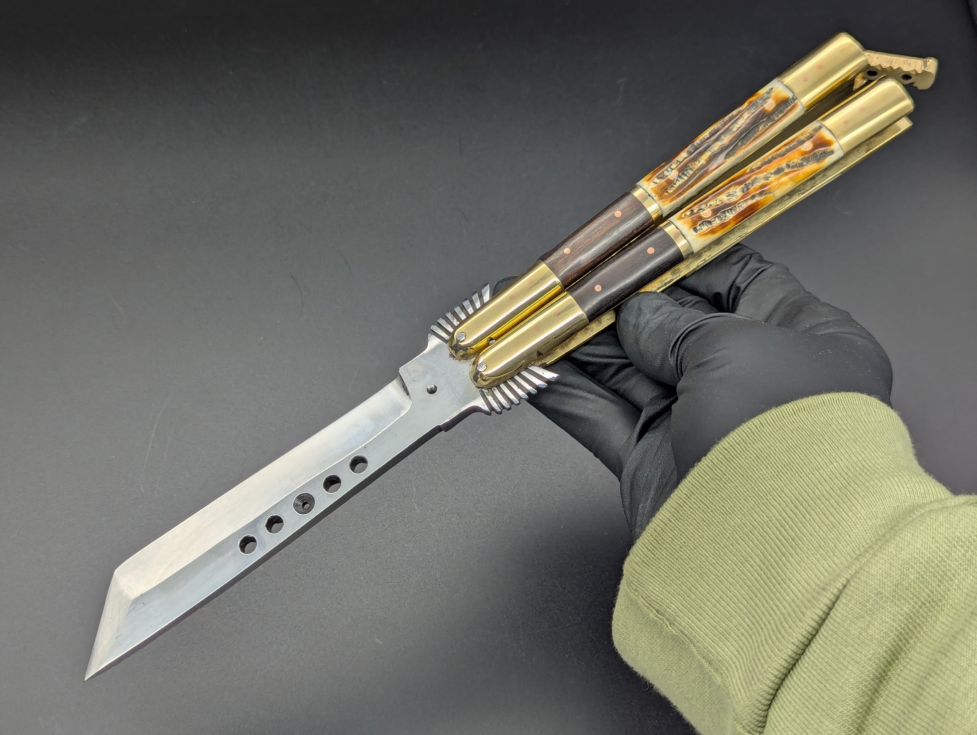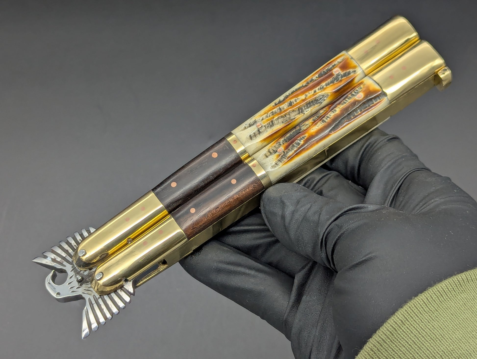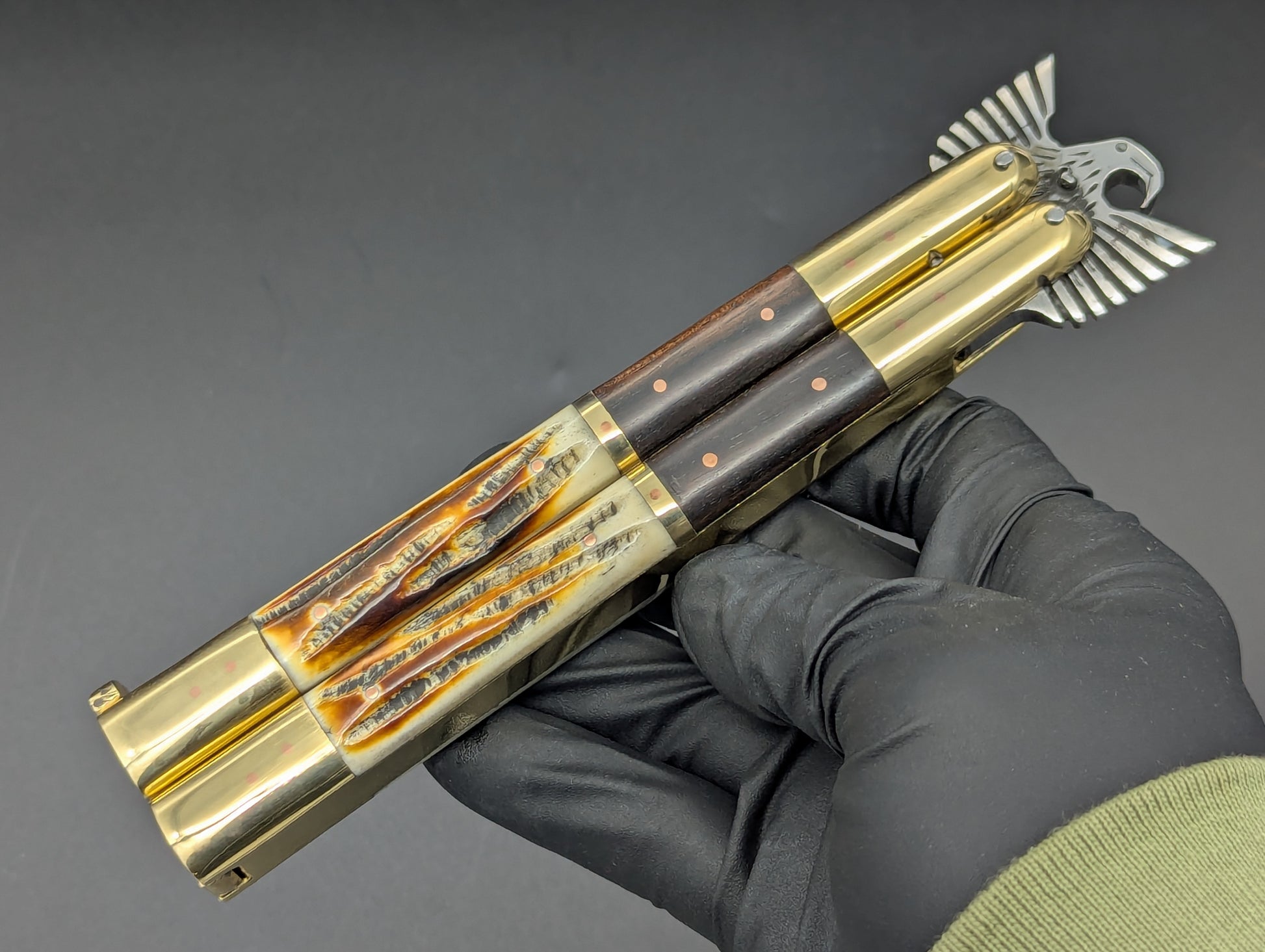 LIMITED ONE OFF MODELS! CARVED "EAGLE TANG" PHILIPPINES HANDMADE BALISONG. ALL GLEAMING BRASS CONSTRUCTION. DOUBLE SECTIONS OF POLISHED CARABOA HORN AND SOLID BURNT/ JIGGED BONE SCALES WITH BRASS UPPER AND LOWER BOLSTERS. HIGH CARBON STEEL DOUBLE EDGED "KRIS" GRIND BLADE. ABSOLUTELY CLASSIC! MAKERS MARK ON SAFETY LATCH. 11.25" OPEN LENGTH. 5.25" BLADE LENGTH. 316 GRAMS OVERALL WEIGHT