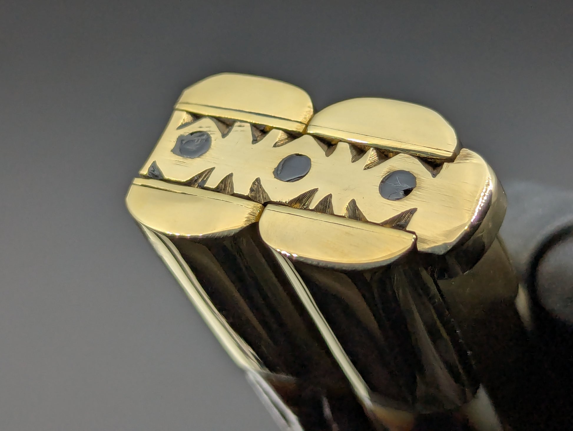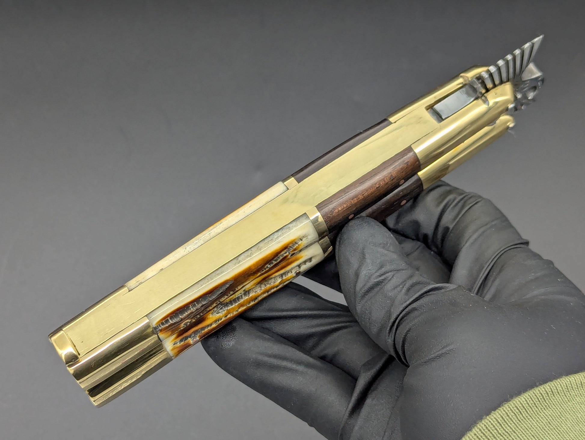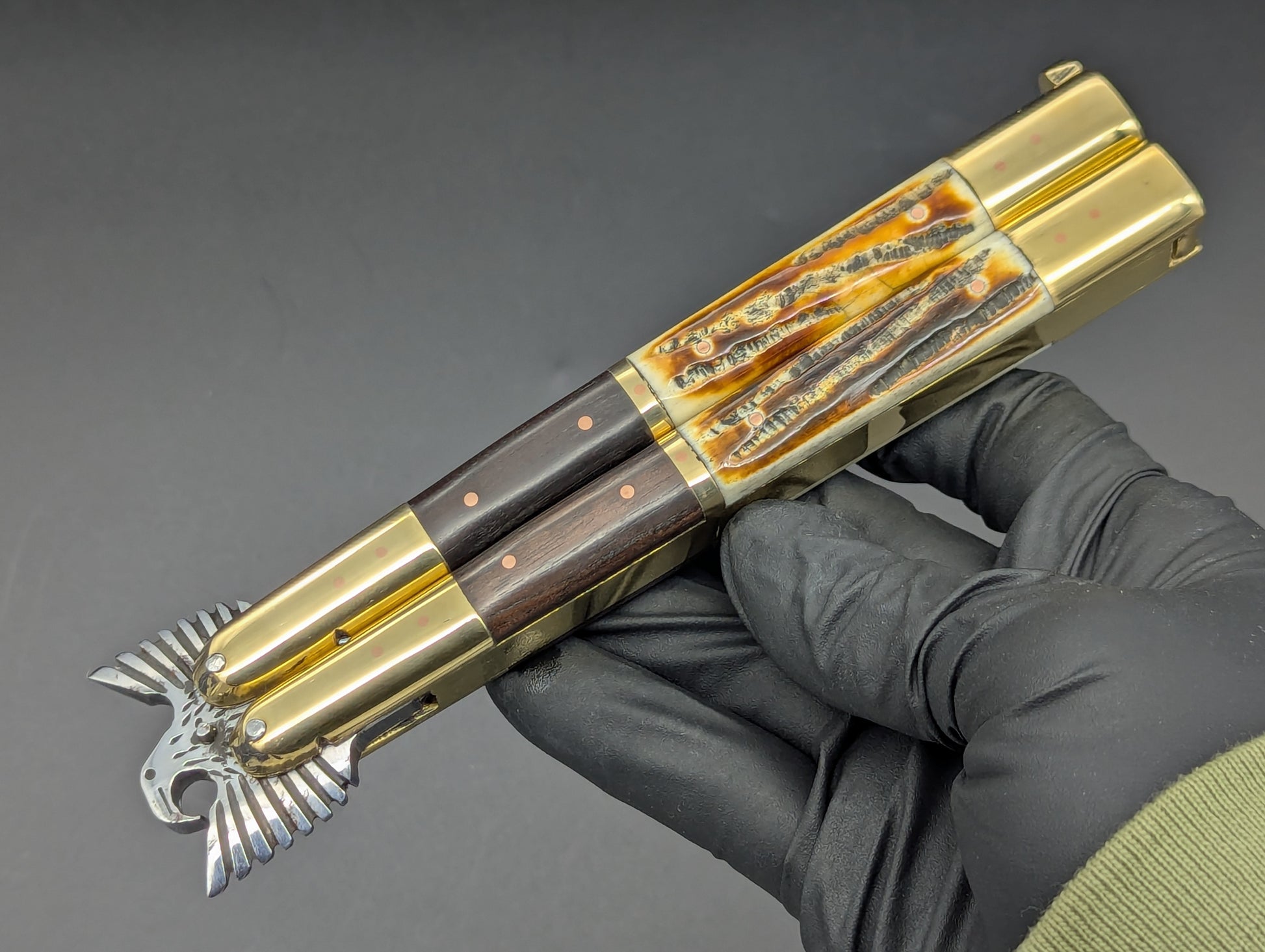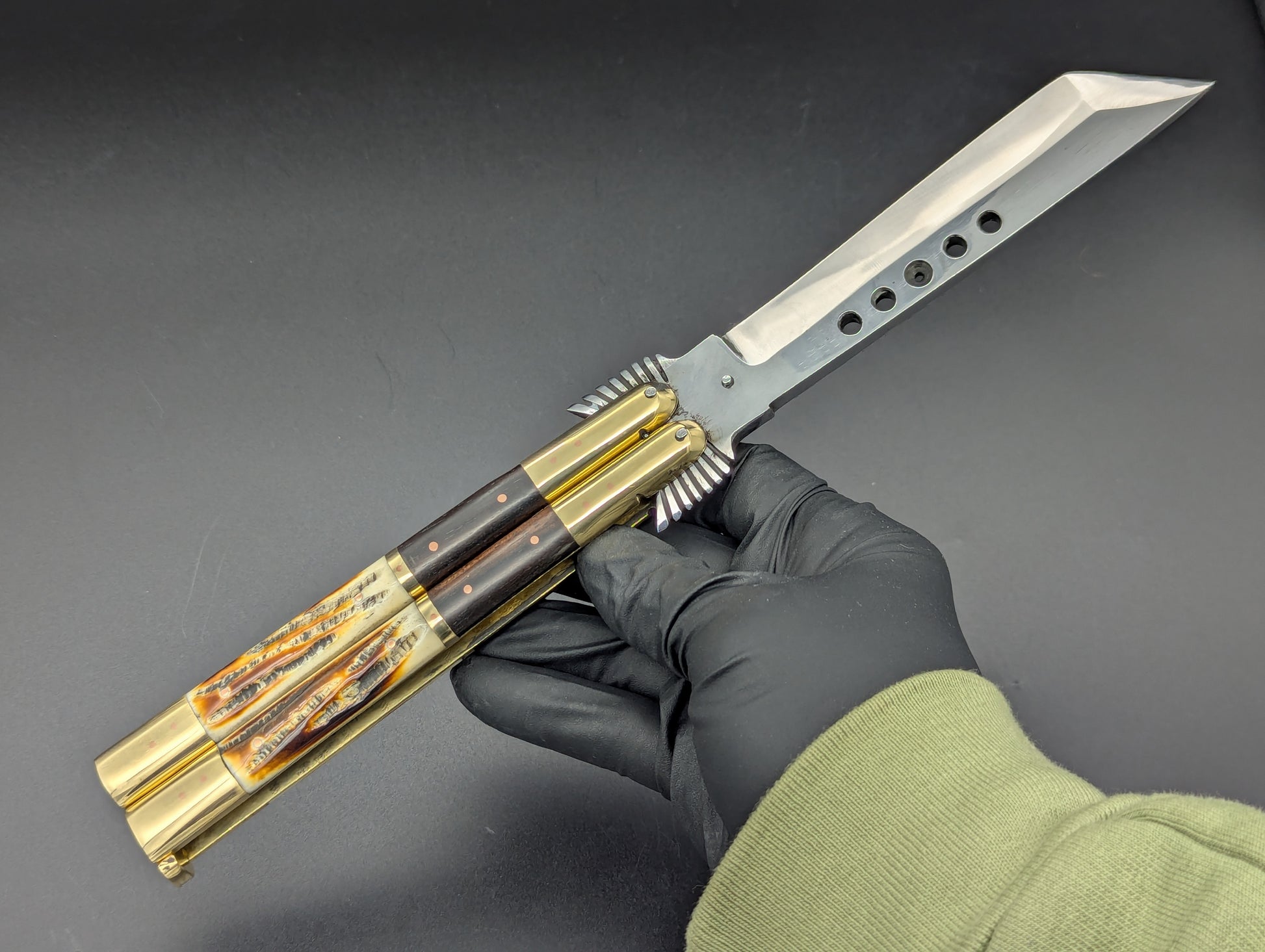 LIMITED ONE OFF MODELS! CARVED "EAGLE TANG" PHILIPPINES HANDMADE BALISONG. ALL GLEAMING BRASS CONSTRUCTION. DOUBLE SECTIONS OF POLISHED CARABOA HORN AND SOLID BURNT/ JIGGED BONE SCALES WITH BRASS UPPER AND LOWER BOLSTERS. HIGH CARBON STEEL DOUBLE EDGED "KRIS" GRIND BLADE. ABSOLUTELY CLASSIC! MAKERS MARK ON SAFETY LATCH. 11.25" OPEN LENGTH. 5.25" BLADE LENGTH. 316 GRAMS OVERALL WEIGHT