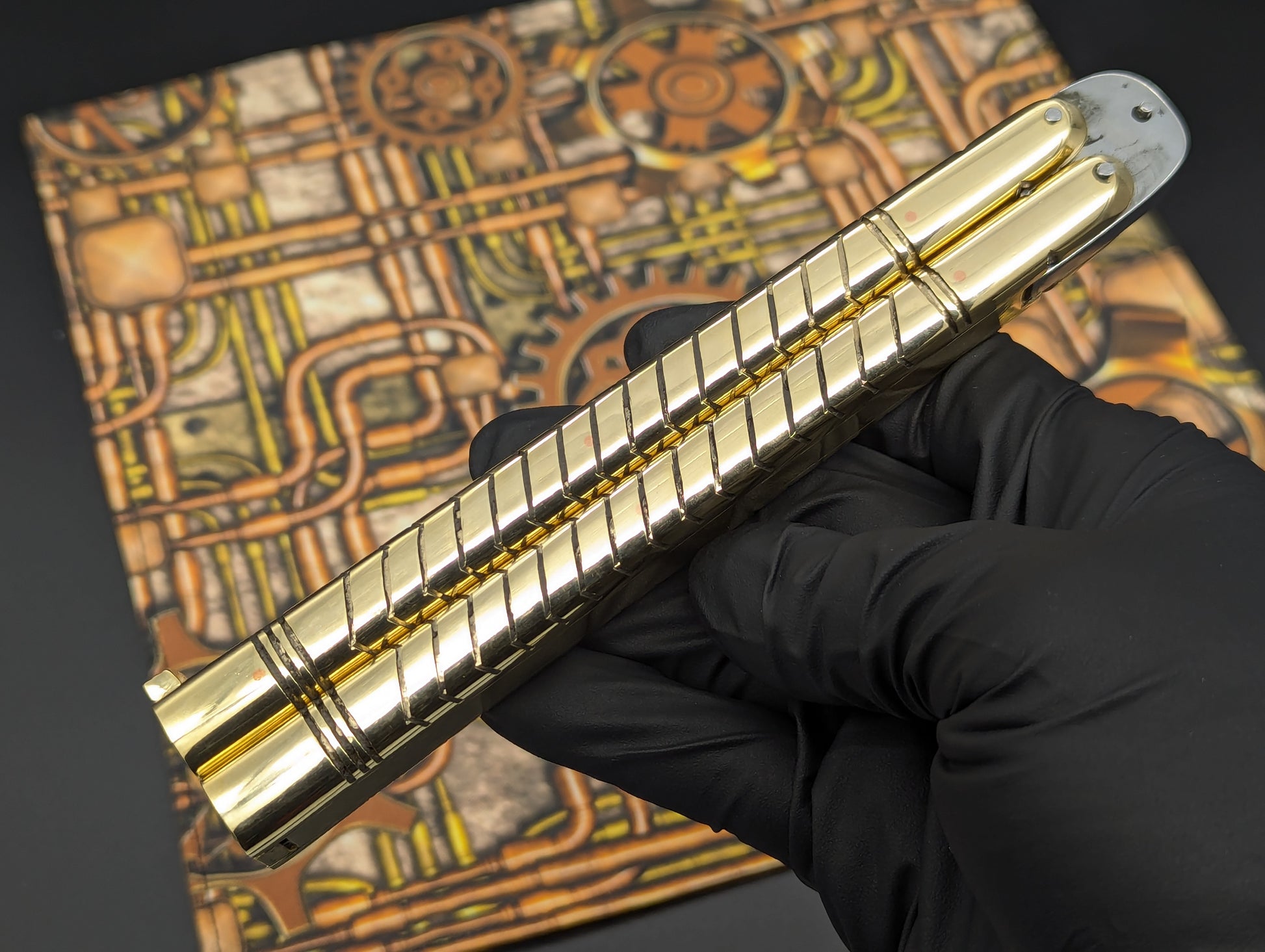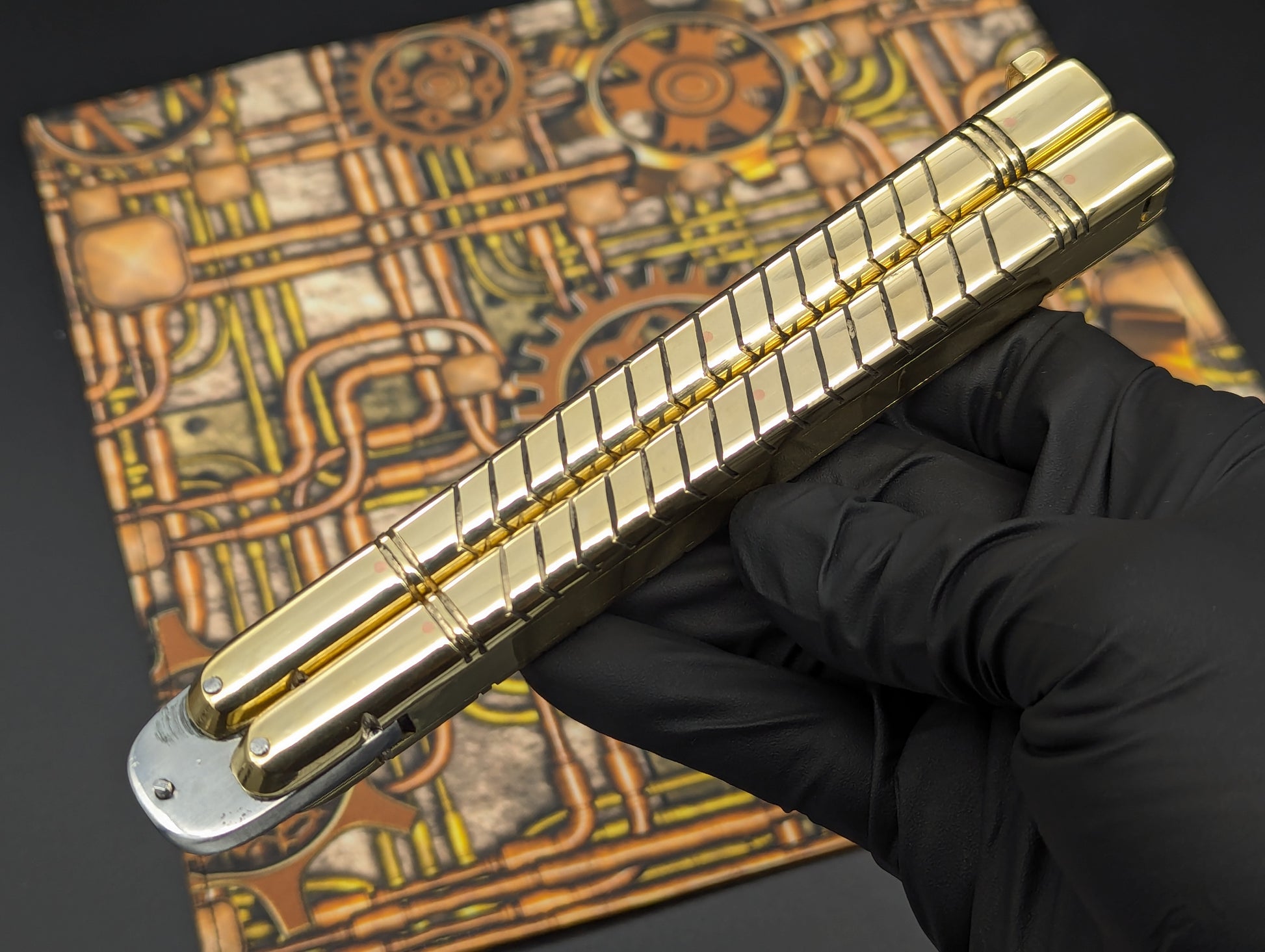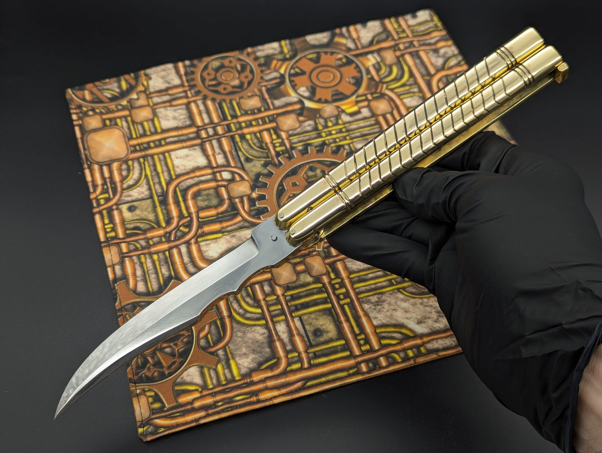 390 GRAM ULTRA HEAVYWEIGHT 11" OVERALL LENGTH HUGE SLAB BRASS HANDLED PHILIPPINES HANDMADE BALISONG WITH A LESS OFTEN SEEN "BATWING" BLADE SOME STYLE CLIP POINT BLADE. MAKERS MARK ON LATCH. THESE ARE ABSOLUTELY INCREDIBLE AND WERE JUST FRESHLY MADE TO ORDER! THESE WILL LAST FOREVER..
