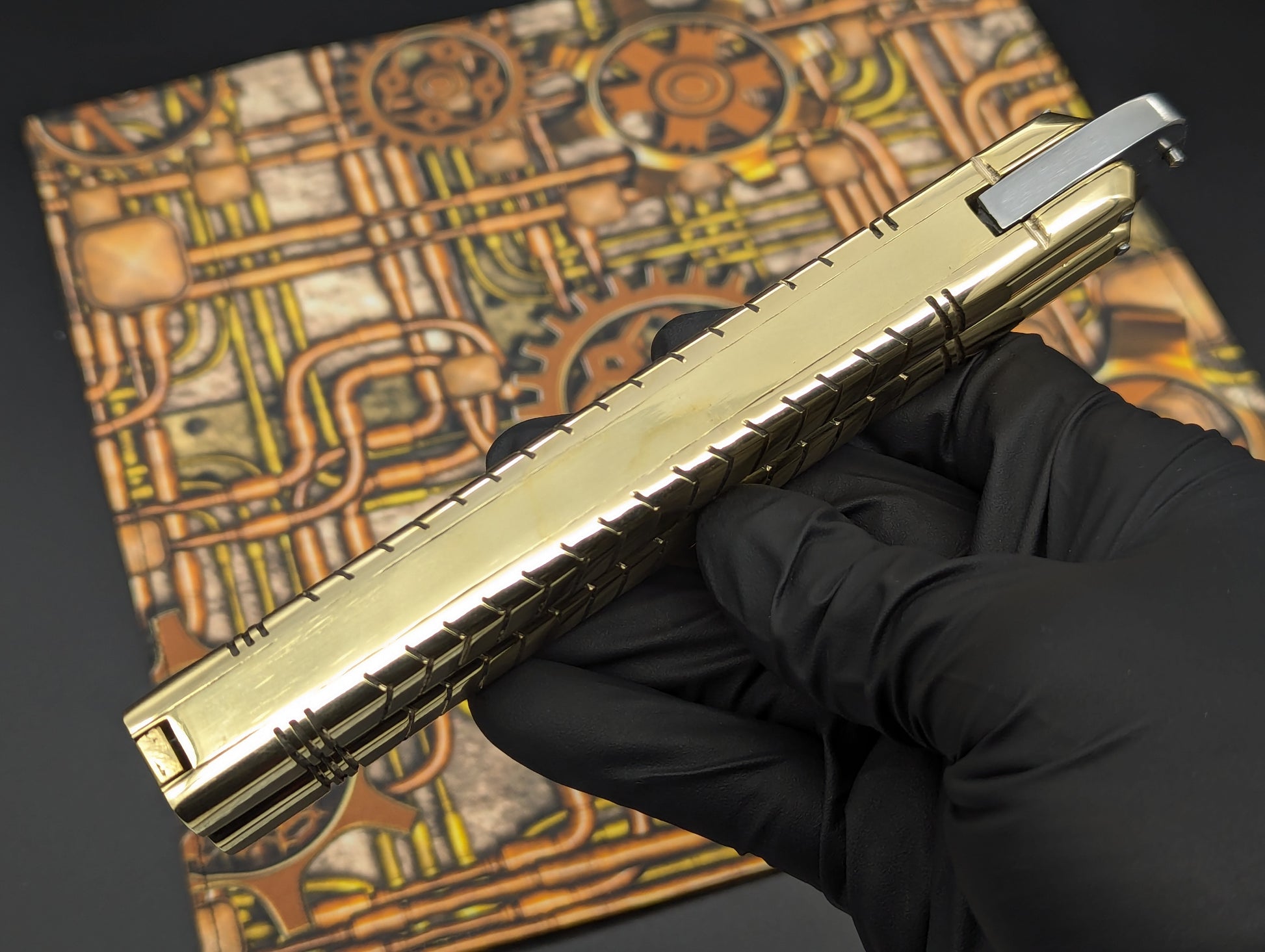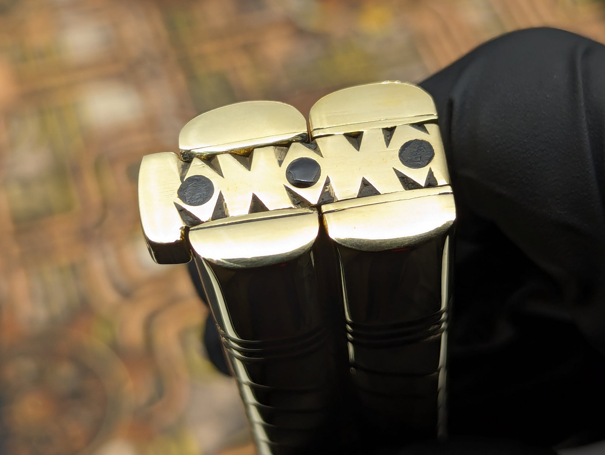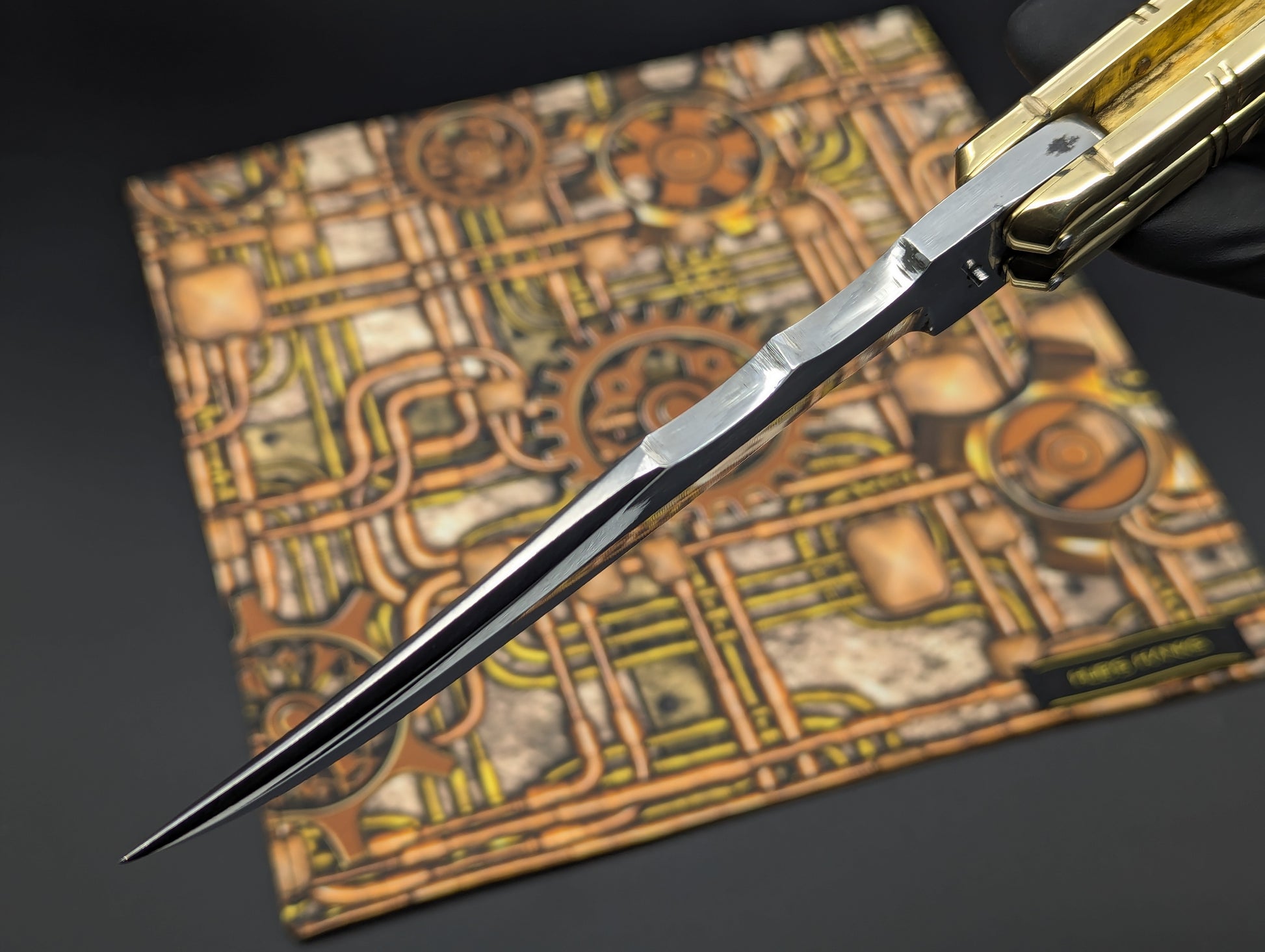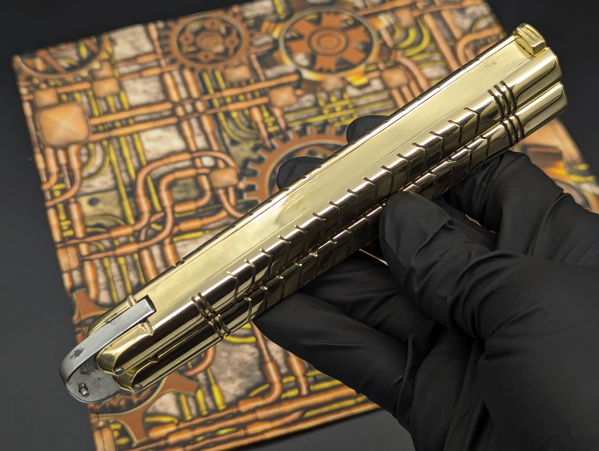 390 GRAM ULTRA HEAVYWEIGHT 11" OVERALL LENGTH HUGE SLAB BRASS HANDLED PHILIPPINES HANDMADE BALISONG WITH A LESS OFTEN SEEN "BATWING" BLADE SOME STYLE CLIP POINT BLADE. MAKERS MARK ON LATCH. THESE ARE ABSOLUTELY INCREDIBLE AND WERE JUST FRESHLY MADE TO ORDER! THESE WILL LAST FOREVER..