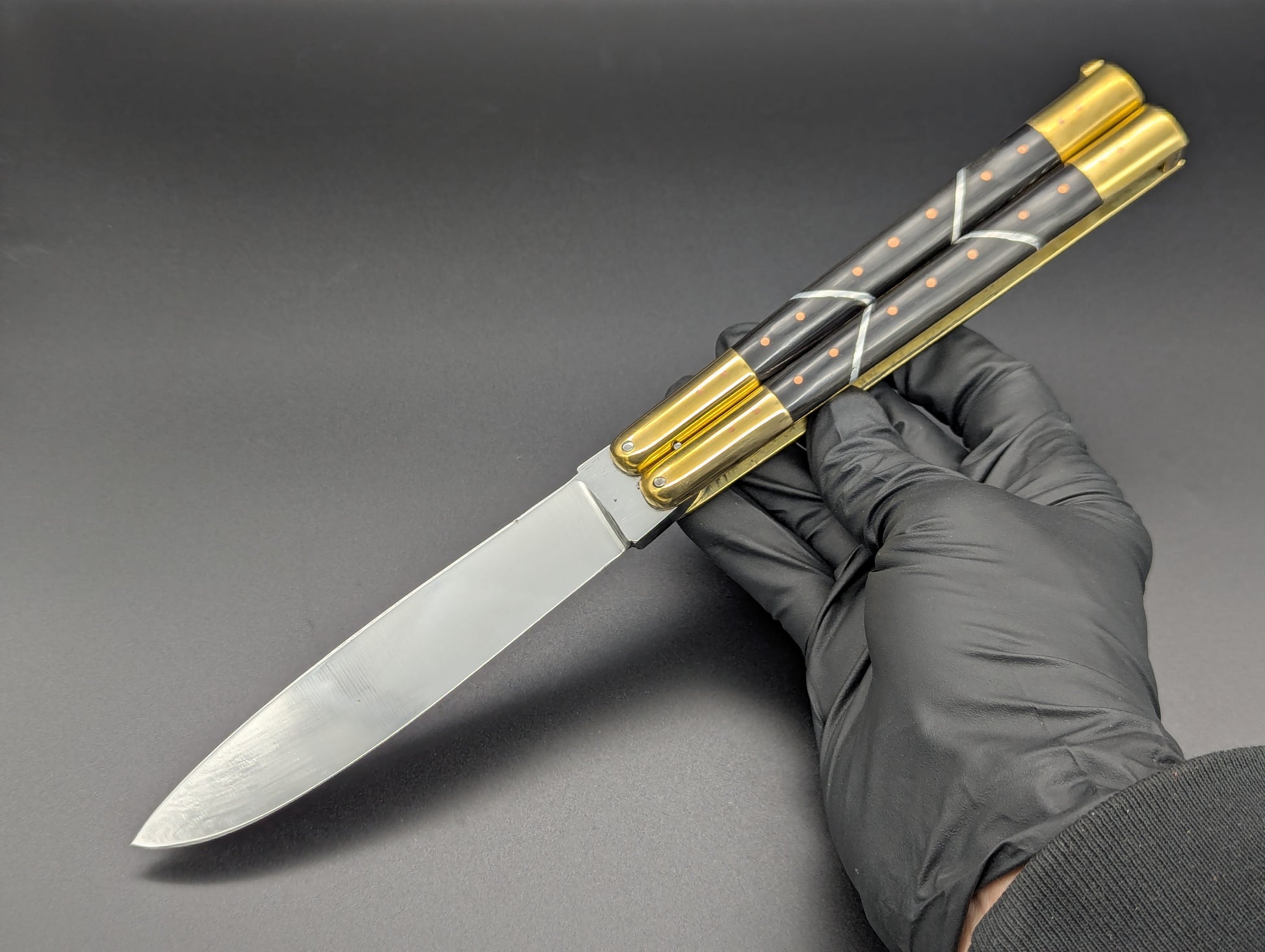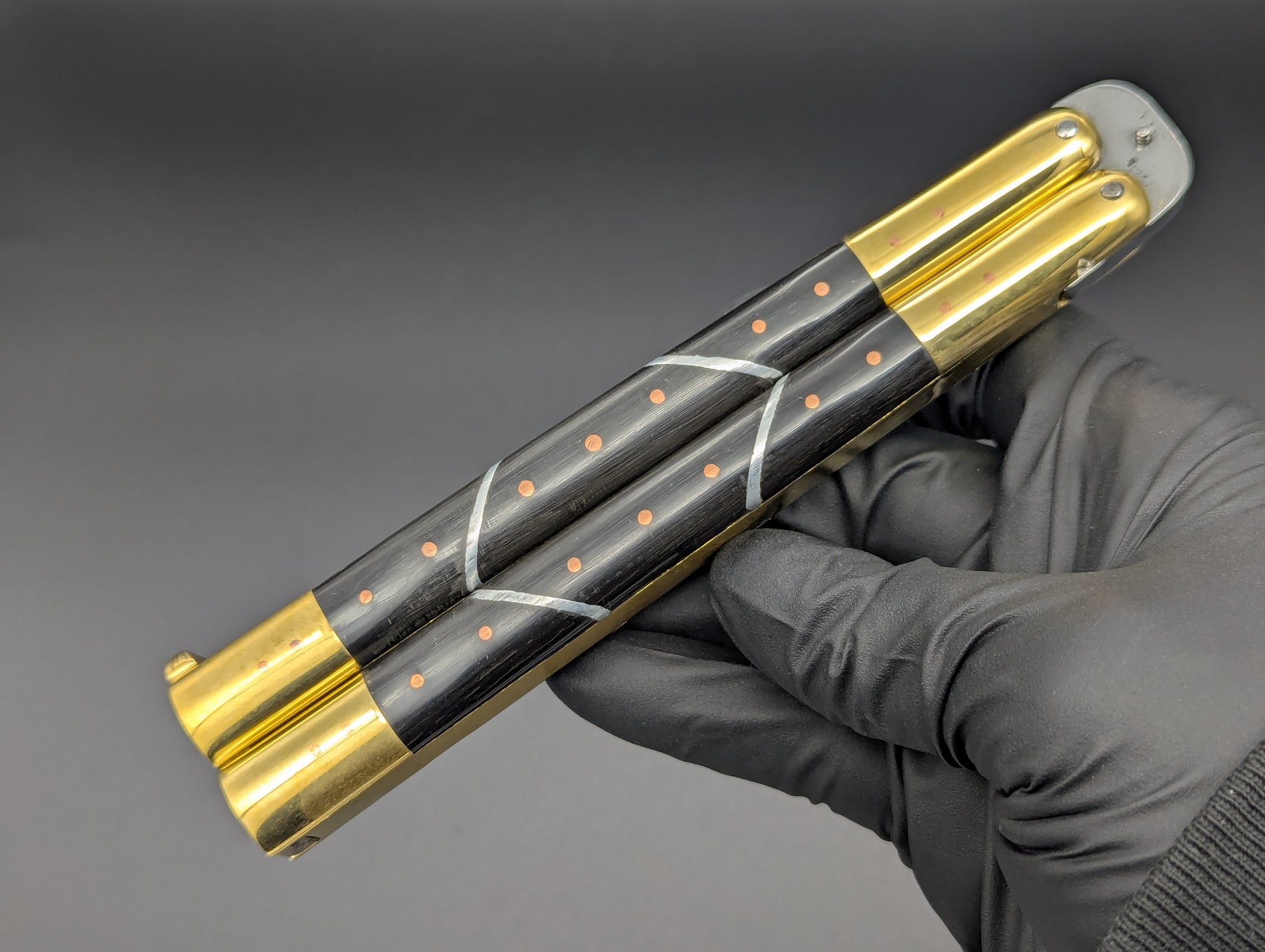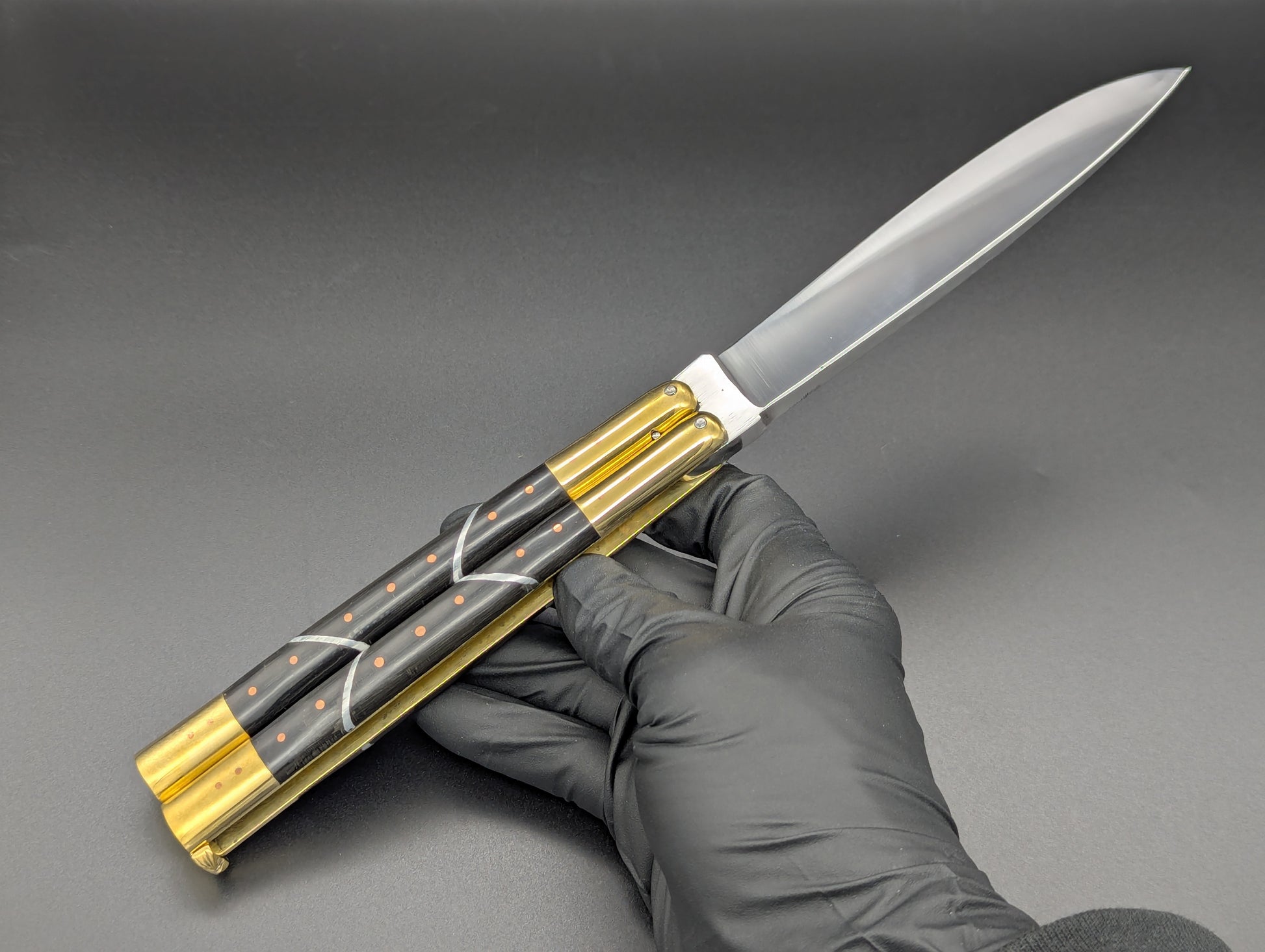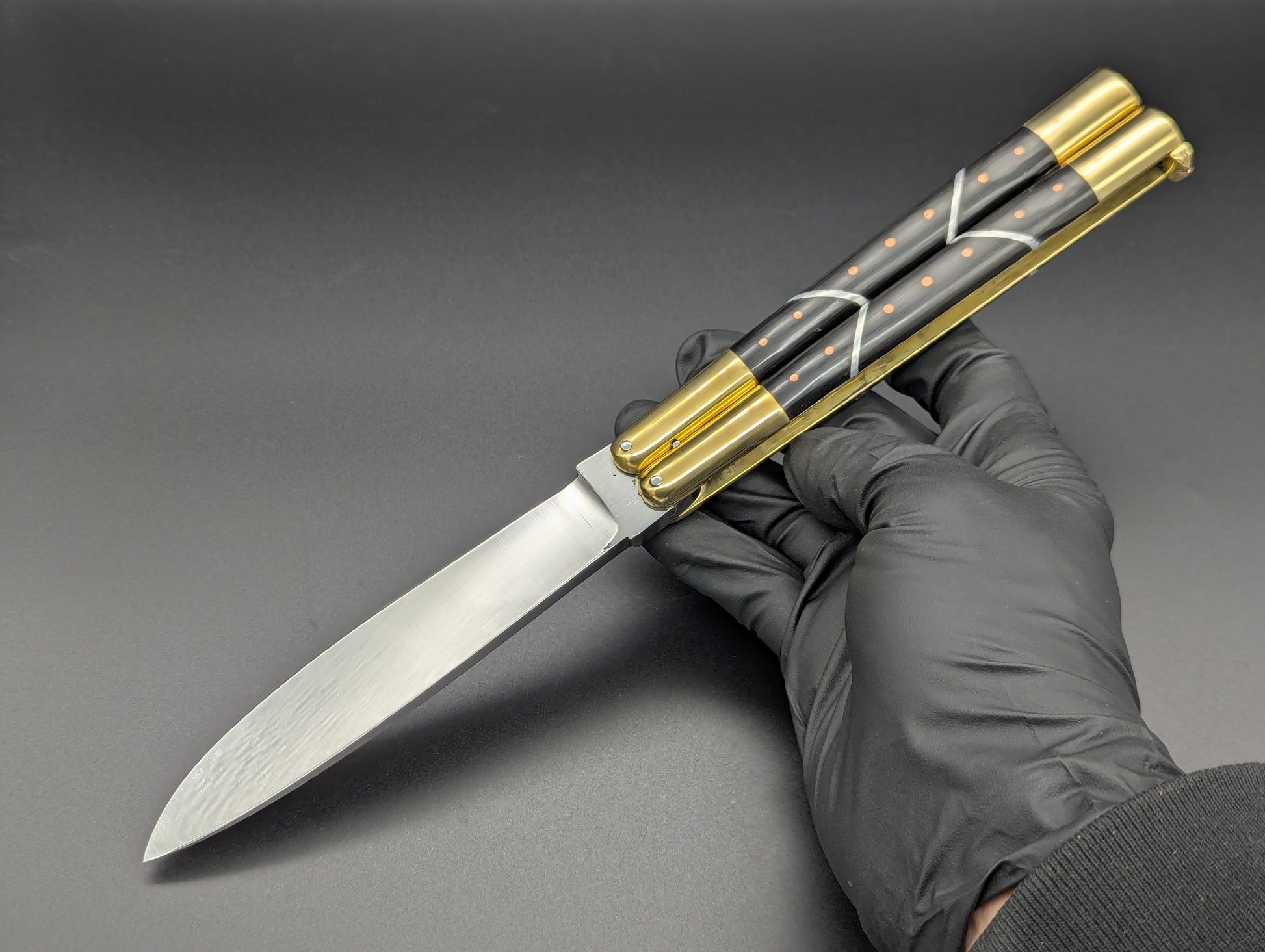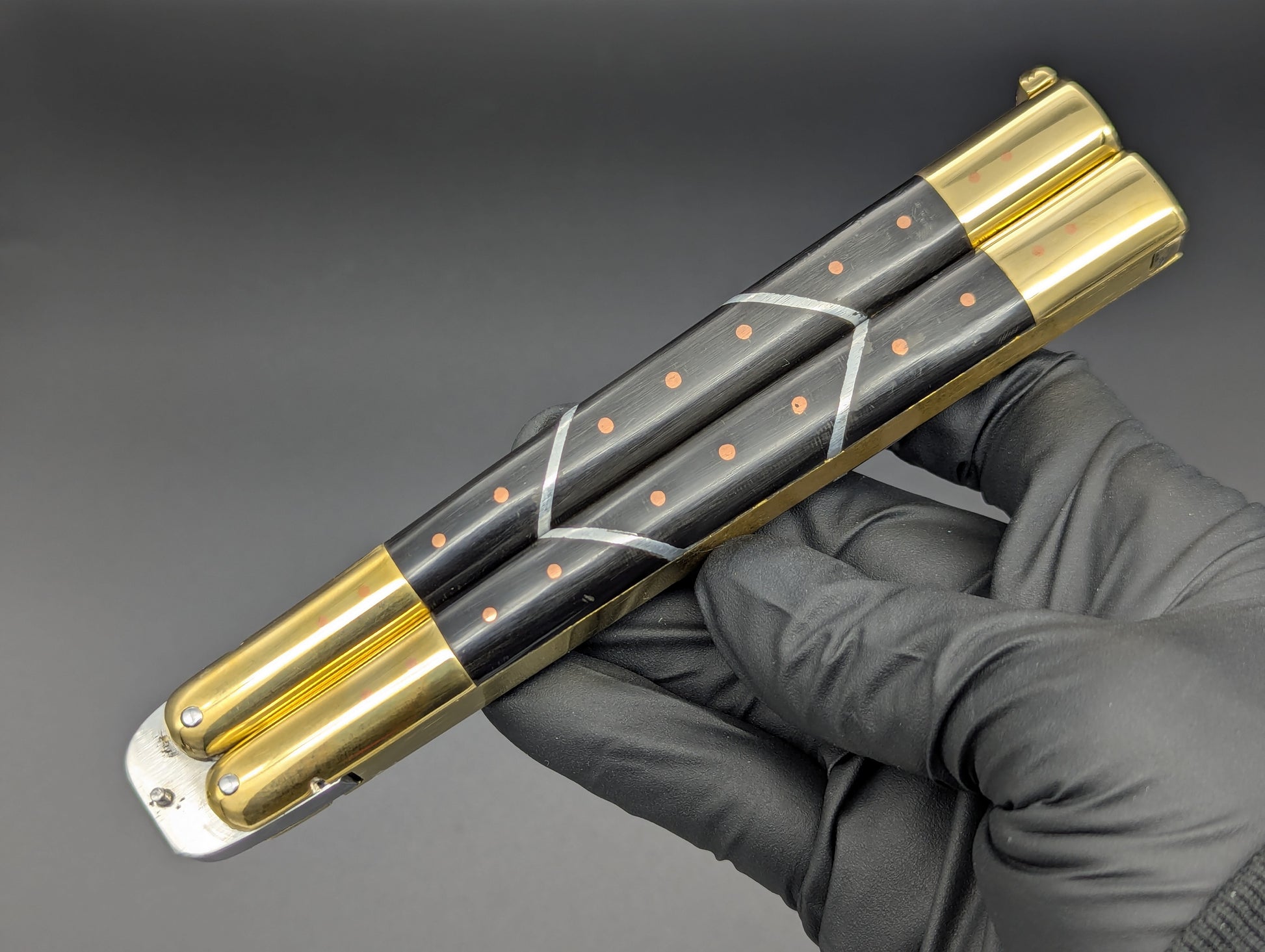 1 OF 2 PC CUSTOM ABEST MADE. 29cm/ 11" OVERALL LENGTH "SPECIAL" HEAVYWEIGHT 254 GRAM PHILIPPINES HANDMADE BALISONG. THESE OFFER A BRASS CONSTRUCTED HANDLE WITH CARABOA HORN SCALES. TRADITIONAL INLAY THE HANDLE PATTERN. THIS VERSION OFFERS A BIG OLE DROP POINT BLADE. FILEWORKED BRASS LATCH WITH MARKERS PATTERN. THESE ARE CHOICE! DONT MISS OUT