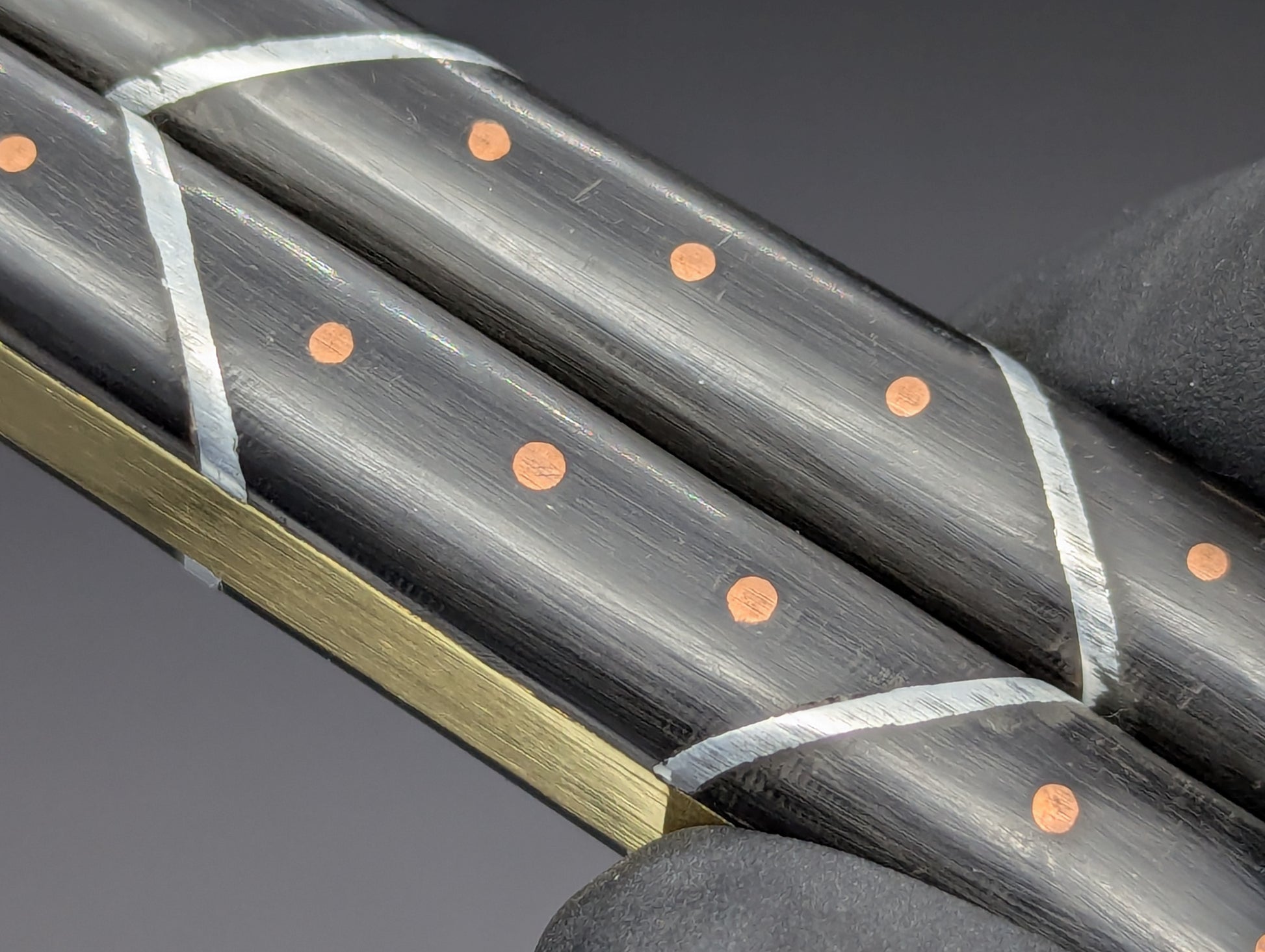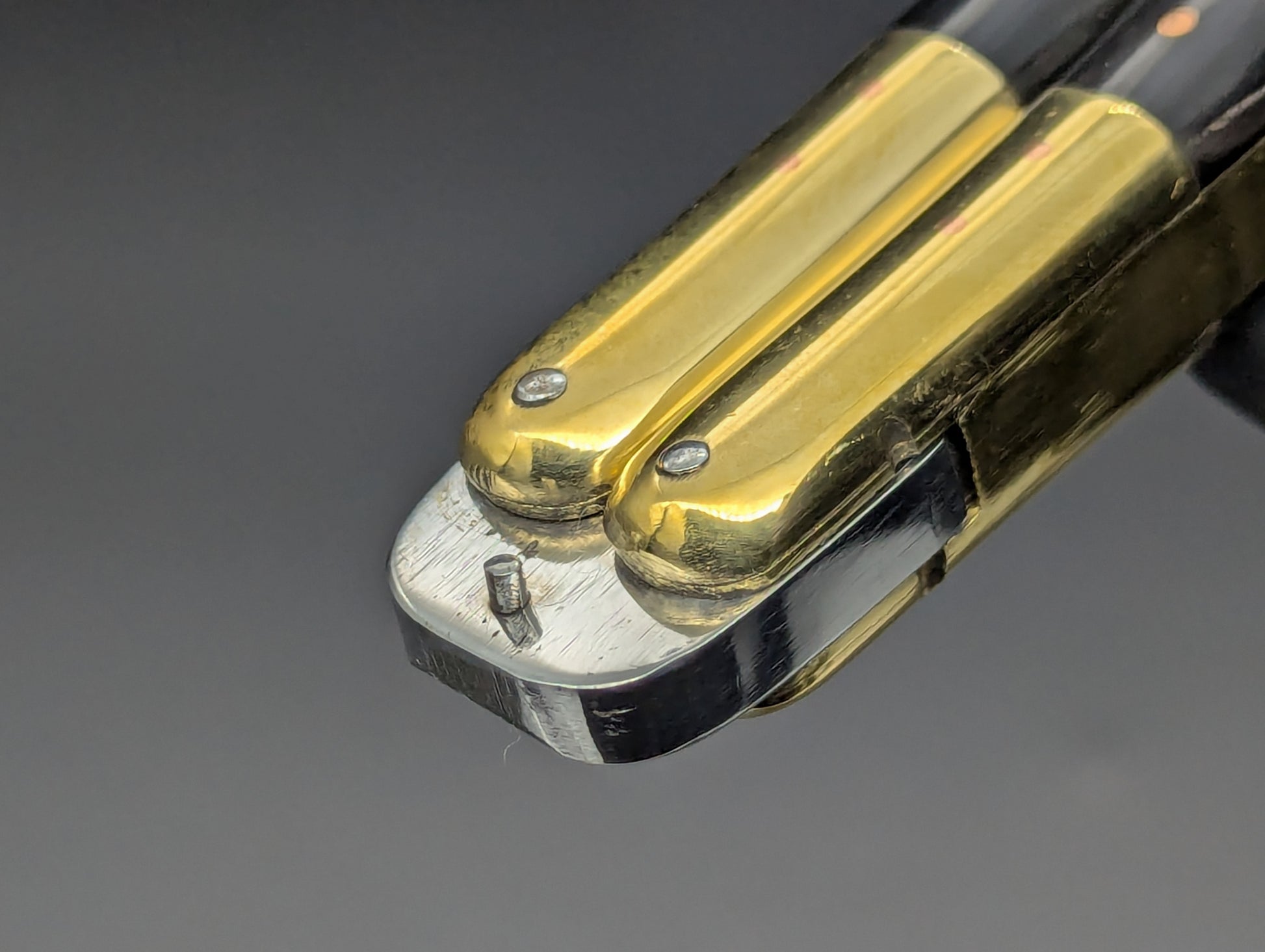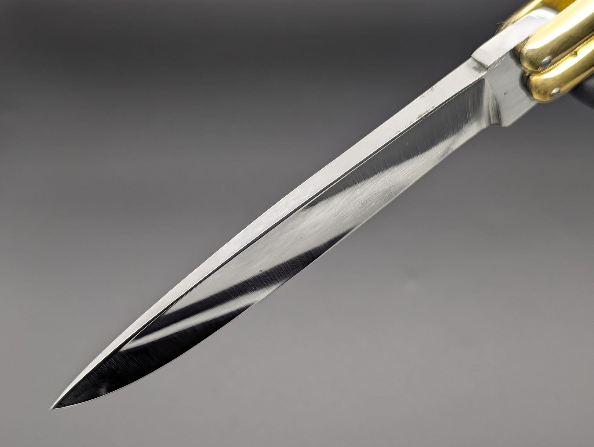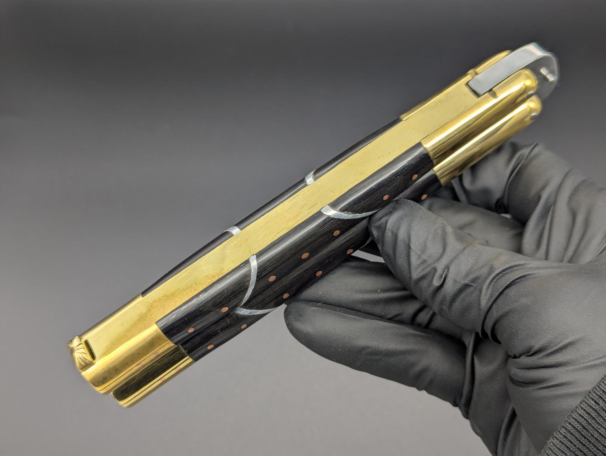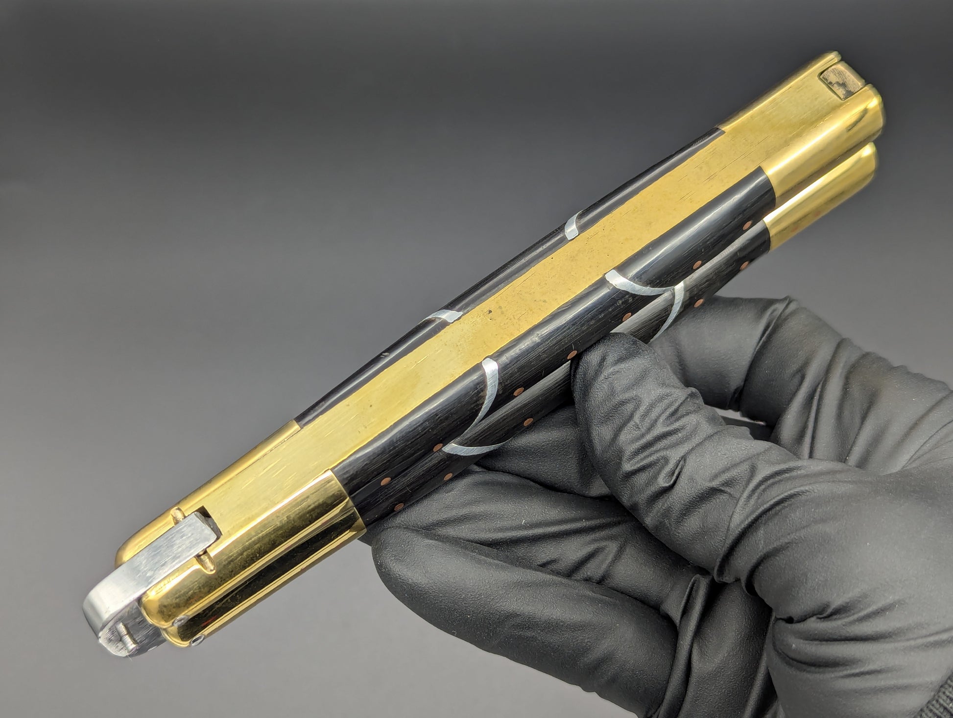 1 OF 2 PC CUSTOM ABEST MADE. 29cm/ 11" OVERALL LENGTH "SPECIAL" HEAVYWEIGHT 254 GRAM PHILIPPINES HANDMADE BALISONG. THESE OFFER A BRASS CONSTRUCTED HANDLE WITH CARABOA HORN SCALES. TRADITIONAL INLAY THE HANDLE PATTERN. THIS VERSION OFFERS A BIG OLE DROP POINT BLADE. FILEWORKED BRASS LATCH WITH MARKERS PATTERN. THESE ARE CHOICE! DONT MISS OUT