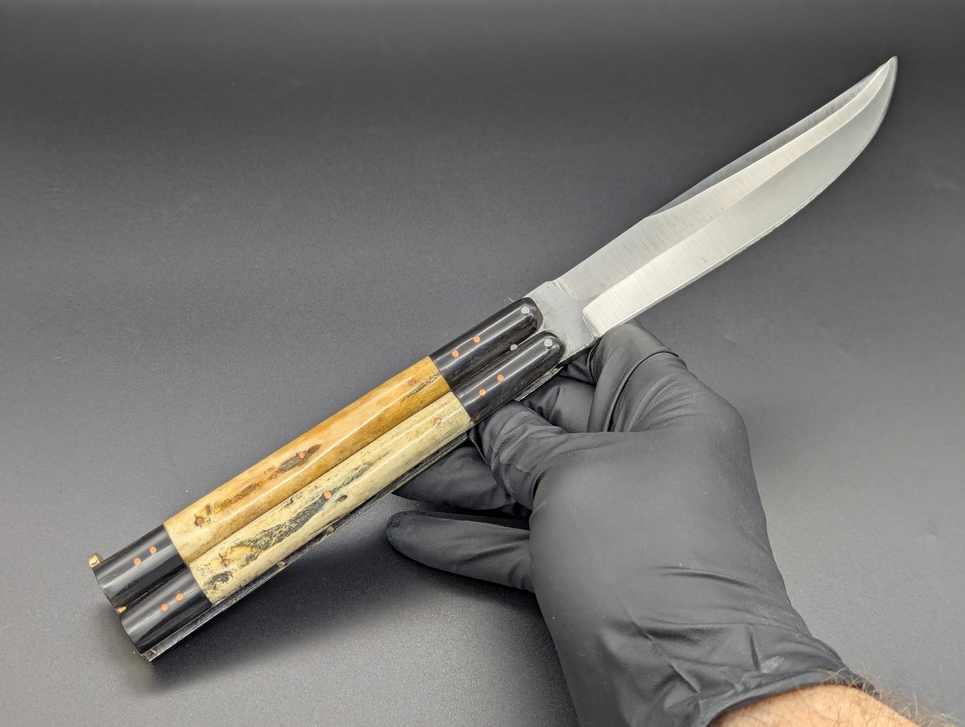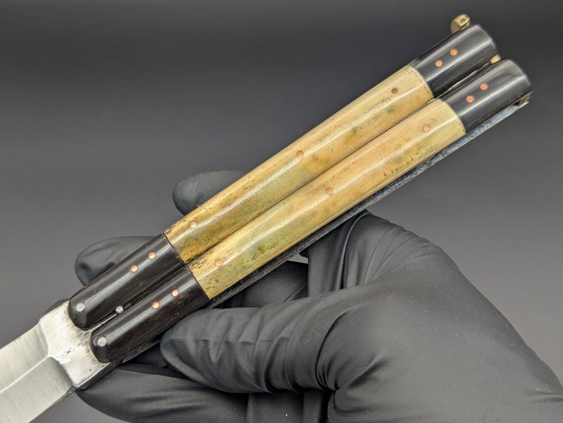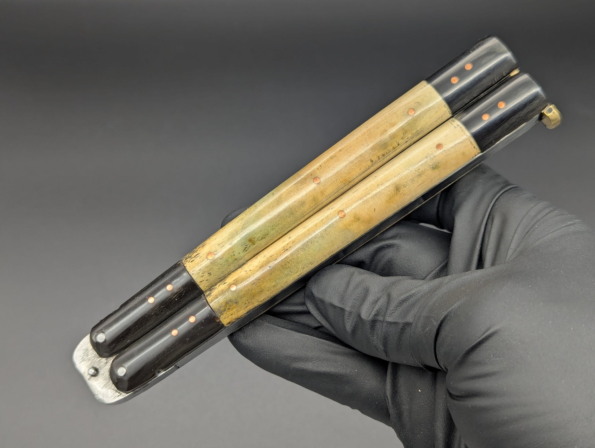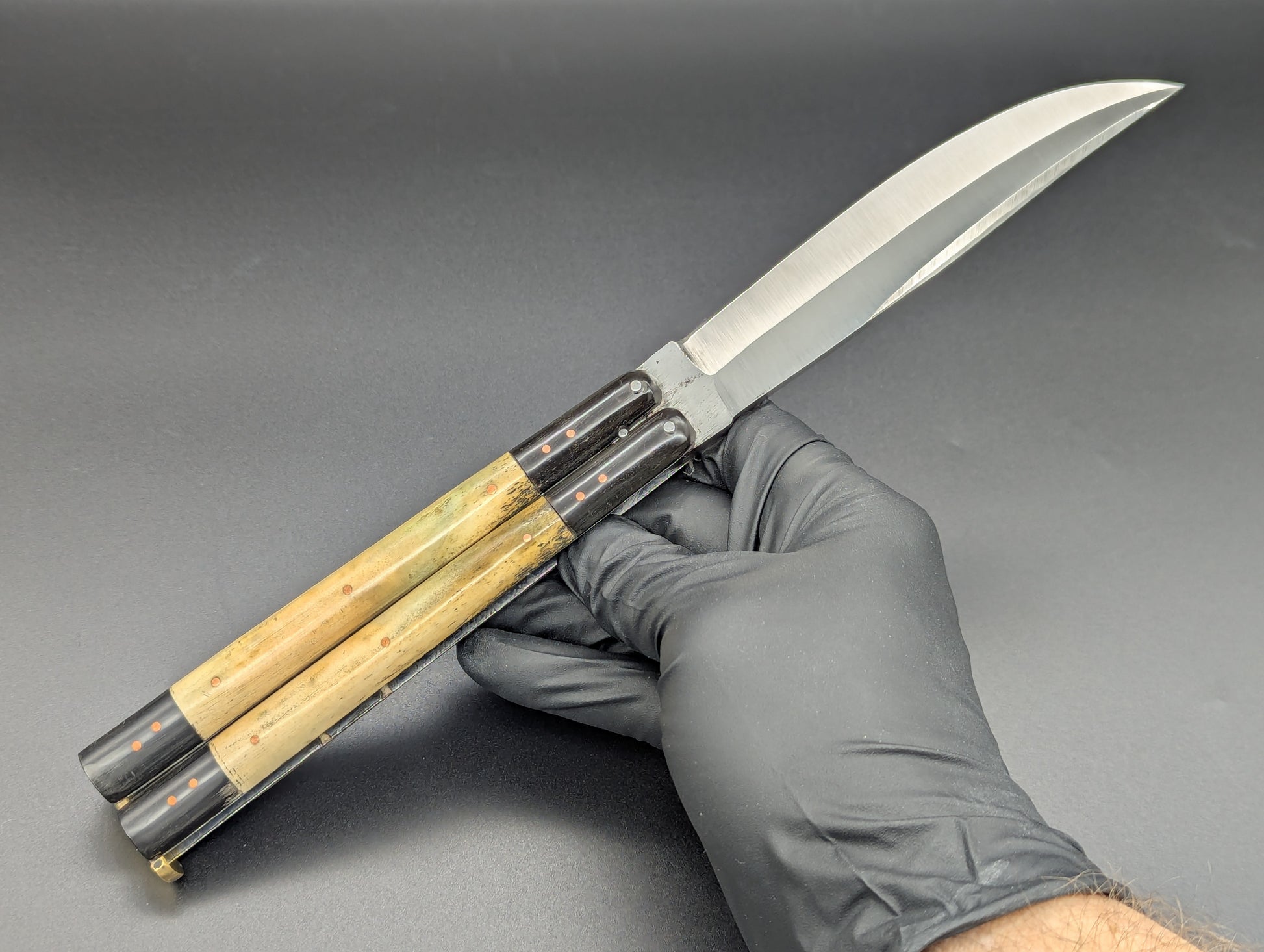 FILIPINO HANDMADE BALISONG FROM TAAL BATANGAS PHILIPPINES. AGED BONE & CARABOA HORN SCALES. STEEL LINERS. BRASS LATCH. HUGE SWEEPING CLIP POINT BLADE. OVERALL WEIGHT 166 GRAMS. 29CM/ 11" OPEN LENGTH