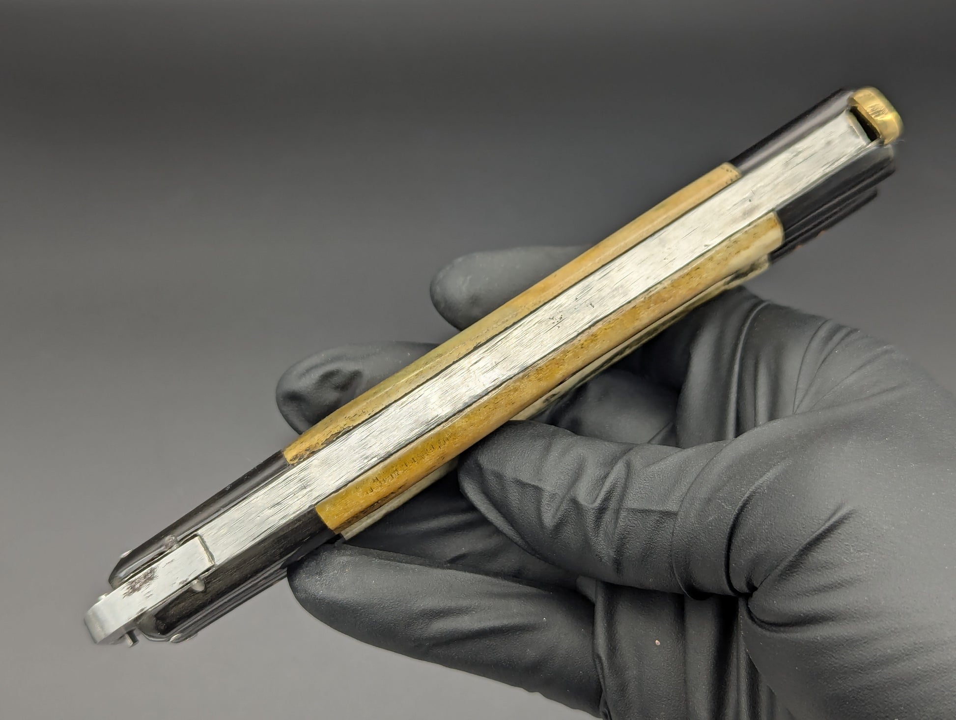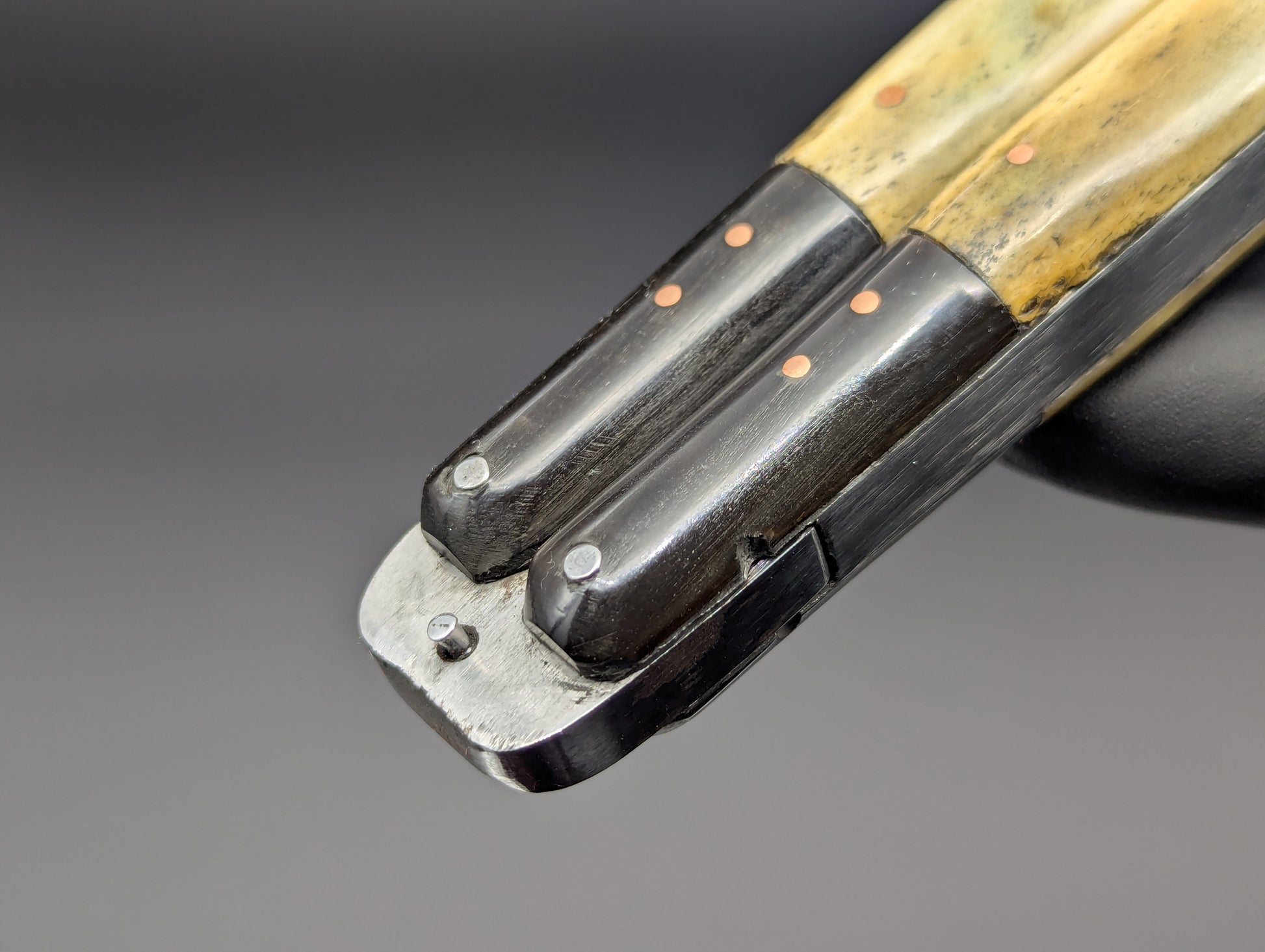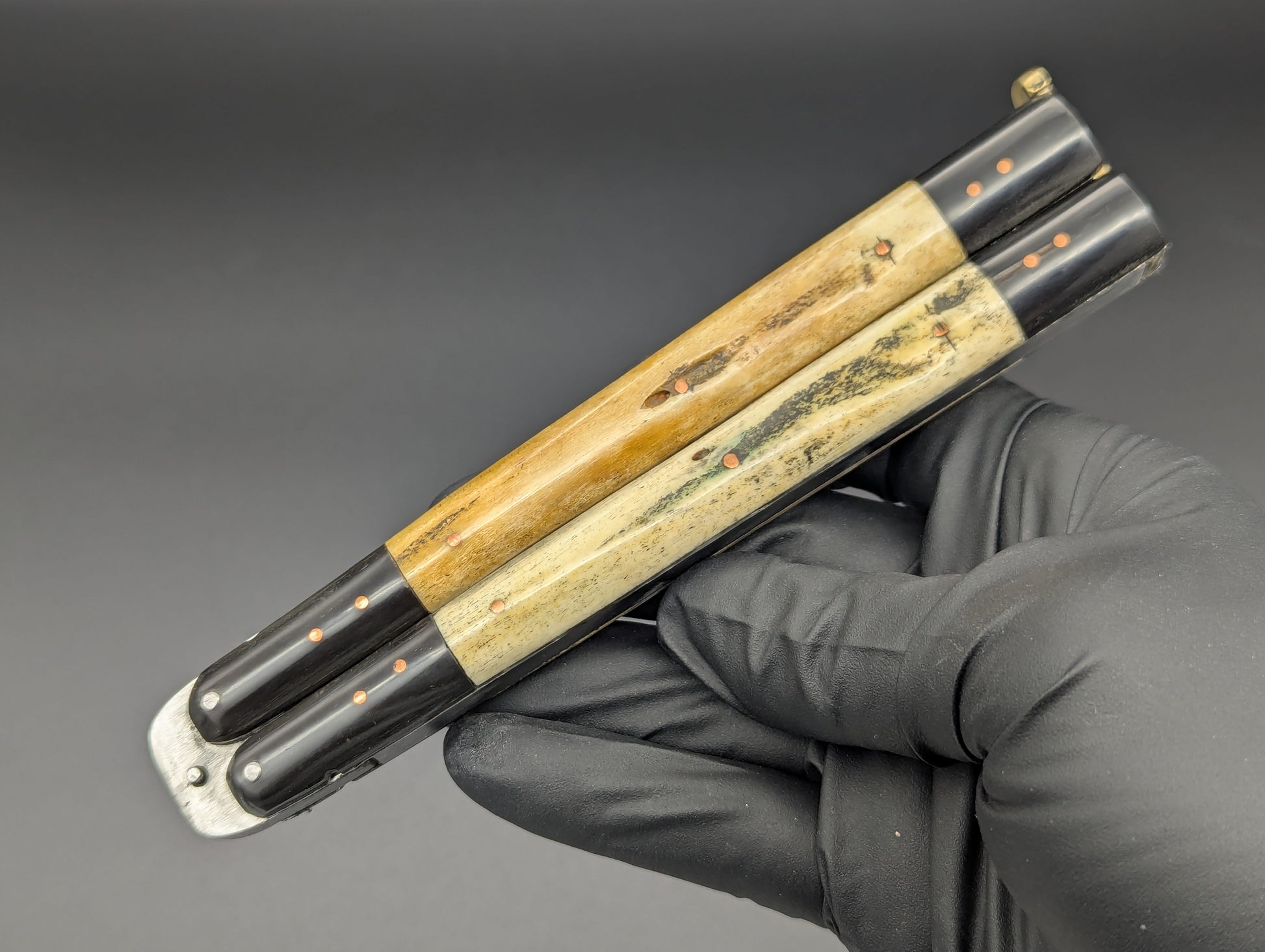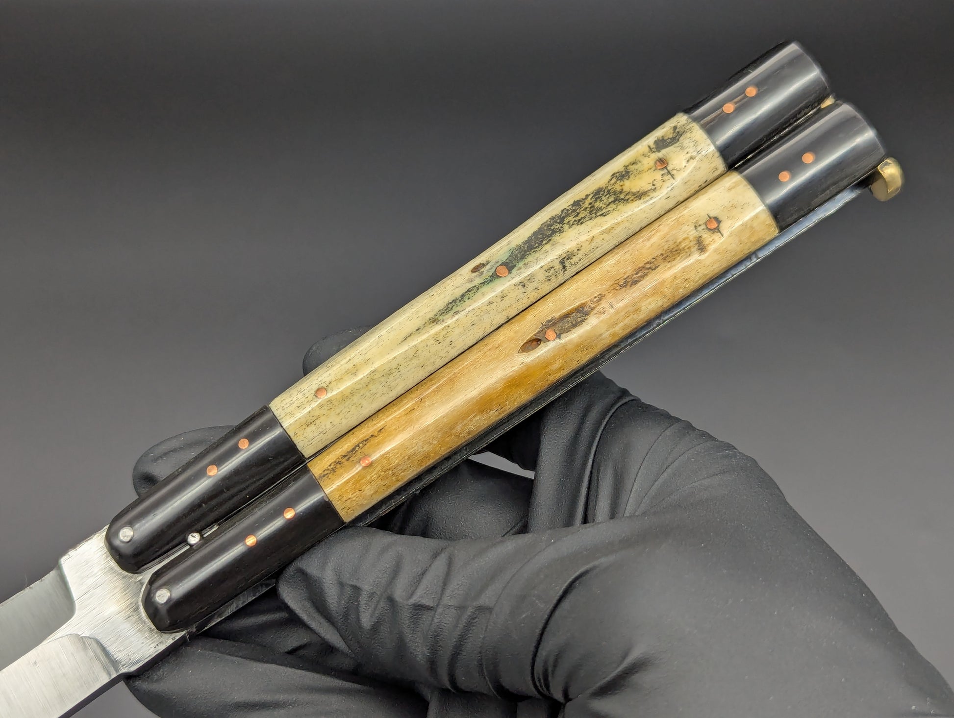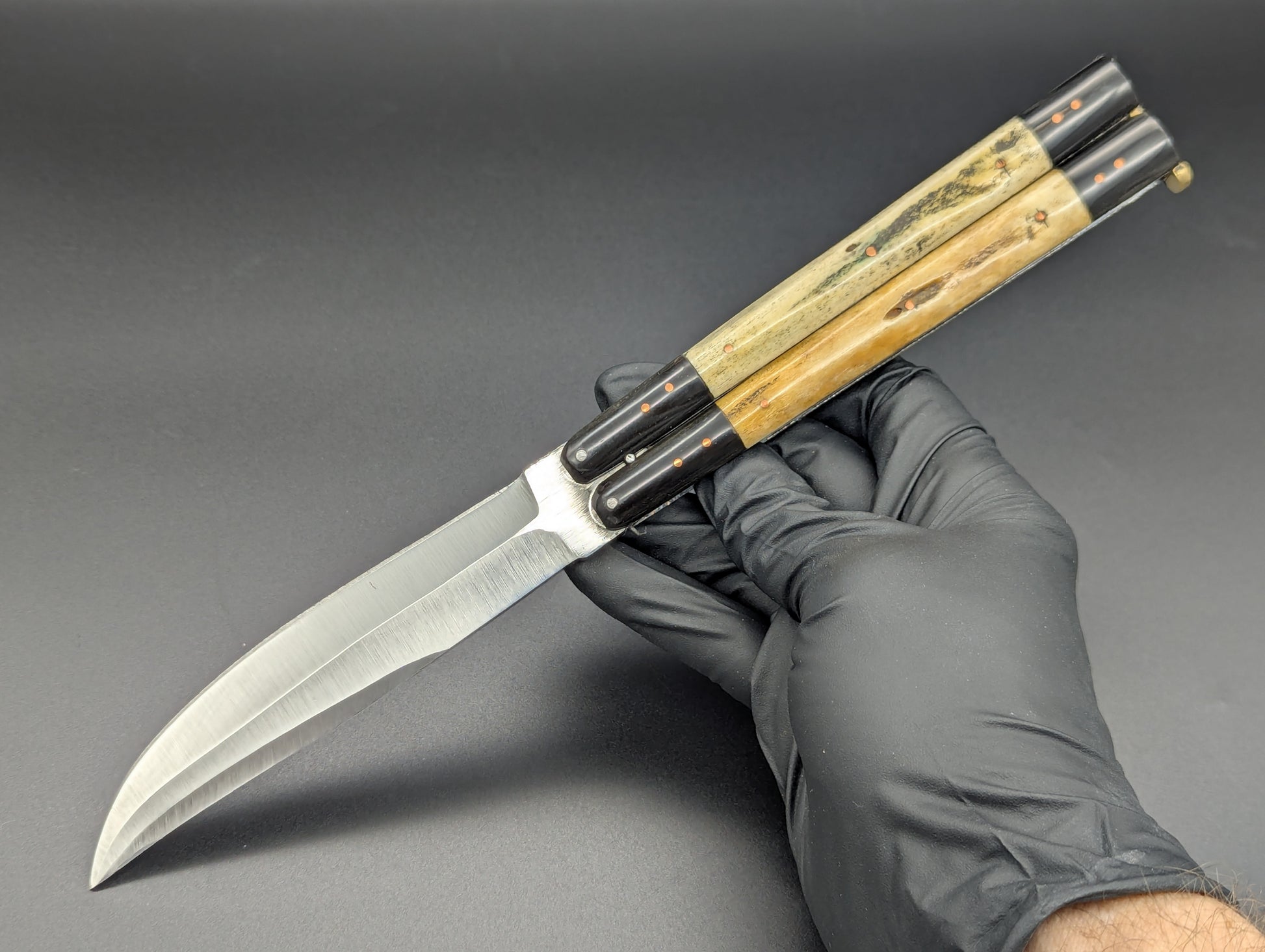 FILIPINO HANDMADE BALISONG FROM TAAL BATANGAS PHILIPPINES. AGED BONE & CARABOA HORN SCALES. STEEL LINERS. BRASS LATCH. HUGE SWEEPING CLIP POINT BLADE. OVERALL WEIGHT 166 GRAMS. 29CM/ 11" OPEN LENGTH