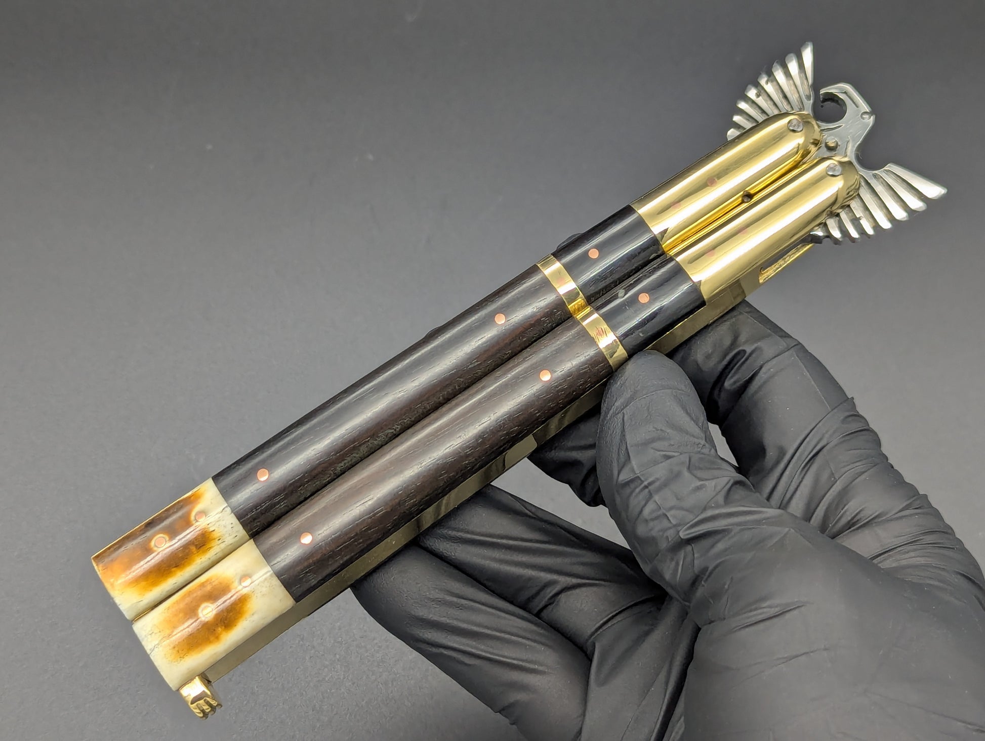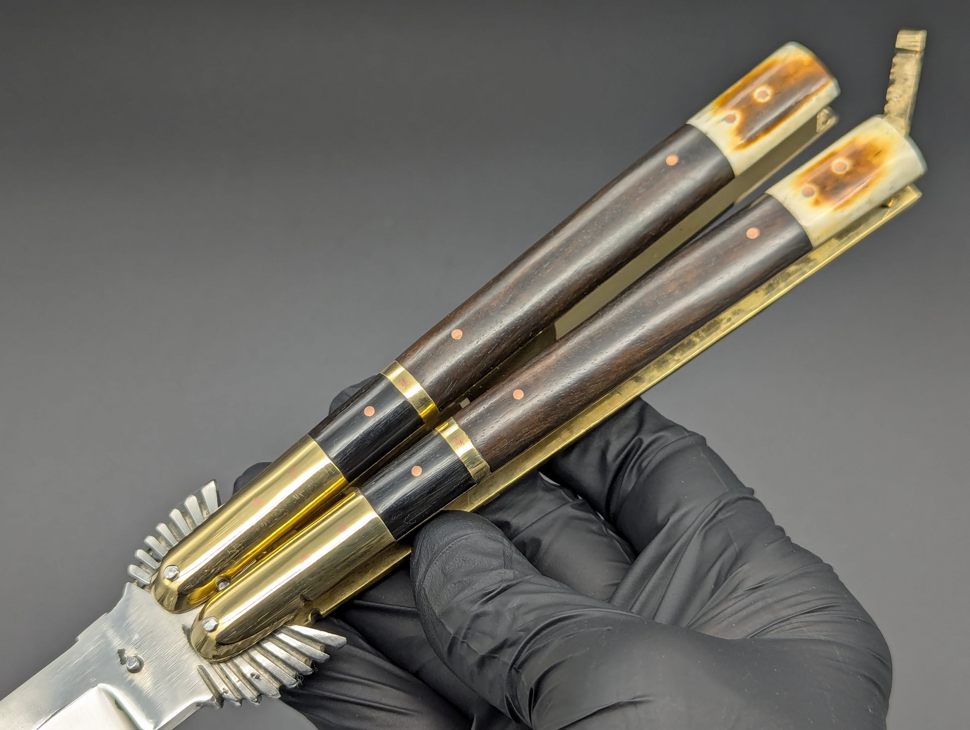 11" OL 248 GRAM SPECIAL HEAVYWEIGHT TRADITIONAL PHILIPPINES HANDMADE BALISONG. BONE/HORN/WOOD & BRASS HANDLES. THE ELUSIVE BUT CLASSIC CARVED WINGED EAGLE BOLSTER. HUGE MIRROR POLISHED CLIP POINT BLADE. THESE DON'T REALLY COME MUCH NICER AND ARE EXTREMELY LIMITED TO ONE PIECE EACH MODEL