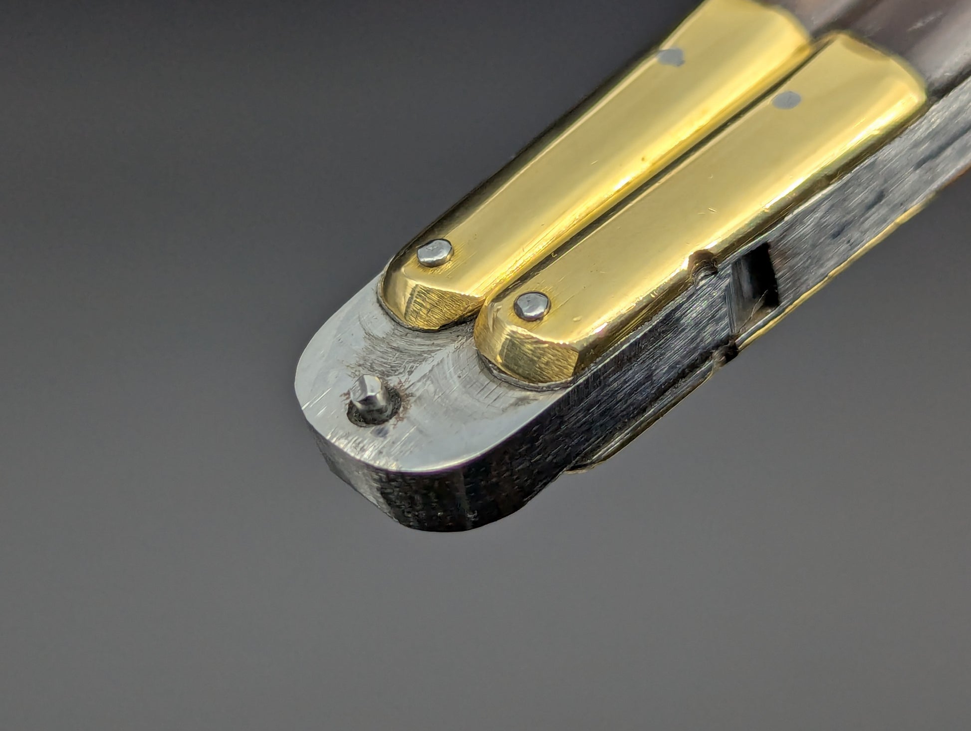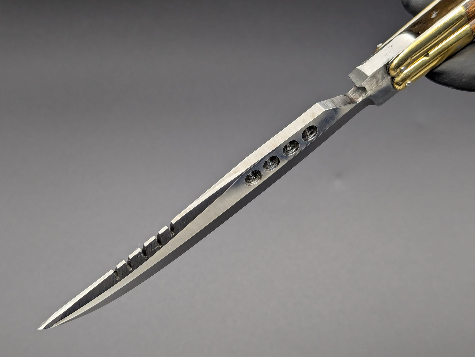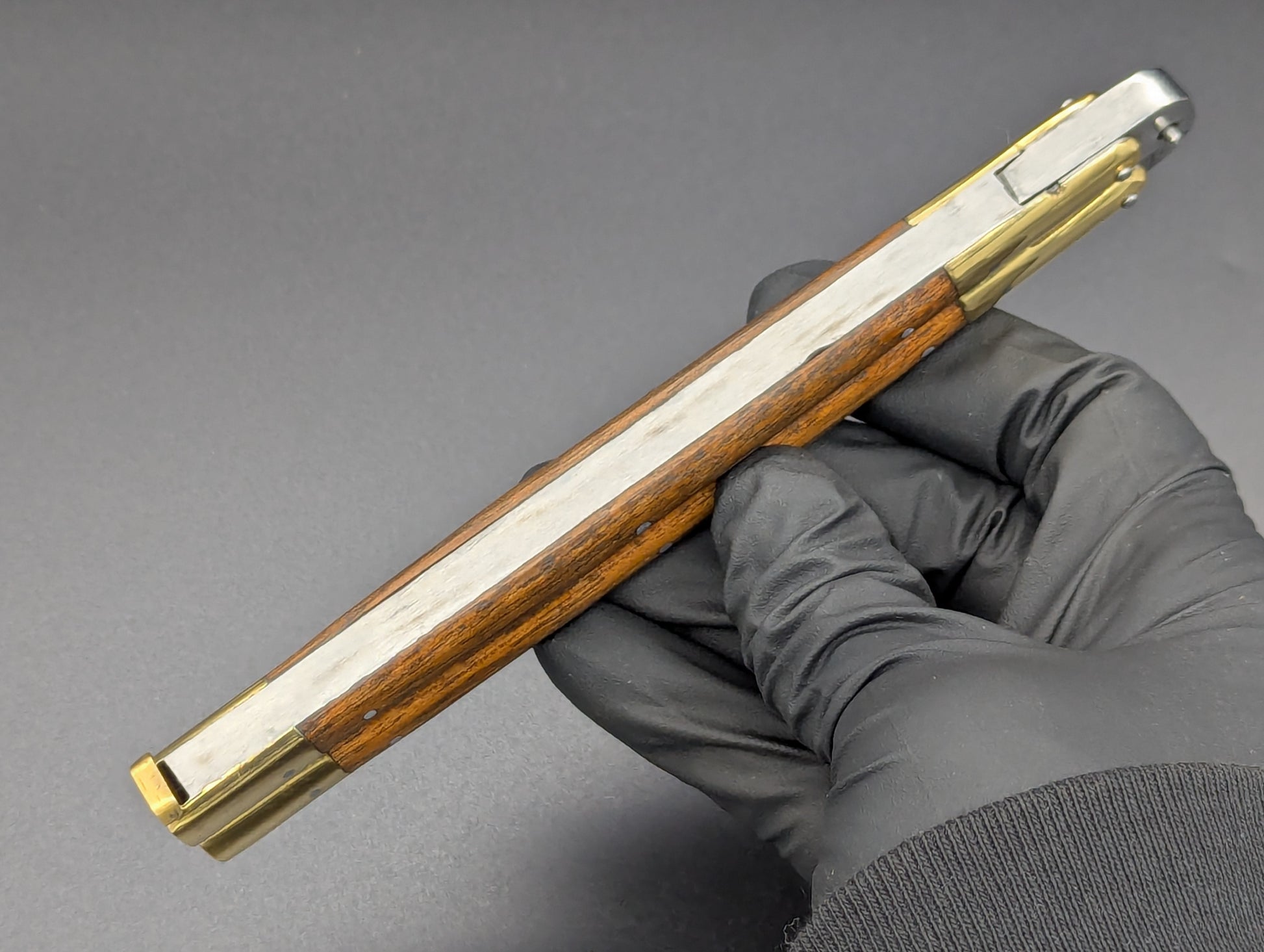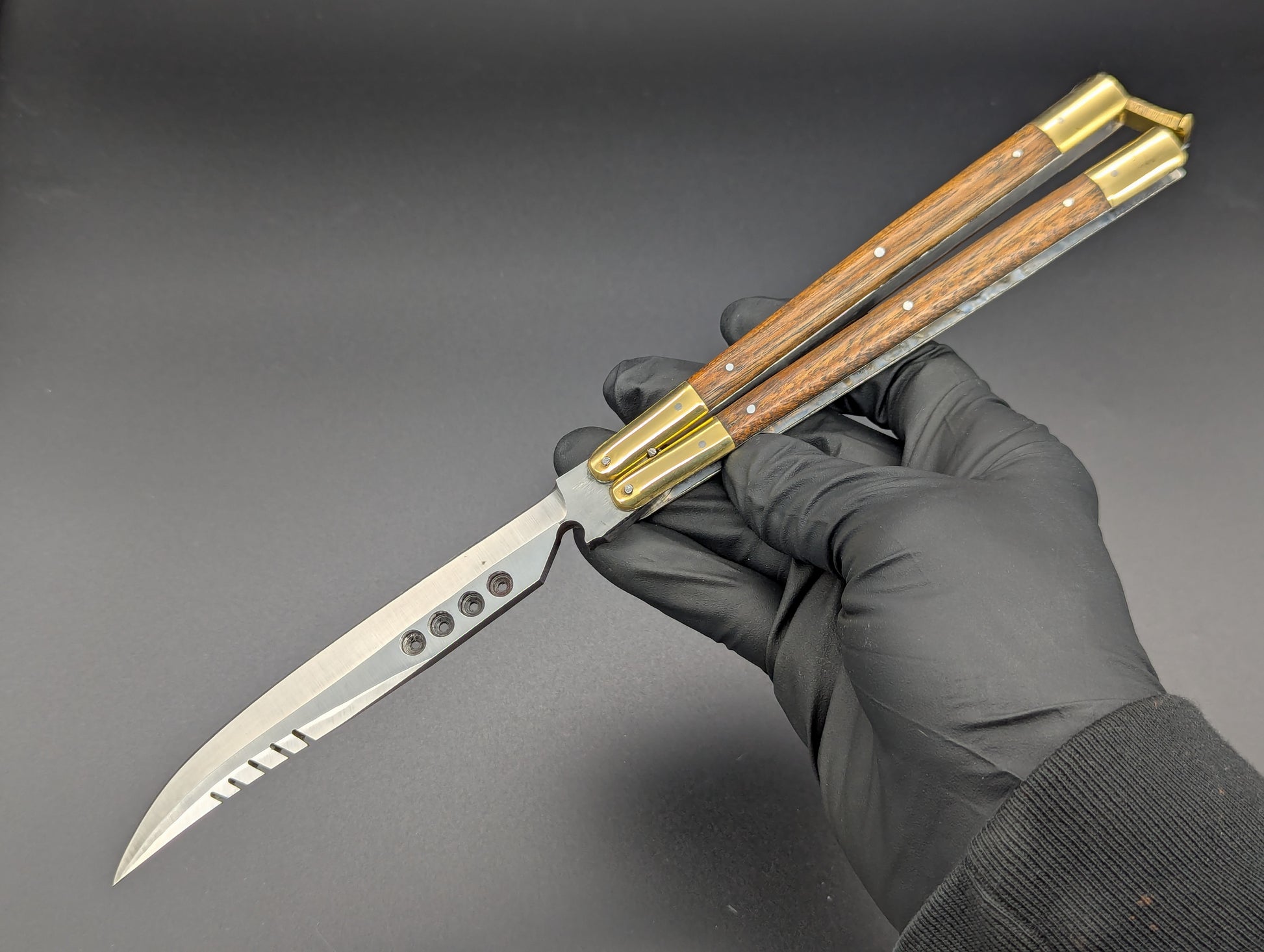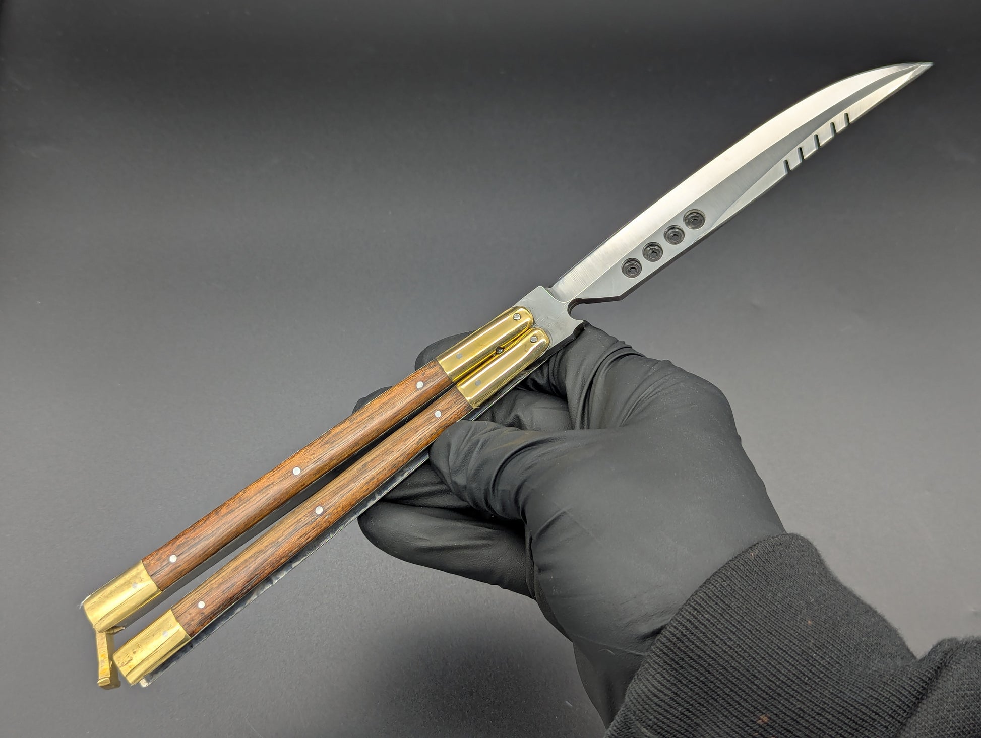 29cm/ 11" OVERALL LENGTH HANDMADE TRADITIONAL PHILIPPINES BALISONG. THIS SERIES IS CALLED THE "SLIM" NARRAWOOD MODEL IS THE HANDLES ARE MUCH SLIMMER THAN MOST. BLADES ARE MADE FROM SPRING OR BEARING STEEL. HANDLES ARE CONSTRUCTED OF BRASS WITH STEEL LINERS WITH BEAUTIFUL NARRA WOOD SCALES. MILLED AND FILEWORKED 5" CLIP POINT BLADE #1 WITH BOTTLE OPENER CUTOUT