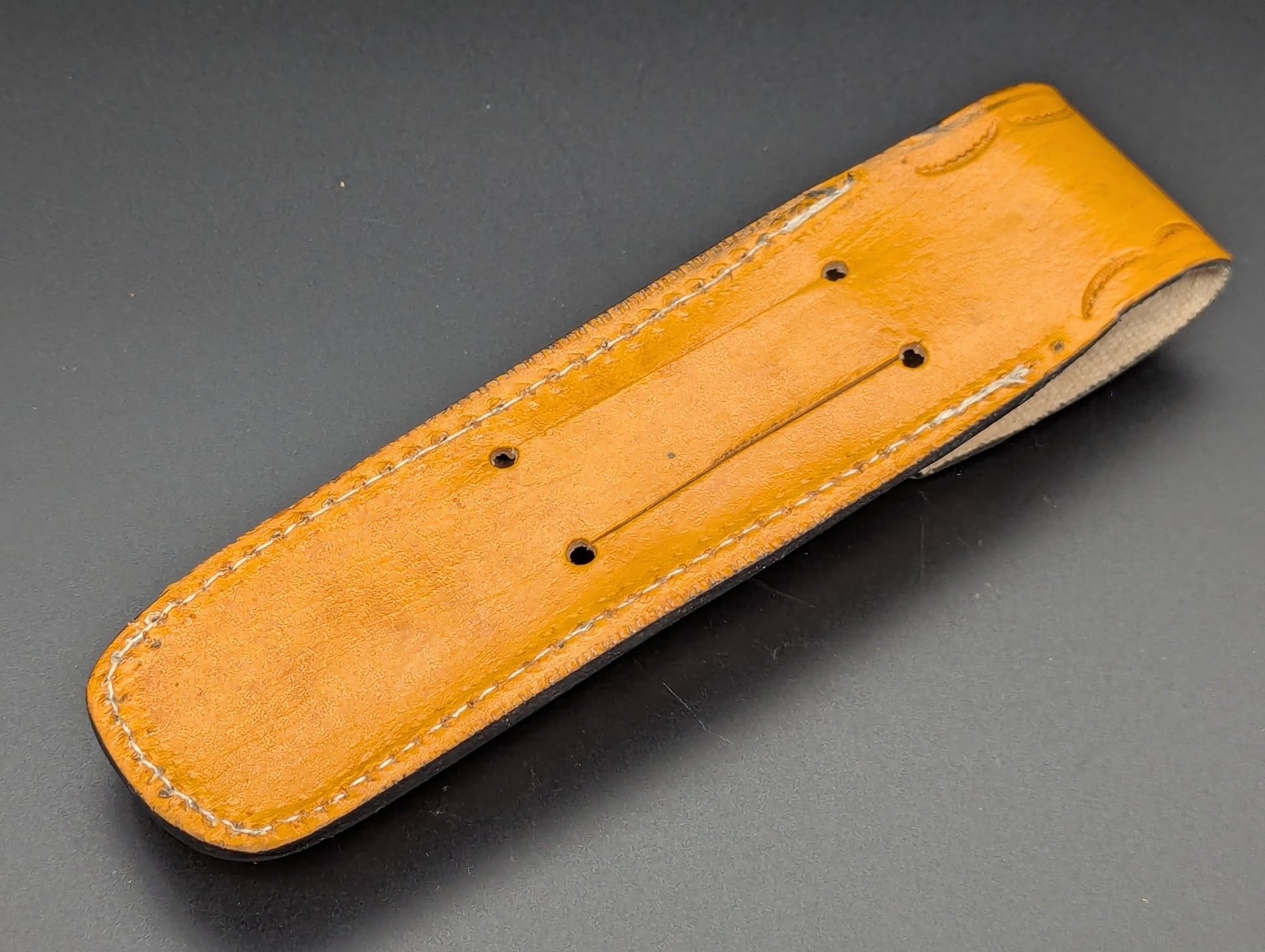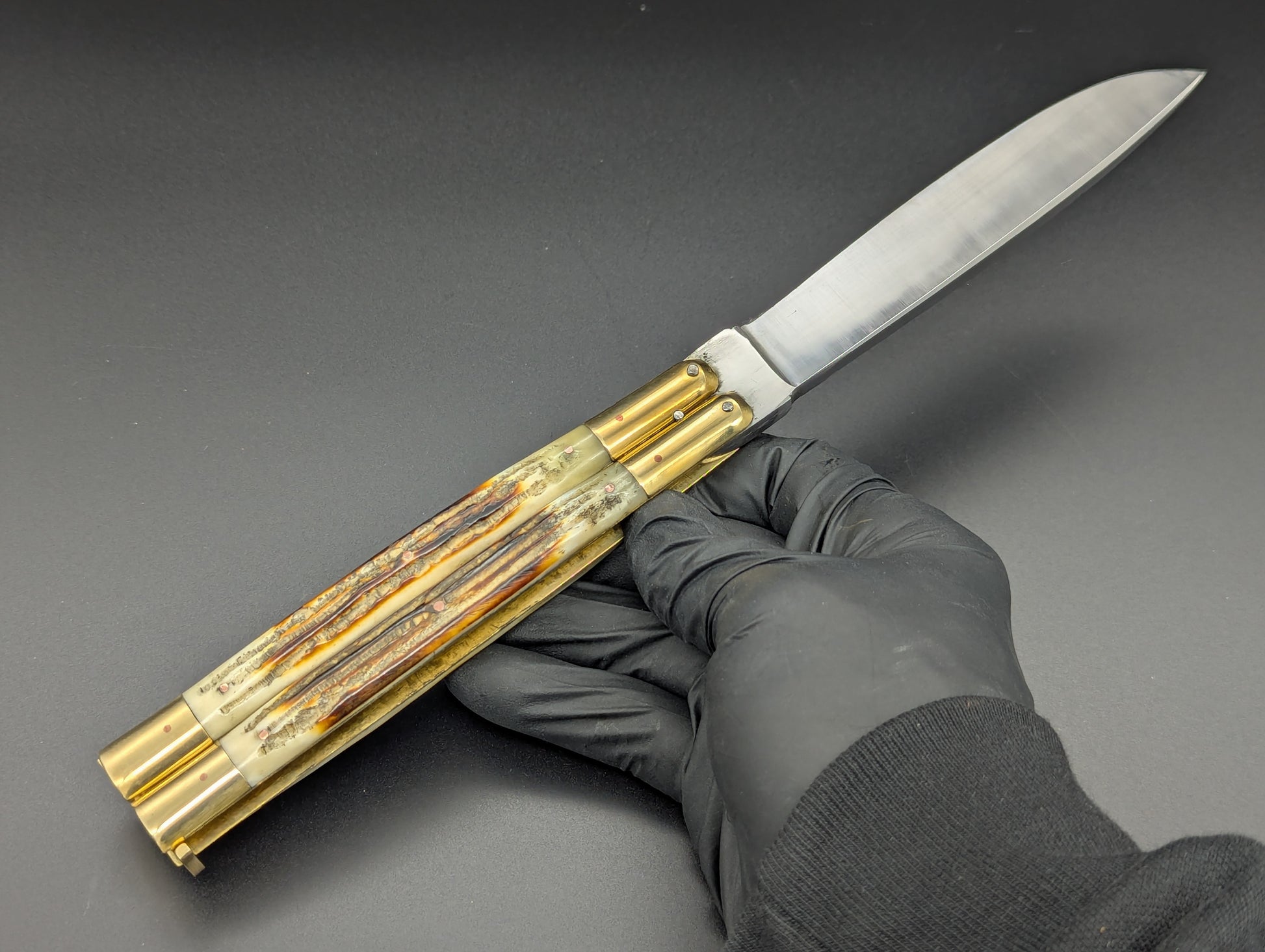 29cm/ 11" SOLID BRASS FHM BALISONG WITH JIGGED COWHORN SCALES, BRASS BOLSTERS. FEATURES A HUGE 5" WIDE DROP POINT BLADE. INCLUDES TAAL BATANGAS PHILIPPINES HANDMADE LEATHER SHEATH. APPROX 200 GRAMS