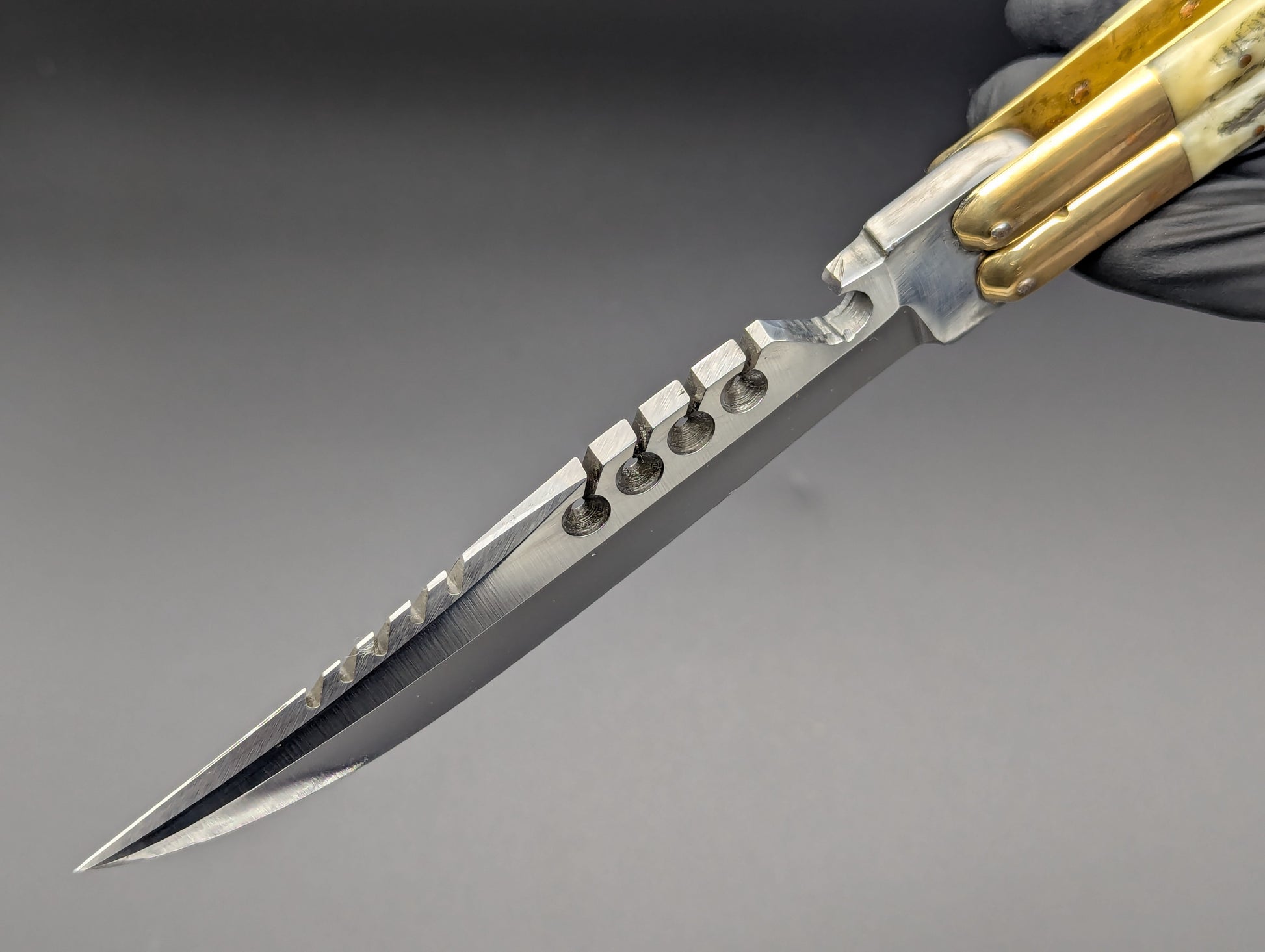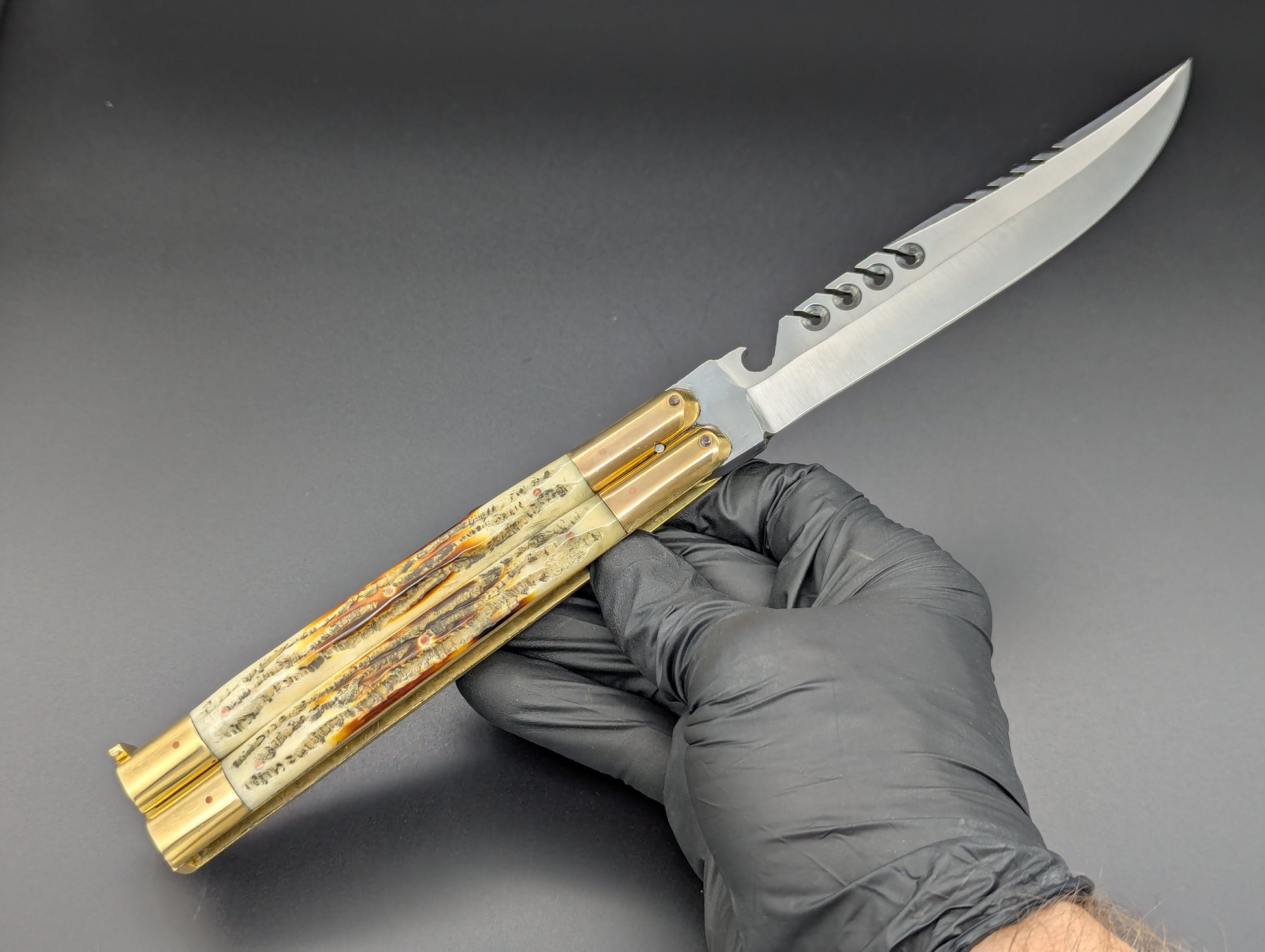 29cm/ 11" SOLID BRASS FHM BALISONG WITH JIGGED COWHORN SCALES, BRASS BOLSTERS. FEATURES A HUGE 5" CLASSIC "RAMBO" STYLE CLIP POINT MILLED BLADE. INCLUDES TAAL BATANGAS PHILIPPINES HANDMADE LEATHER SHEATH. APPROX 200 GRAMS