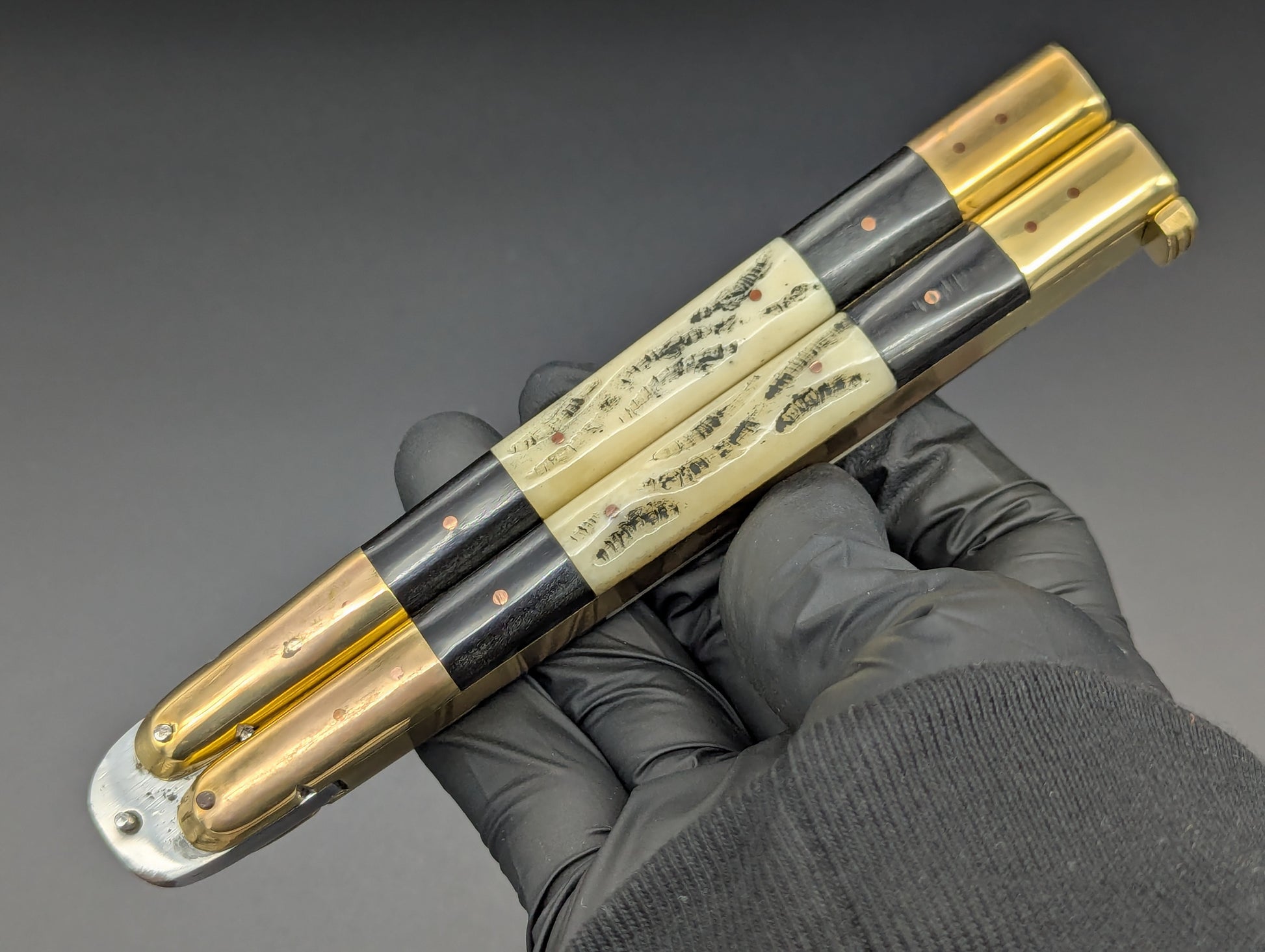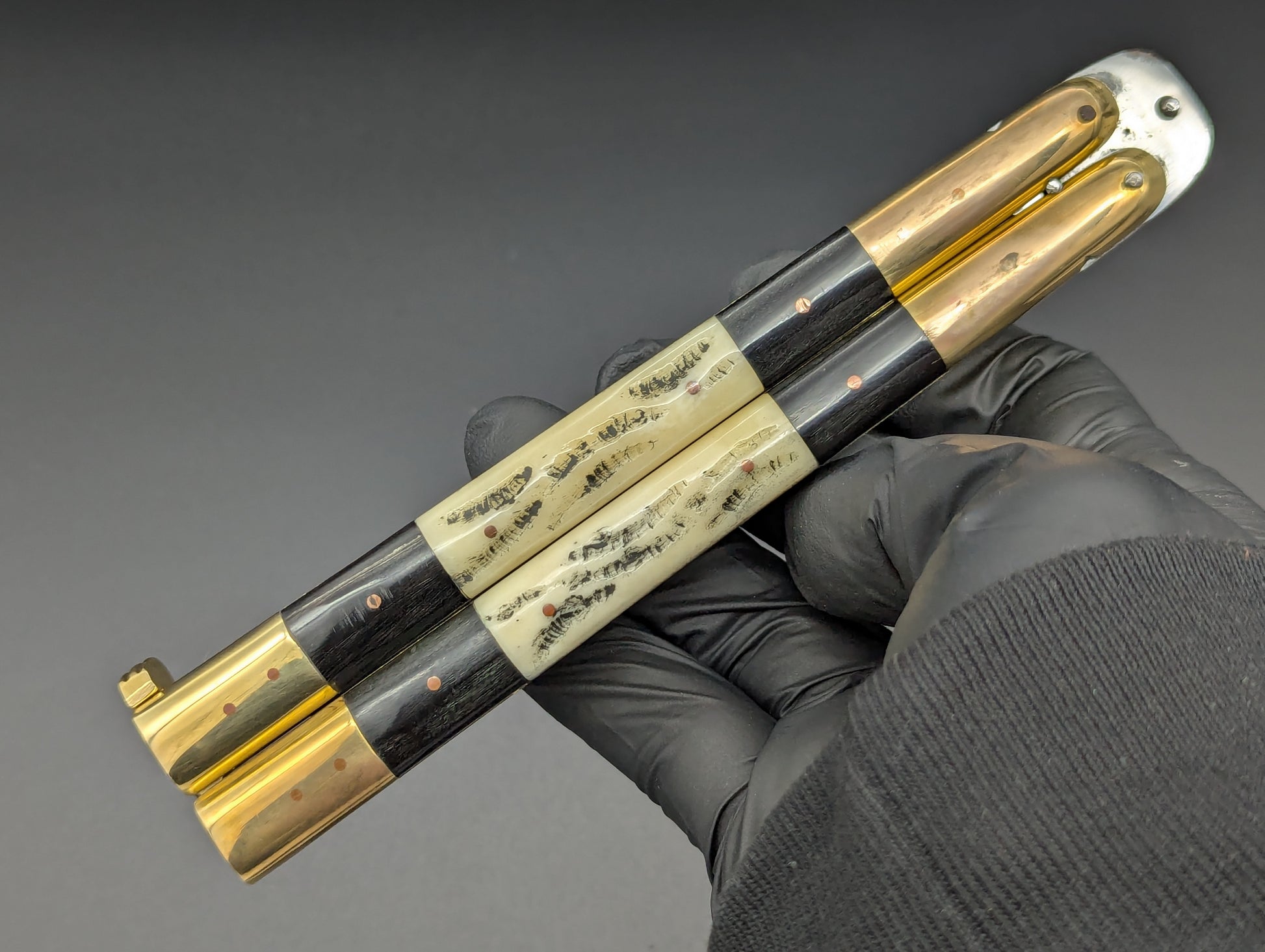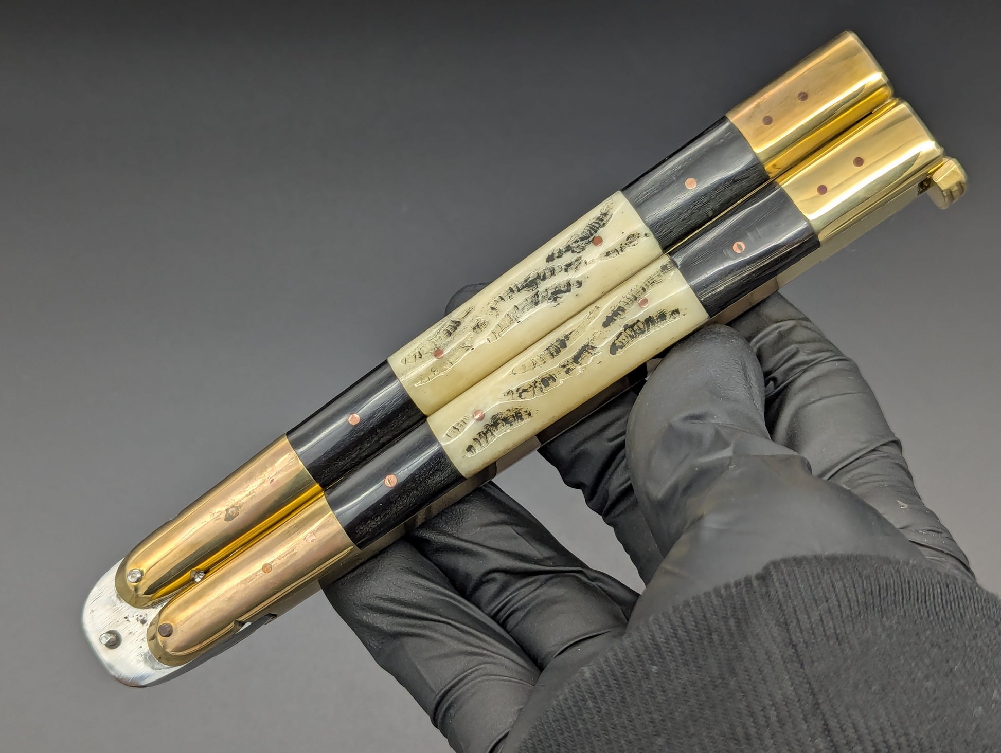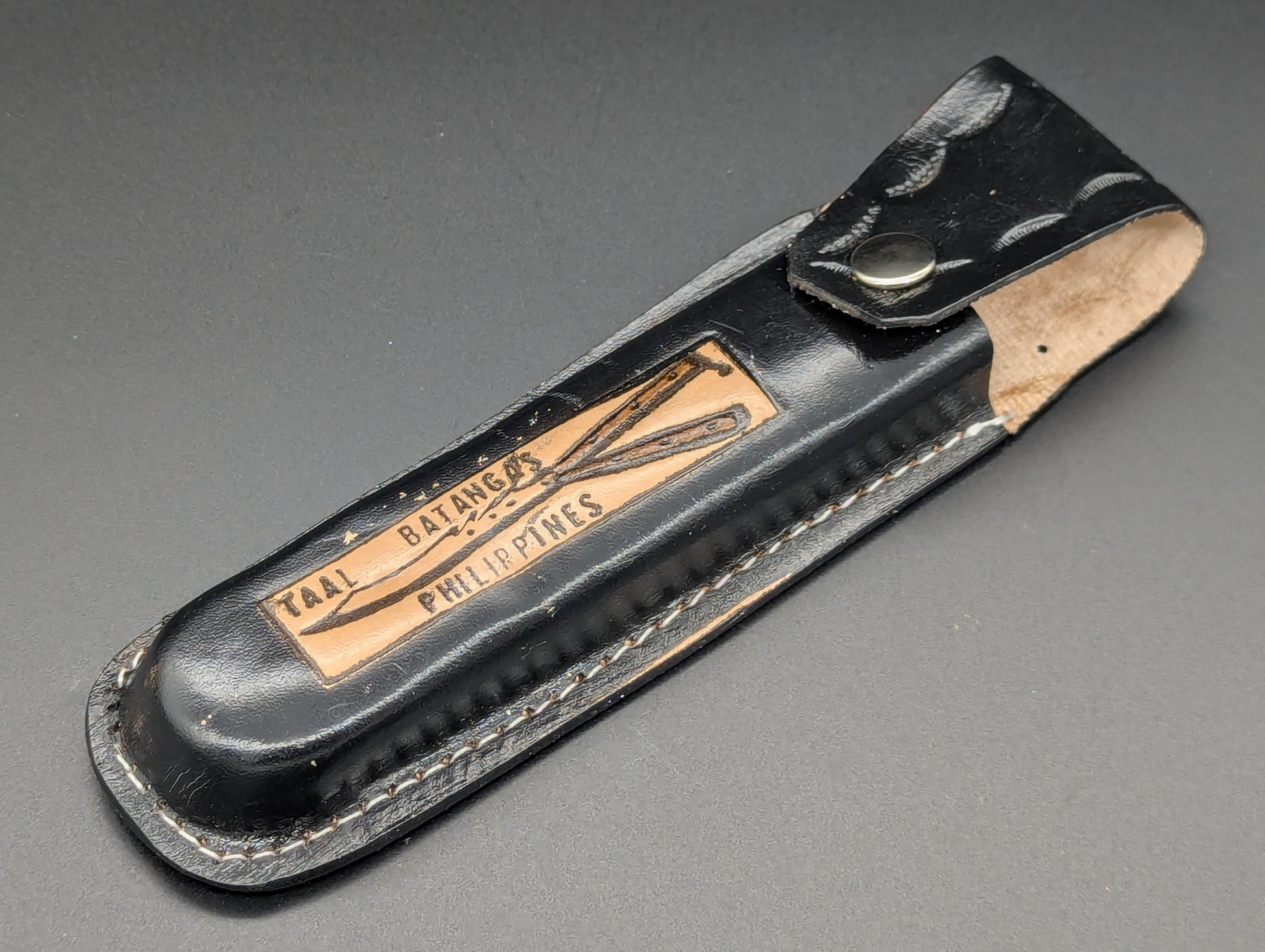 274 GRAM 11" OL "SPECIAL" FHM MODELS w/ MAKERS MARKS ON SAFETY LATCHES. SOLID BRASS HANDLE WITH TRIPLE STACKED BUFFALO HORN, JIGGED COWBONE SCALES & BRASS BOLSTERS. HUGE 5" CLASSIC FHM "RAMBO" STYLE MILLED CLIP POINT WITH FILEWORK. THESE INCLUDE BLACK LEATHER TAAL BATANGAS SHEATHS