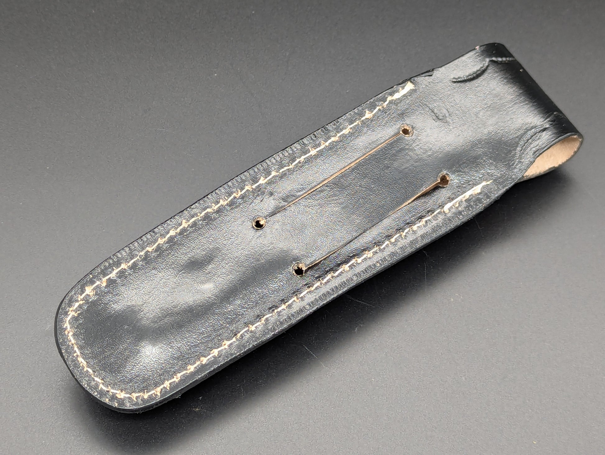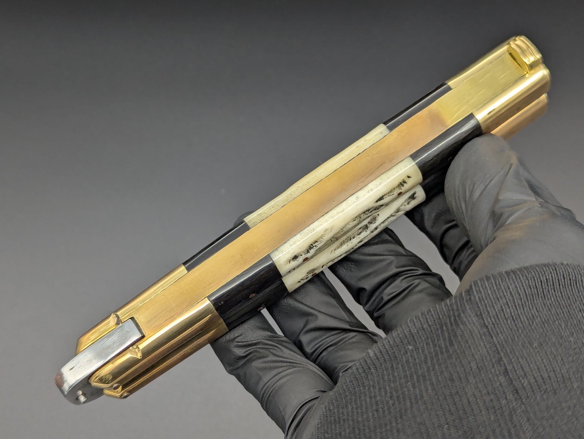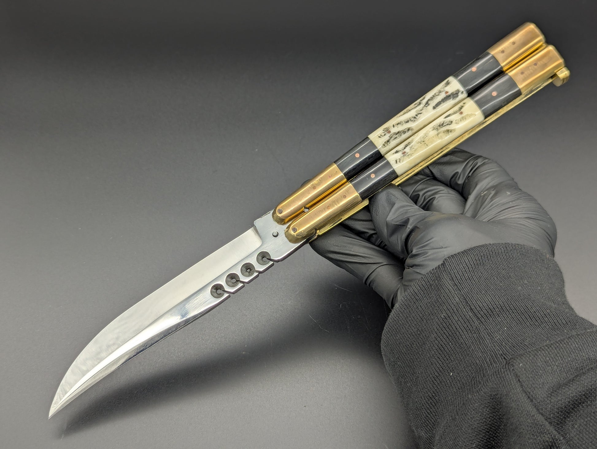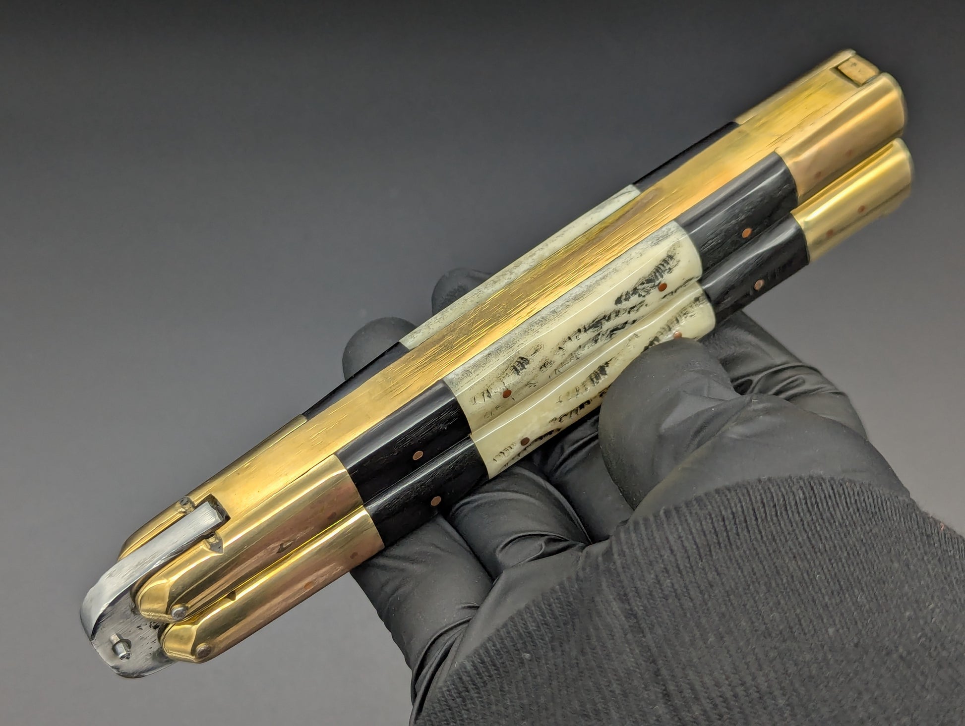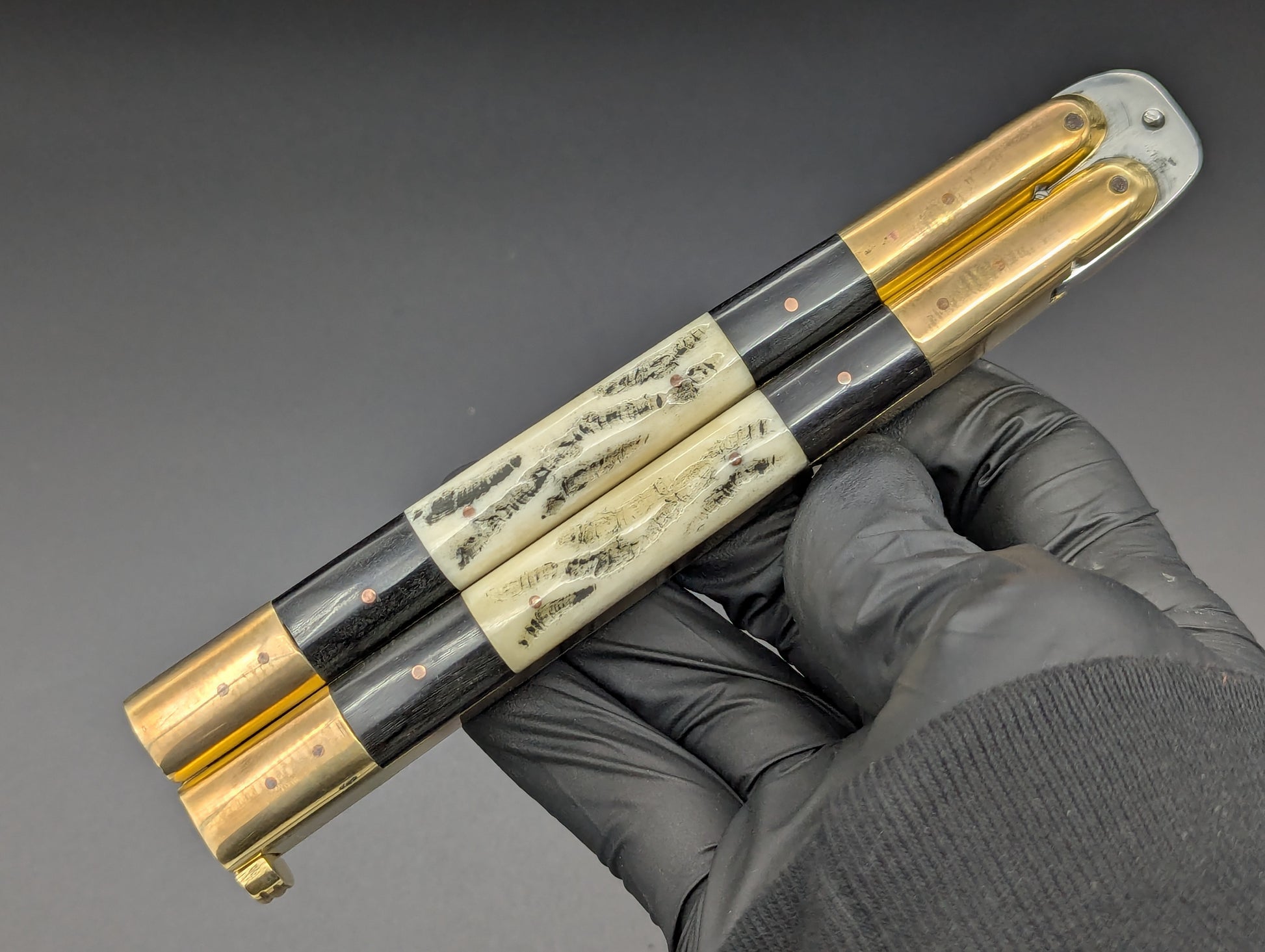 274 GRAM 11" OL "SPECIAL" FHM MODELS w/ MAKERS MARKS ON SAFETY LATCHES. SOLID BRASS HANDLE WITH TRIPLE STACKED BUFFALO HORN, JIGGED COWBONE SCALES & BRASS BOLSTERS. HUGE 5" CLASSIC FHM "RAMBO" STYLE MILLED CLIP POINT WITH FILEWORK. THESE INCLUDE BLACK LEATHER TAAL BATANGAS SHEATHS