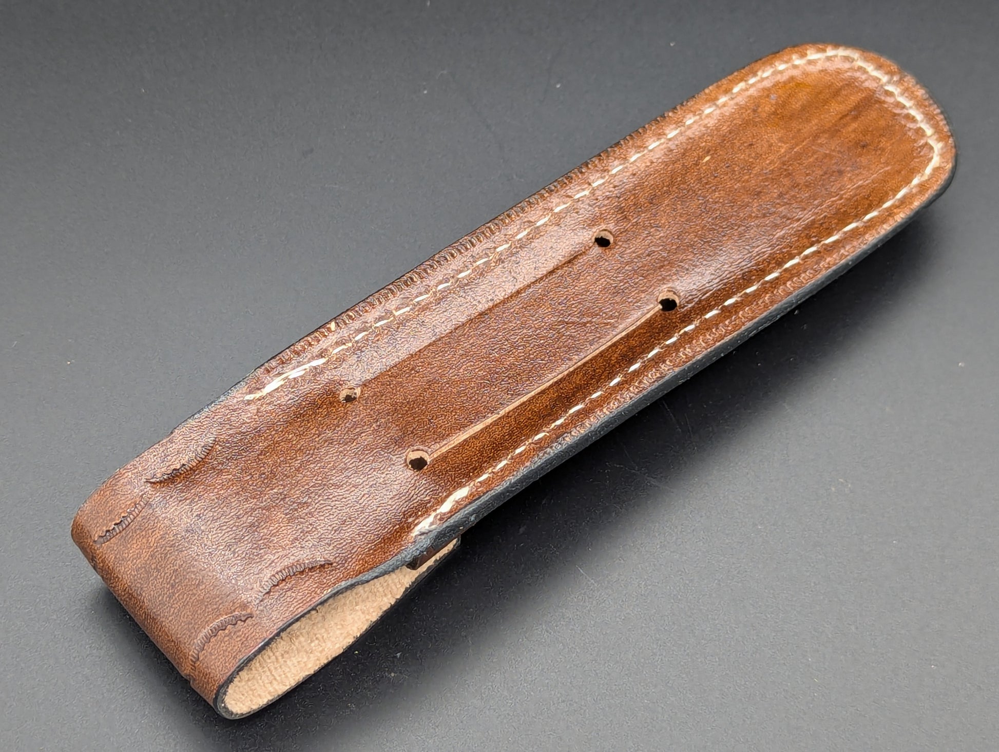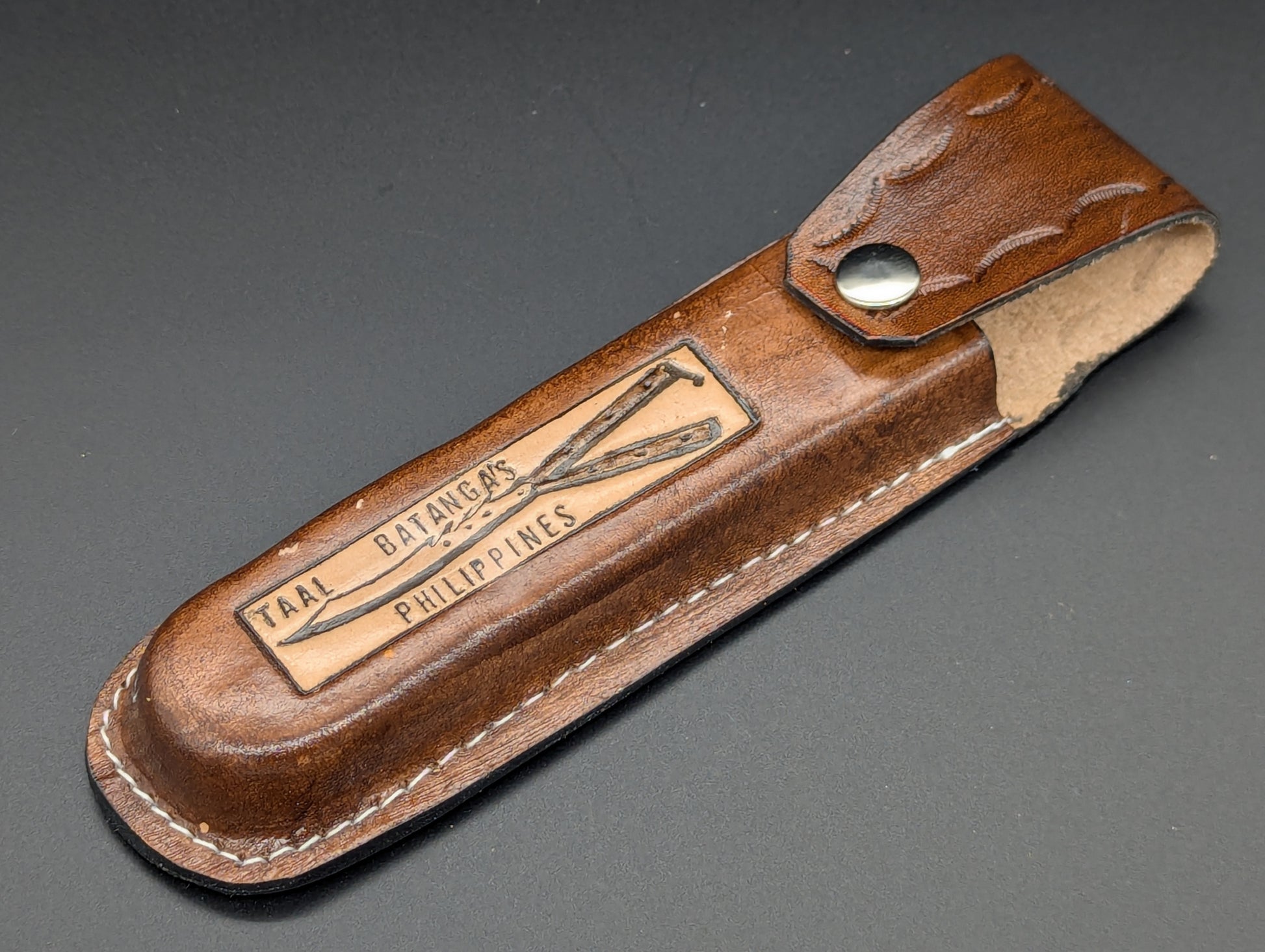 194 Gram 29cm/ 11" OL SOLID BRASS HANDLE "KALAPKUP" STYLE PHILIPPINES HANDMADE BALISONG. FEATURES RED COMPOSITE SCALES WITH BRASS TRIBAL DESIGN OVERLAY AND BOLSTERS. THIS MODEL OFFERS UP A BIG OLE 5" "RAMBO" STYLE FILEWORKED & MILLED CLIP POINT BLADE WITH CLASSIC BOTTLE OPENER CUTOUT ON THE BLADE TANG. INCLUDES TAAL BATANGAS PHILIPPINES HANDMADE LEATHER SHEATH