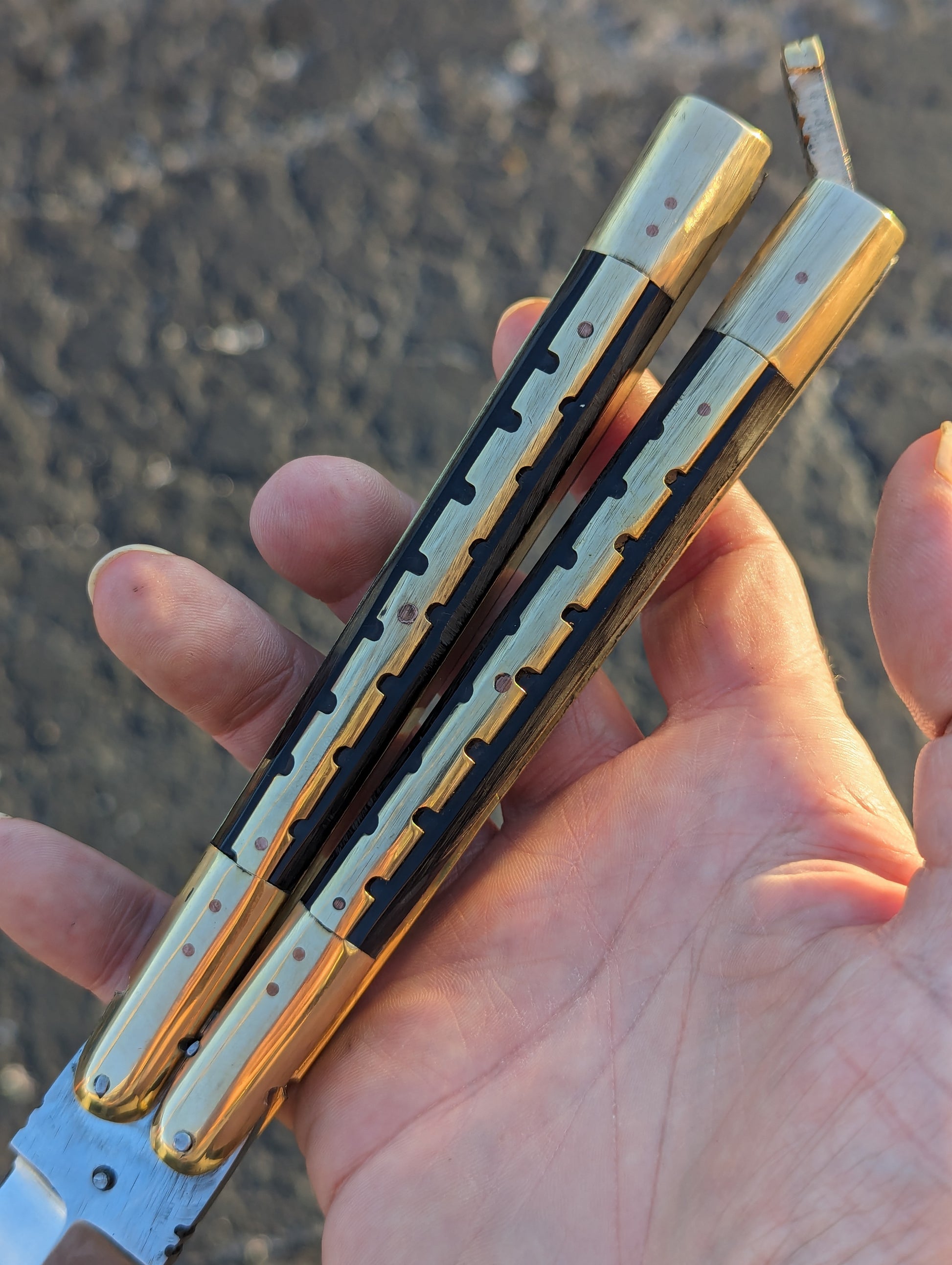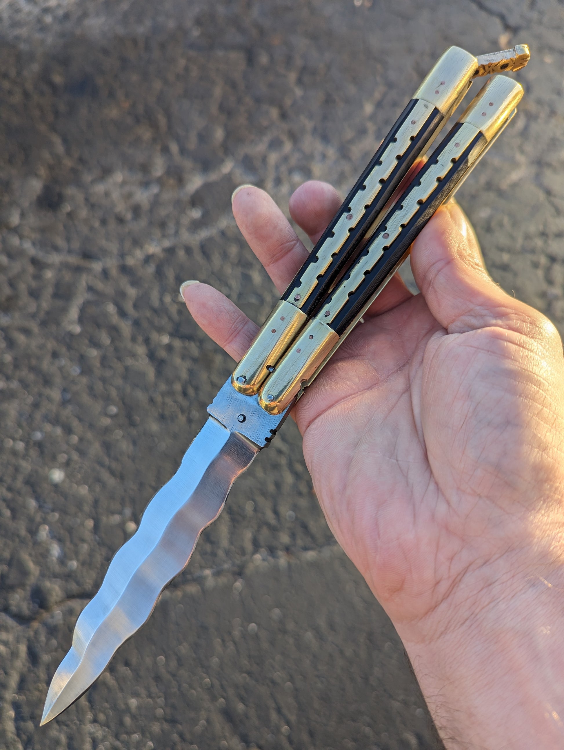 BEAUTIFUL TRADITIONAL HANDMADE PHILIPPINES KRIS BLADE BALISONG. "KALUPKOP " STYLE. ALL BRASS TRIBAL WORKED SCALE DESIGN WITH BLACK HORN SCALES. 310 GRAM HEAVYWEIGHT MODEL. THESE ARE MADE AS FOLDING KNIVES. THE HANDLES FOLD OVER TO COVER THE BLADE INITIALLY. BUT THEY WILL LOOSEN IN TIME AND BE ABLE TO "FLIP" LIKE THE BUTTERFLY KNIVES WE HAVE COME TO KNOW