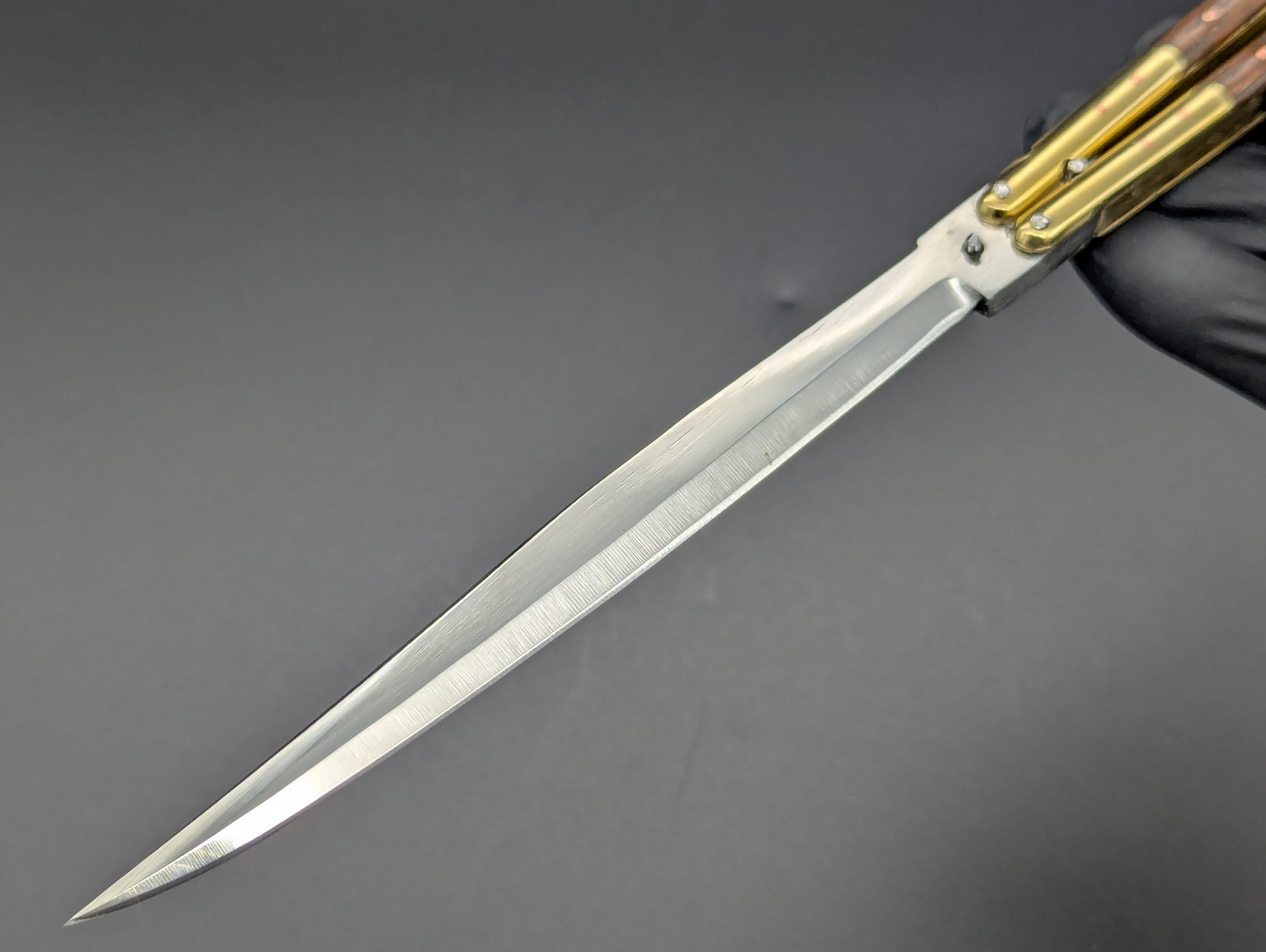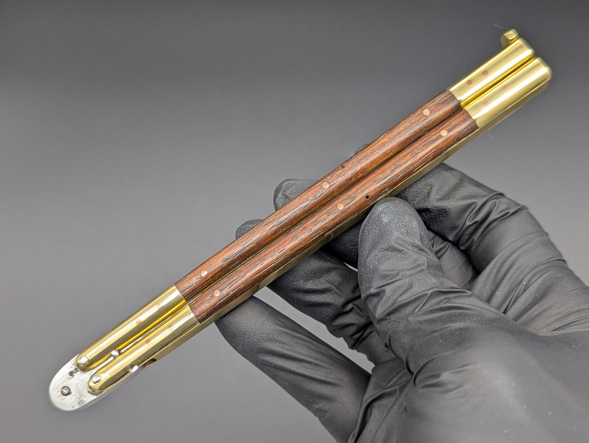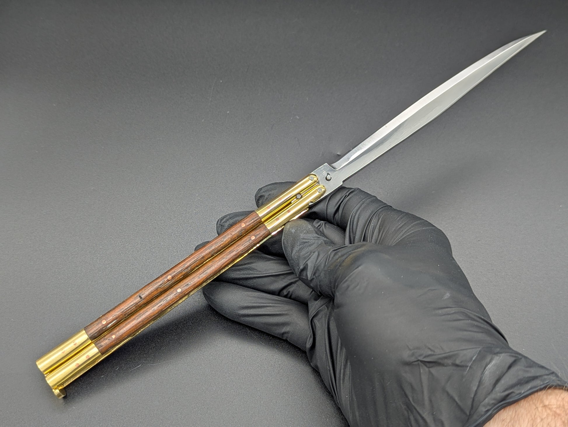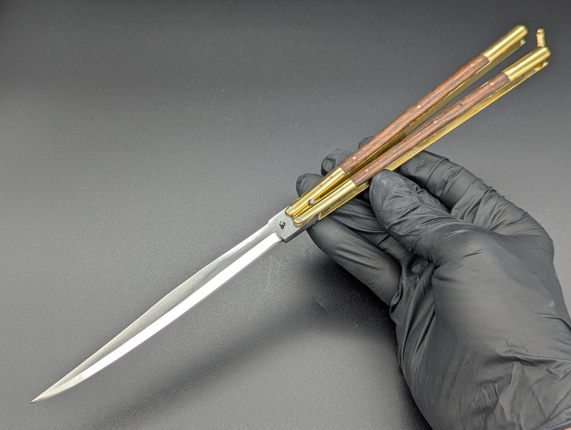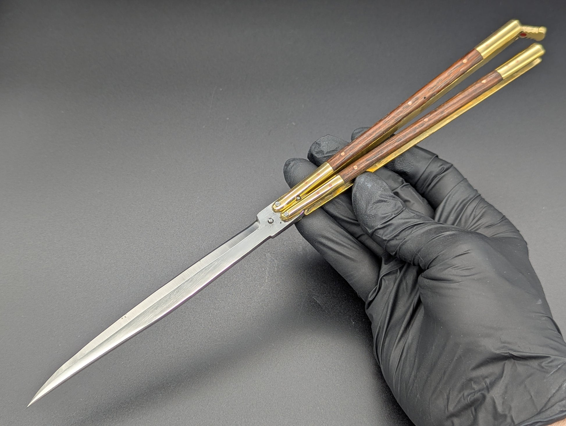 11" OL ULTRA SLIMLINE PHILIPPINES HANDMADE BALISONG WITH SOLID NARRAWOOD SCALES. SOLID BRASS HANDLES. REPURPOSED FILL TOOL STEEL BLADE WITH CLIP POINT GRIND. OVERALL WEIGHT 94 GRAMS. BEAUTIFUL KNIFE WILL SLIP RIGHT THOUGH THE OPENING OF THE SMALLEST BOTTLE! IYKYK 🤗