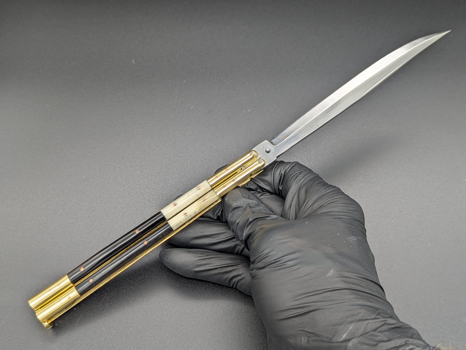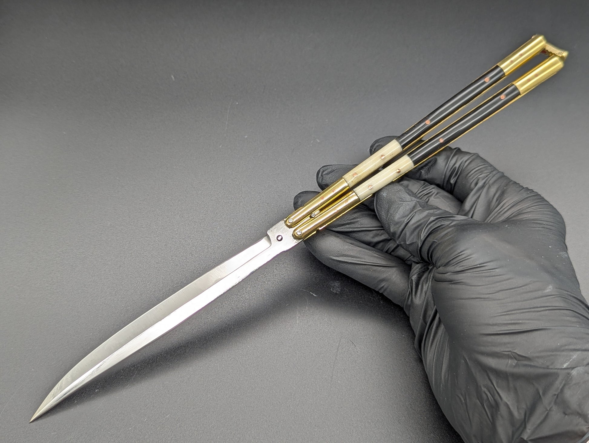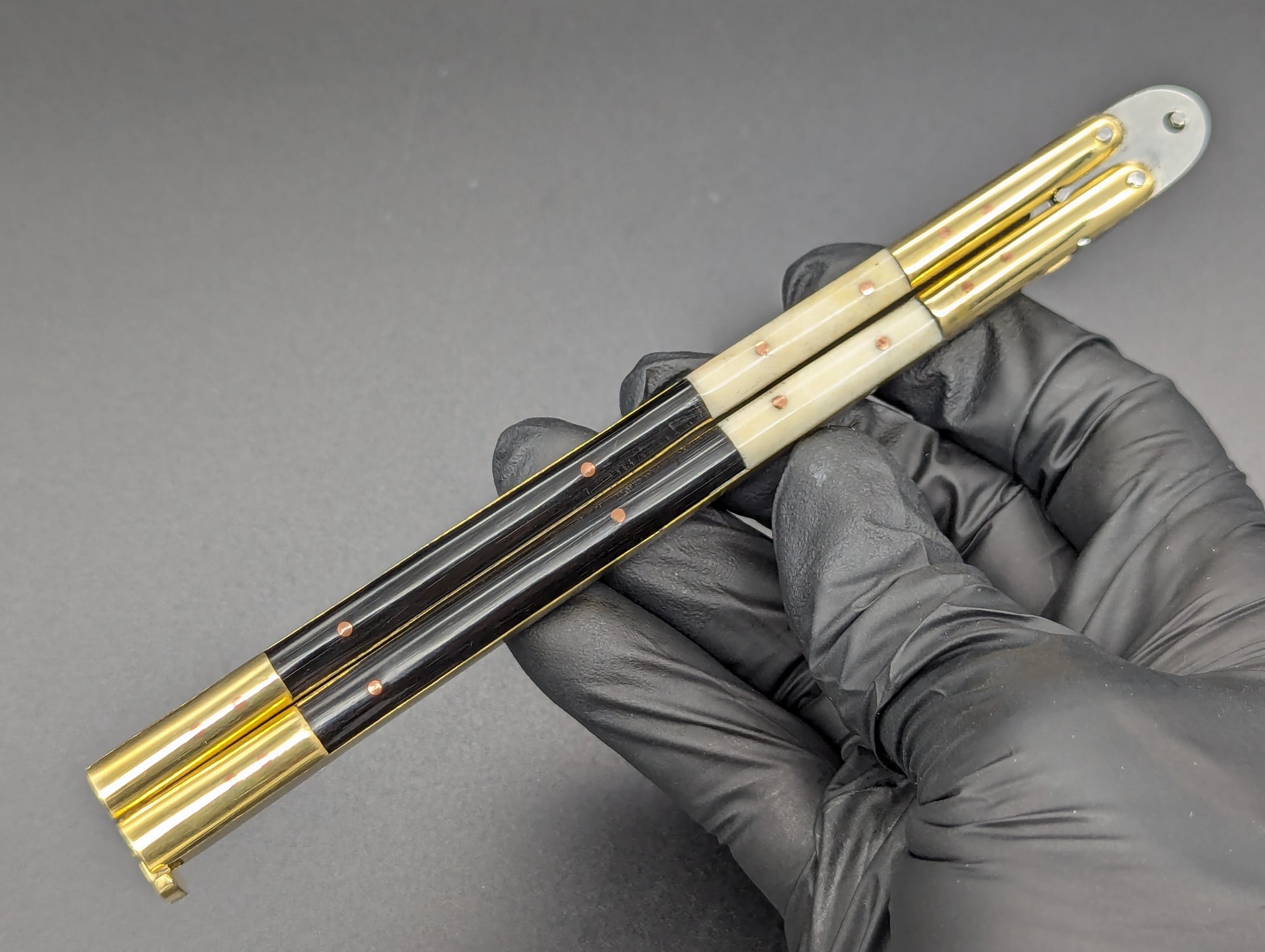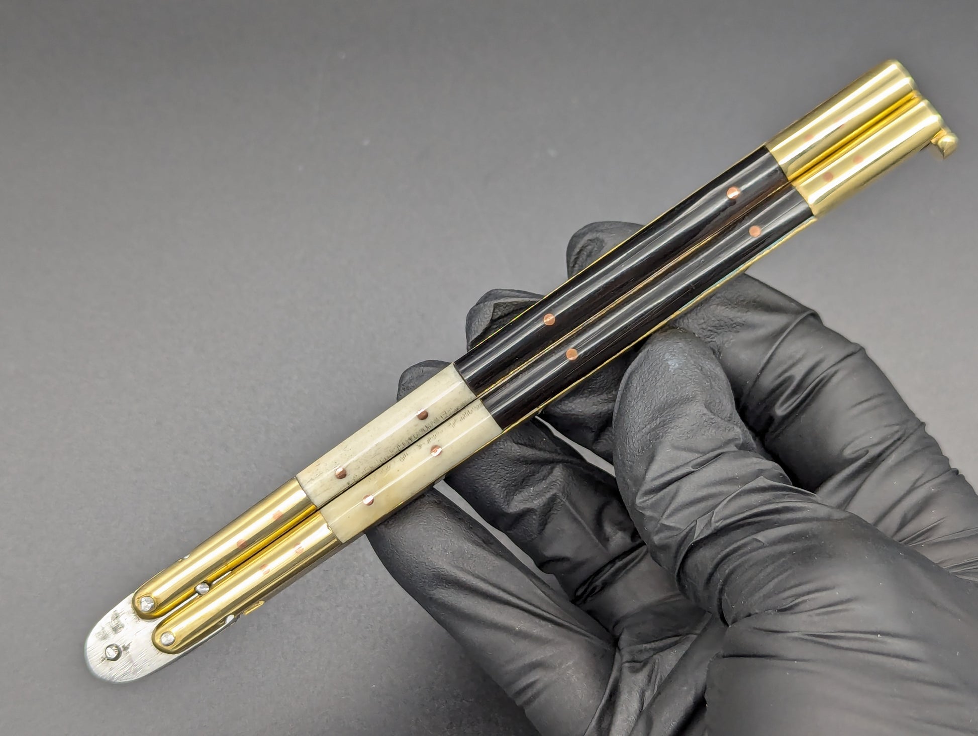 11" OL ULTRA SLIMLINE PHILIPPINES HANDMADE BALISONG WITH 2-TONED DOUBLE STACKED BONE AND BUFFALO HORN SCALES. SOLID BRASS HANDLES. REPURPOSED FILE TOOL STEEL BLADE WITH CLIP POINT GRIND. OVERALL WEIGHT 100 GRAMS. BEAUTIFUL KNIFE WILL SLIP RIGHT THOUGH THE OPENING OF THE SMALLEST BOTTLE! IYKYK 🤗