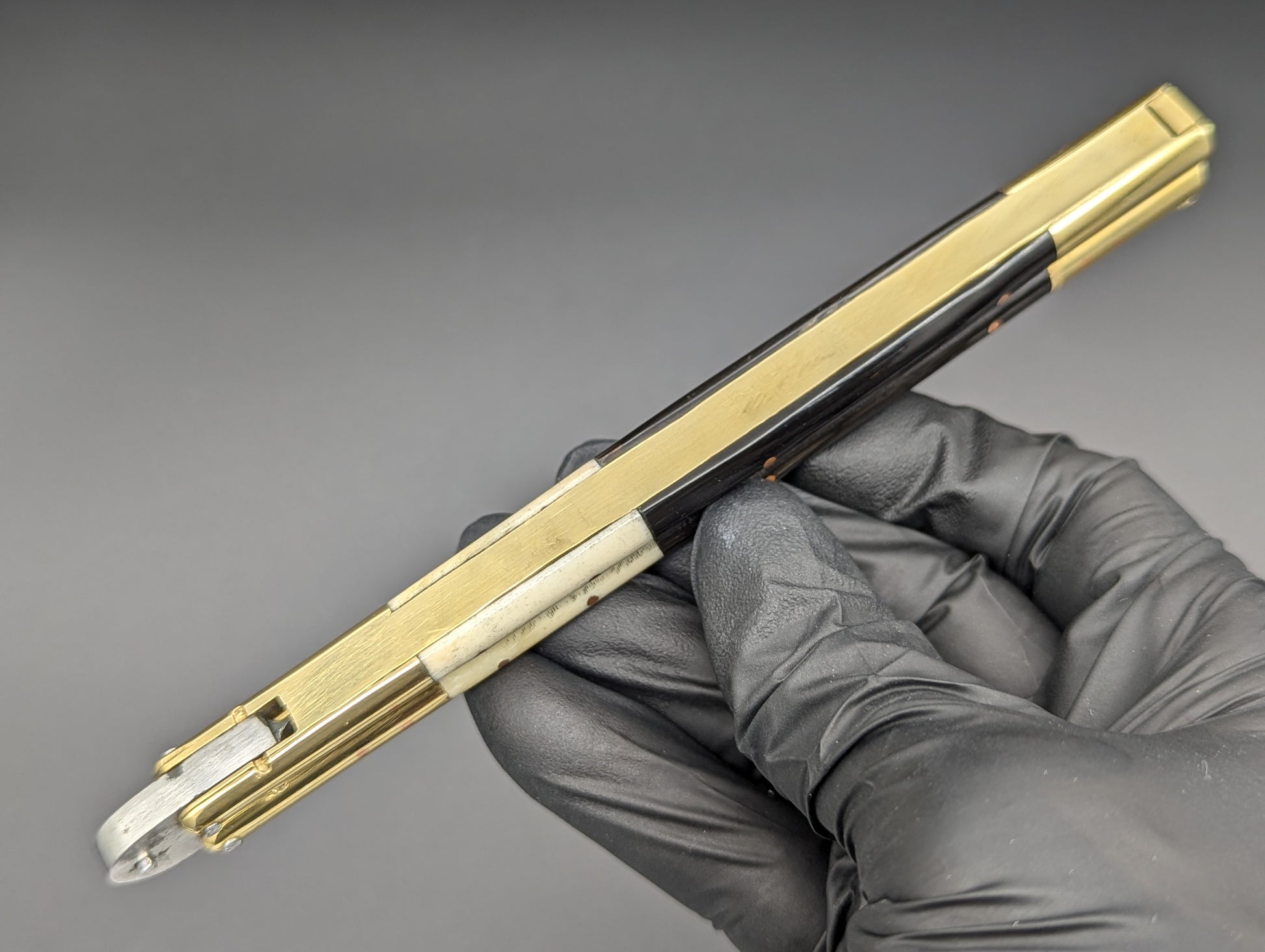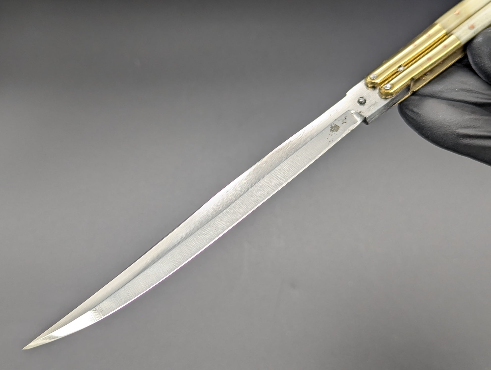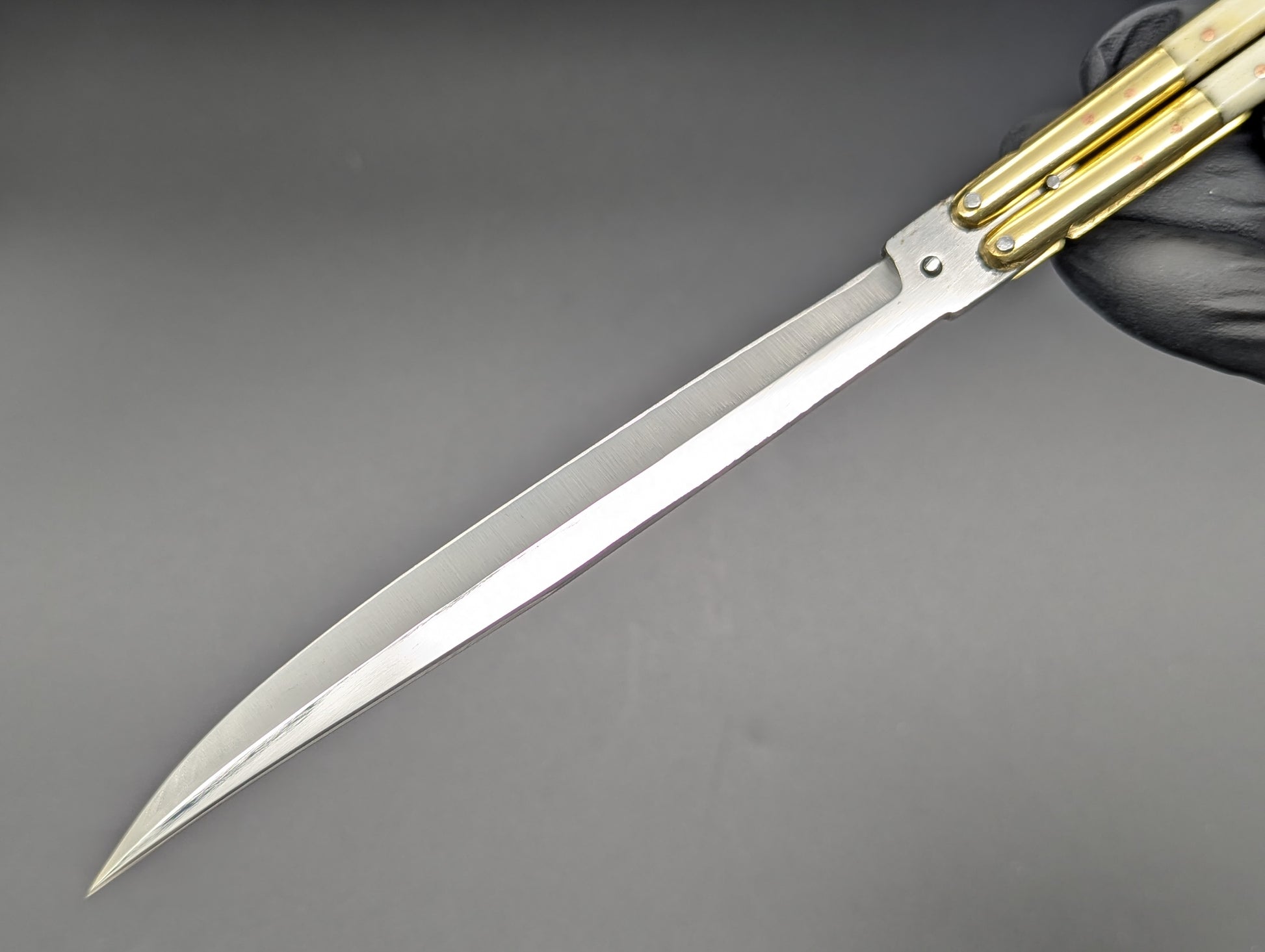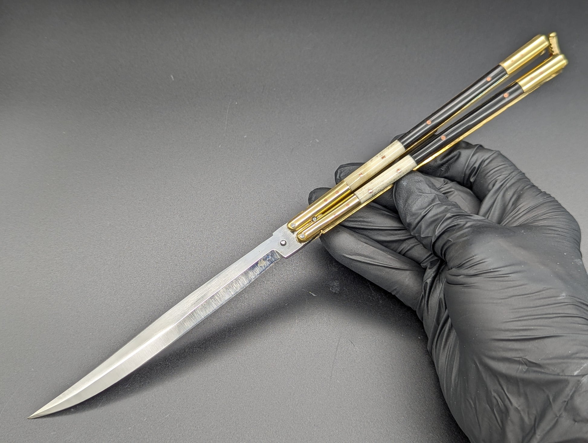 11" OL ULTRA SLIMLINE PHILIPPINES HANDMADE BALISONG WITH 2-TONED DOUBLE STACKED BONE AND BUFFALO HORN SCALES. SOLID BRASS HANDLES. REPURPOSED FILE TOOL STEEL BLADE WITH CLIP POINT GRIND. OVERALL WEIGHT 100 GRAMS. BEAUTIFUL KNIFE WILL SLIP RIGHT THOUGH THE OPENING OF THE SMALLEST BOTTLE! IYKYK 🤗