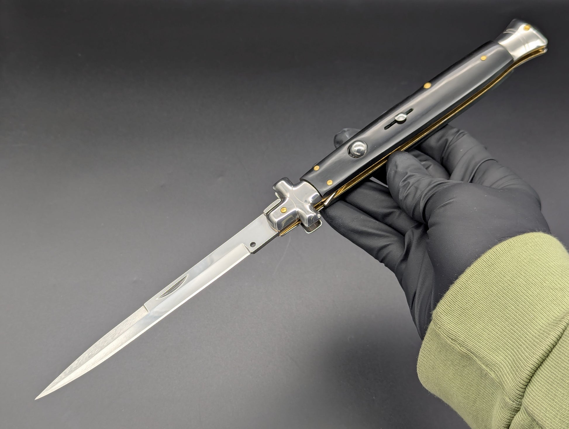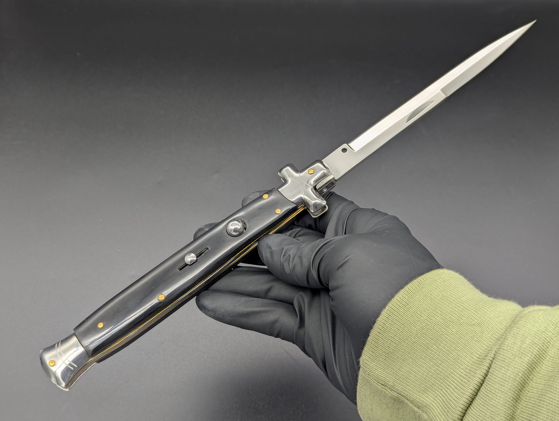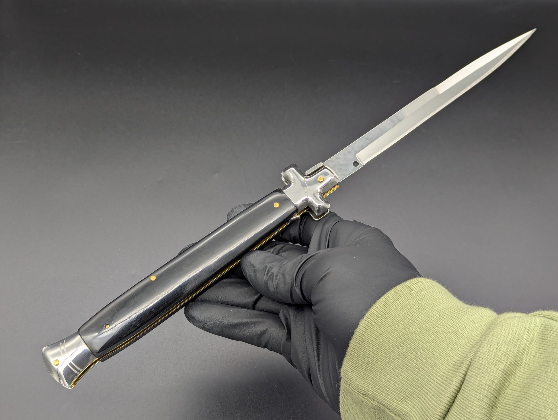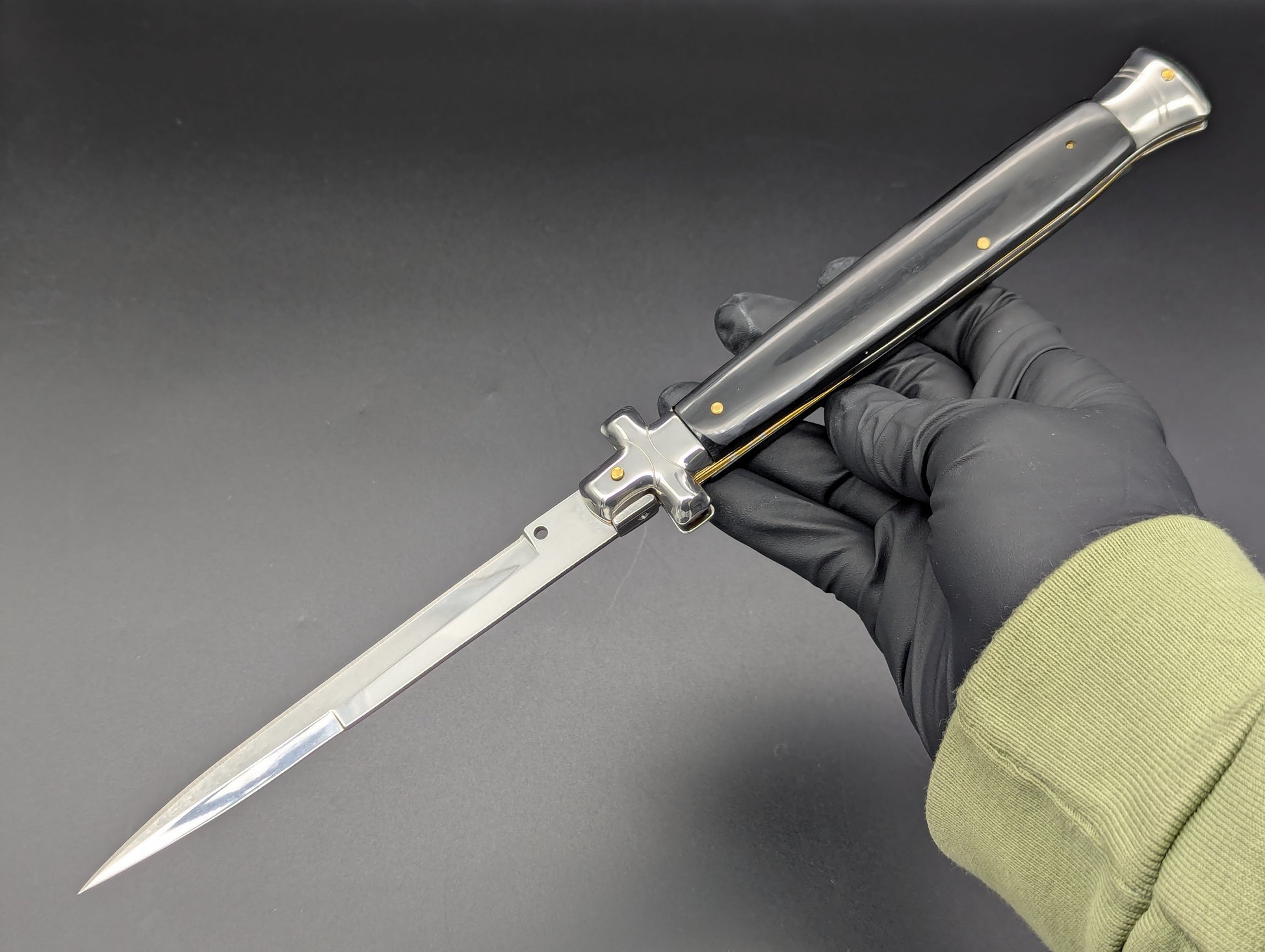 13" OVERALL OPEN LENGTH ITALIAN STYLE STILETTOS. BEAUTIFUL SOLID BLACK COMPOSITE SCALES. GIANT STAINLESS BAYONET GRIND BLADE. POWERFUL LEAF SPRING OPENING WITH SOLID LOCKUP EVERYTIME. SLIDING SAFETY LOCK MECHANISM! THESE ARE ABSOLUTELY AMAZING QUALITY! 6" BLADE LENGTH