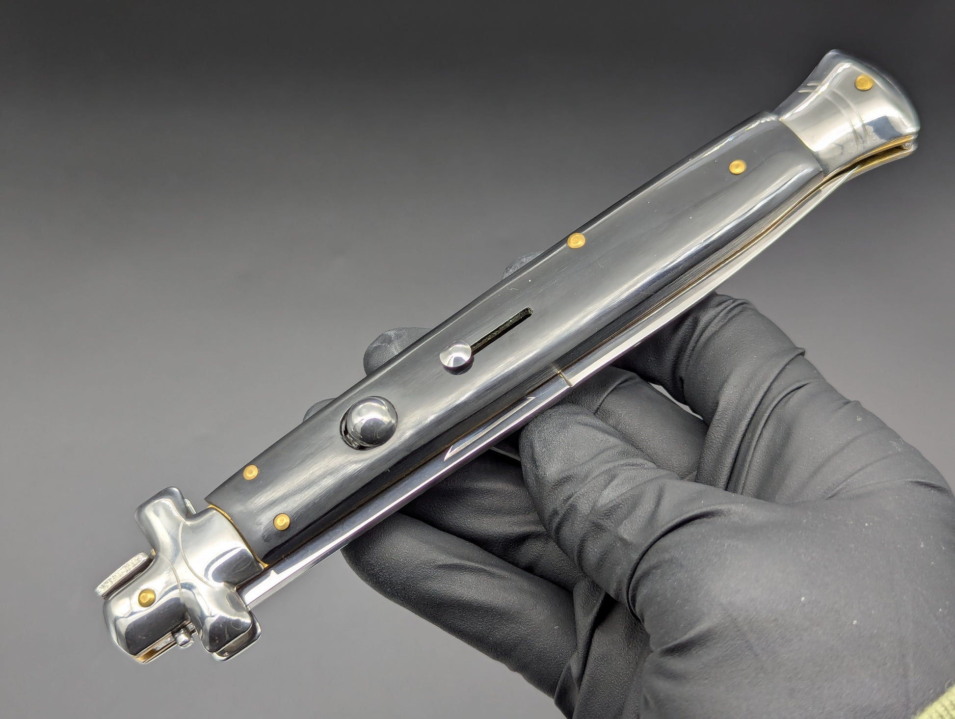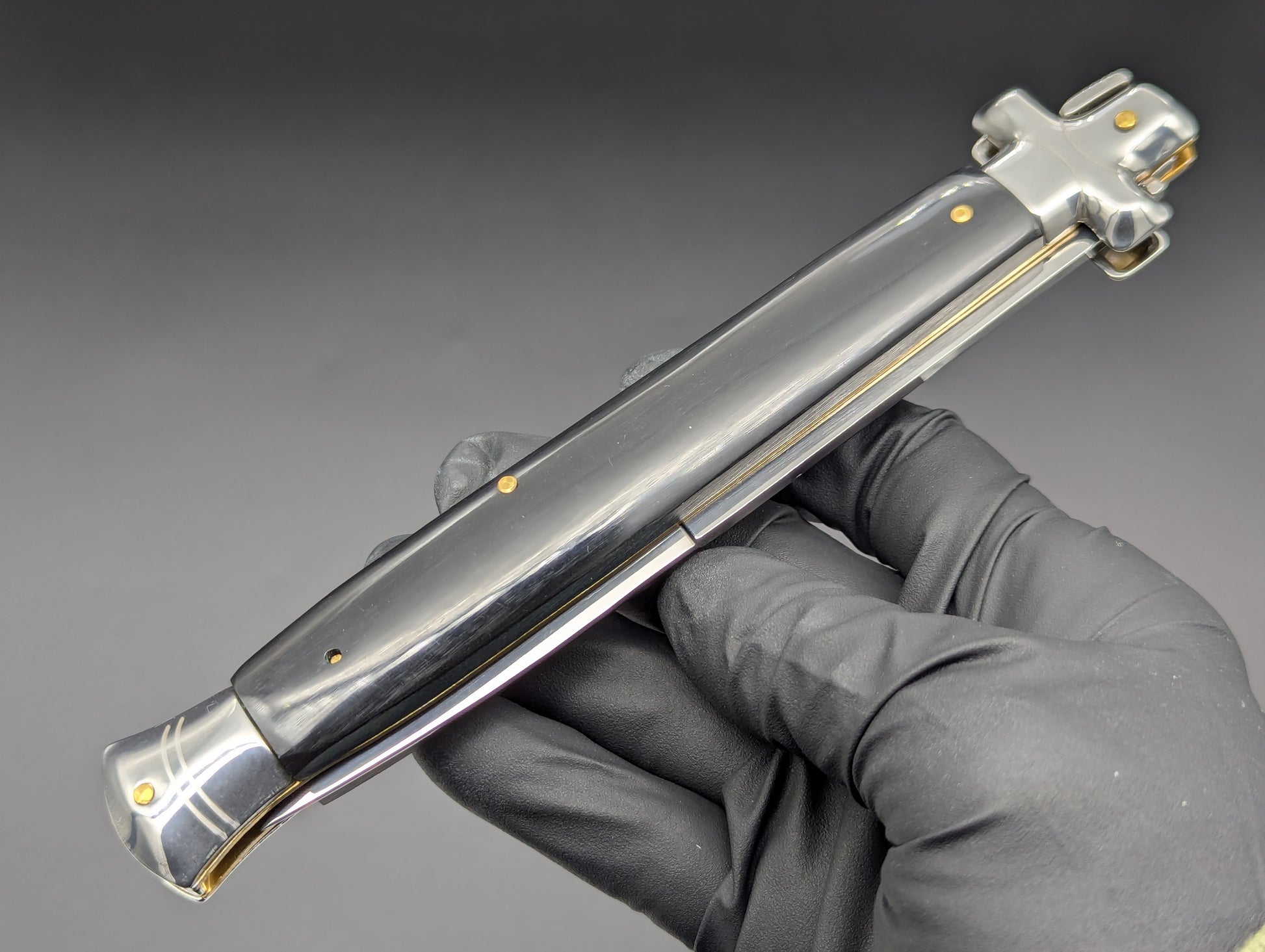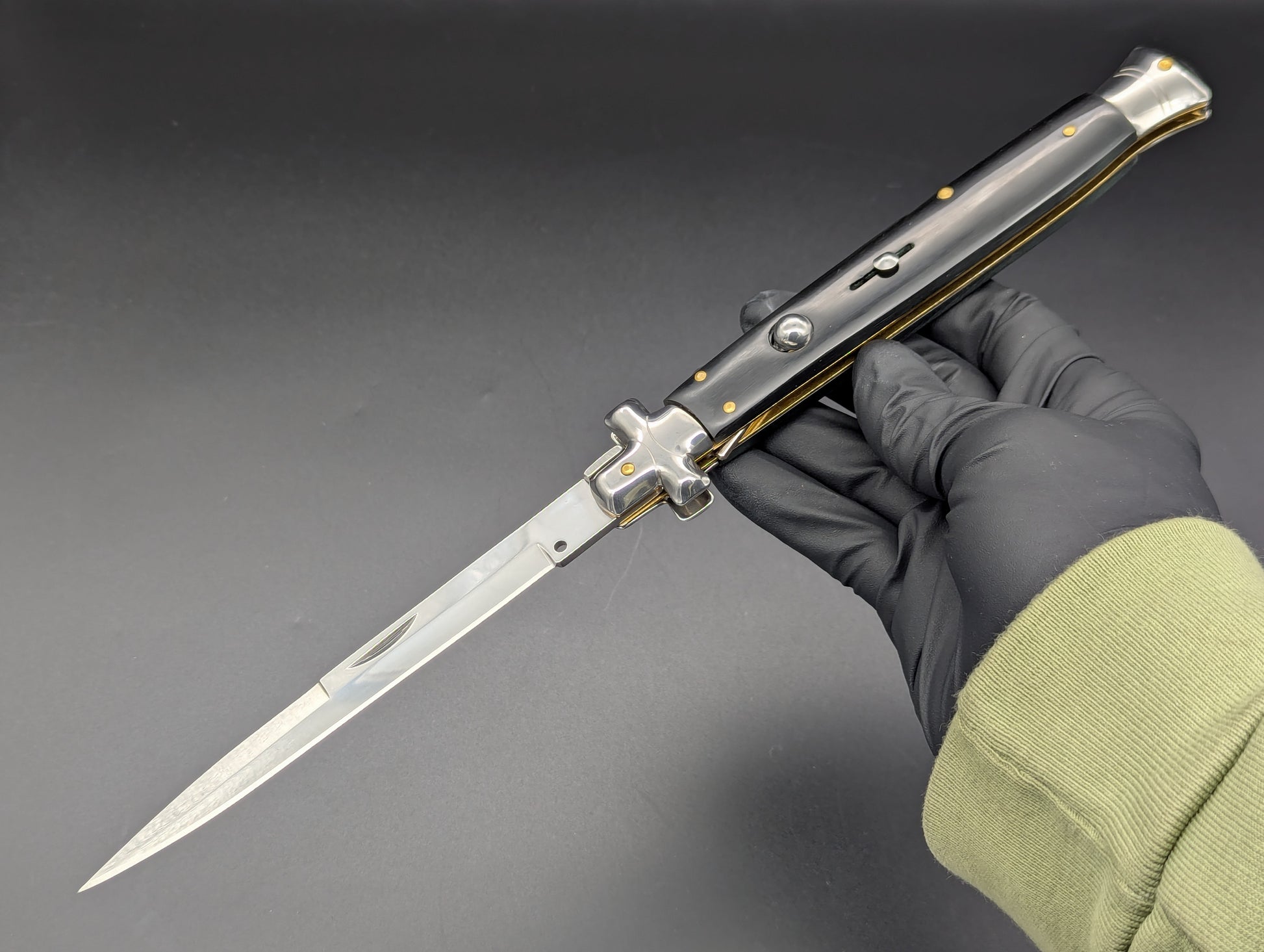 13" OVERALL OPEN LENGTH ITALIAN STYLE STILETTOS. BEAUTIFUL SOLID BLACK COMPOSITE SCALES. GIANT STAINLESS BAYONET GRIND BLADE. POWERFUL LEAF SPRING OPENING WITH SOLID LOCKUP EVERYTIME. SLIDING SAFETY LOCK MECHANISM! THESE ARE ABSOLUTELY AMAZING QUALITY! 6" BLADE LENGTH