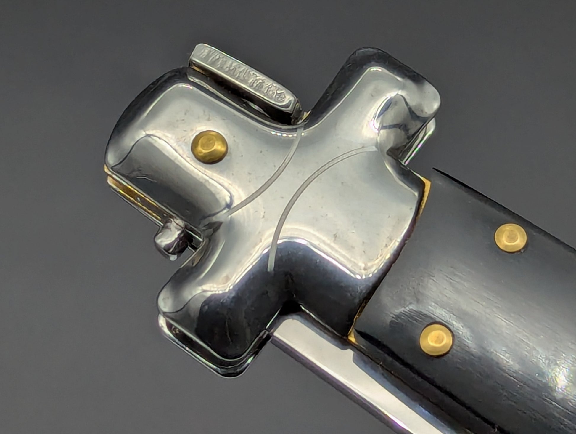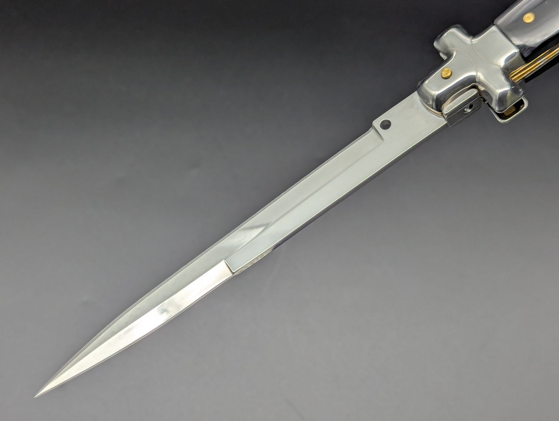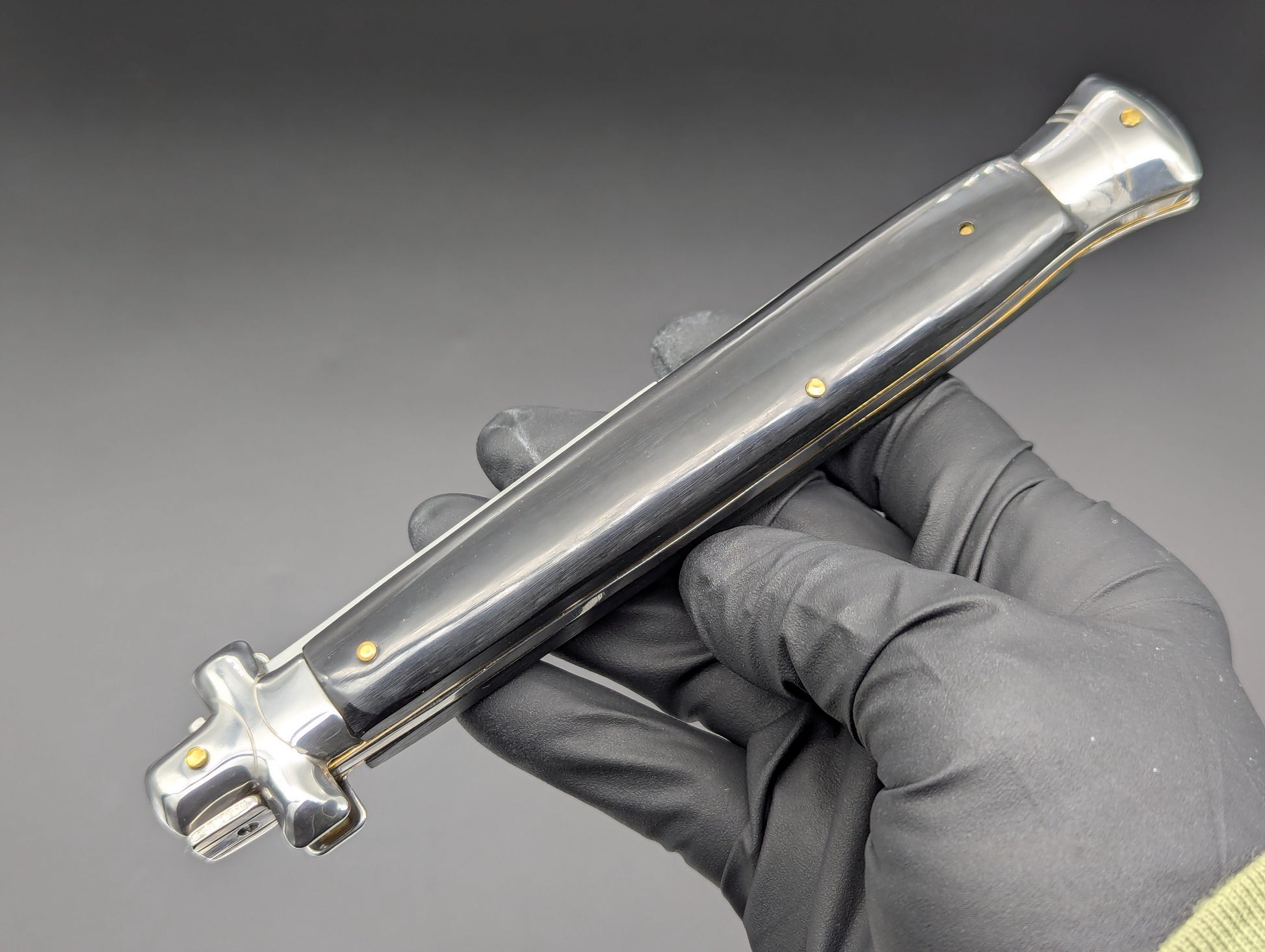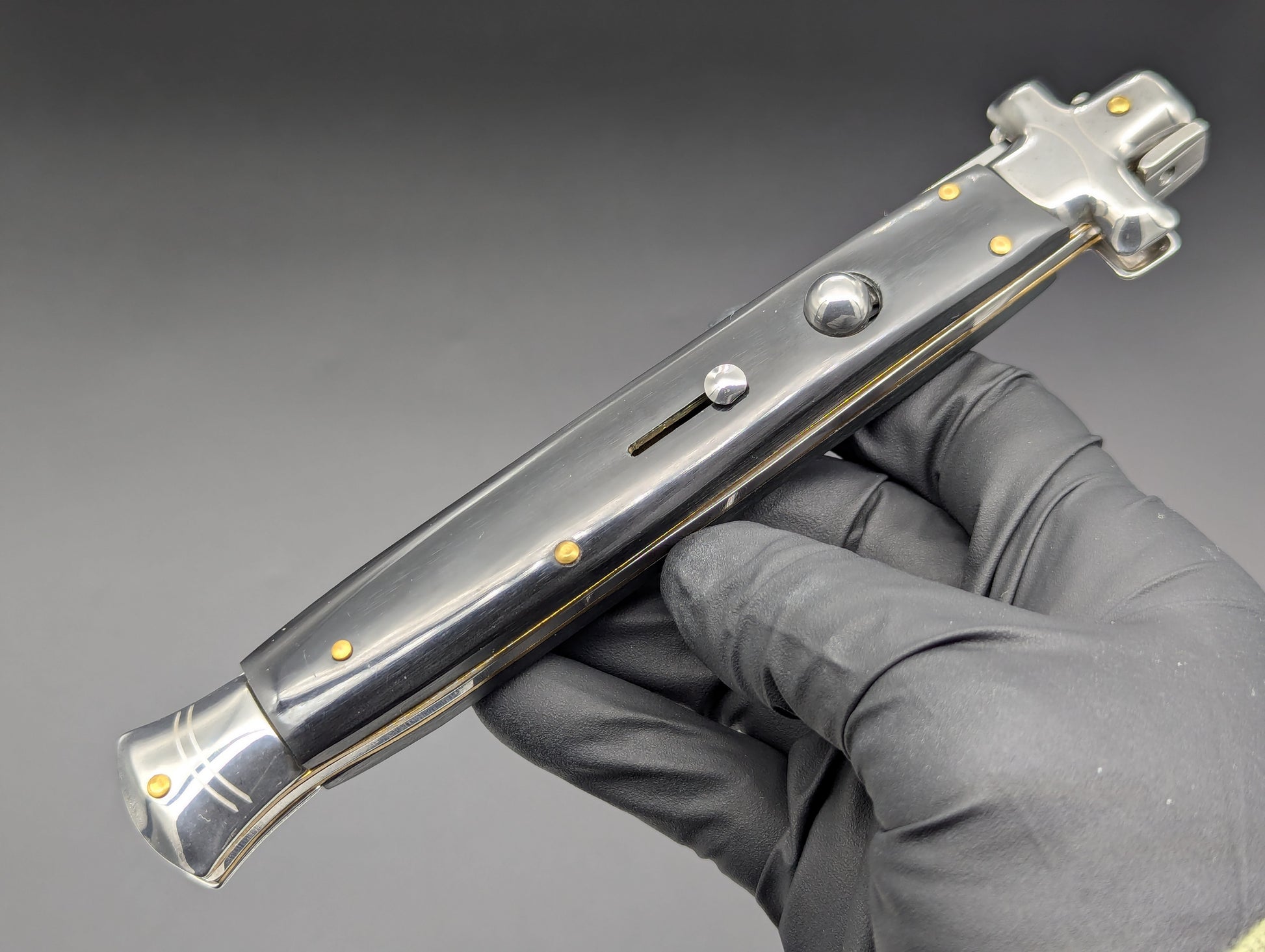 13" OVERALL OPEN LENGTH ITALIAN STYLE STILETTOS. BEAUTIFUL SOLID BLACK COMPOSITE SCALES. GIANT STAINLESS BAYONET GRIND BLADE. POWERFUL LEAF SPRING OPENING WITH SOLID LOCKUP EVERYTIME. SLIDING SAFETY LOCK MECHANISM! THESE ARE ABSOLUTELY AMAZING QUALITY! 6" BLADE LENGTH