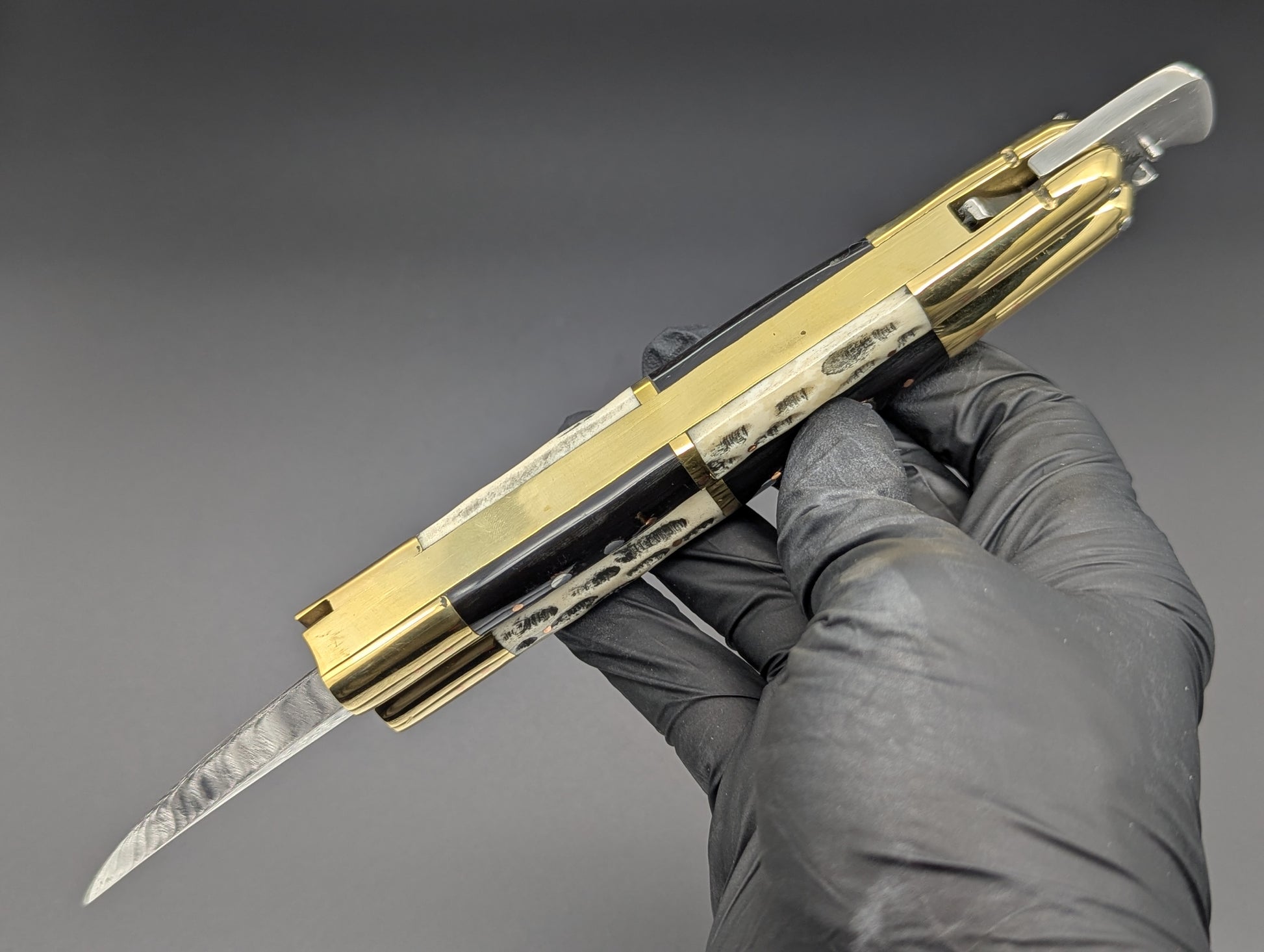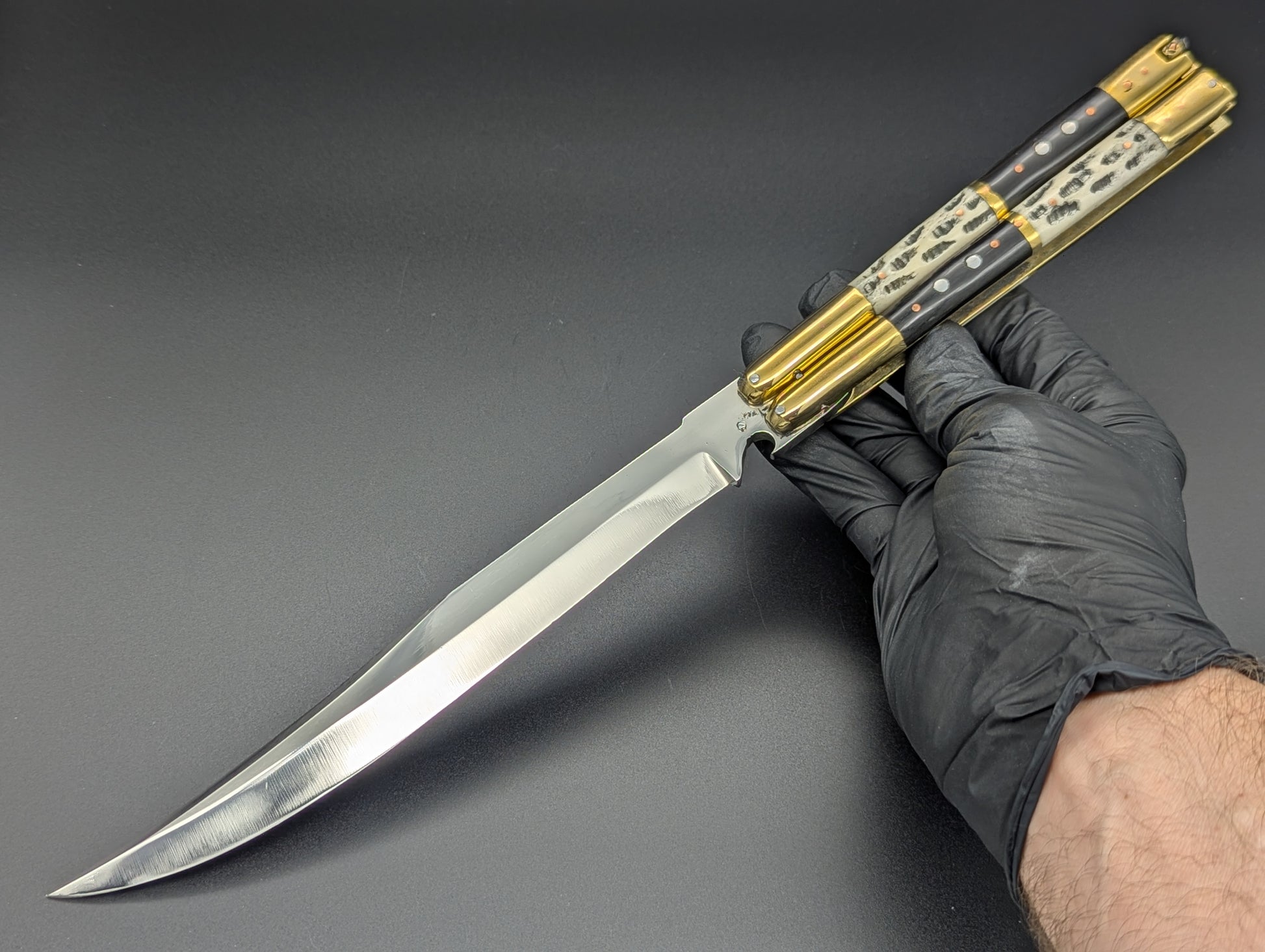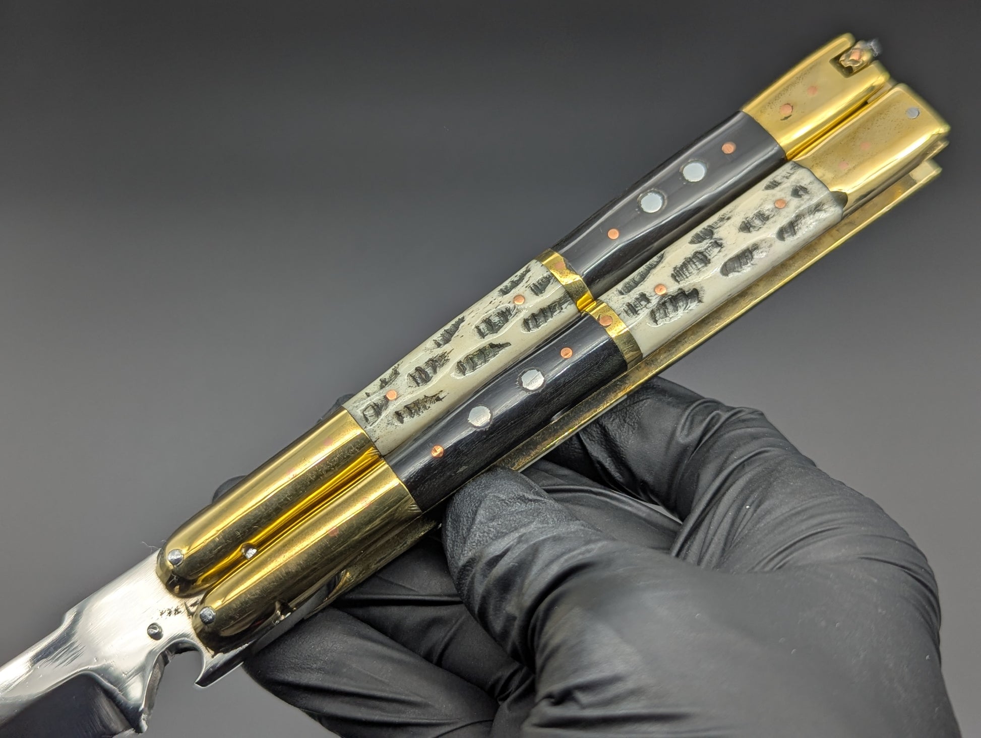 BUSESE STYLE PHILIPPINES HANDMADE BALISONG. EXTRA LONG BLADE. SOLID BRASS HANDLE CONSTRUCTION WITH ALTERNATING SCALE SEGMENTS OF JIGGED BONE AND BUFFALO HORN. SOME STEEL PINS IN THE BLACK HORN GIVE THIS A VINTAGE LOOK. THE MASSIVE SWEEPING CLIP POINT BLADE. THERE'S ALSO TWO BOTTLE OPENER CUTOUTS IN THE BLADE TANG THAT ARE EXPOSED WHETHER OPENED OR CLOSED. THE LATCH TO LOCK THE HANDLE IS VERY DIFFERENT ON THIS MODEL. BUT FASCINATING! DON'T MISS THESE FOLKS! THEY'RE ABSOLUTELY GORGEOUS. 328 GRAMS.