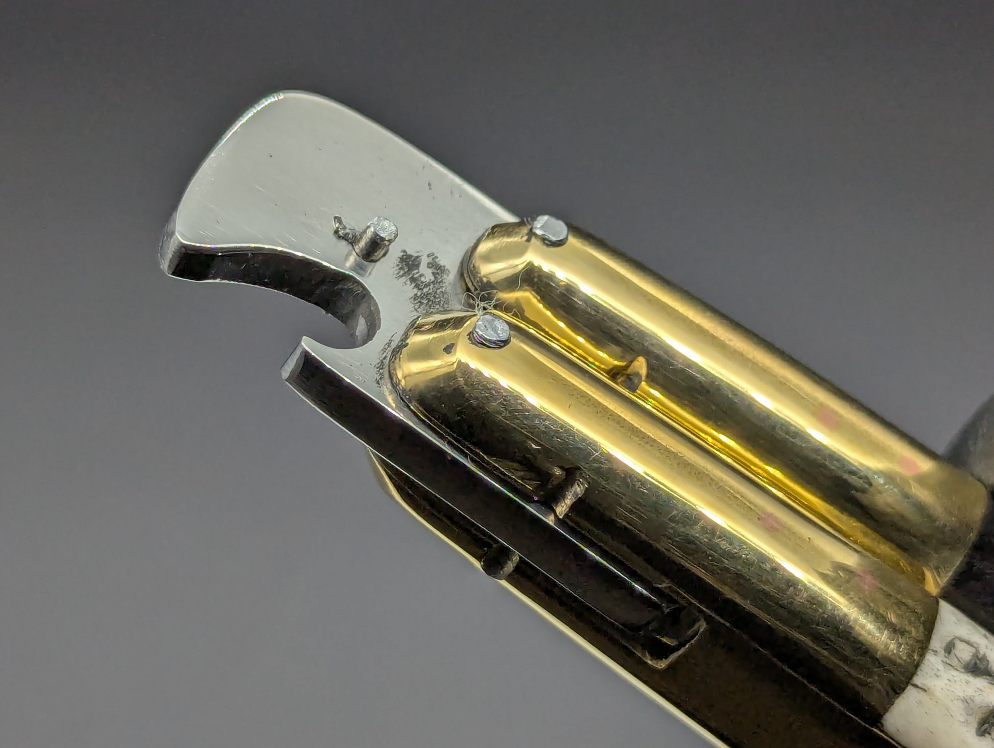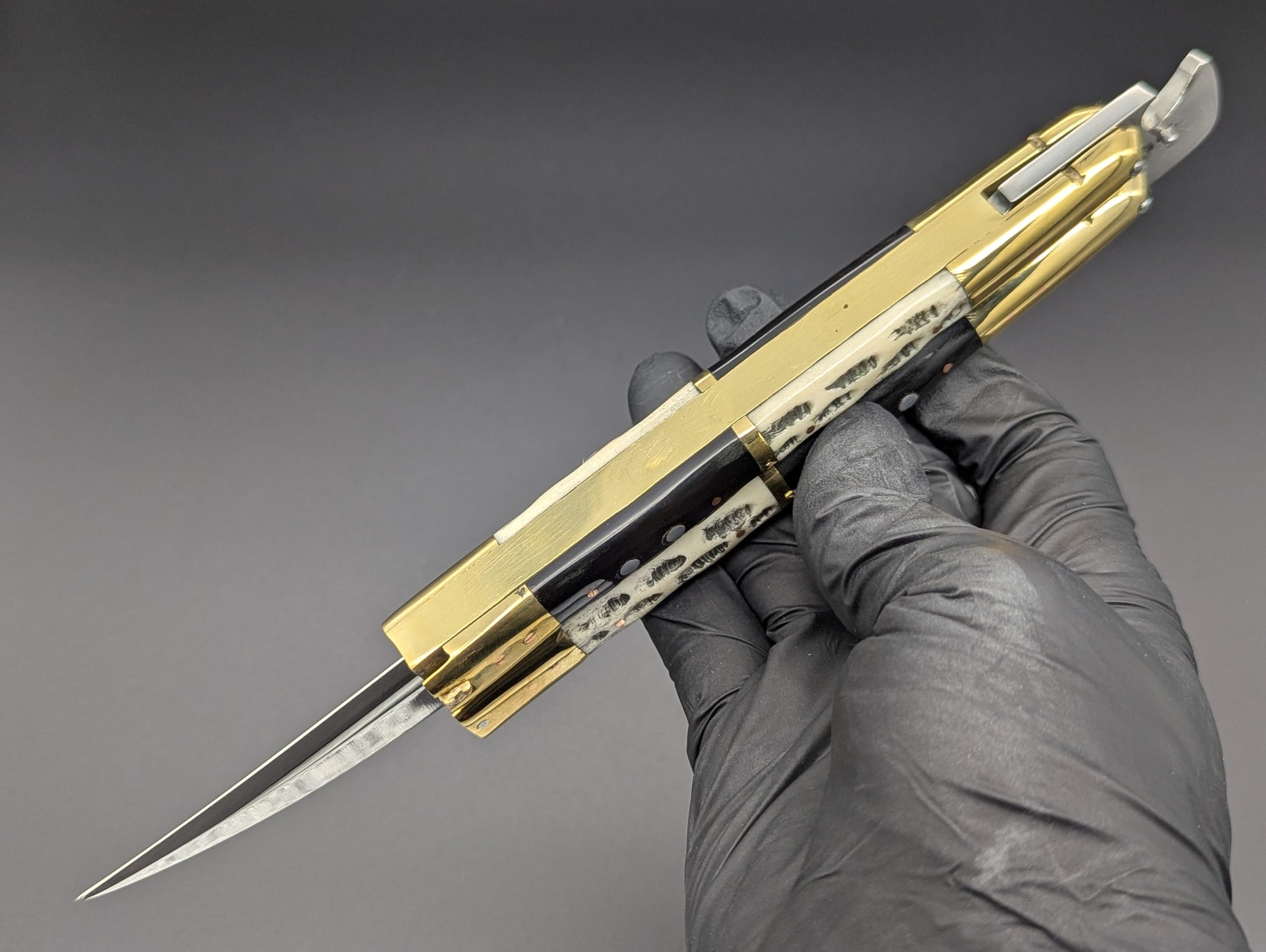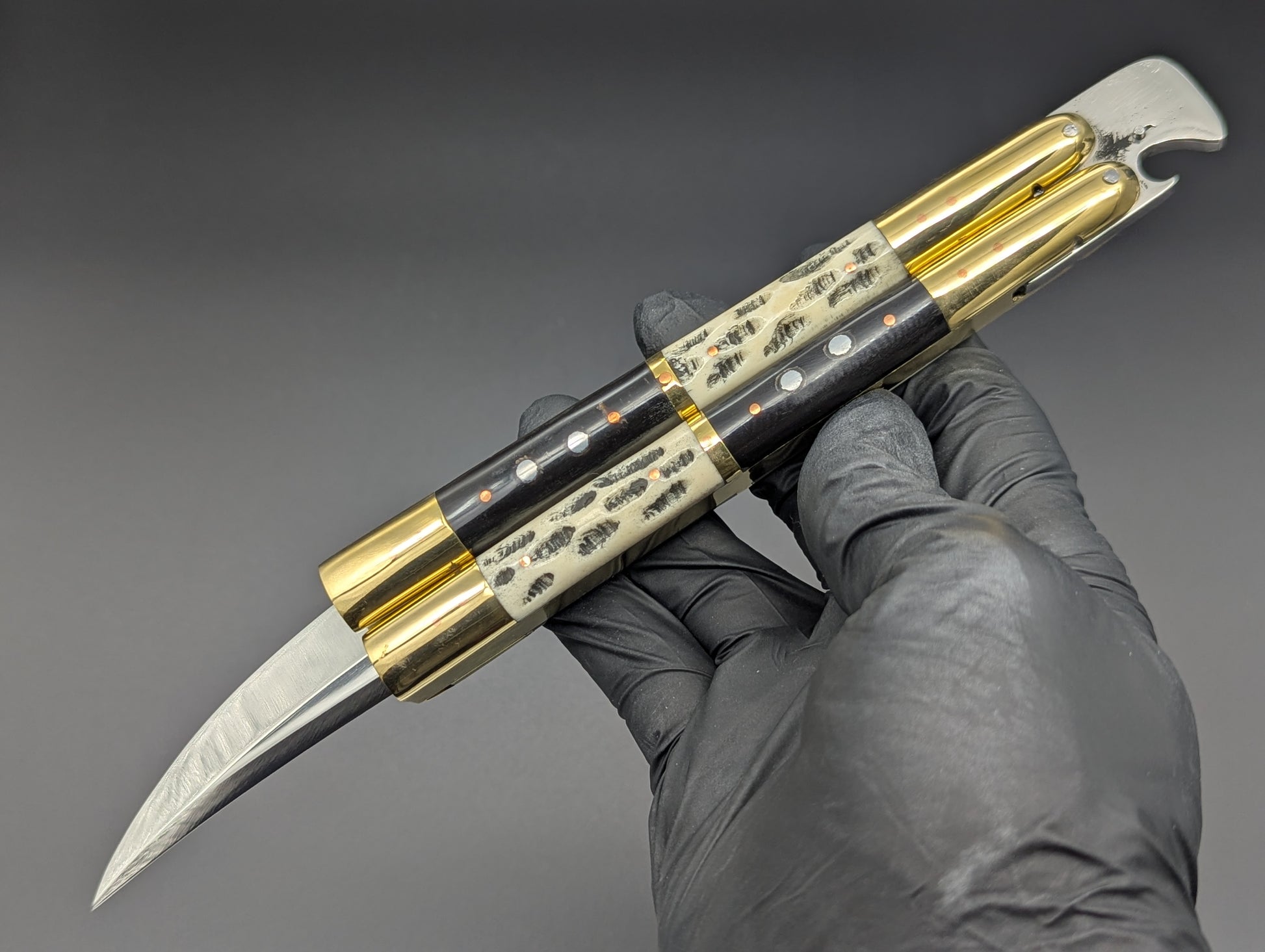BUSESE STYLE PHILIPPINES HANDMADE BALISONG. EXTRA LONG BLADE. SOLID BRASS HANDLE CONSTRUCTION WITH ALTERNATING SCALE SEGMENTS OF JIGGED BONE AND BUFFALO HORN. SOME STEEL PINS IN THE BLACK HORN GIVE THIS A VINTAGE LOOK. THE MASSIVE SWEEPING CLIP POINT BLADE. THERE'S ALSO TWO BOTTLE OPENER CUTOUTS IN THE BLADE TANG THAT ARE EXPOSED WHETHER OPENED OR CLOSED. THE LATCH TO LOCK THE HANDLE IS VERY DIFFERENT ON THIS MODEL. BUT FASCINATING! DON'T MISS THESE FOLKS! THEY'RE ABSOLUTELY GORGEOUS. 328 GRAMS.
