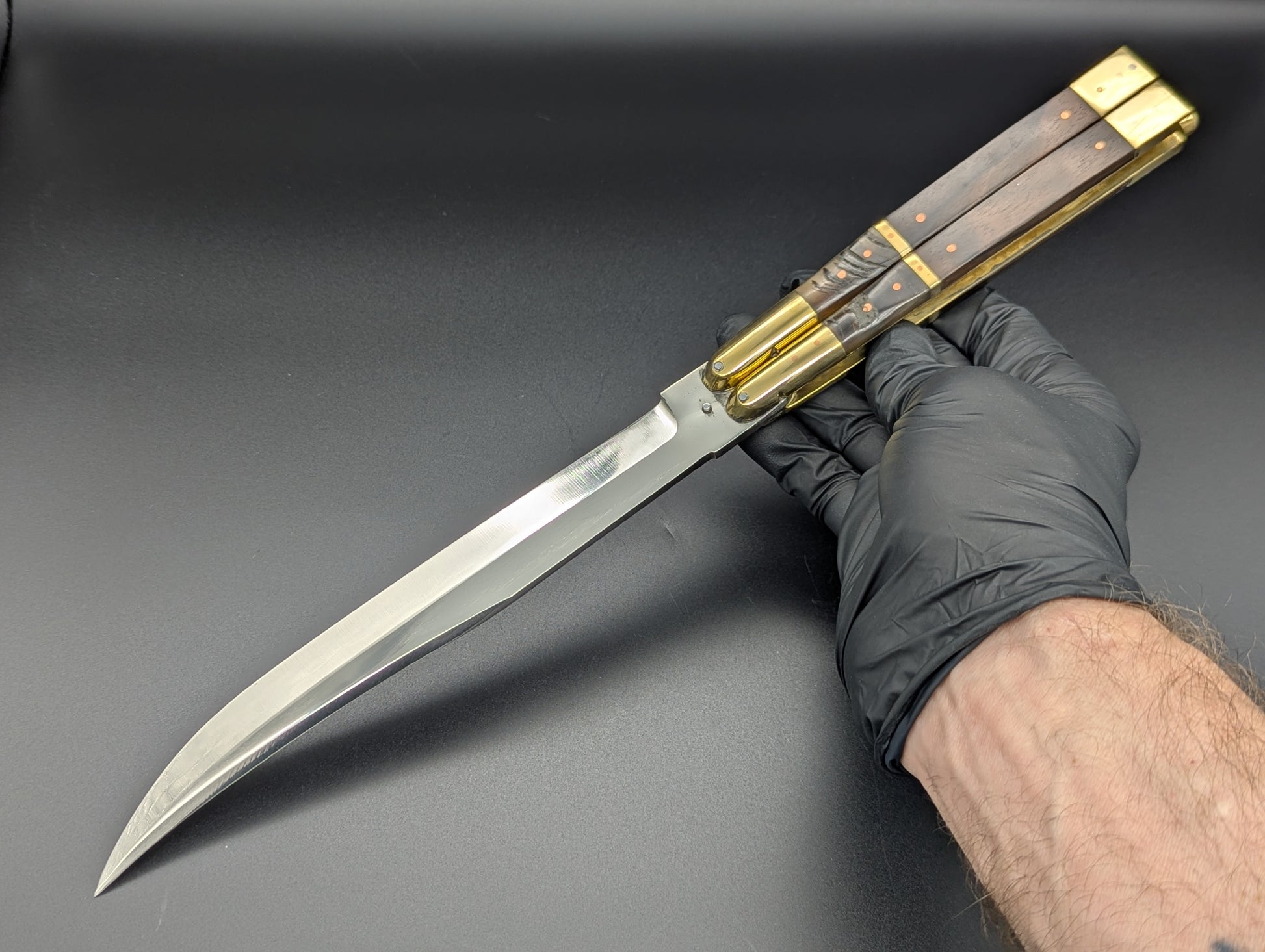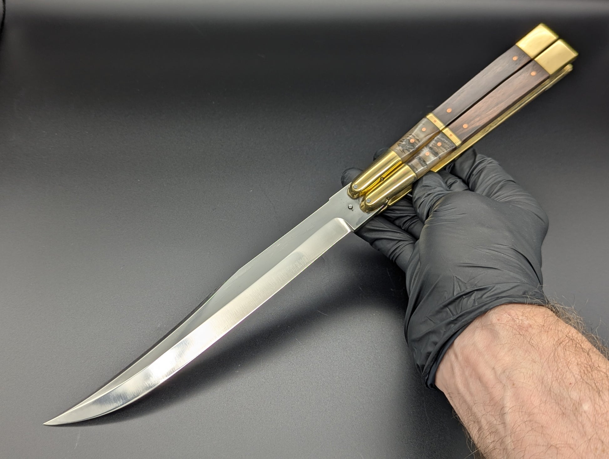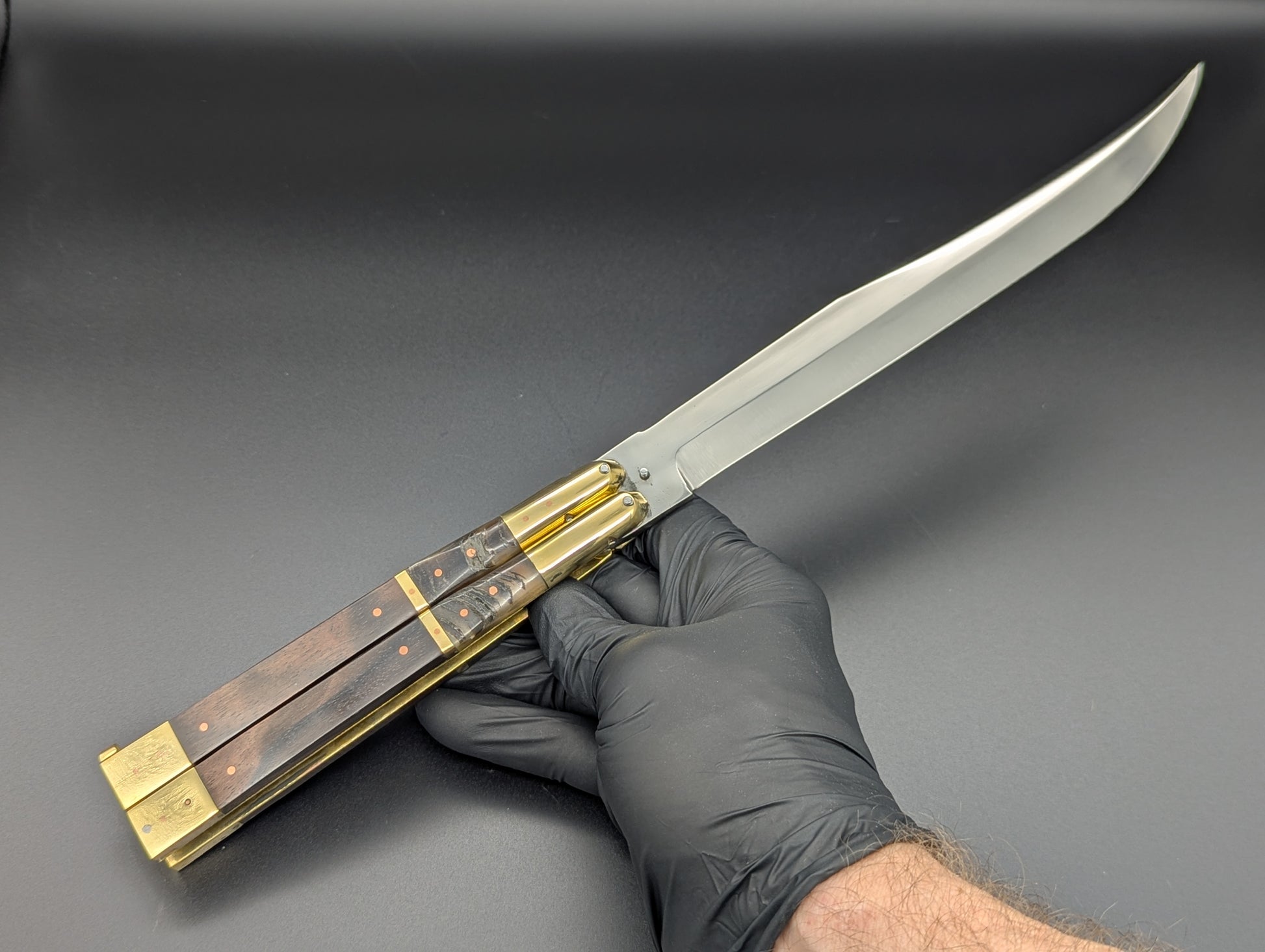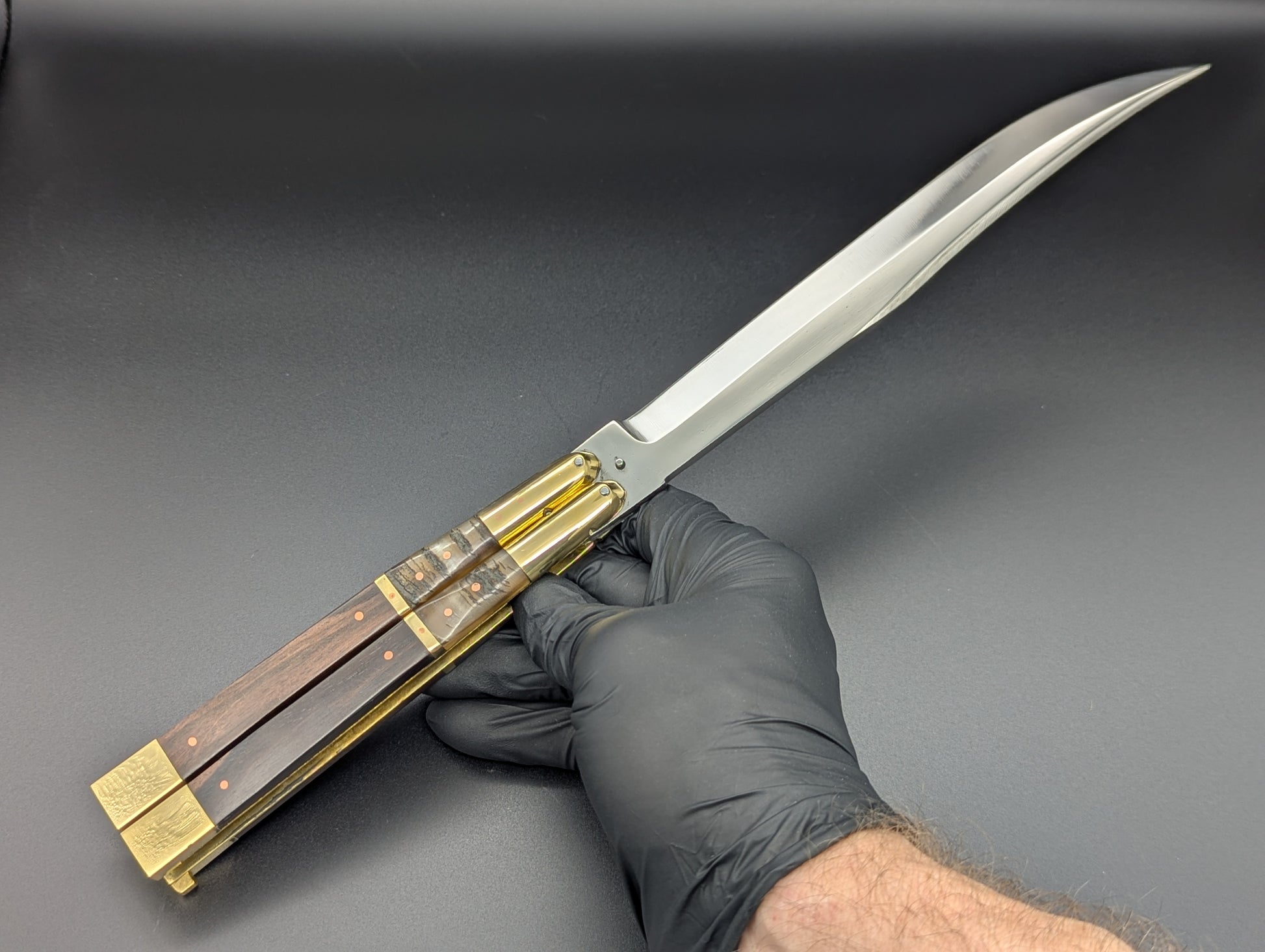 BUSISI STYLE PHILIPPINES HANDMADE BALISONG. EXTRA LONG BLADE. SOLID BRASS HANDLE CONSTRUCTION WITH SCALE SEGMENTS OF ROUGH CUT LIGHT HORN w/ SOLID NARRAWOOD. THE MASSIVE SWEEPING BLADE PLAIN CLIP POINT "RAMBO" MILLED STYLE BLADE. THE LATCH TO LOCK THE HANDLE IS VERY DIFFERENT ON THIS MODEL. BUT FASCINATING! DON'T MISS THESE FOLKS! THEY'RE ABSOLUTELY GORGEOUS. 316 GRAMS.