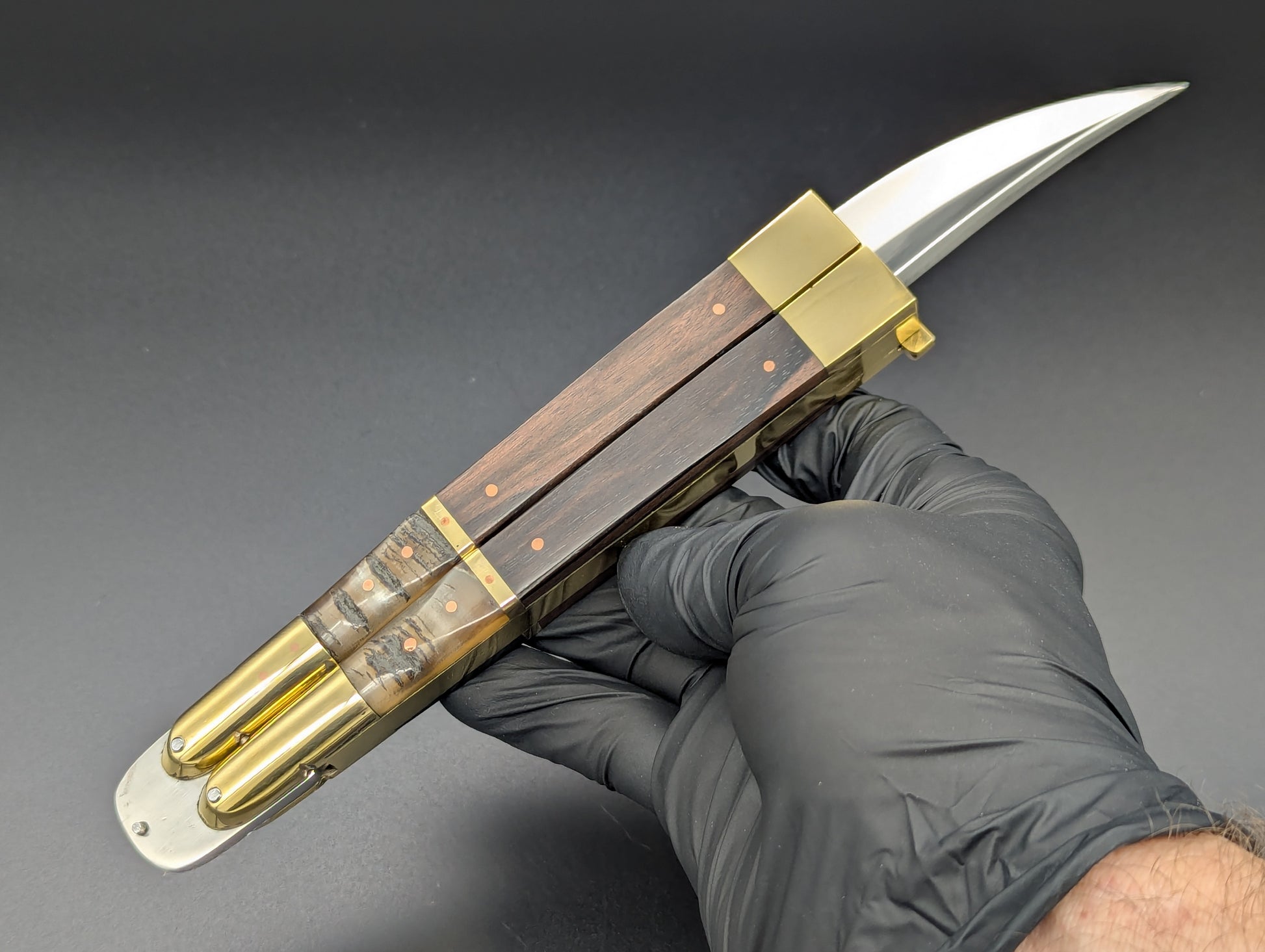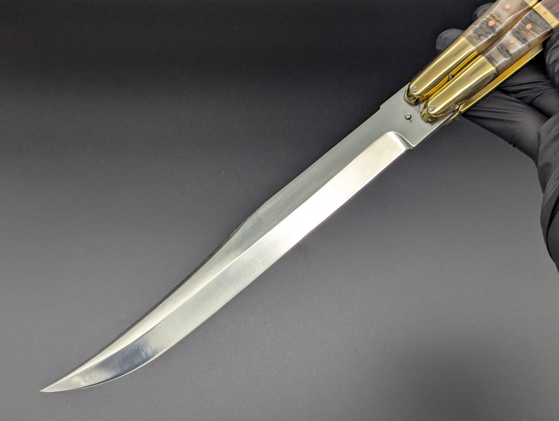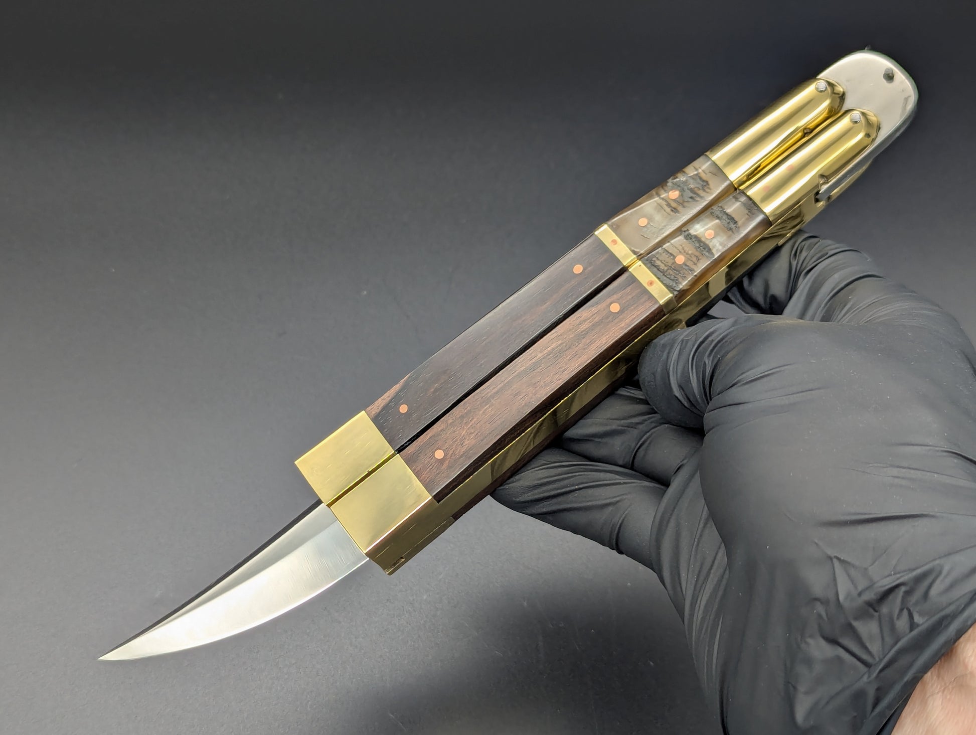 BUSISI STYLE PHILIPPINES HANDMADE BALISONG. EXTRA LONG BLADE. SOLID BRASS HANDLE CONSTRUCTION WITH SCALE SEGMENTS OF ROUGH CUT LIGHT HORN w/ SOLID NARRAWOOD. THE MASSIVE SWEEPING BLADE PLAIN CLIP POINT "RAMBO" MILLED STYLE BLADE. THE LATCH TO LOCK THE HANDLE IS VERY DIFFERENT ON THIS MODEL. BUT FASCINATING! DON'T MISS THESE FOLKS! THEY'RE ABSOLUTELY GORGEOUS. 316 GRAMS.