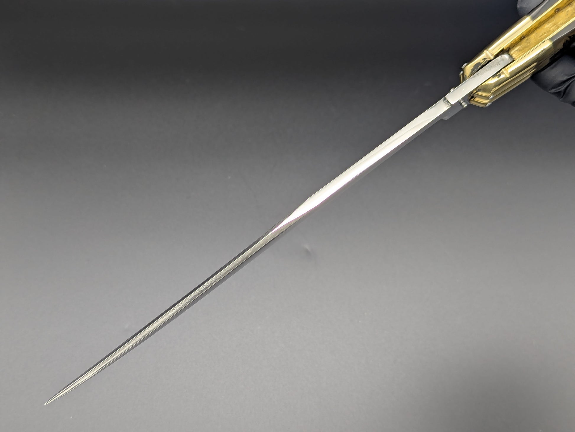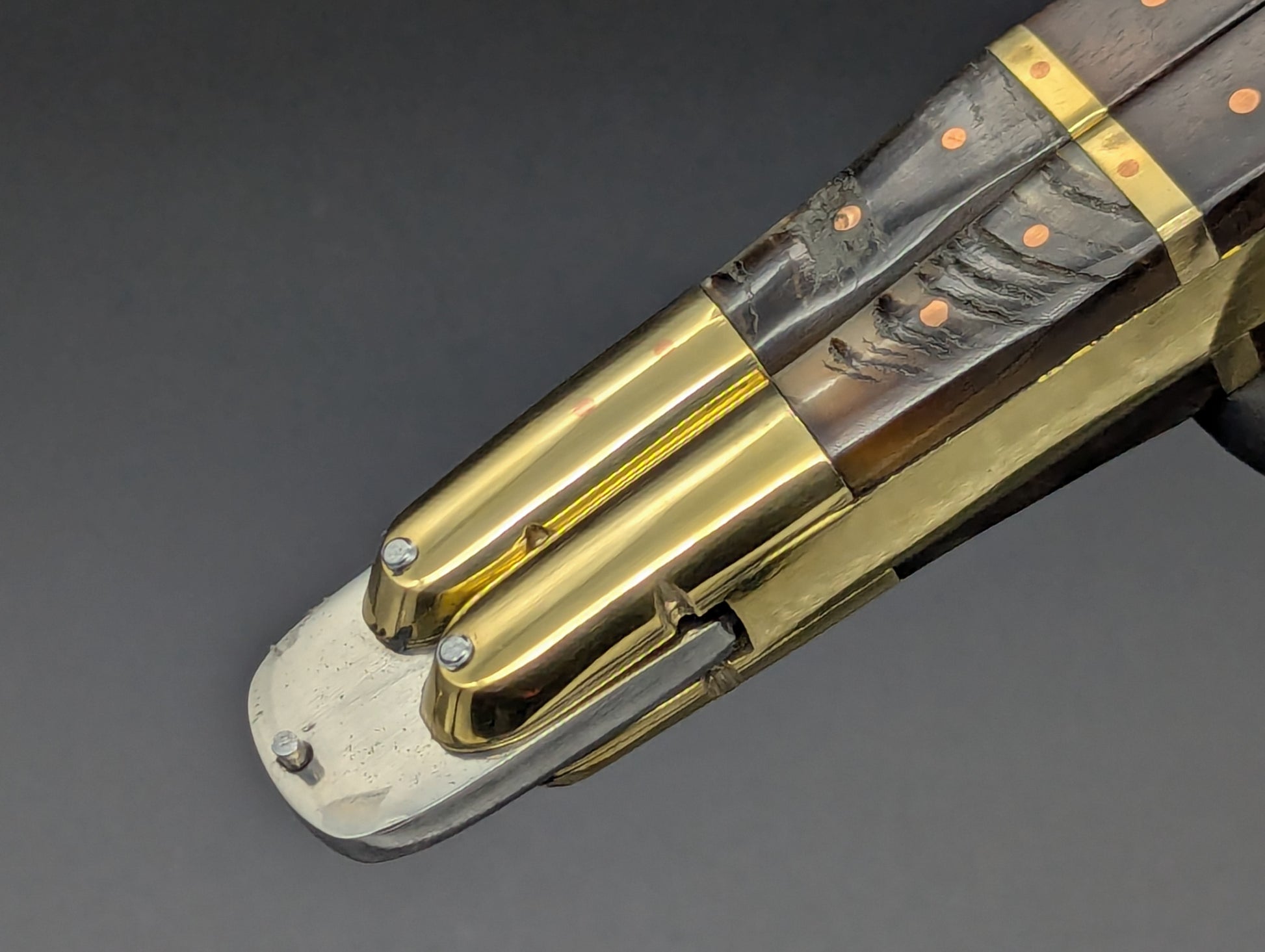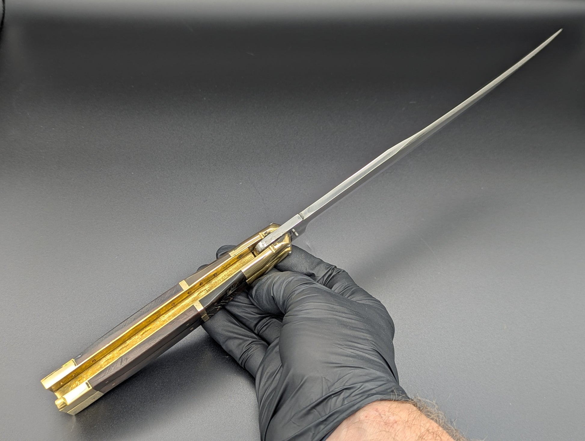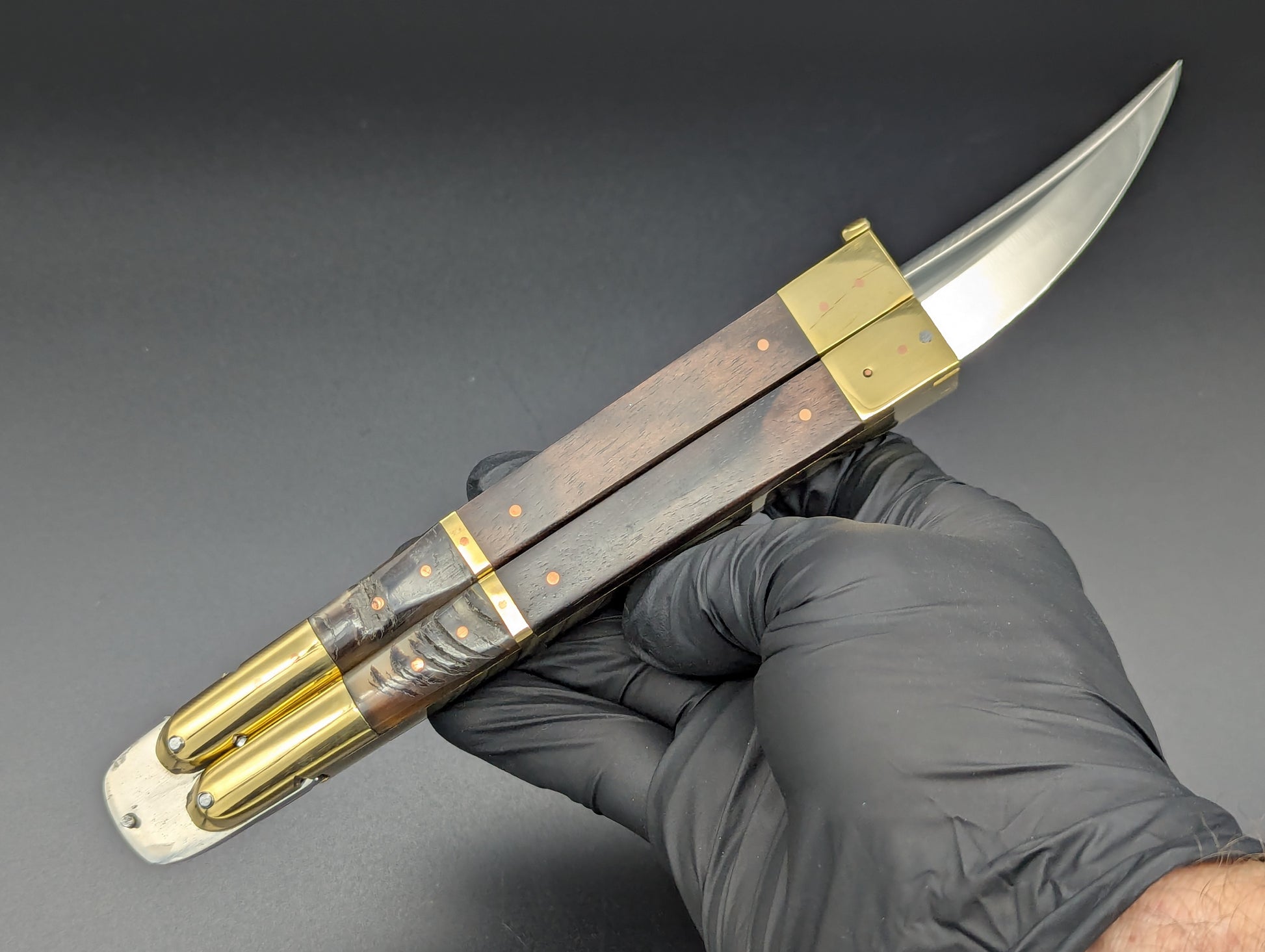 BUSISI STYLE PHILIPPINES HANDMADE BALISONG. EXTRA LONG BLADE. SOLID BRASS HANDLE CONSTRUCTION WITH SCALE SEGMENTS OF ROUGH CUT LIGHT HORN w/ SOLID NARRAWOOD. THE MASSIVE SWEEPING BLADE PLAIN CLIP POINT "RAMBO" MILLED STYLE BLADE. THE LATCH TO LOCK THE HANDLE IS VERY DIFFERENT ON THIS MODEL. BUT FASCINATING! DON'T MISS THESE FOLKS! THEY'RE ABSOLUTELY GORGEOUS. 316 GRAMS.