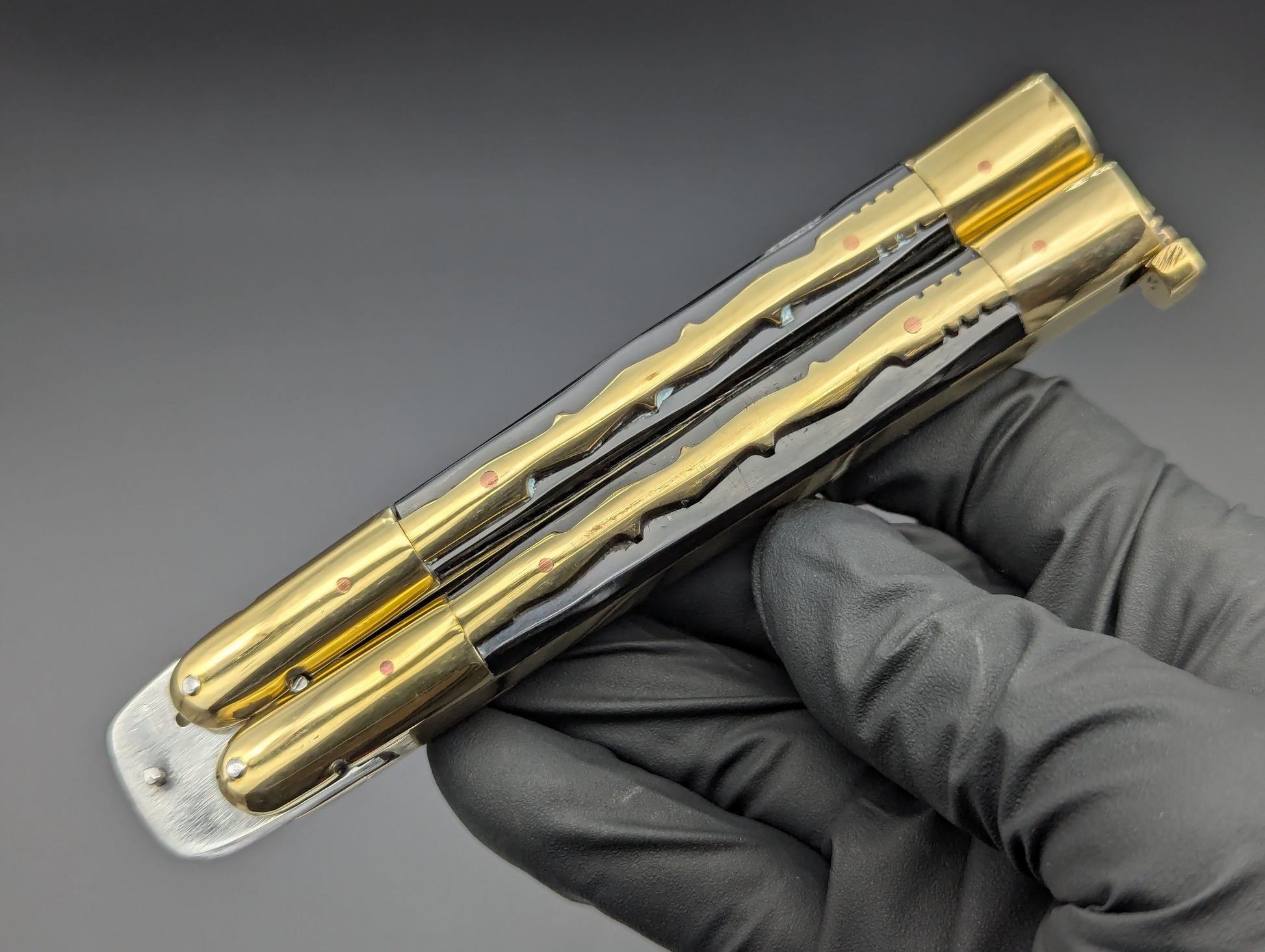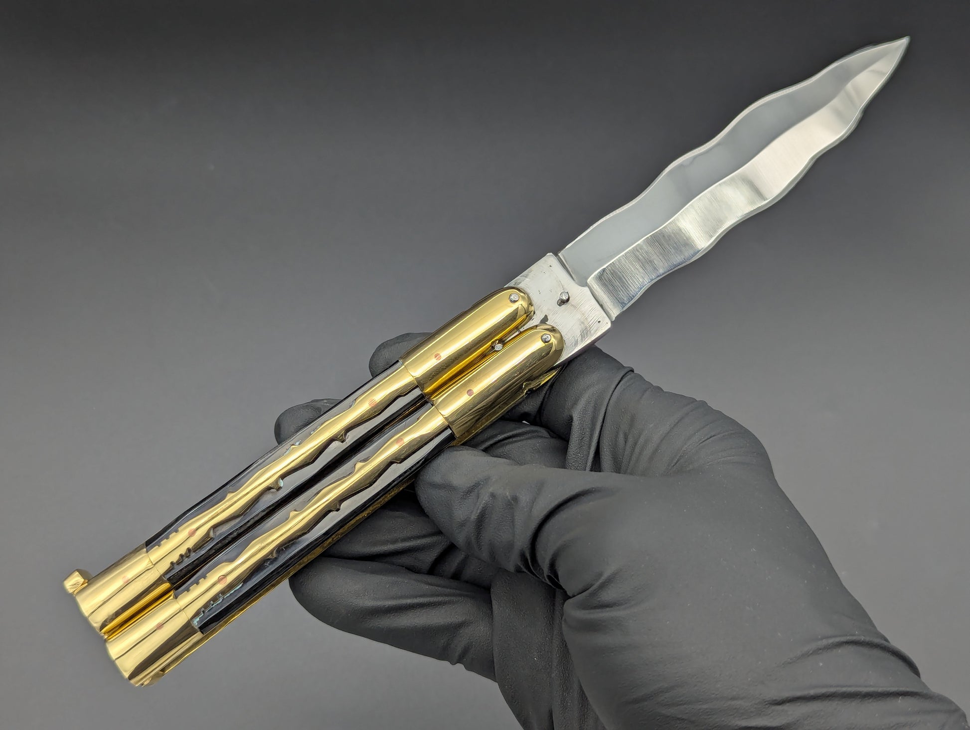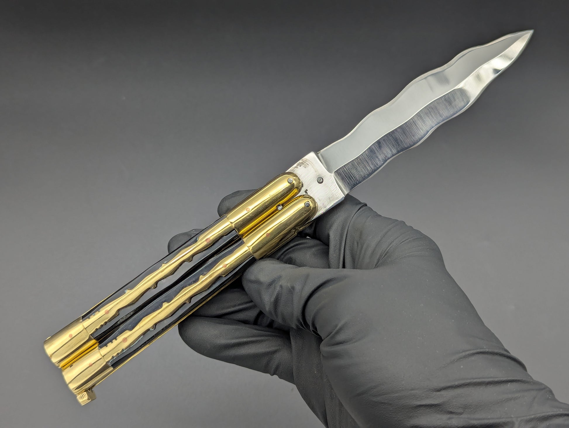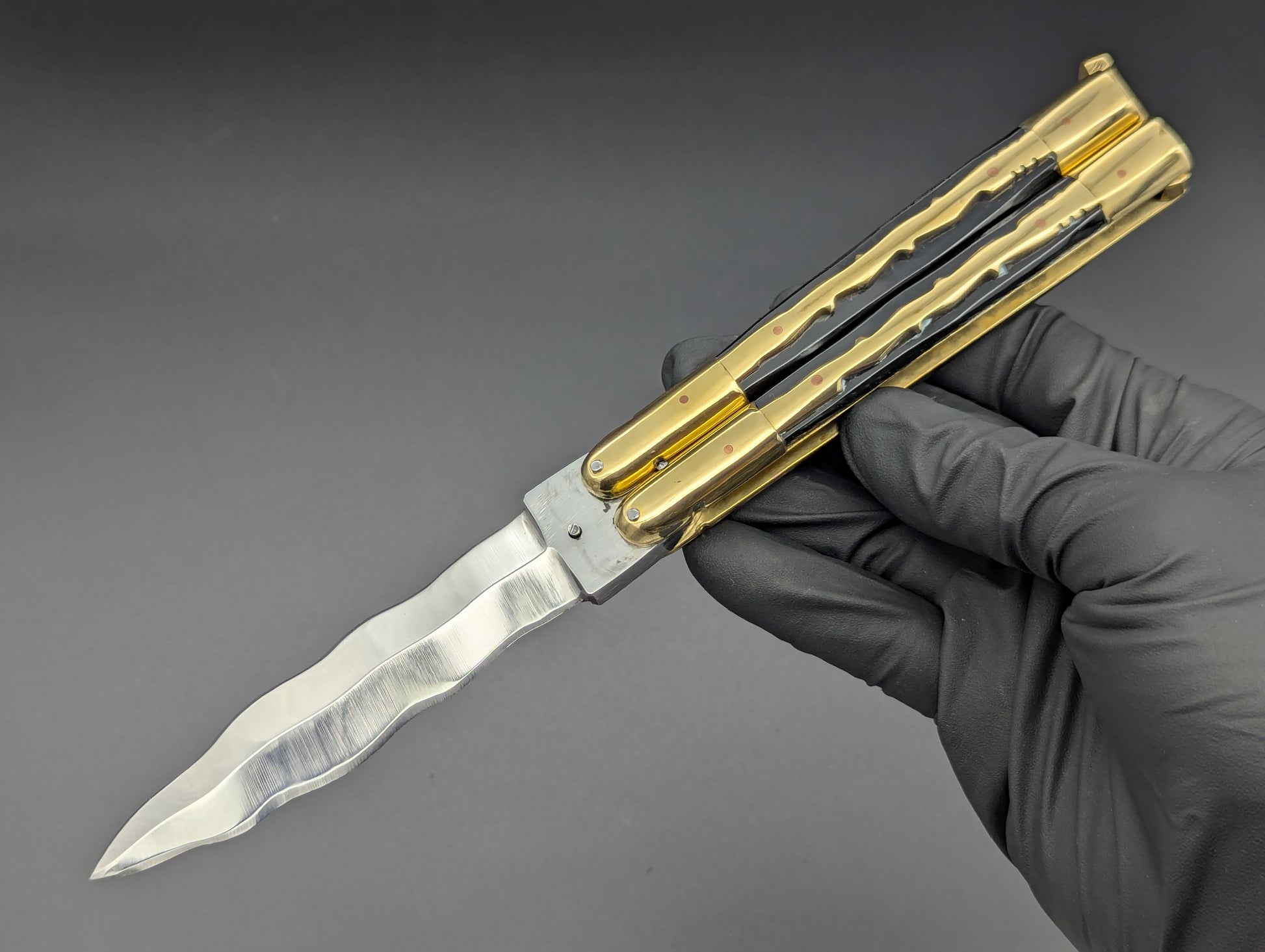 JUST IN! 9" OL PHILIPPINES HANDMADE BALISONG WITH DOUBLE EDGED KRIS BLADE. TRADITIONAL KALAPKUP HANDLE DESIGN WITH BRASS TRIBAL PATTERN OVERLAYING ONYX BLACK COMPOSITE SCALES WITH BRASS EVERYTHING! TOP SHELF "SPECIAL" FHM MODEL WEIGHING IN AT 228 GRAMS.