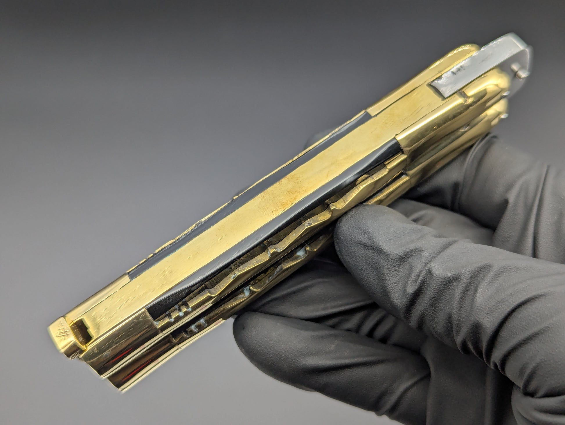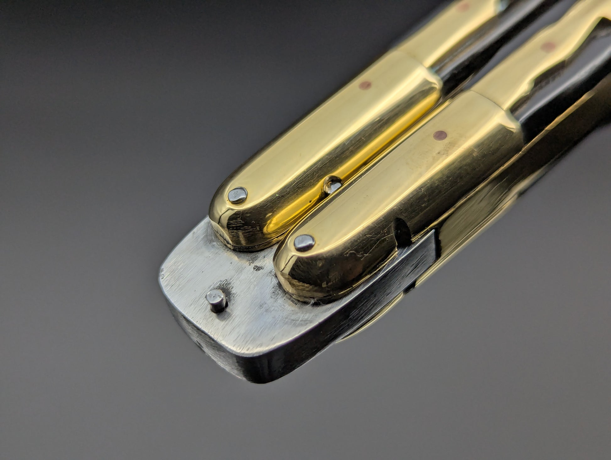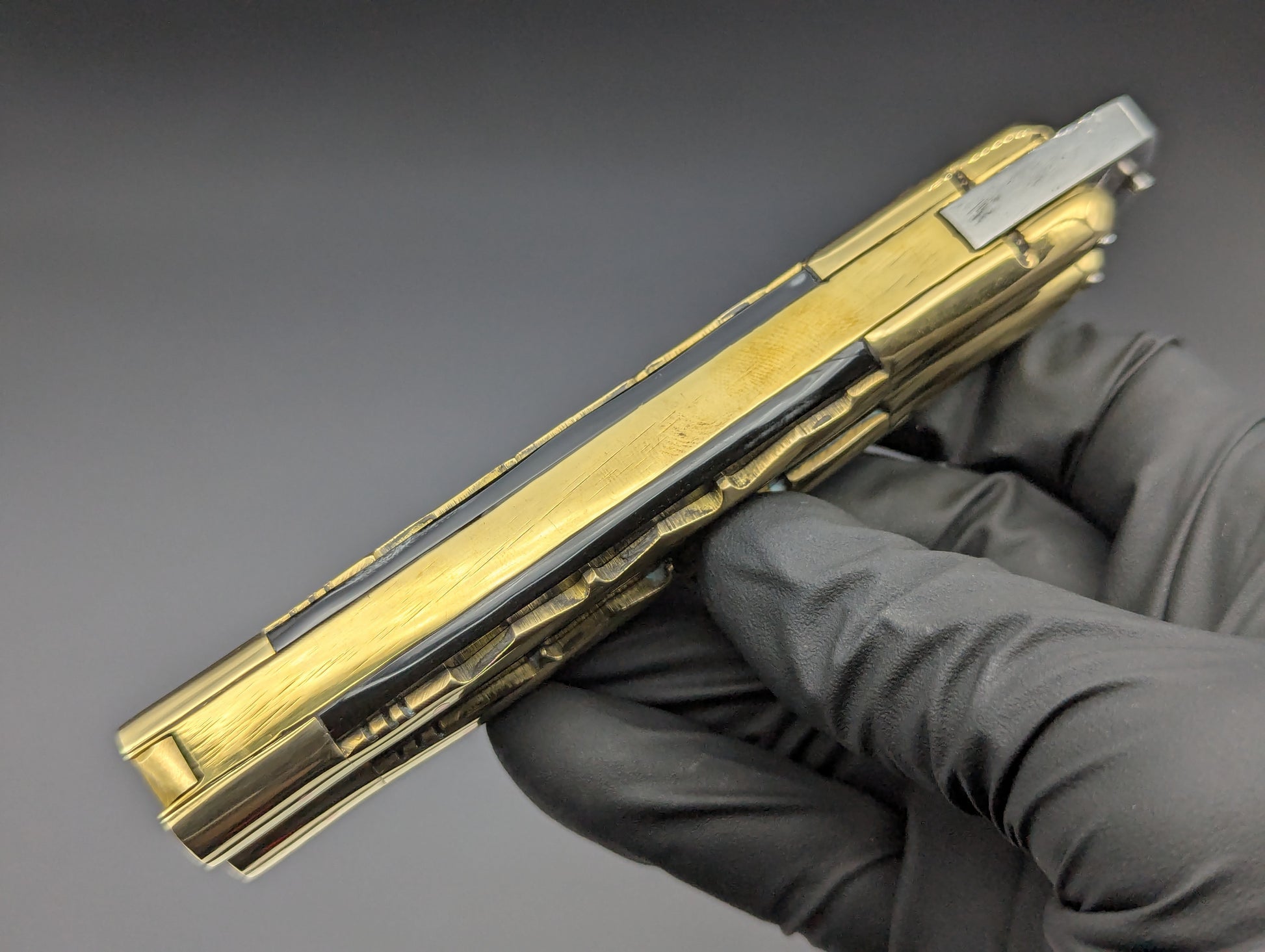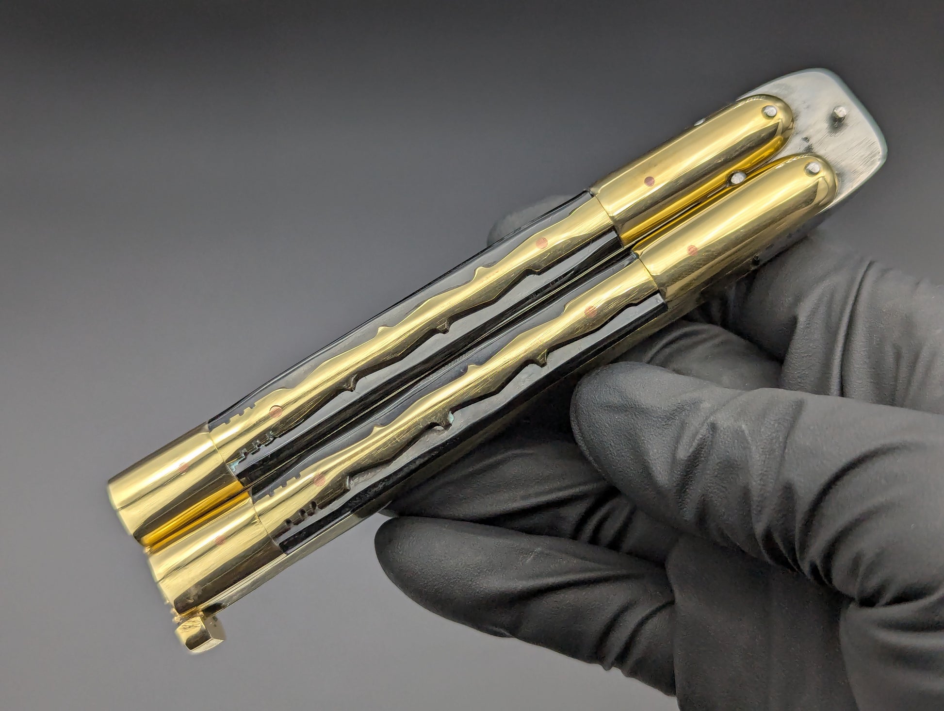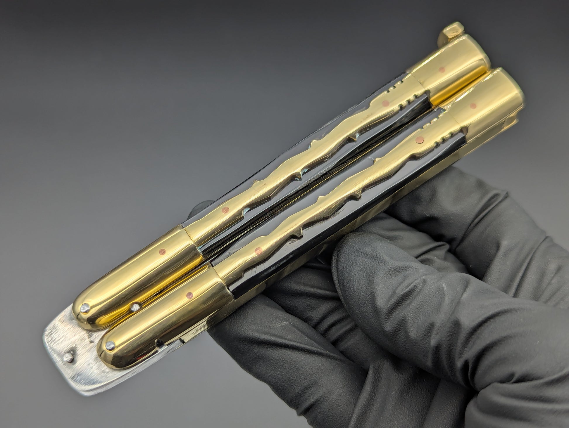 JUST IN! 9" OL PHILIPPINES HANDMADE BALISONG WITH DOUBLE EDGED KRIS BLADE. TRADITIONAL KALAPKUP HANDLE DESIGN WITH BRASS TRIBAL PATTERN OVERLAYING ONYX BLACK COMPOSITE SCALES WITH BRASS EVERYTHING! TOP SHELF "SPECIAL" FHM MODEL WEIGHING IN AT 228 GRAMS.
