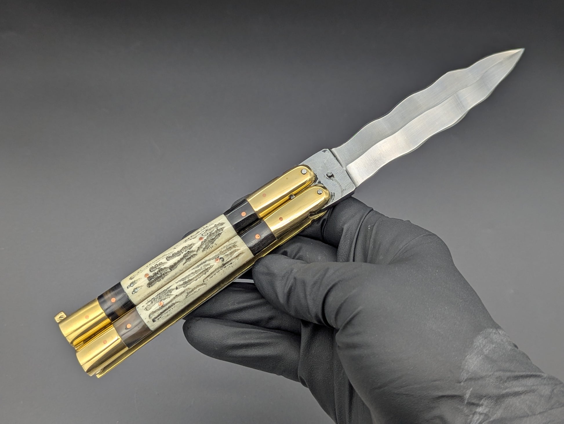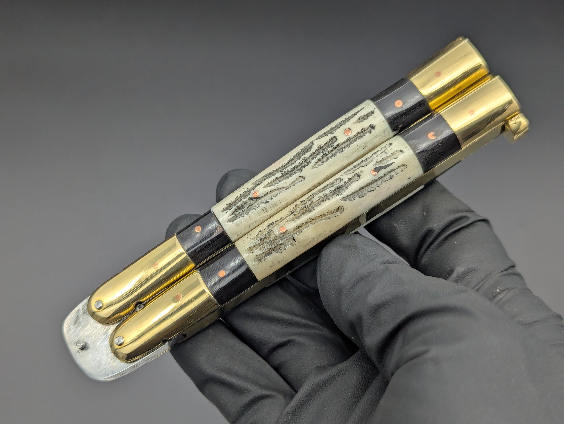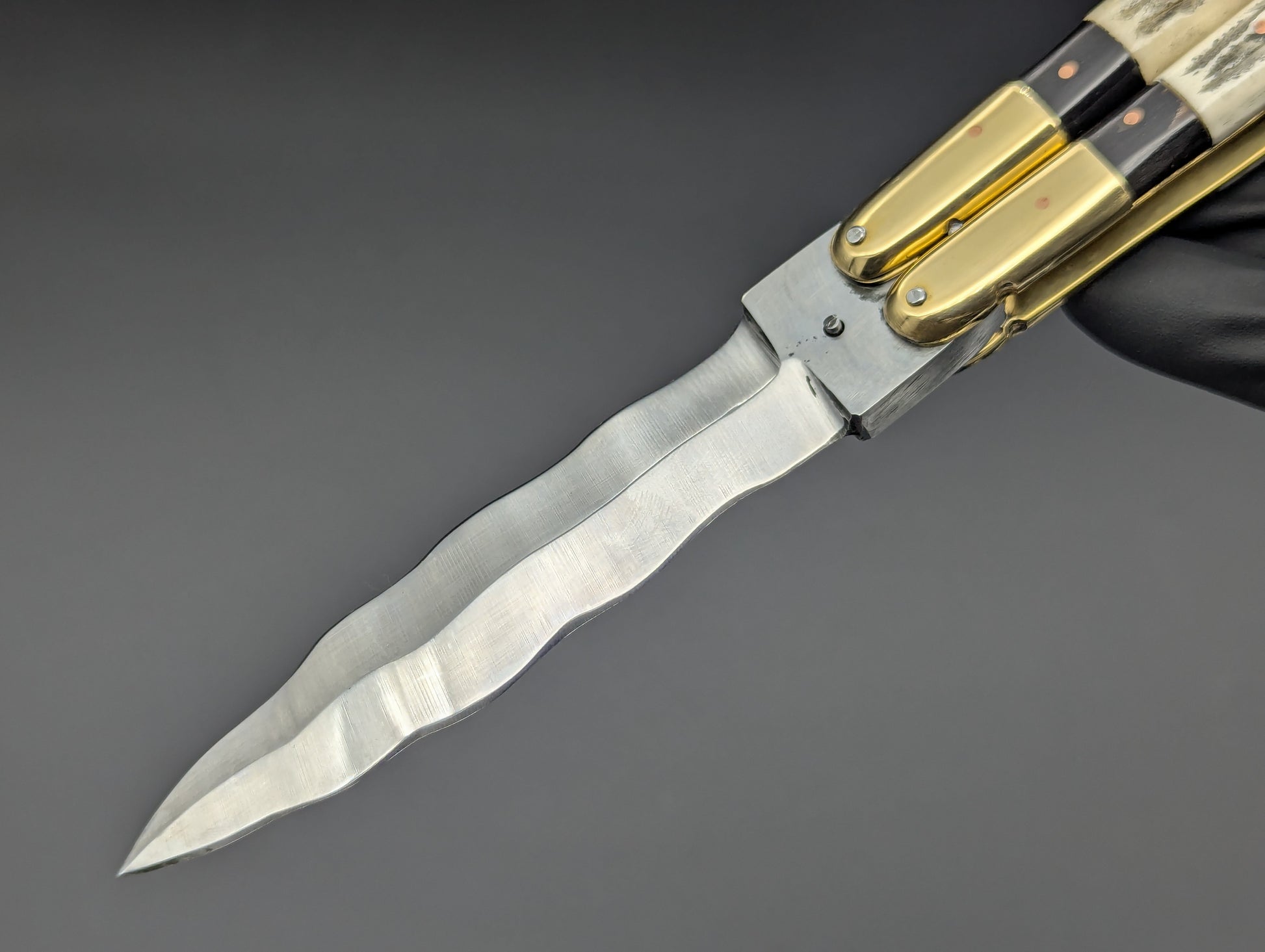 JUST IN! 9" OL PHILIPPINES HANDMADE BALISONG WITH DOUBLE EDGED KRIS BLADE. TRADITIONAL TRIPLE ATTACHED HORN DESIGN WITH CARABOA HORN END CAPS WITH A NICE CUT OF DEER HORN IN THE CENTER. HANDLE. CONSTRUCTION IS BRASS EVERYTHING! TOP SHELF "SPECIAL" FHM MODEL WEIGHING IN AT 198 GRAMS.