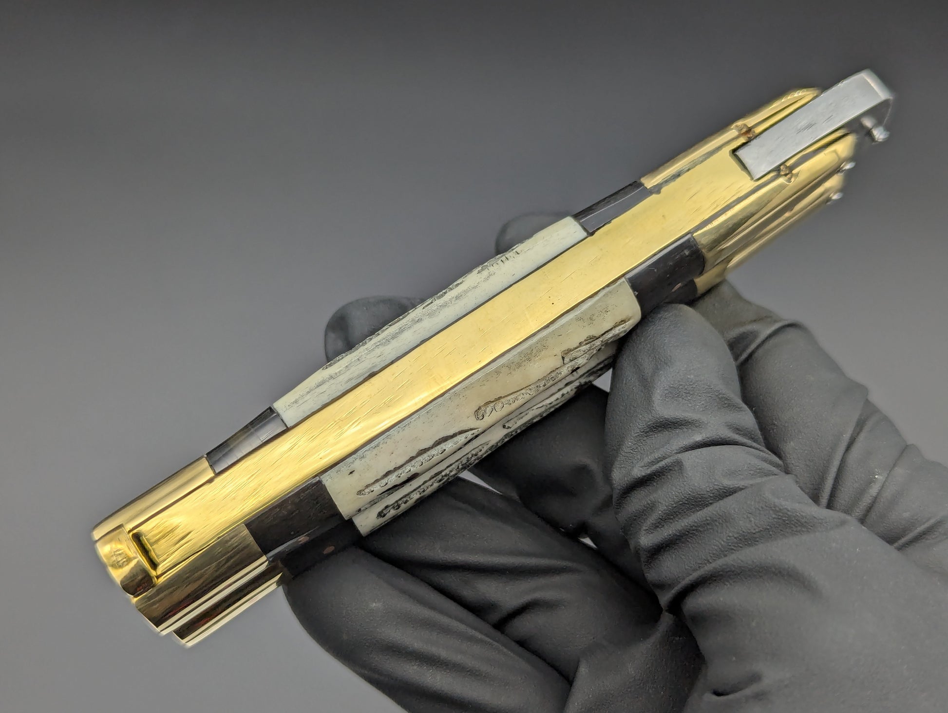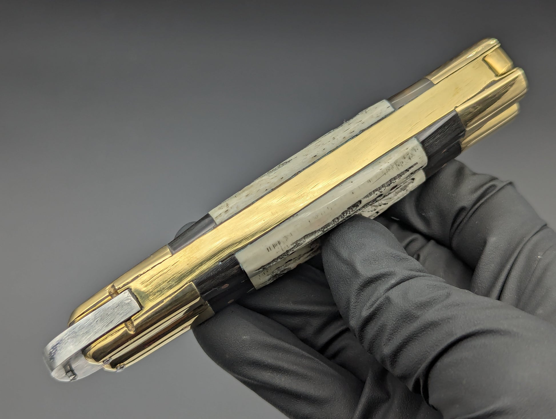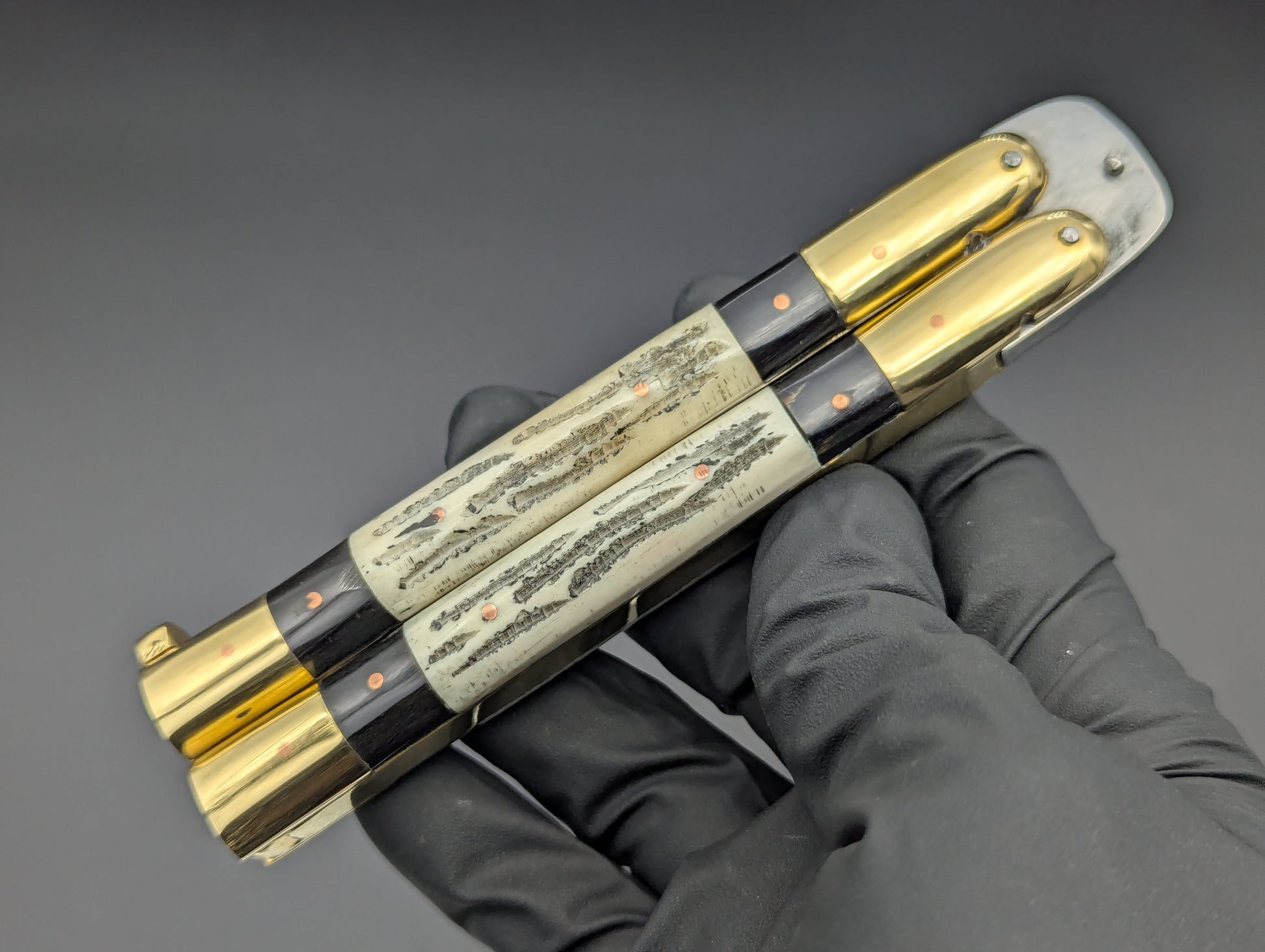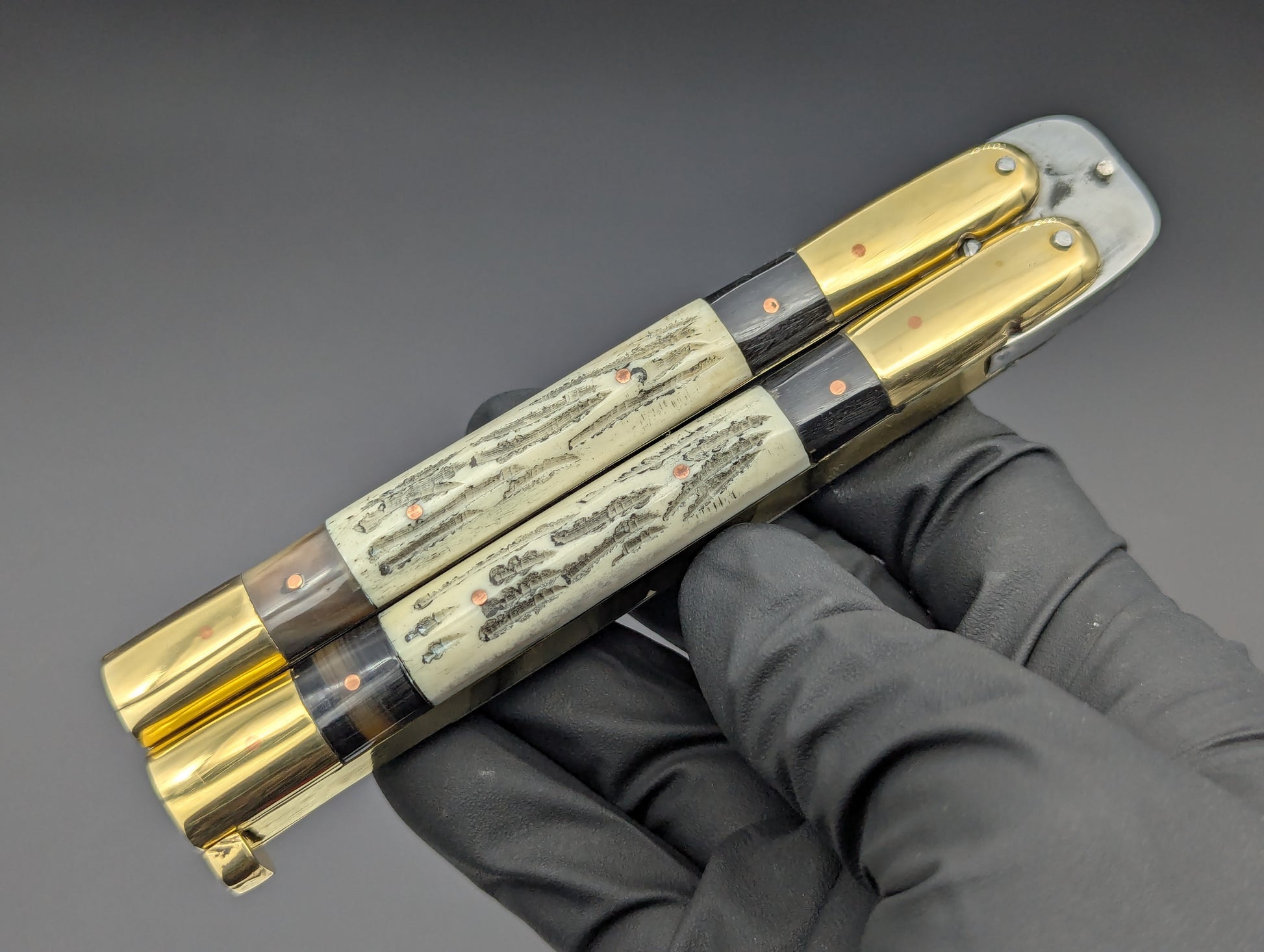 JUST IN! 9" OL PHILIPPINES HANDMADE BALISONG WITH DOUBLE EDGED KRIS BLADE. TRADITIONAL TRIPLE ATTACHED HORN DESIGN WITH CARABOA HORN END CAPS WITH A NICE CUT OF DEER HORN IN THE CENTER. HANDLE. CONSTRUCTION IS BRASS EVERYTHING! TOP SHELF "SPECIAL" FHM MODEL WEIGHING IN AT 198 GRAMS.