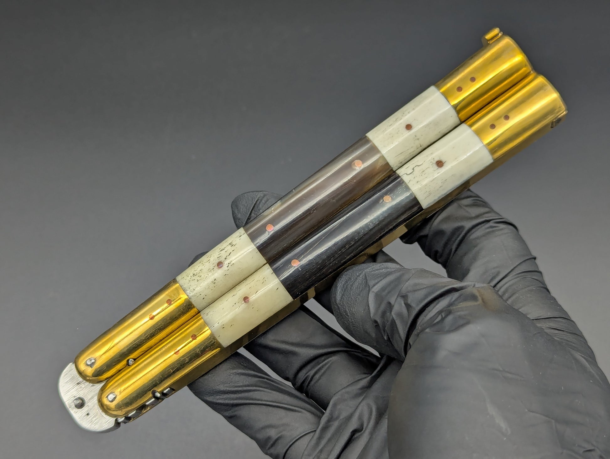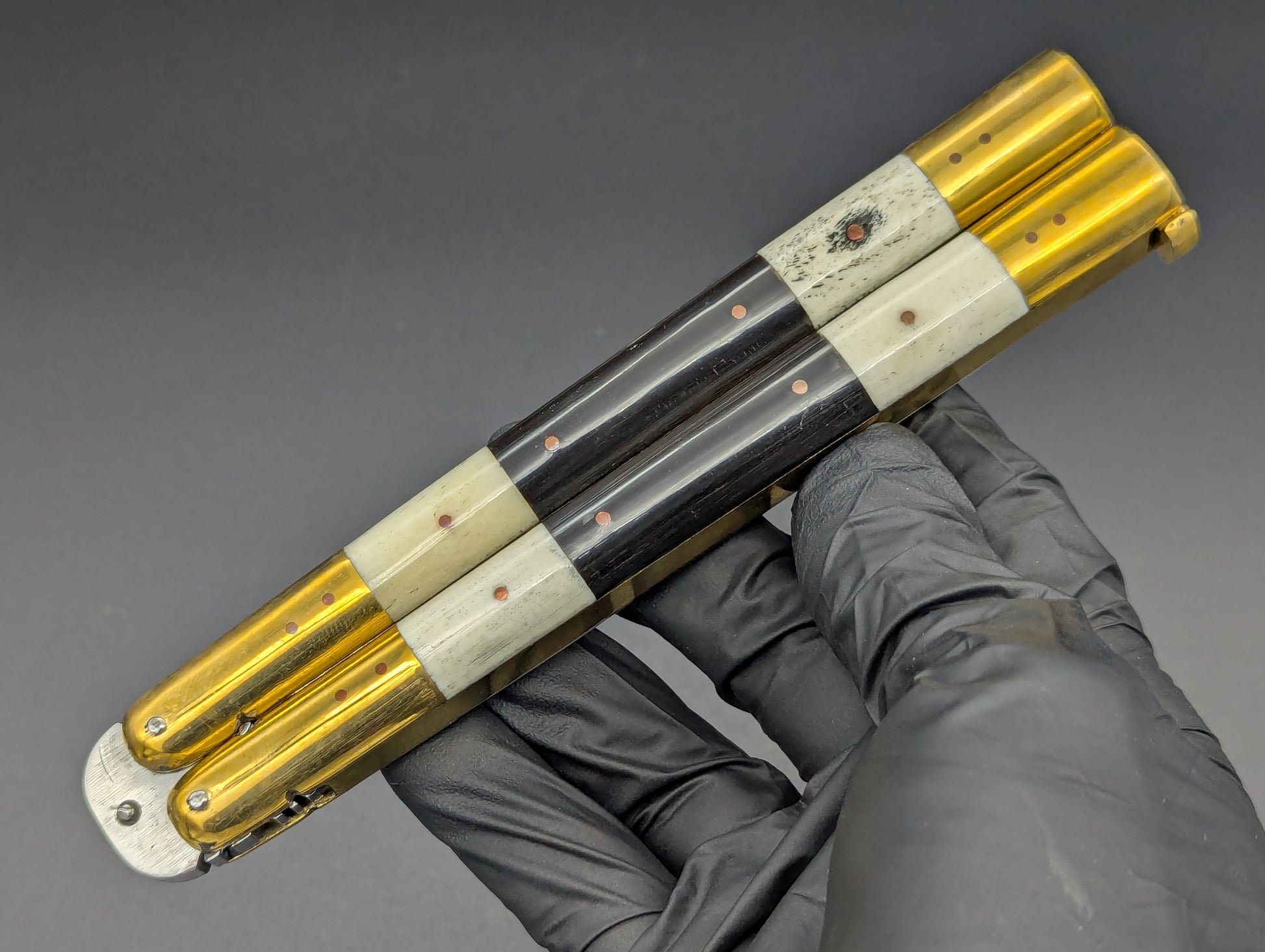 BEAUTIFUL HANDMADE PHILIPPINES BALISONG. INCREDIBLE BRASS WITH WHITE BONE AND BLACK HORN SCALES. INSANE FILEWORKED CLIP POINT BLADE GRIND! THESE ARE MADE AS FOLDING KNIVES. THE HANDLES FOLD OVER TO COVER THE BLADE INITIALLY. BUT THEY WILL LOOSEN IN TIME AND BE ABLE TO "FLIP" LIKE THE BUTTERFLY KNIVES WE HAVE COME TO KNOW