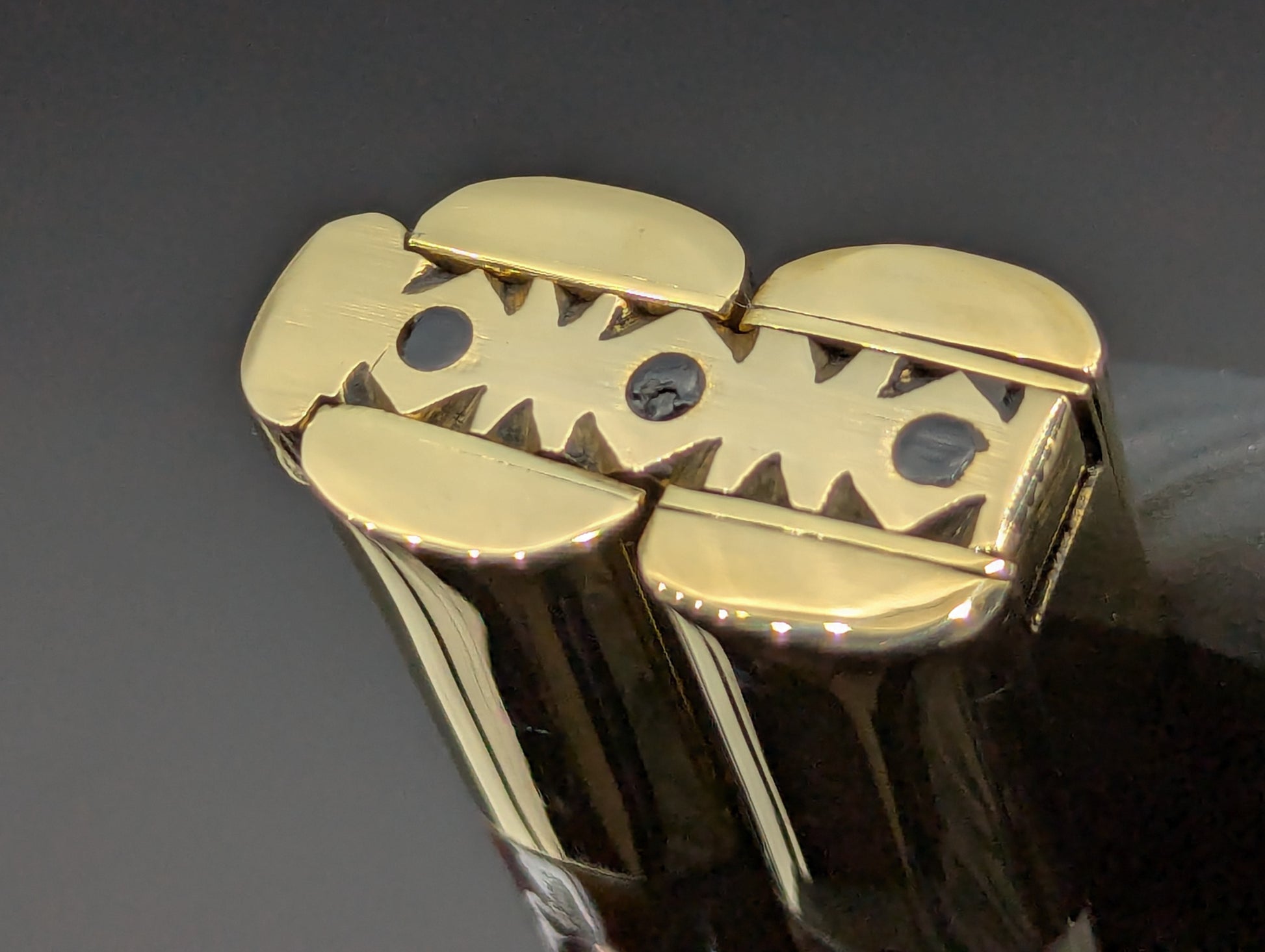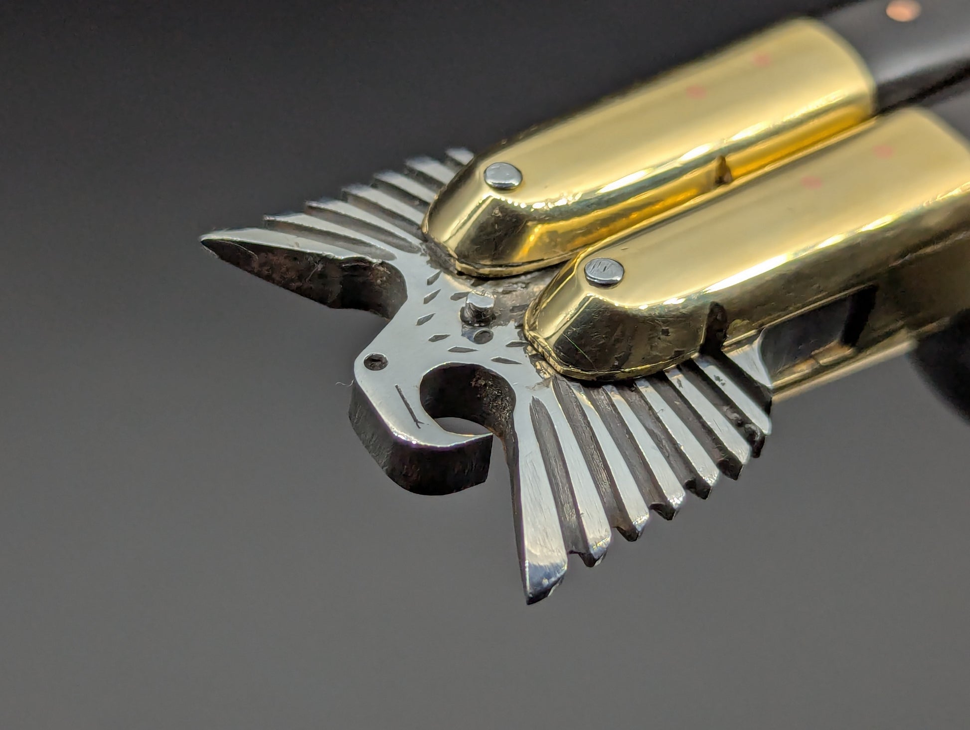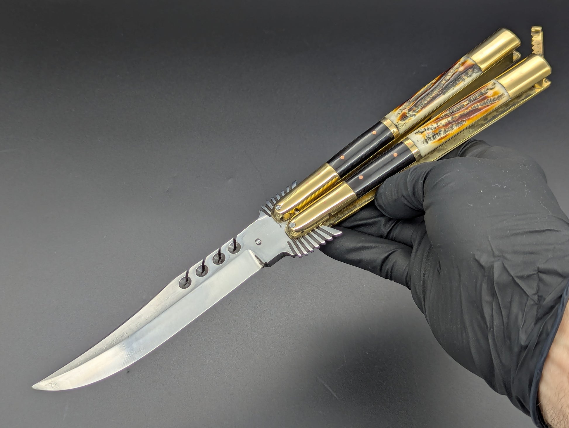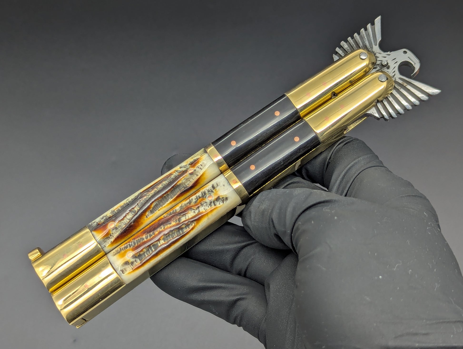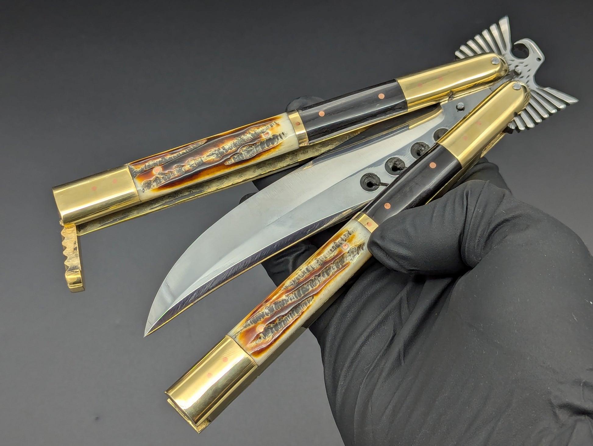 SPECIAL LIMITED MODELS CARVED "EAGLE TANG" PHILIPPINES HANDMADE BALISONG. ALL GLEAMING BRASS CONSTRUCTION. DOUBLE SECTIONS OF POLISHED CARABOA HORN AND BEAUTIFUL HANDCRAFTED BURNT/ JIGGED DEER HORN SCALES WITH BRASS UPPER AND LOWER BOLSTERS. HIGH CARBON STEEL DOUBLE EDGED "RAMBO" CLIP POINT GRIND BLADE WITH MILLING AND FILEWORKED SPINE. ABSOLUTELY CLASSIC! MAKERS MARK ON SAFETY LATCH. 11.25" OPEN LENGTH. 5.25" BLADE LENGTH