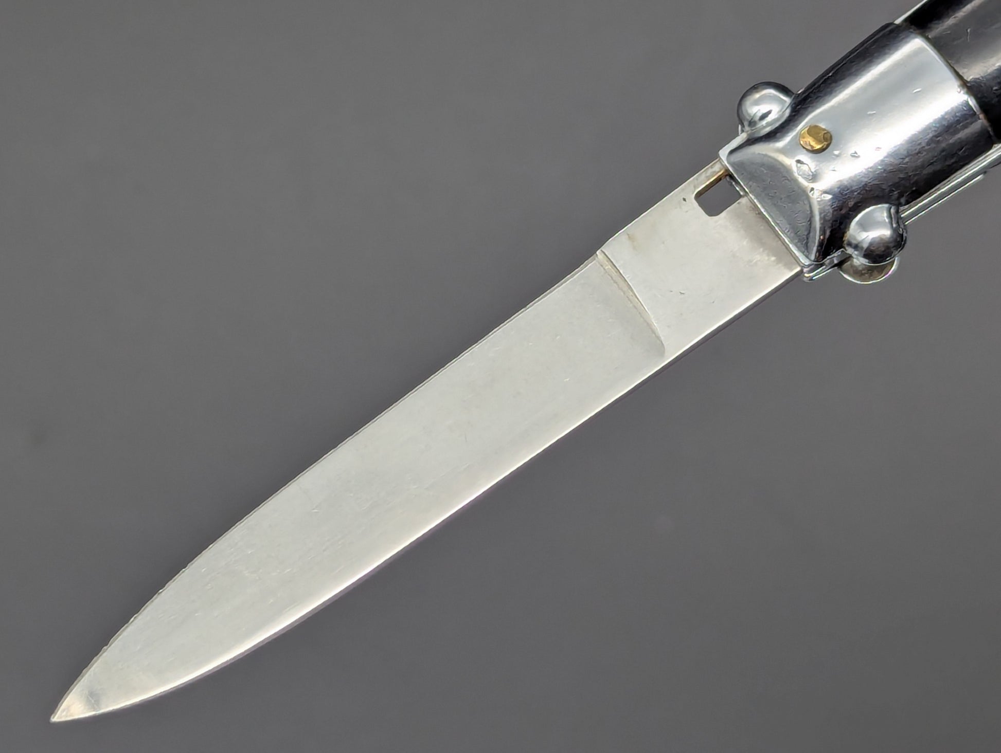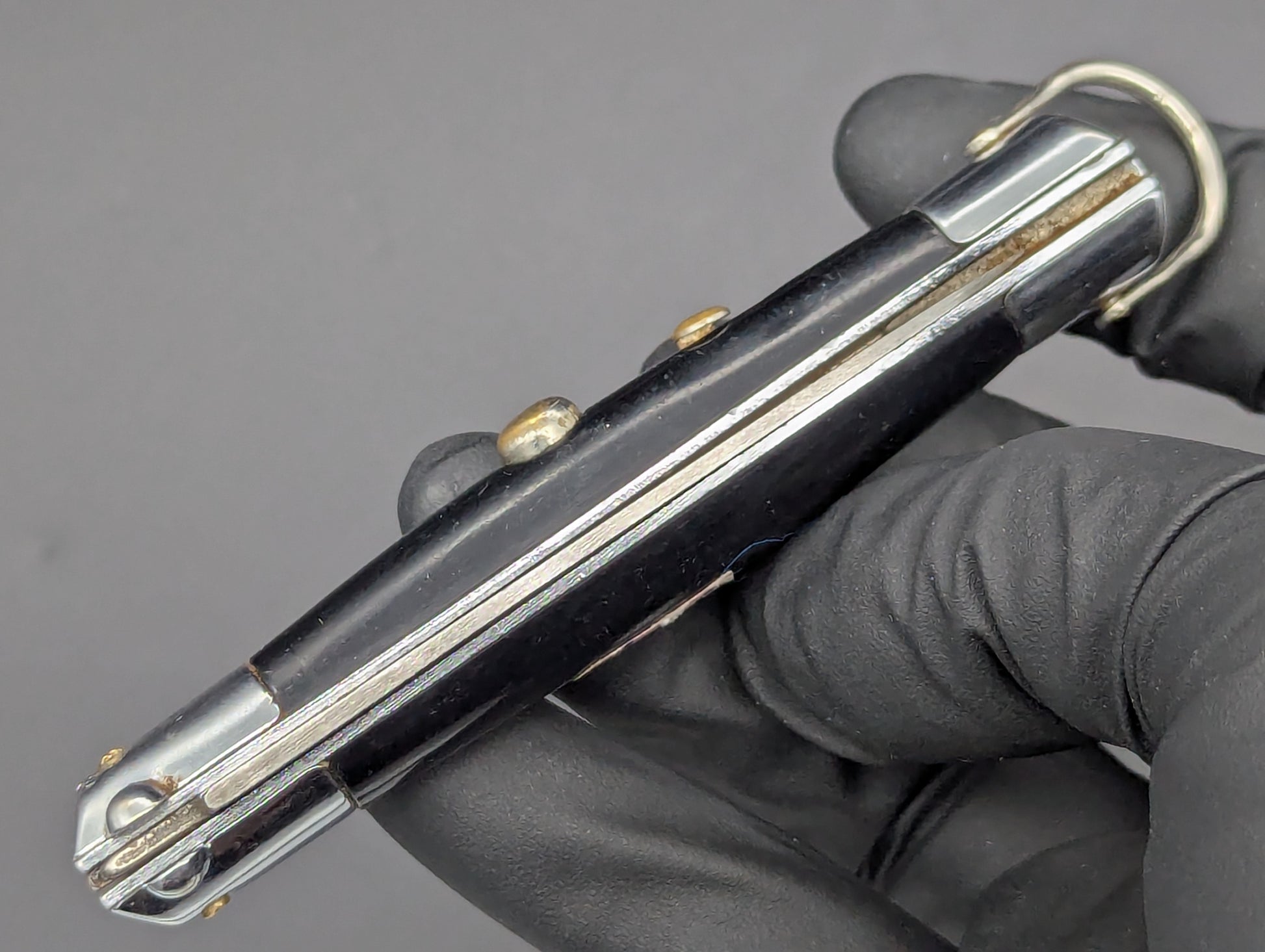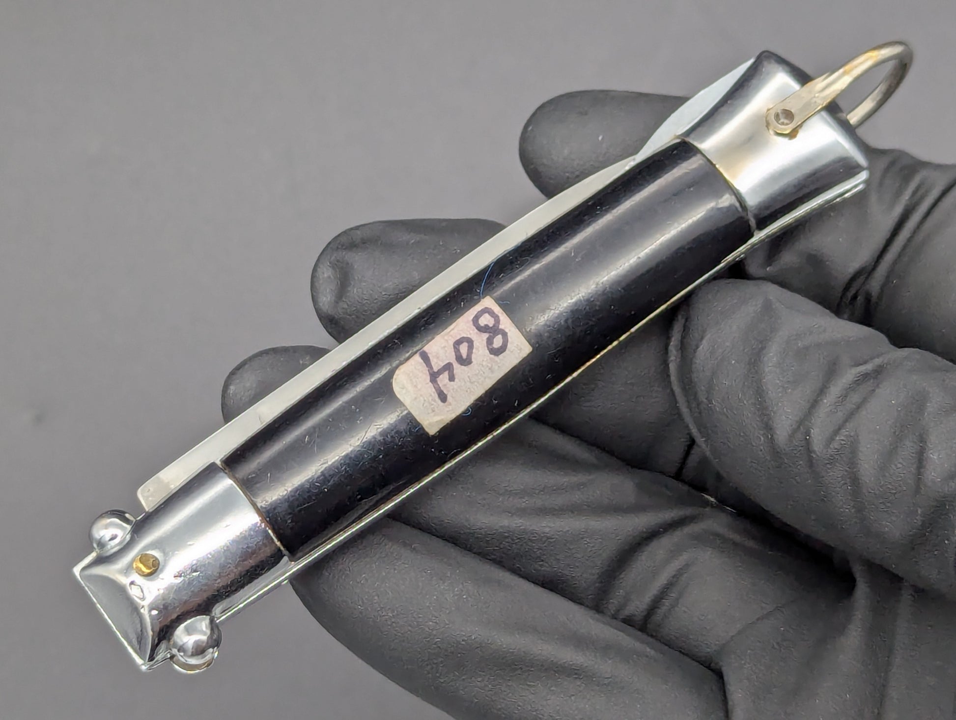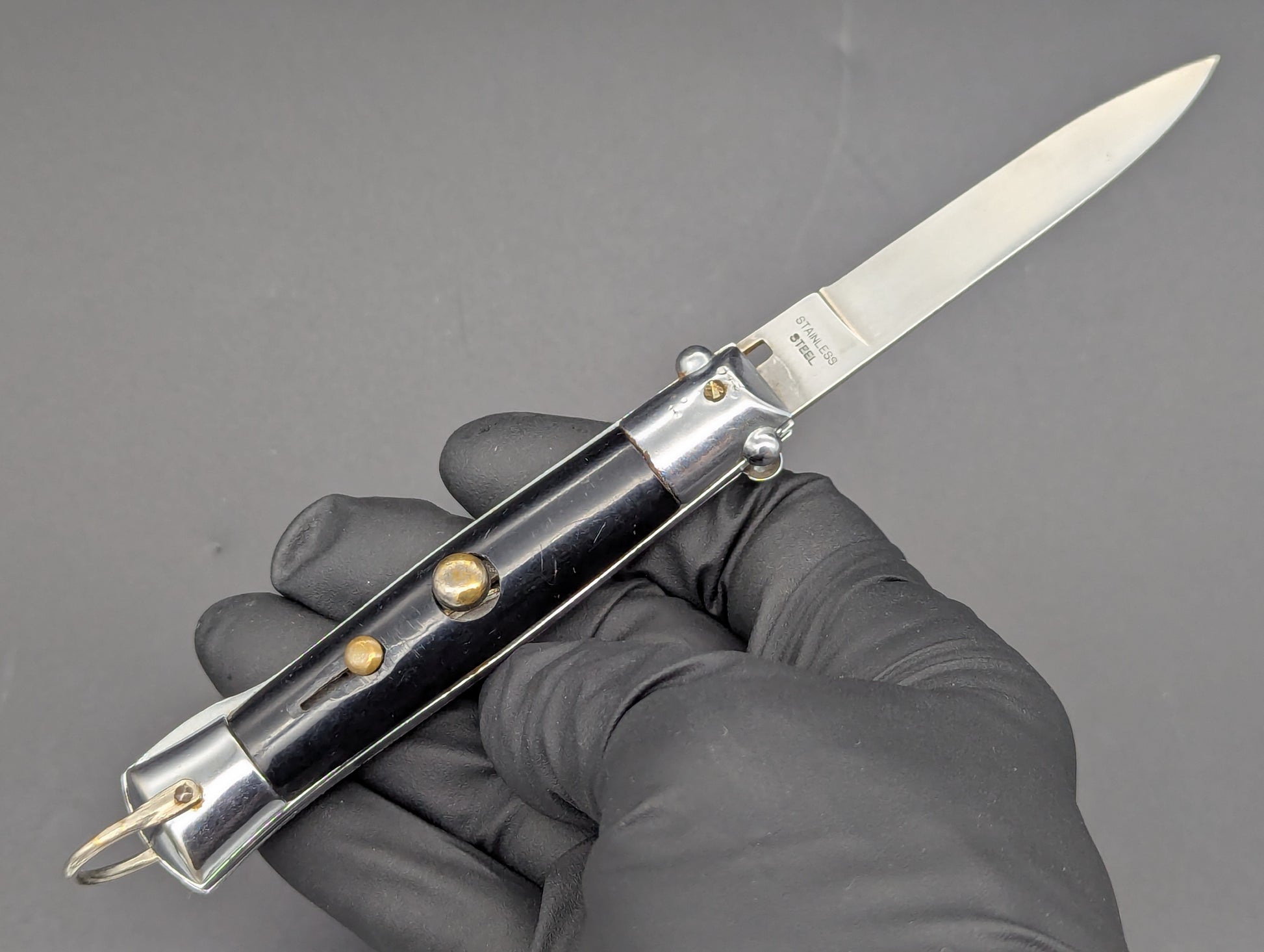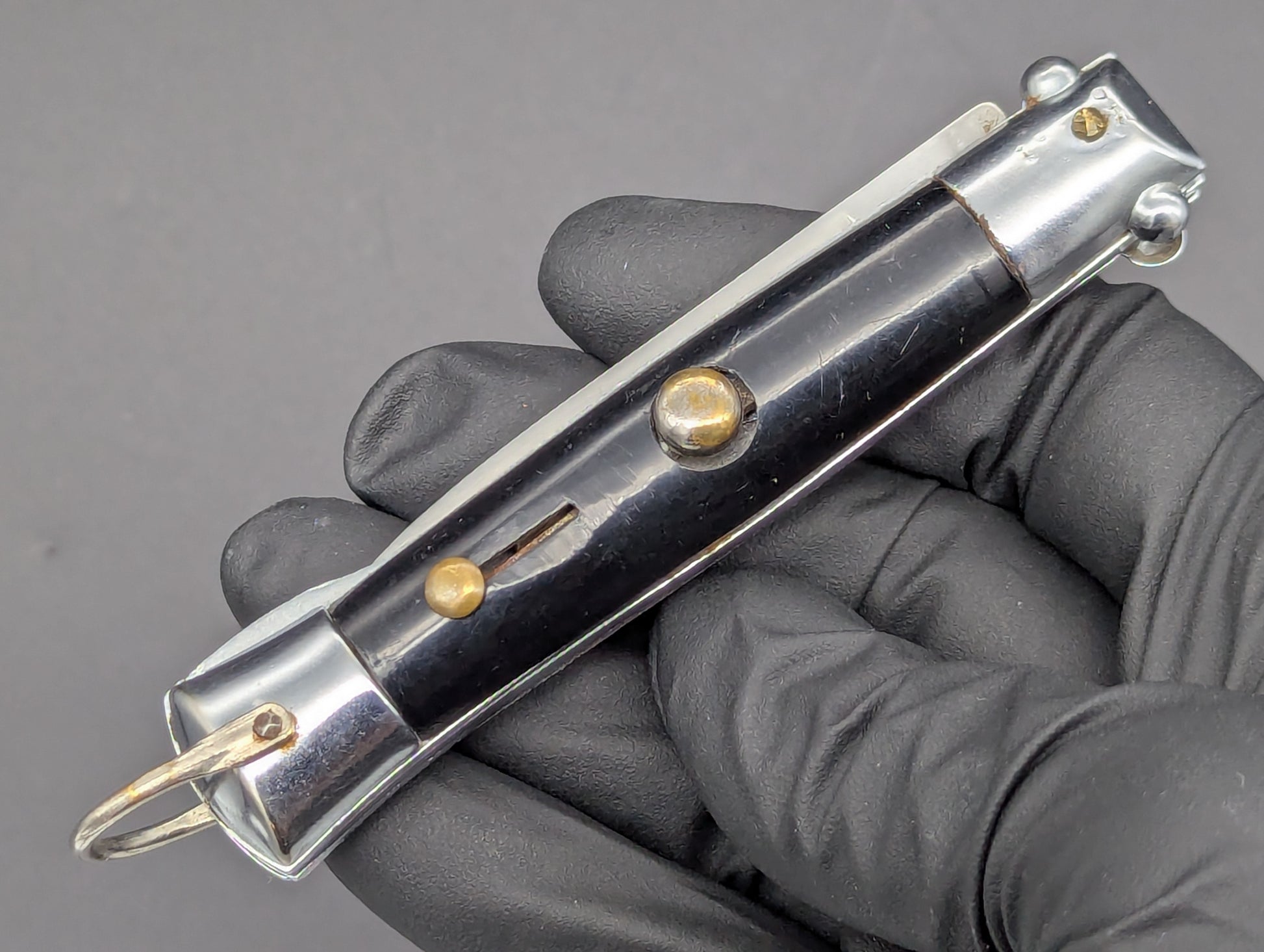 LITTLE OLE 6.5" MICKEY EARS MINI SWITCHBLADE KNIFE. THESE ARE SOMEWHERE OBSCURE AND NOT OFTEN SEEN IN FACT. THE ARE THE SAME ERA AS THE JAPANESE RIZZUTTO ESTLILETTO MILANO AND SAME MATERIALS. SOLID BLACK COMPOSITE SCALES. BRASS FIRING BUTTON. RING BAIL. THIS MODEL IS NOT PERFECT THERE ARE SOME LIGHT ABRASIONS TO THE BLADE FROM OPENING AND CLOSING OVER THE YEARS. LIGHT MICRO ABRASIONS TO SCALES FROM HANDLING BUT OVERALL THIS EXAMPLE IS VERY NICE AND CLEAN!  EVERYTHING WORKS AS IT SHOULD AND THIS GUY IS A GREAT LITTLE COLLECTIBLE THAT'S SURE TO BRING ATTENTION IN THE DISPLAY CASE!