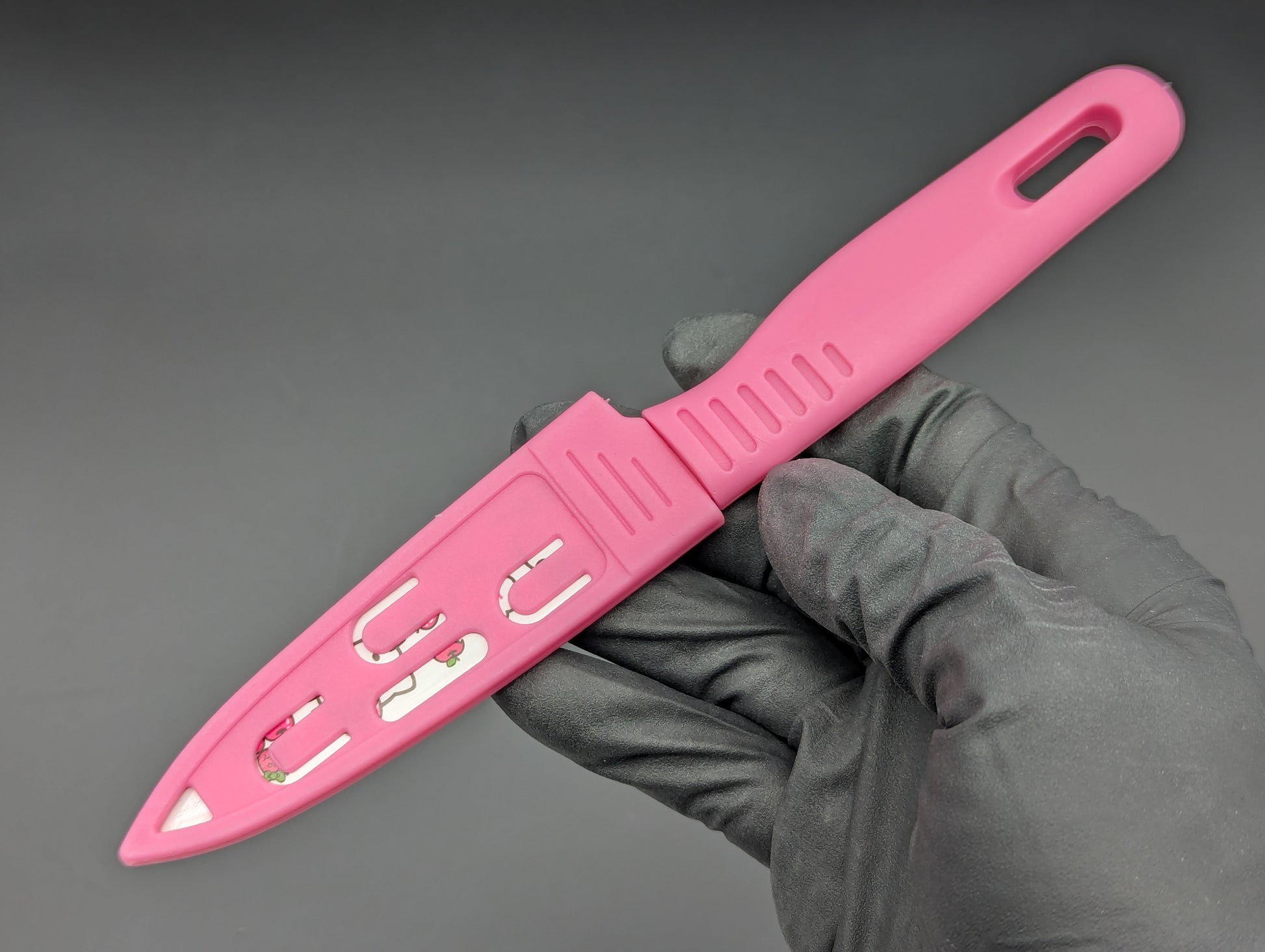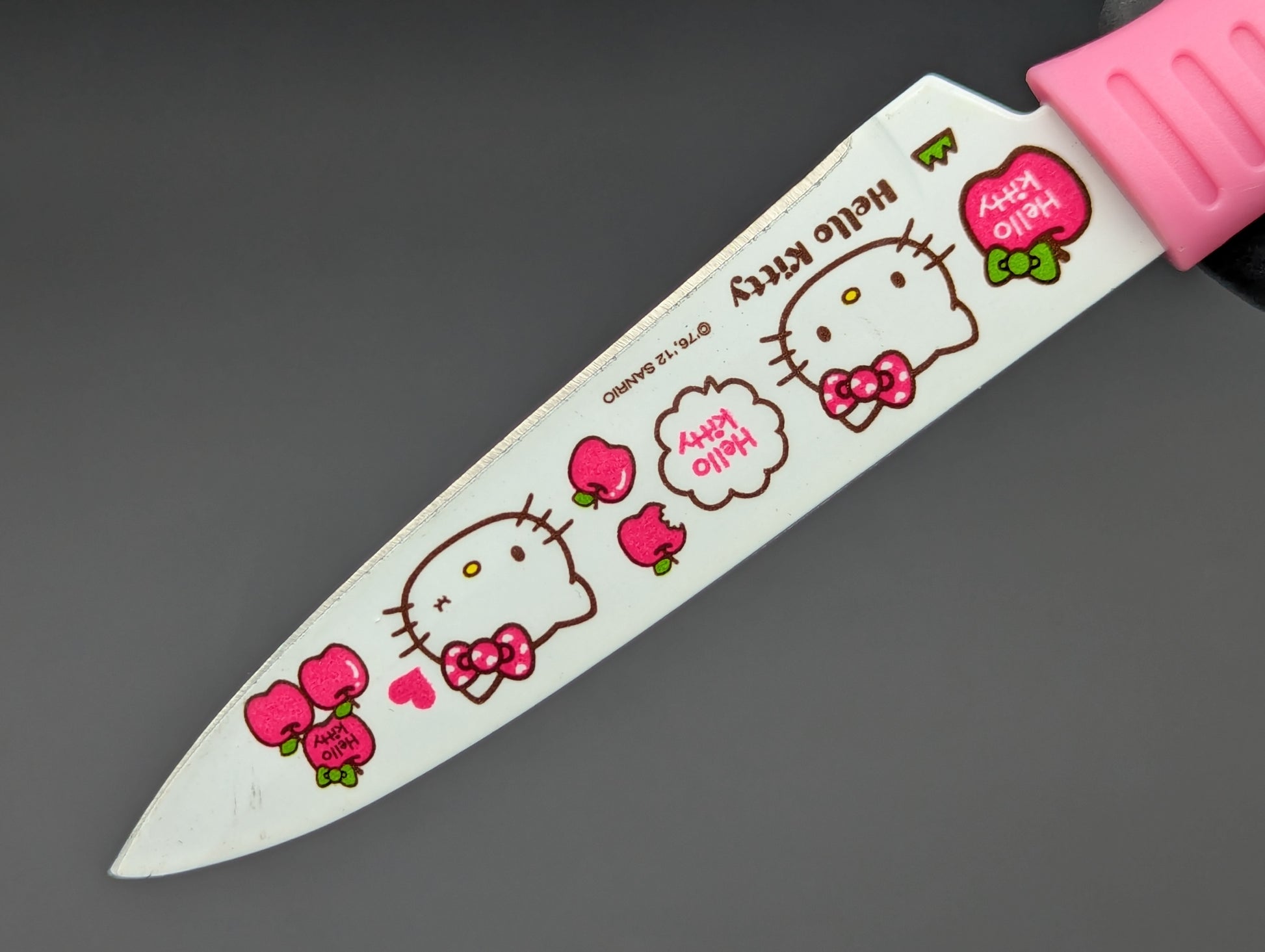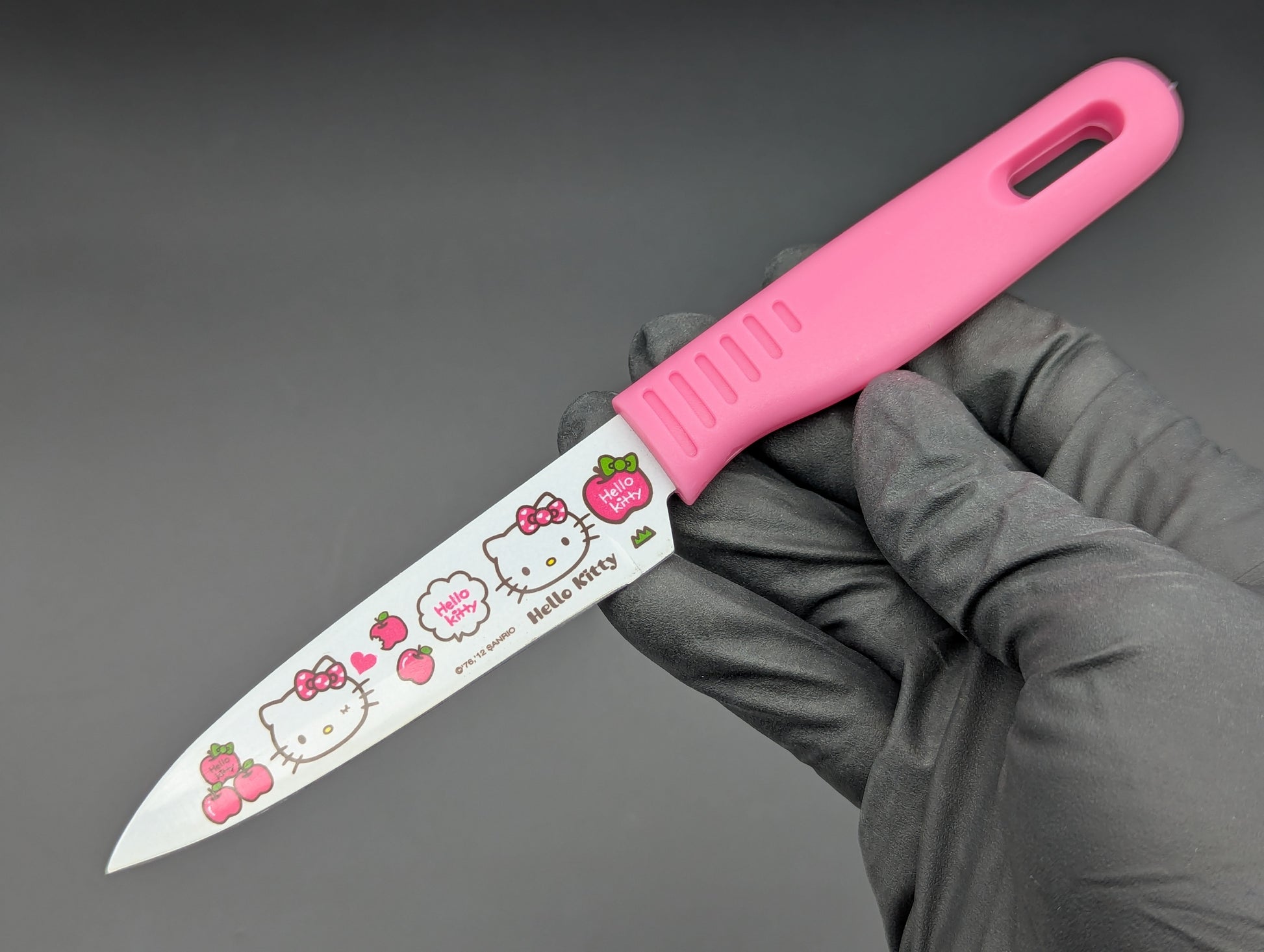 STAINLESS STEEL AND MOLDED TEXTURED ABS HANDLE HELLO KITTY DESIGN PAIRING KNIFE WITH MATCHING ABS MOLD INJECTED SHEATH. OVERALL 7.5" BLADE 3.75"