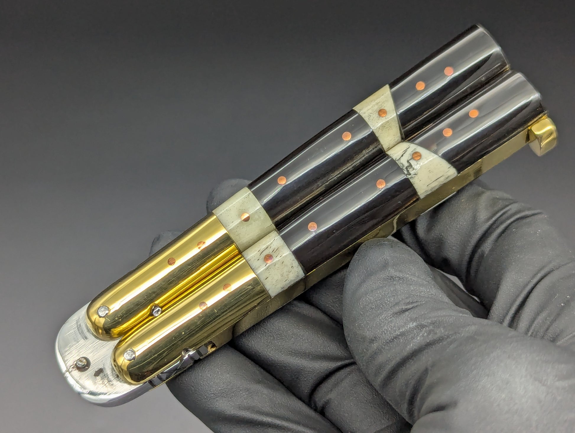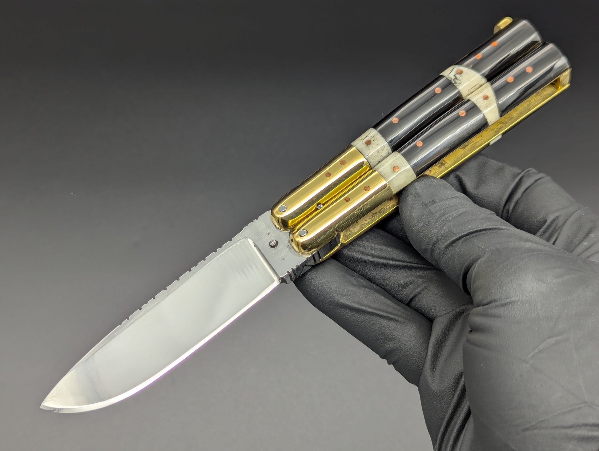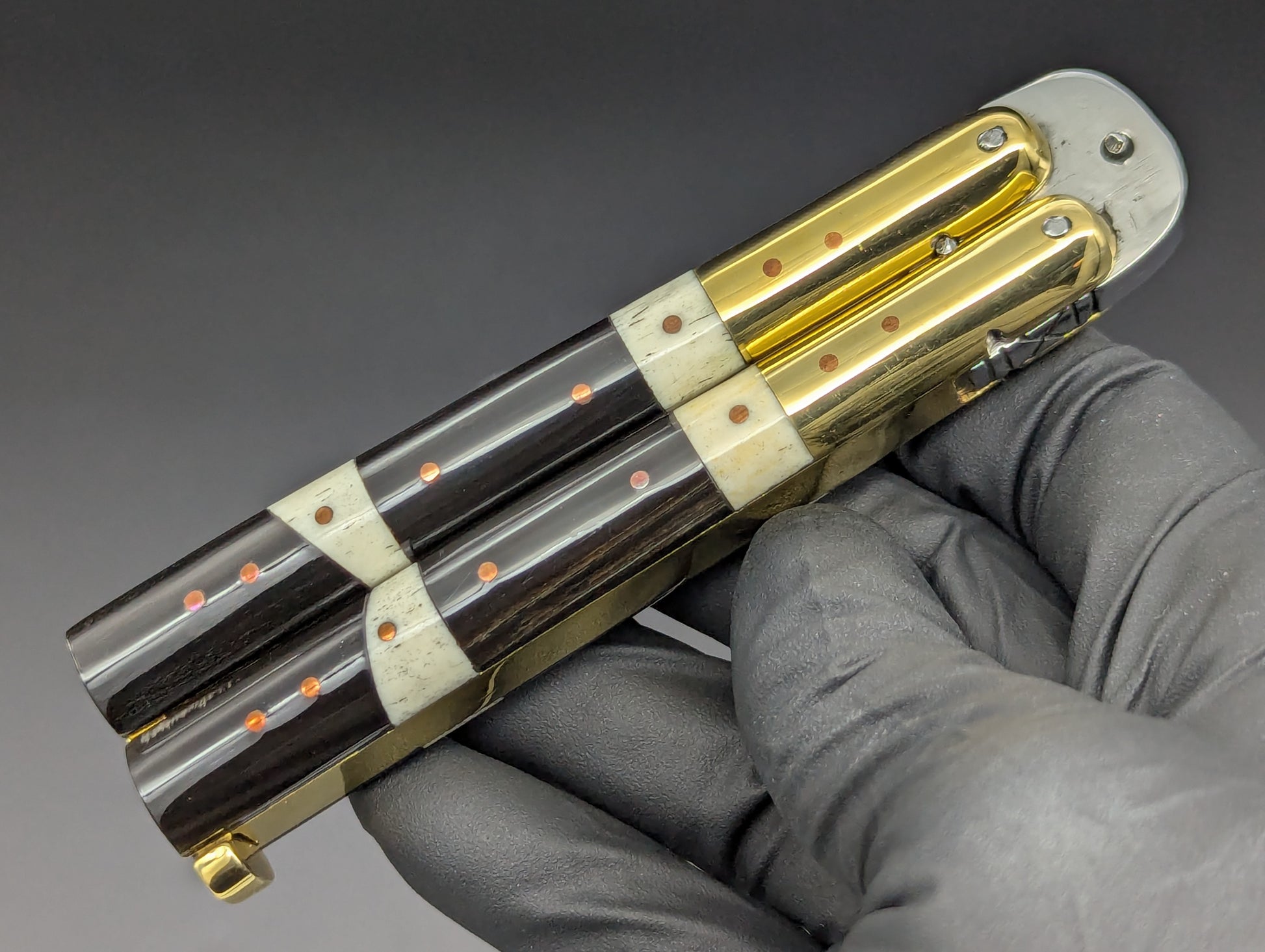 STRAIGHT FROM THE HANDS OF "MAURO" MASTER BALISONG MAKER! 7.5" CARABOO & WHITE BONE/ BRASS WITH RAZOR SHARP FILEWORKED BLADE. MAKERS MARKS ON LATCH. 3.5" BLADE.
