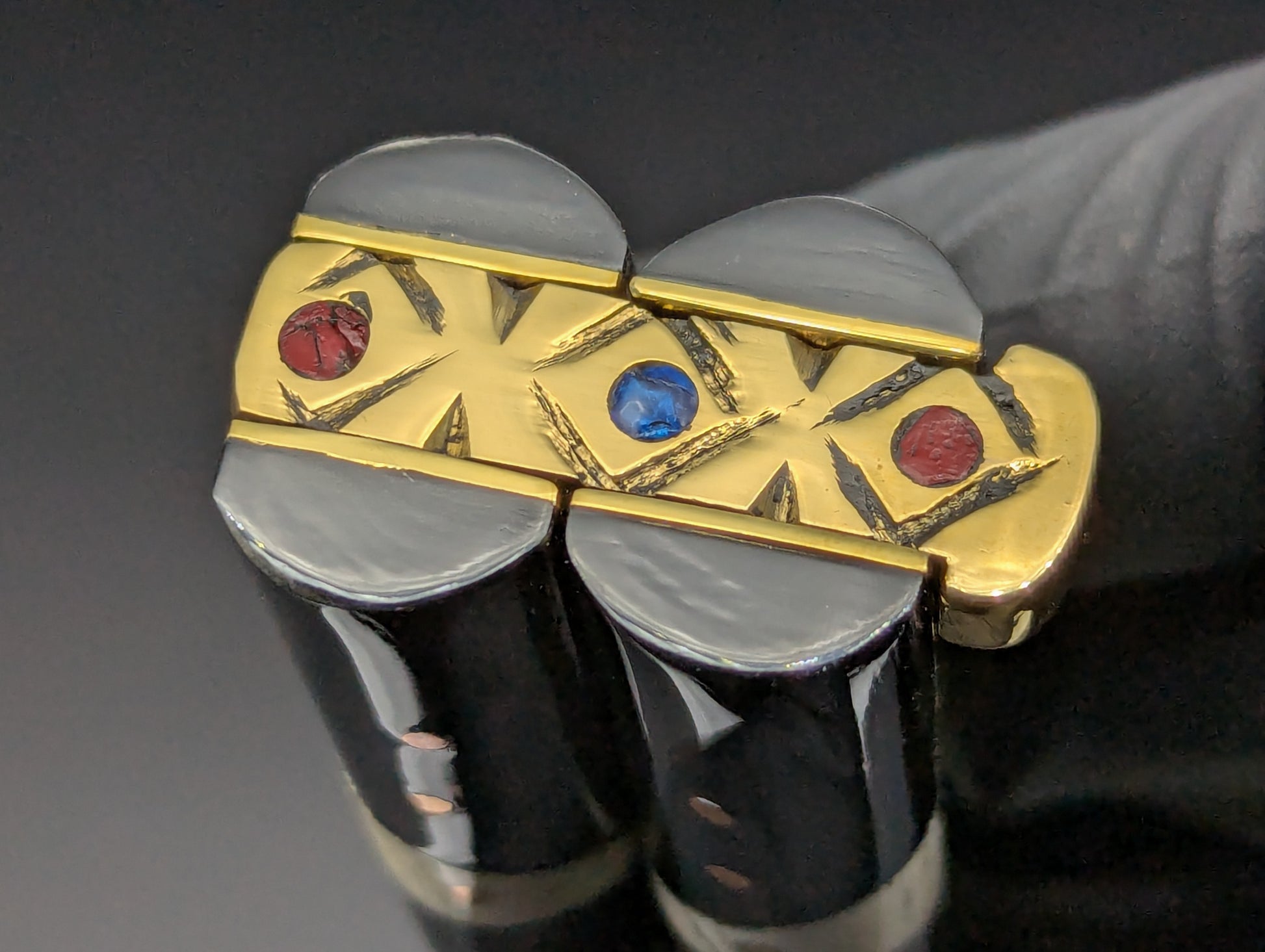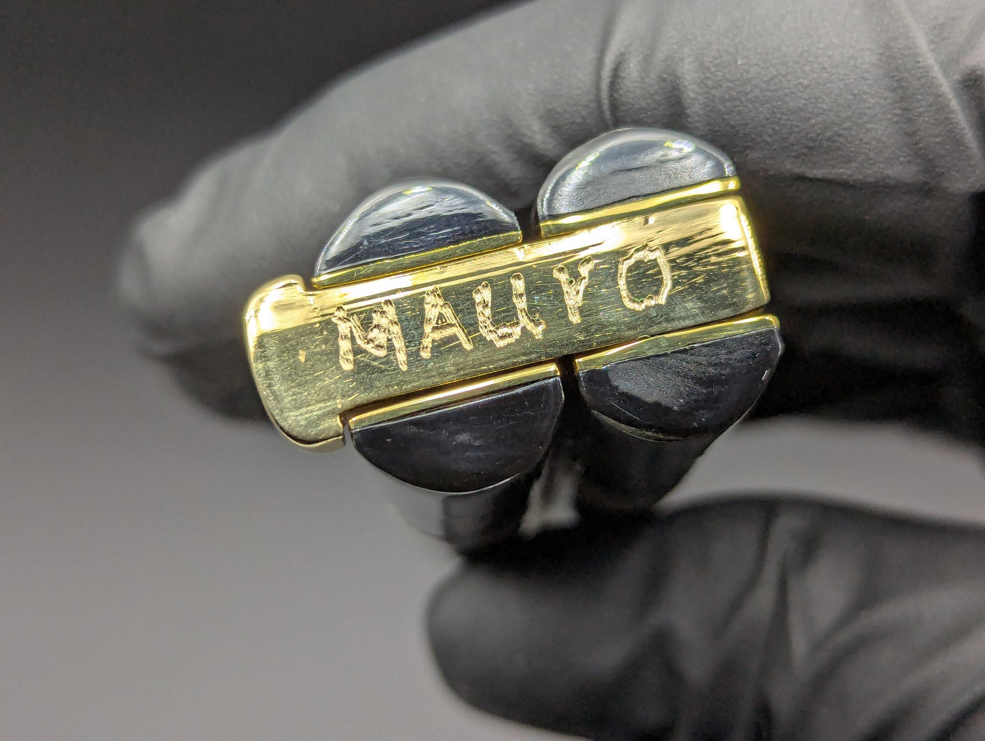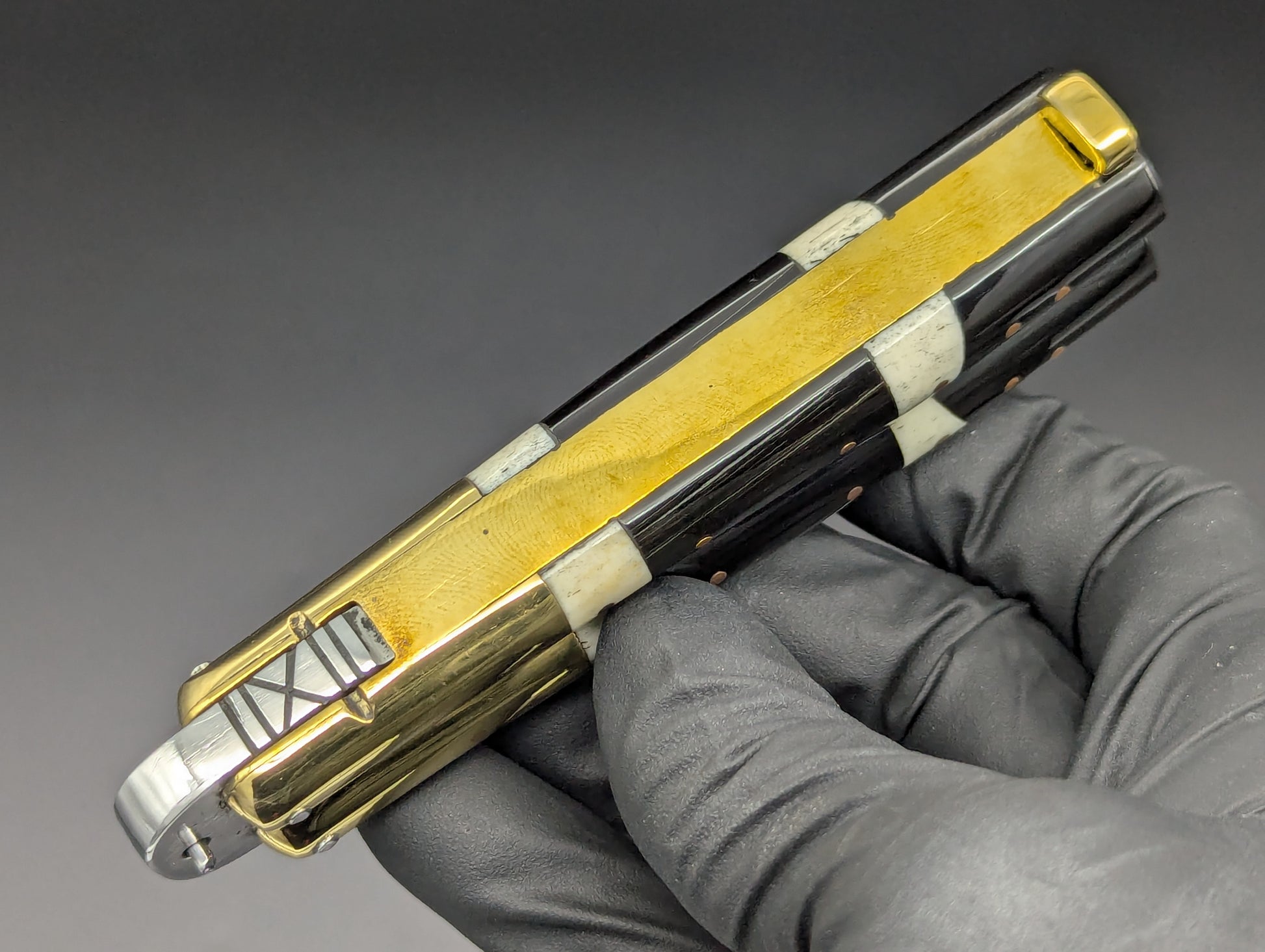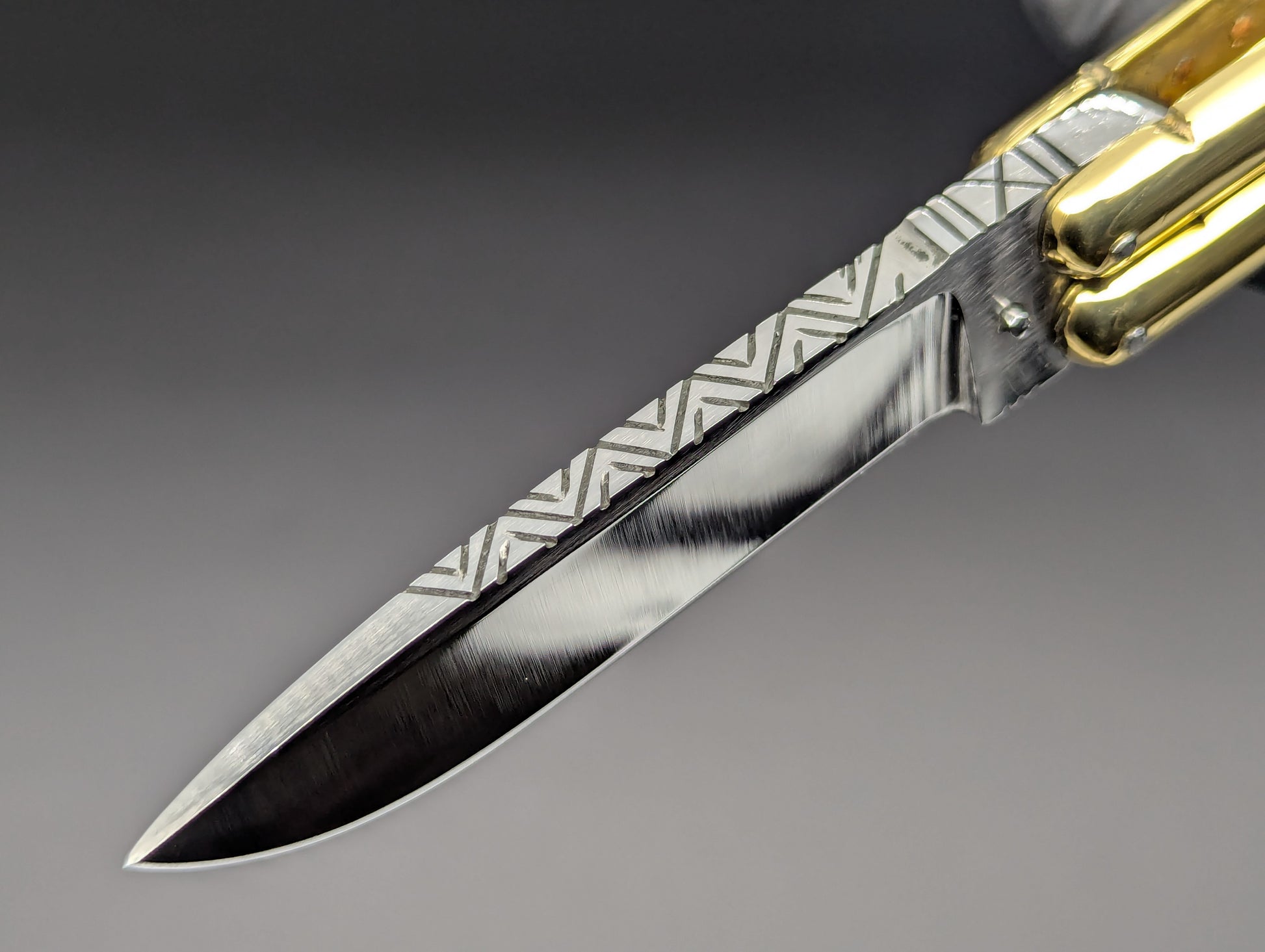 STRAIGHT FROM THE HANDS OF "MAURO" MASTER BALISONG MAKER! 7.5" CARABOO & WHITE BONE/ BRASS WITH RAZOR SHARP FILEWORKED BLADE. MAKERS MARKS ON LATCH. 3.5" BLADE.