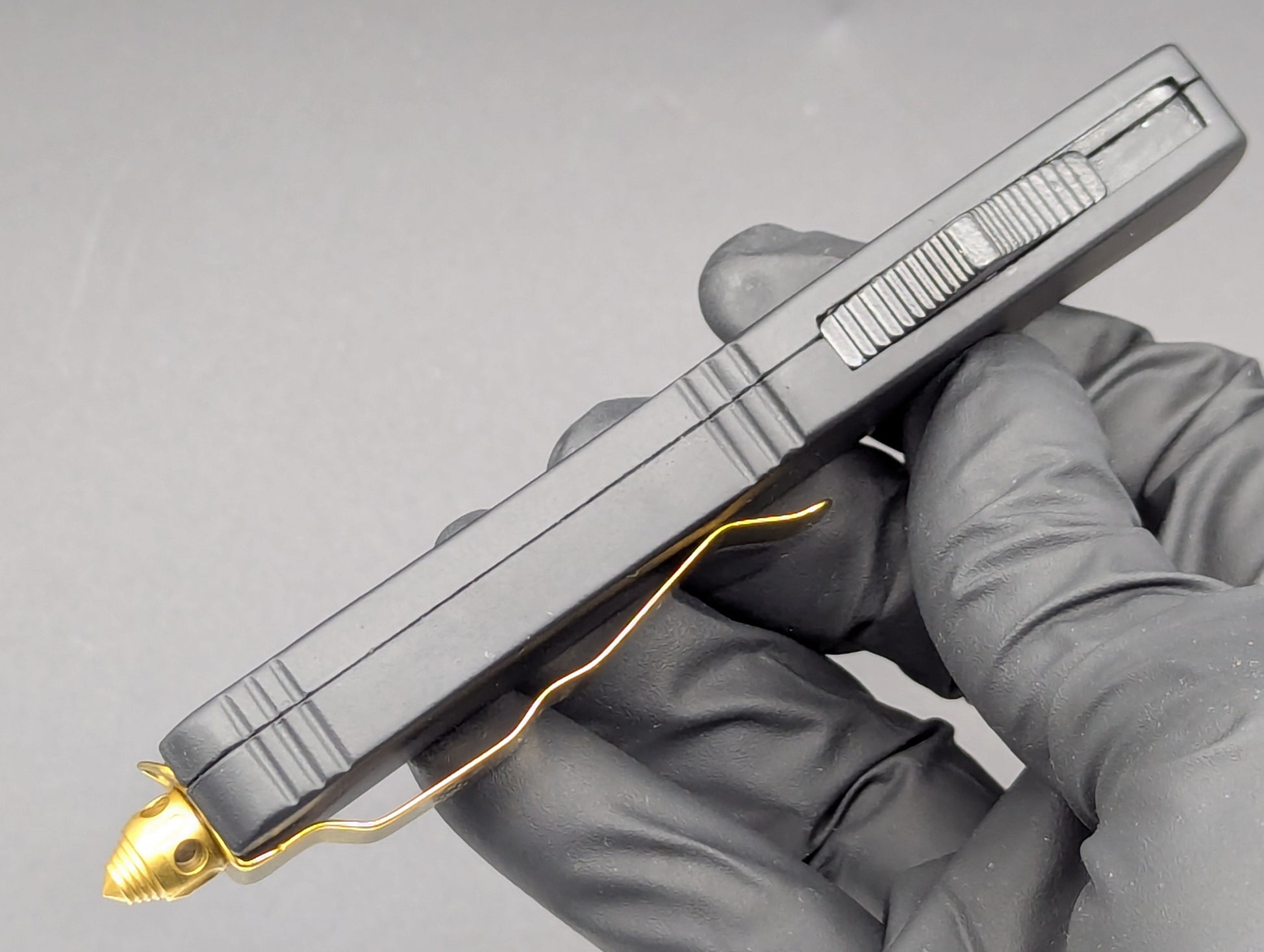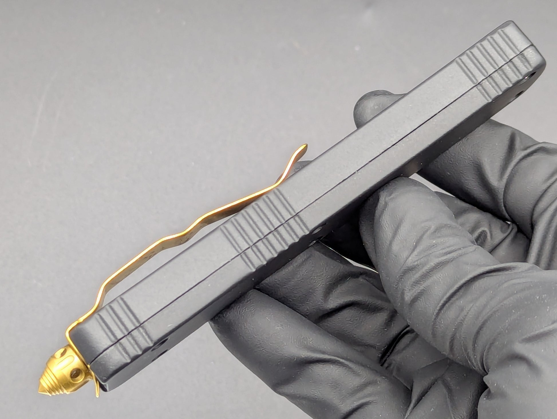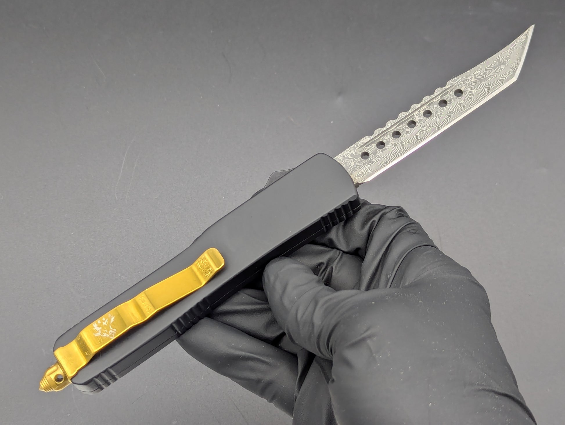 BEAUTIFUL GENUINE DAMASCUS BLADE WITH A HELL HOUND STYLE APPEARANCE. CLASSIC SLIM RECTANGULAR ALUMINUM ZINC ALLOY HANDLE FINISHED BLACK. GOLD ACCENTED HARDWARE. SPRING STEEL POCKET CLIP. TUNGSTEN CARBIDE GLASS BREAKER. 8.5" OL 3.25" BL
