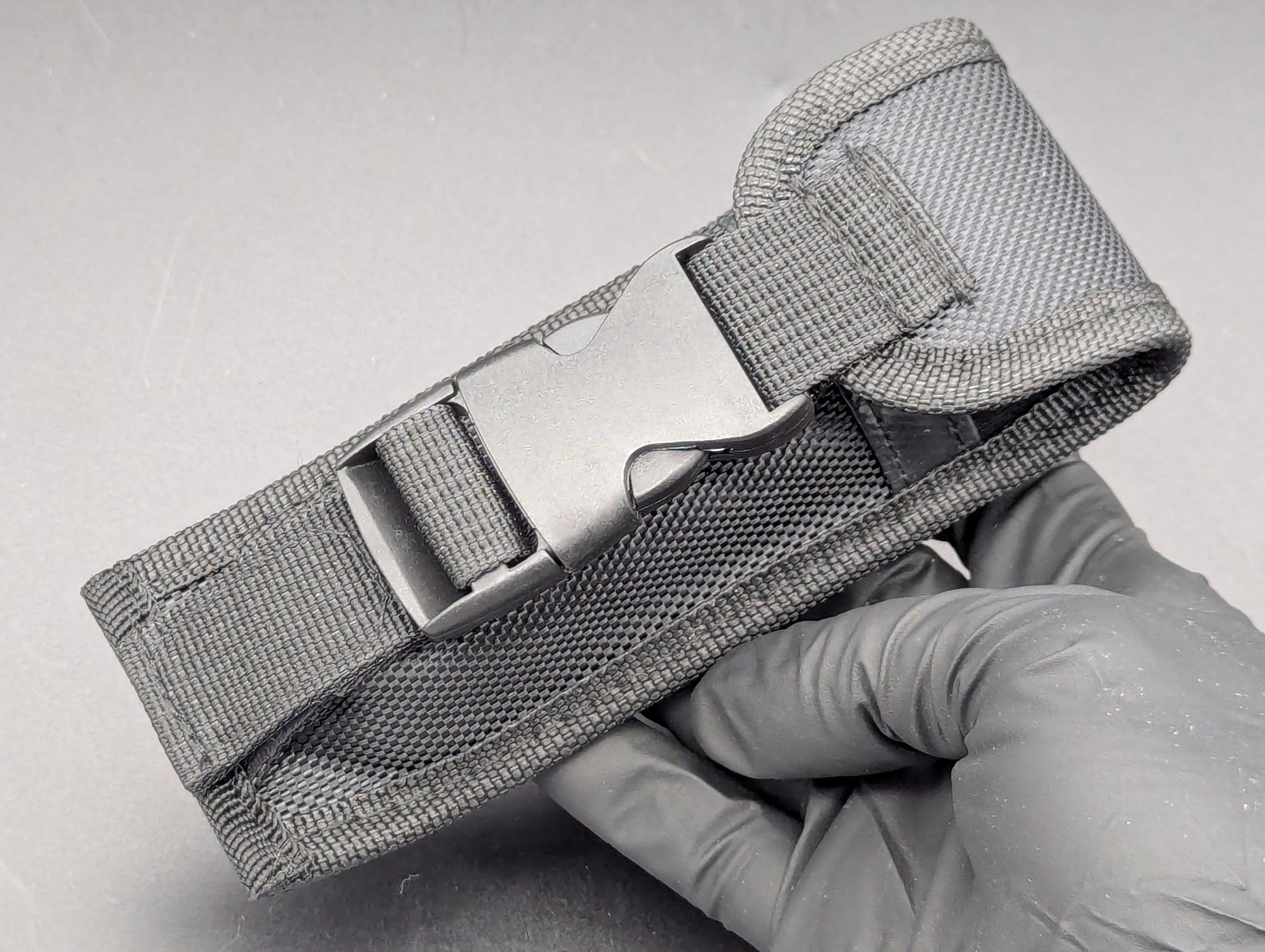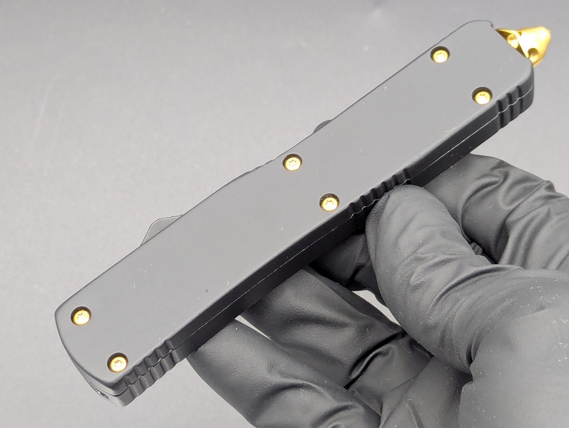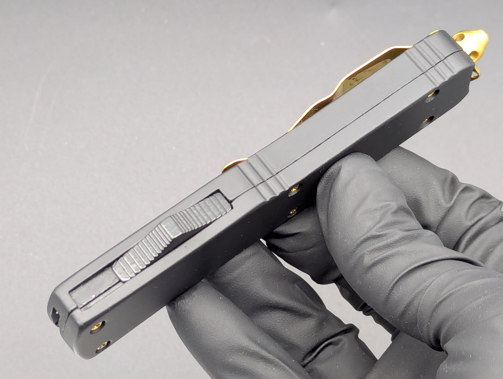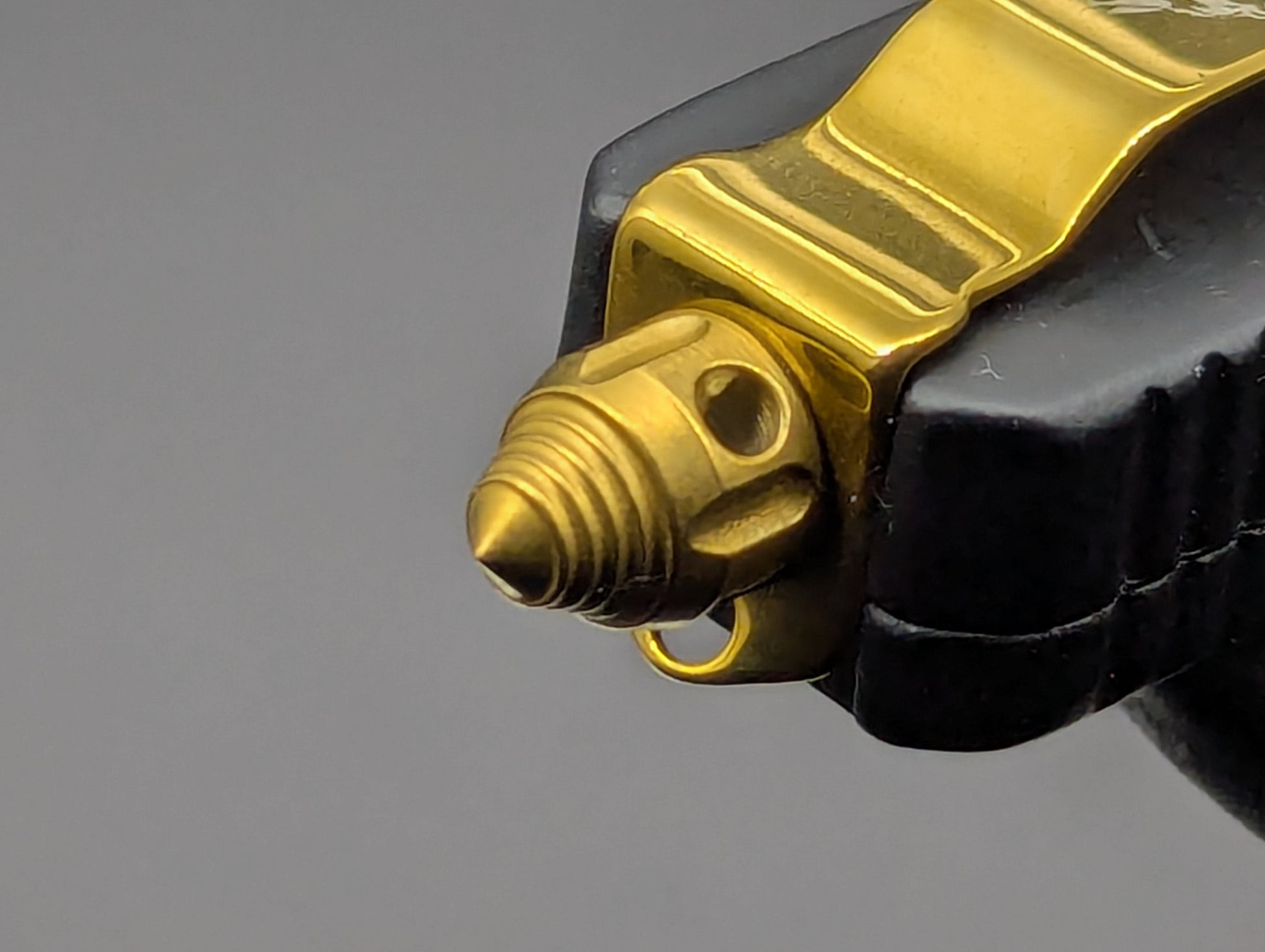 BEAUTIFUL GENUINE DAMASCUS BLADE WITH A HELL HOUND STYLE APPEARANCE. CLASSIC SLIM RECTANGULAR ALUMINUM ZINC ALLOY HANDLE FINISHED BLACK. GOLD ACCENTED HARDWARE. SPRING STEEL POCKET CLIP. TUNGSTEN CARBIDE GLASS BREAKER. 8.5" OL 3.25" BL