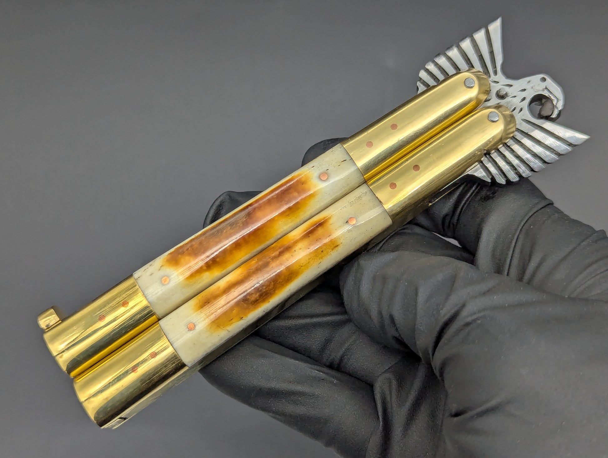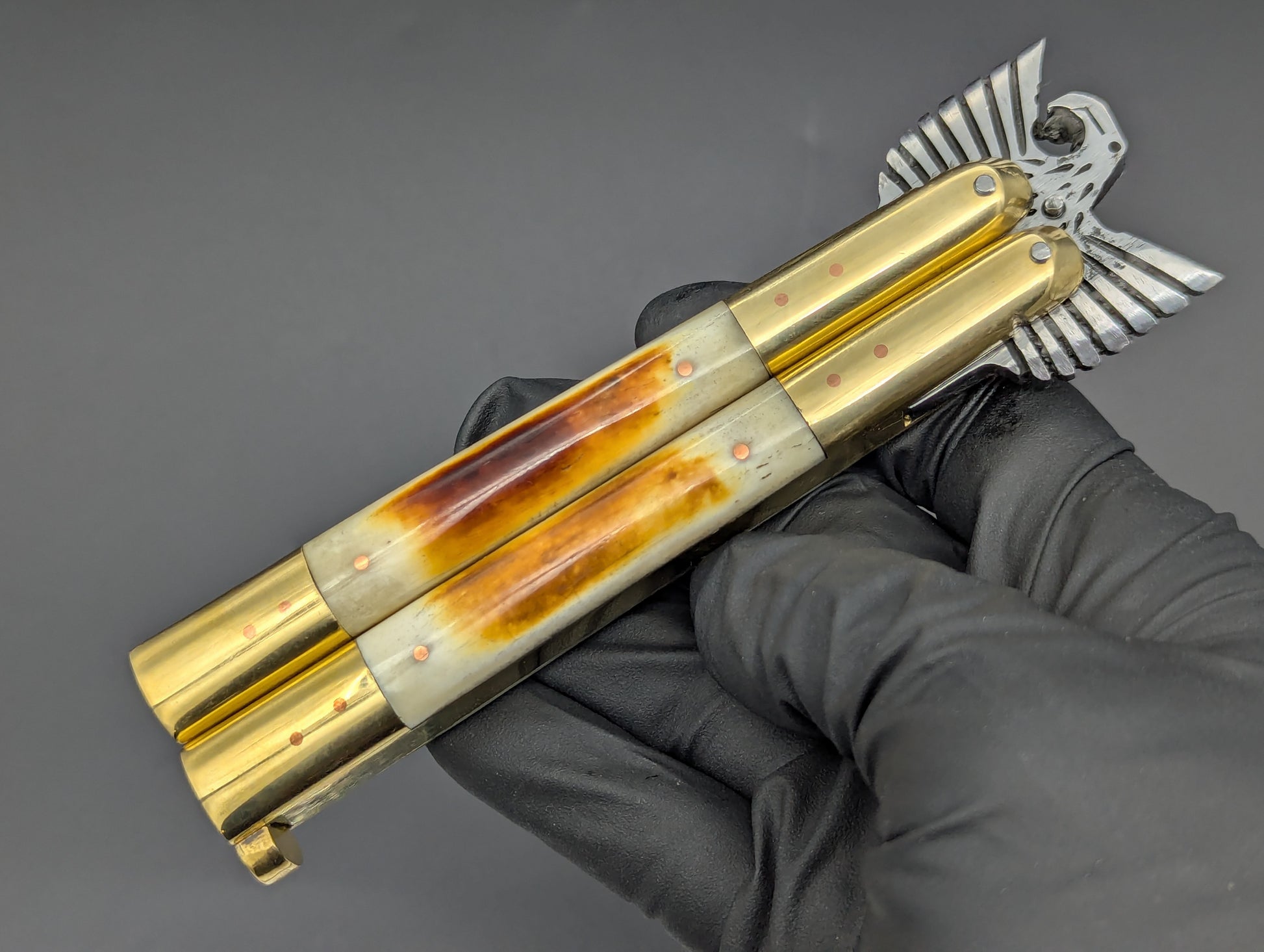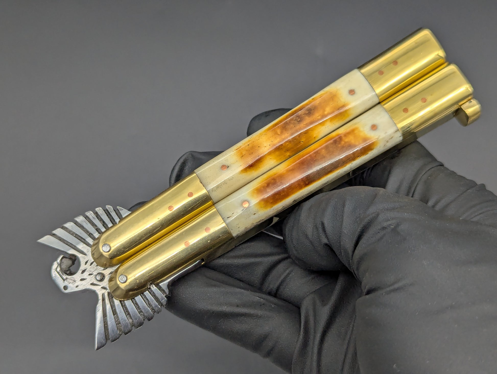FRESH CARVED EAGLE TANG FHM BALISONG IN 22CM OVERALL LENGTH. THIS VERSION FEATURES A SOLID BRASS HOUSING WITH POLISHED BRASS TOP AND BOTTOM BOLSTERS WITH BURNT BONE SCALES. BIG BEEFY 4" CLASSIC MILLED RAMBO CLIP POINT BLADE. SOLID BRASS SAFETY LATCH WITH MAKERS MARK. HANDMADE BALISONG FROM TAAL BATANGAS PHILIPPINES.