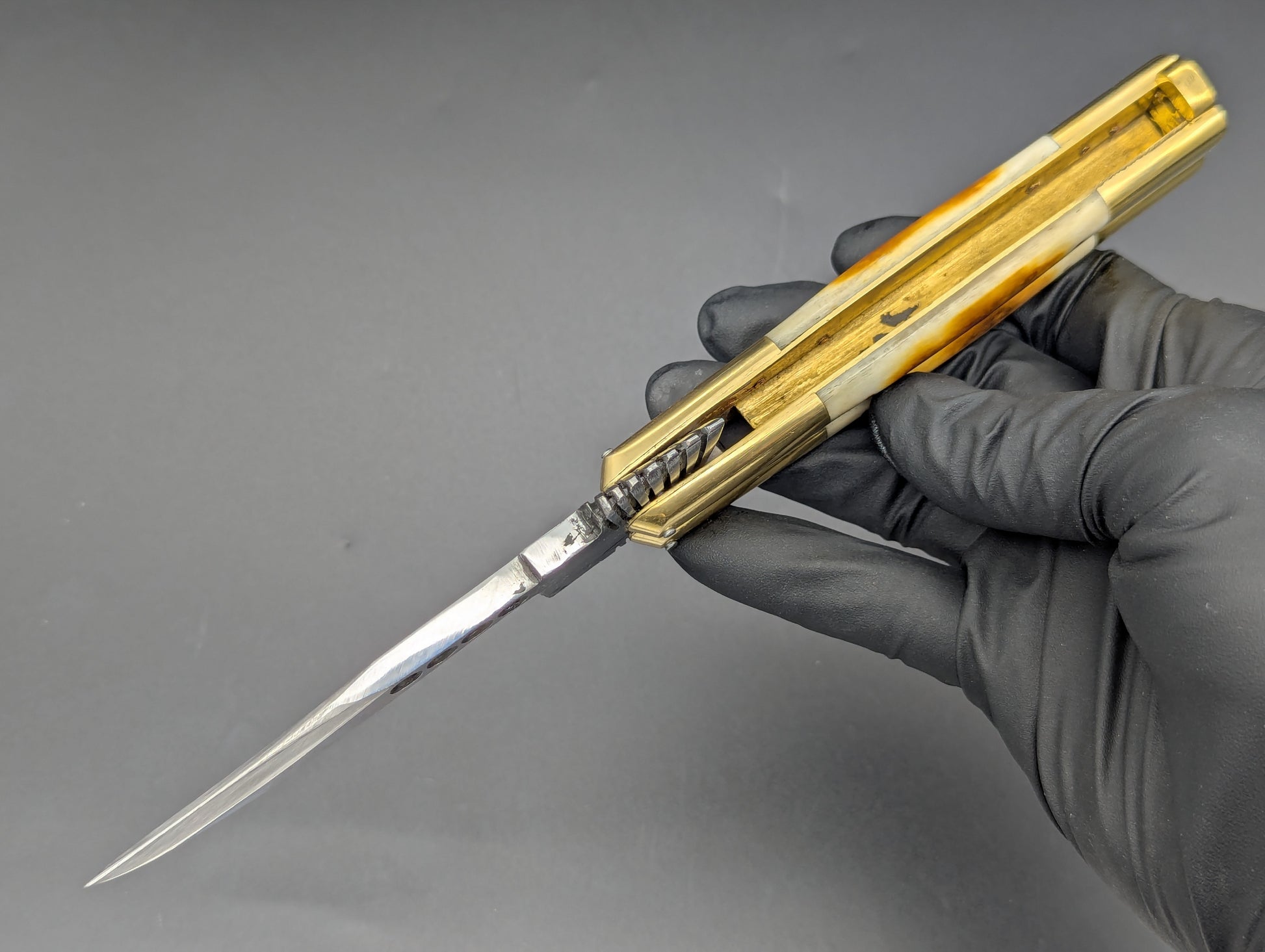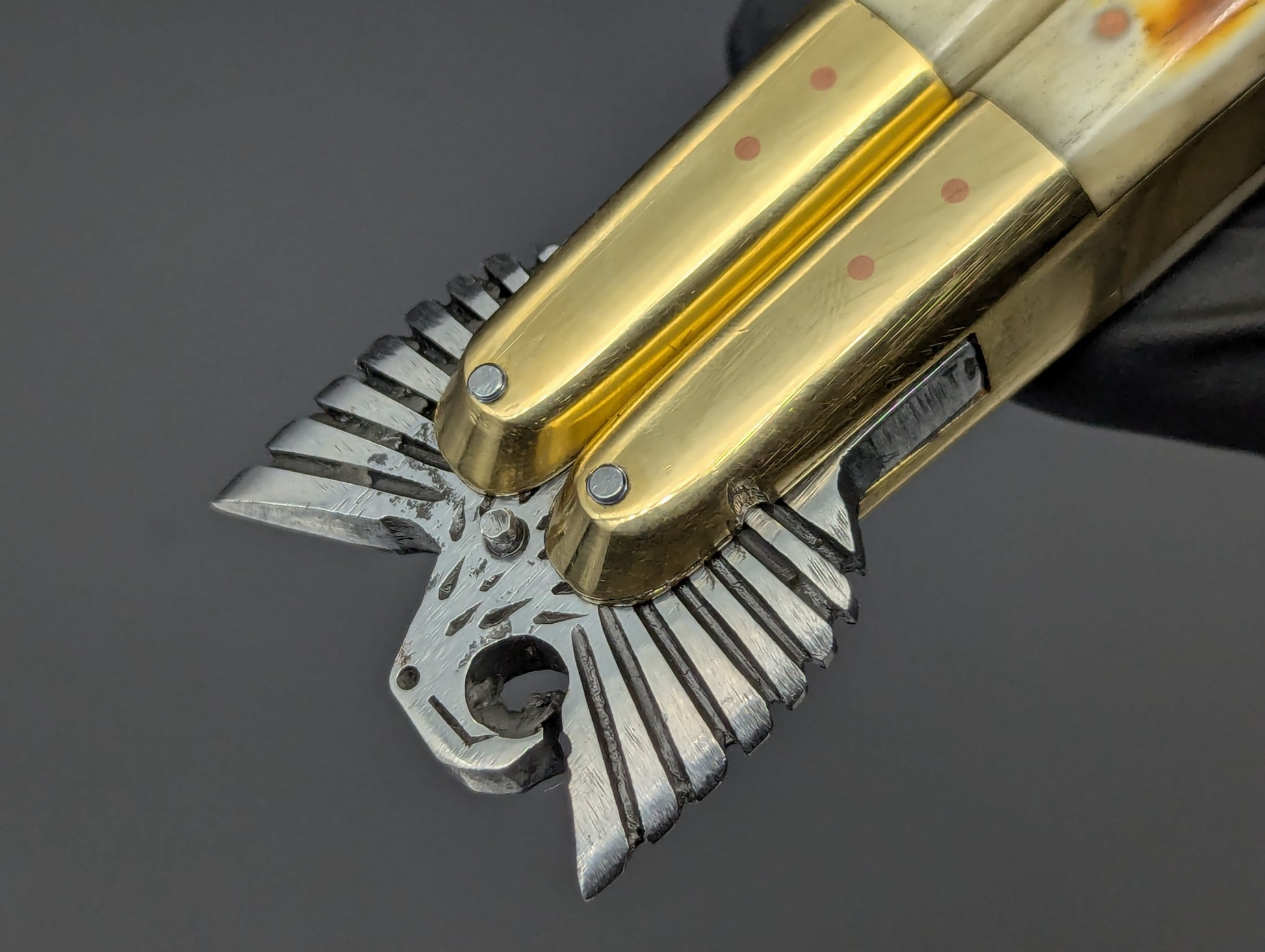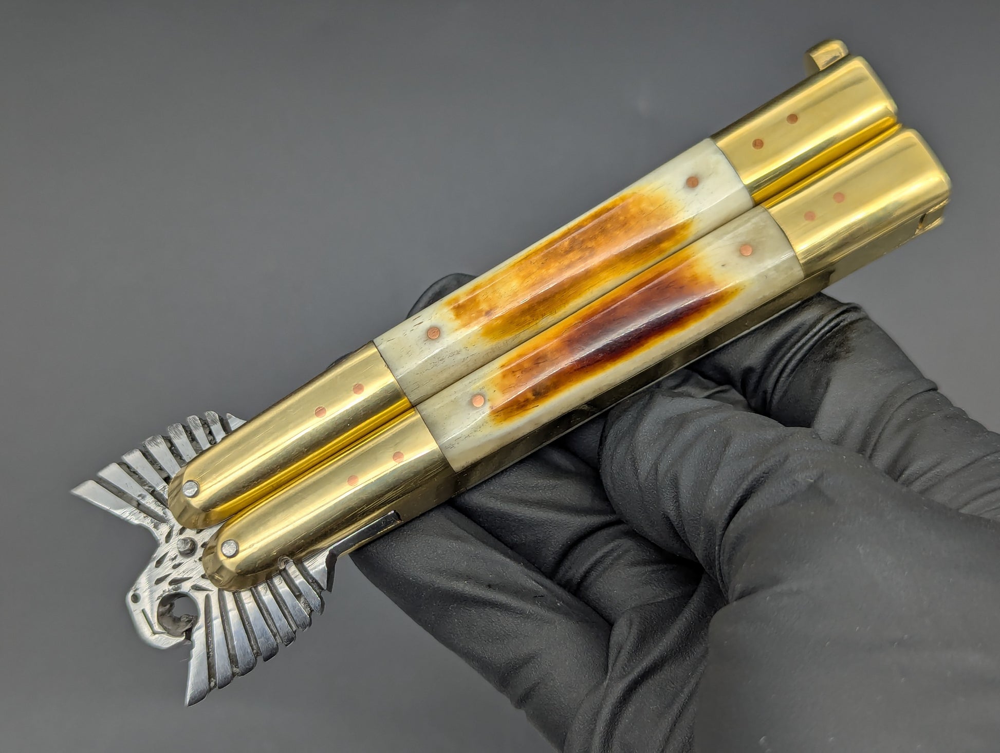 FRESH CARVED EAGLE TANG FHM BALISONG IN 22CM OVERALL LENGTH. THIS VERSION FEATURES A SOLID BRASS HOUSING WITH POLISHED BRASS TOP AND BOTTOM BOLSTERS WITH BURNT BONE SCALES. BIG BEEFY 4" CLASSIC MILLED RAMBO CLIP POINT BLADE. SOLID BRASS SAFETY LATCH WITH MAKERS MARK. HANDMADE BALISONG FROM TAAL BATANGAS PHILIPPINES.