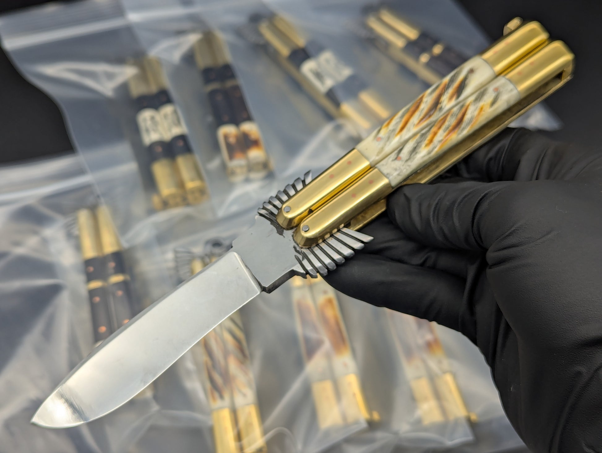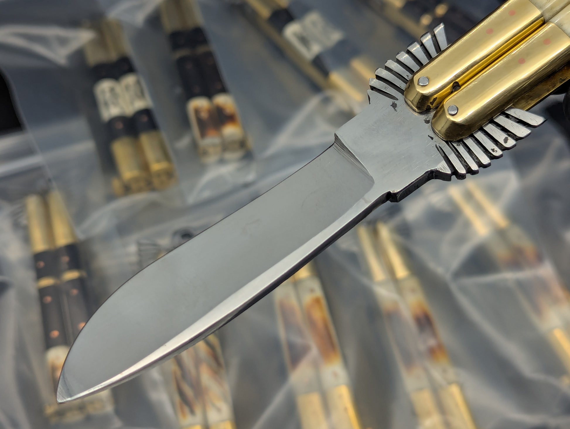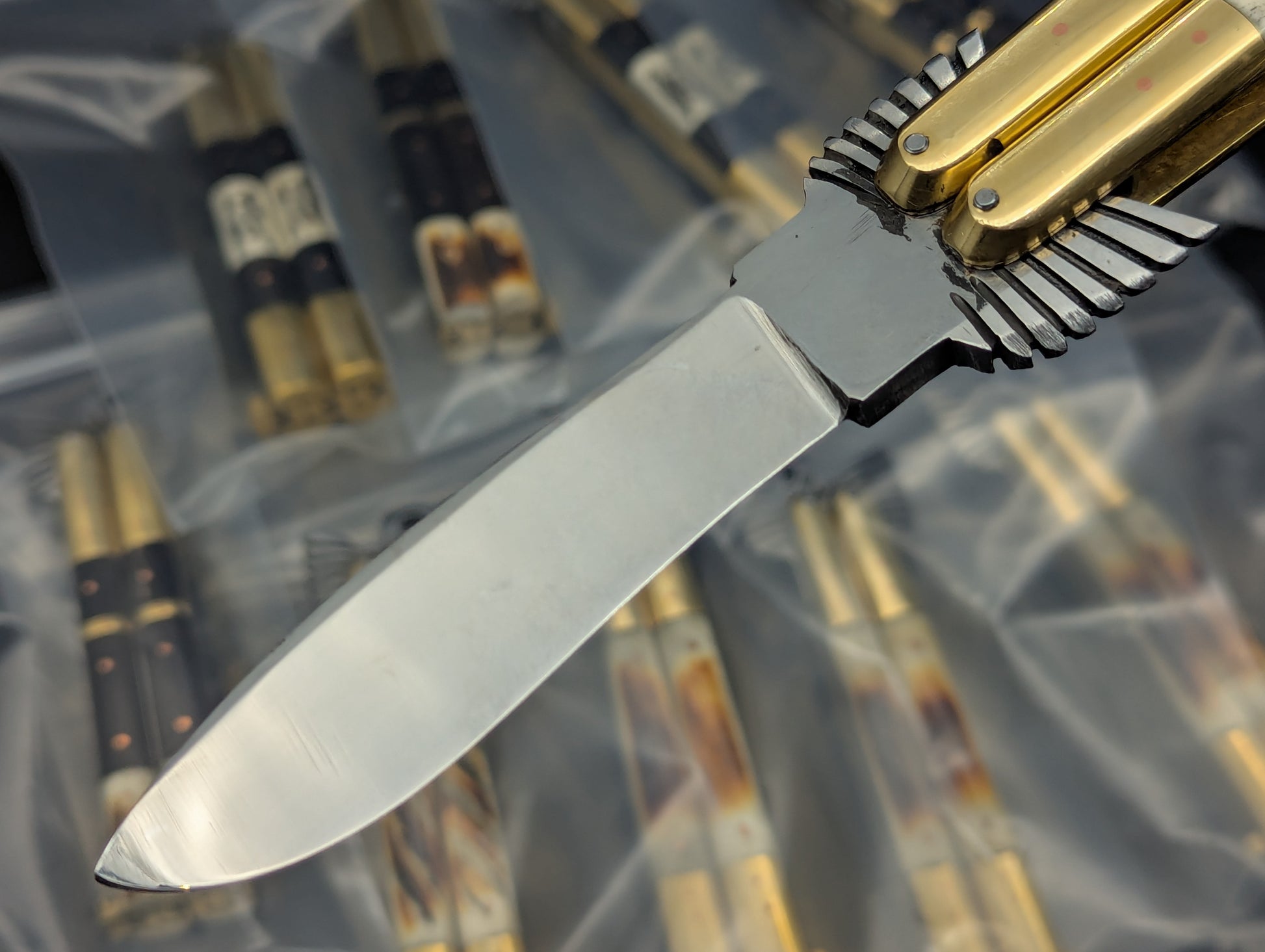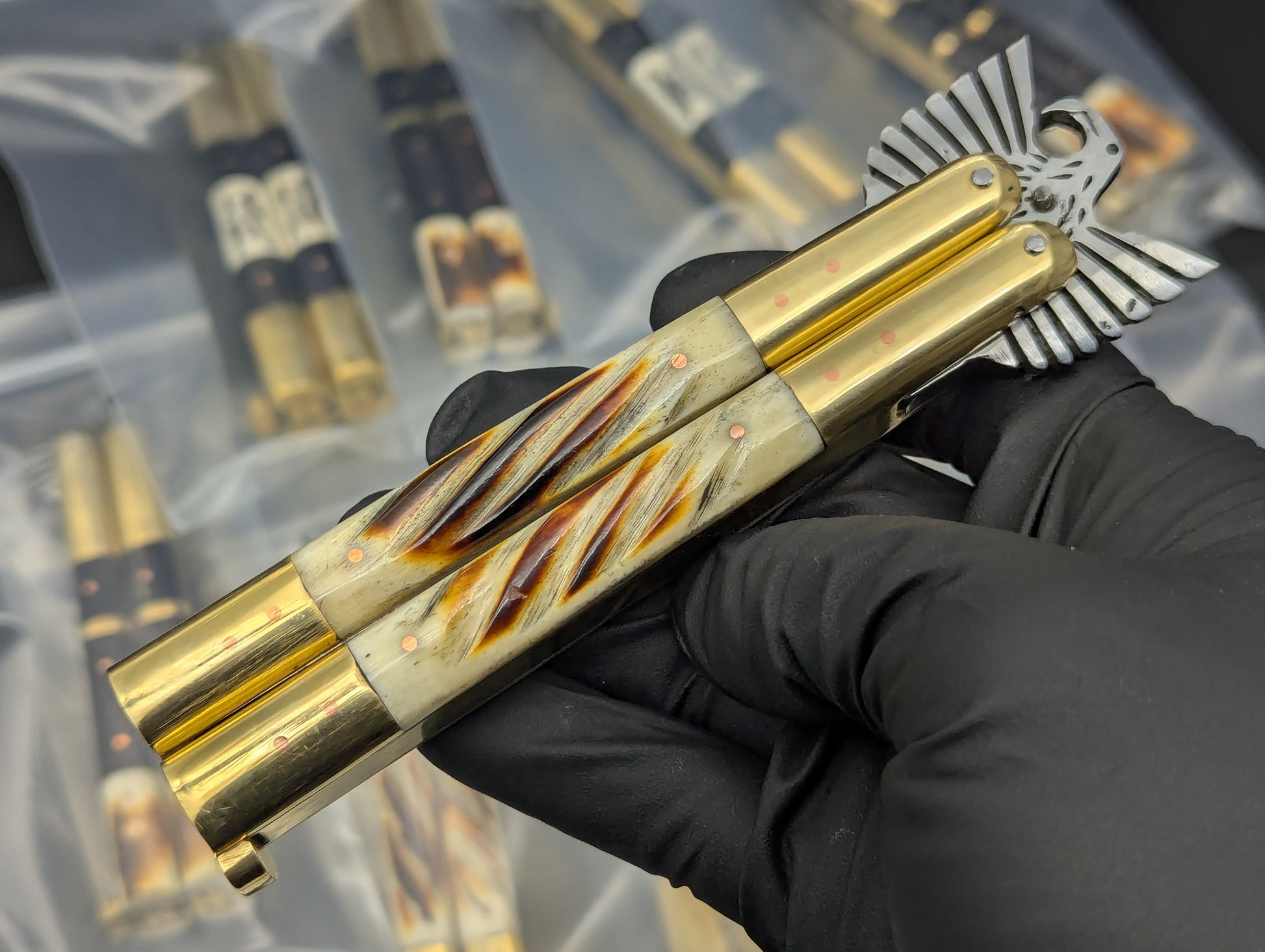 CARVED EAGLE TANG FHM BALISONG IN 22CM OVERALL LENGTH. THIS VERSION FEATURES A SOLID BRASS HOUSING WITH POLISHED BRASS TOP AND BOTTOM BOLSTERS WITH BURNT BONE CARVED TWIST TEXTURED BONE SCALES. BIG BEEFY 4" BOLO DROP POINT BLADE. SOLID BRASS SAFETY LATCH WITH MAKERS MARK. HANDMADE BALISONG FROM TAAL BATANGAS PHILIPPINES.