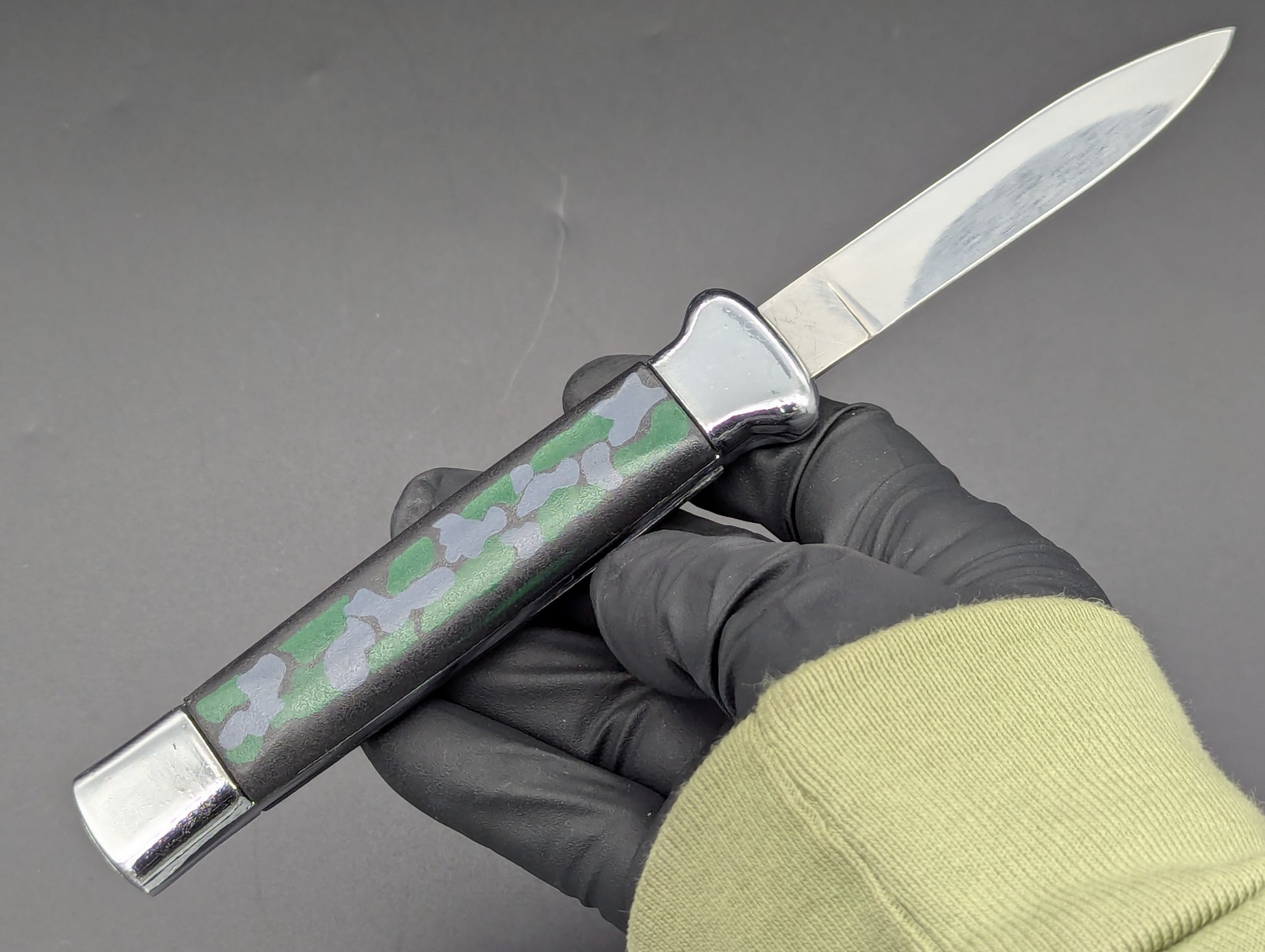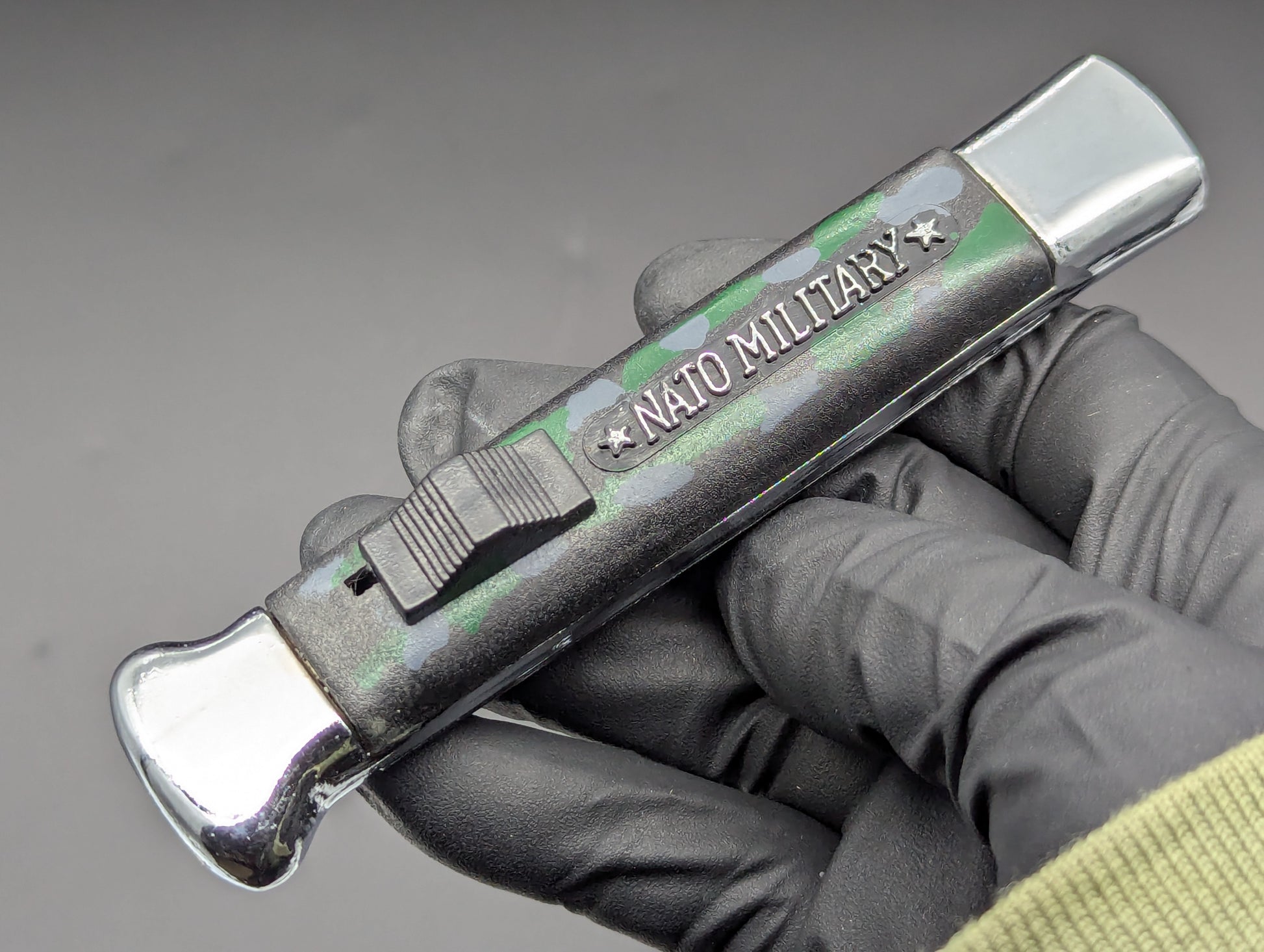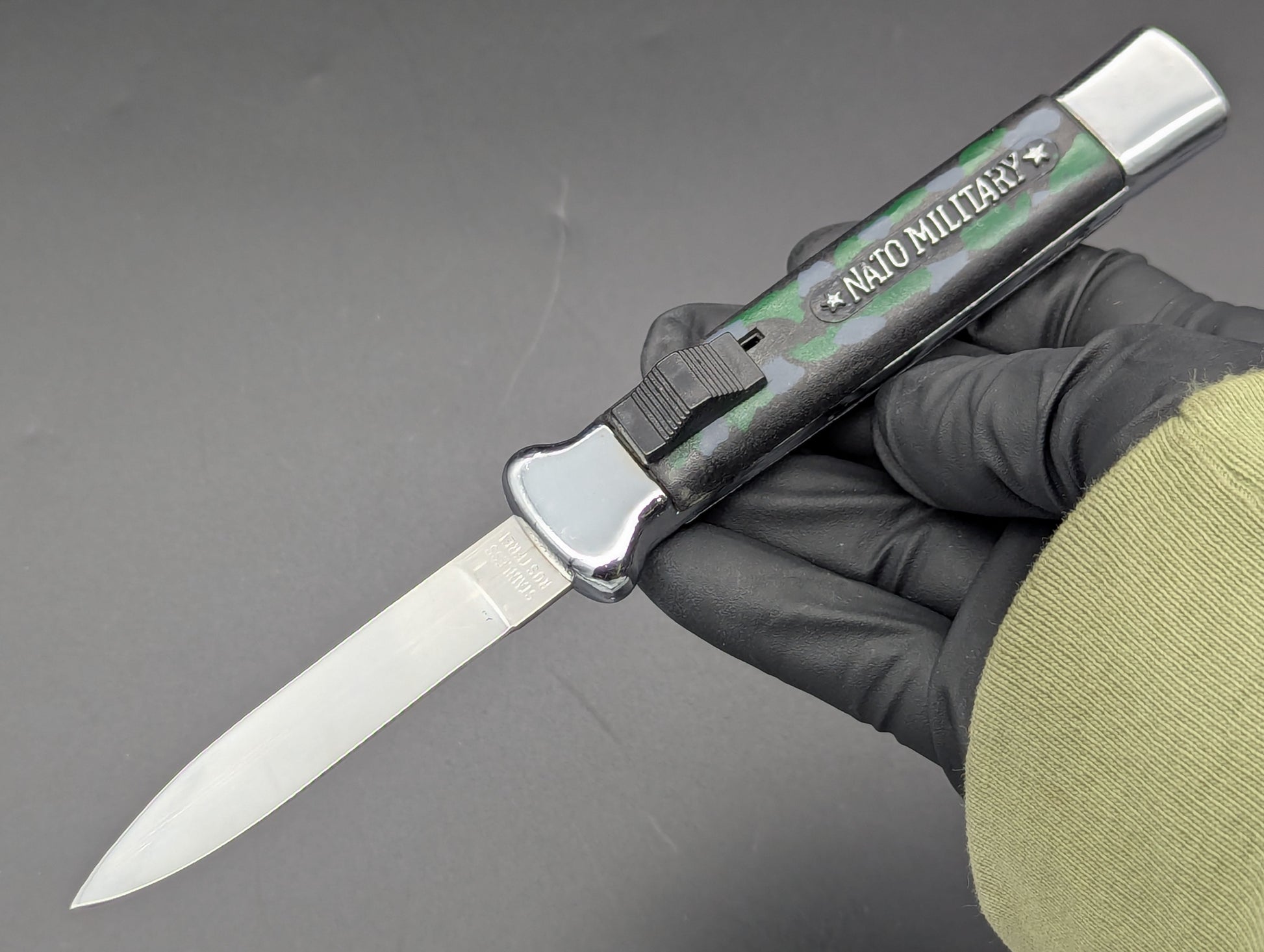 OLD SCHOOL MEDIUM WEIGHT NATO MILITARY OTF KNIFE. GREEN AND GREY CAMO SCALES WITH CHROMED BOLSTERS. HIGHER QUALITY MEDIUM WEIGHT VERSION. CLEAN BLADE AND HANDLE. WORKS PERFECTLY. THESE ARE JUST COLLECTIBLES THE OLD MECHANISMS THAT OPEN AND CLOSE THESE ARE SOMEWHAT DELICATE! DO NOT RAPID FIRE THESE, YOU WILL WARM UP THE METAL OF THE SPRING MEDICAL AND THEY WILL WARP AND EVENTUALLY MISFIRE! GREAT COLLECTIBLE ITEM!