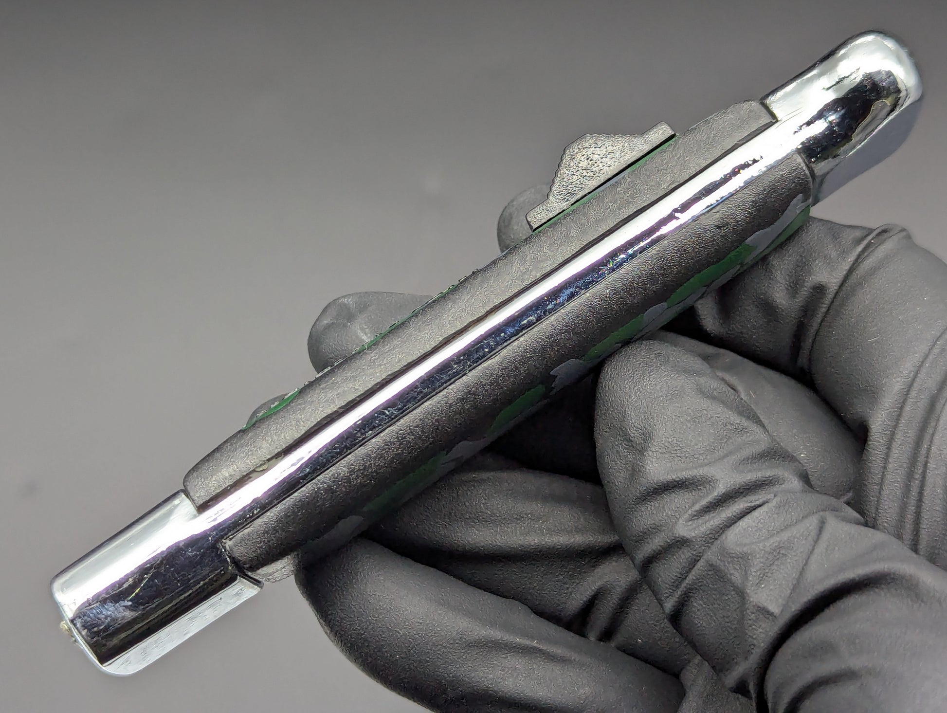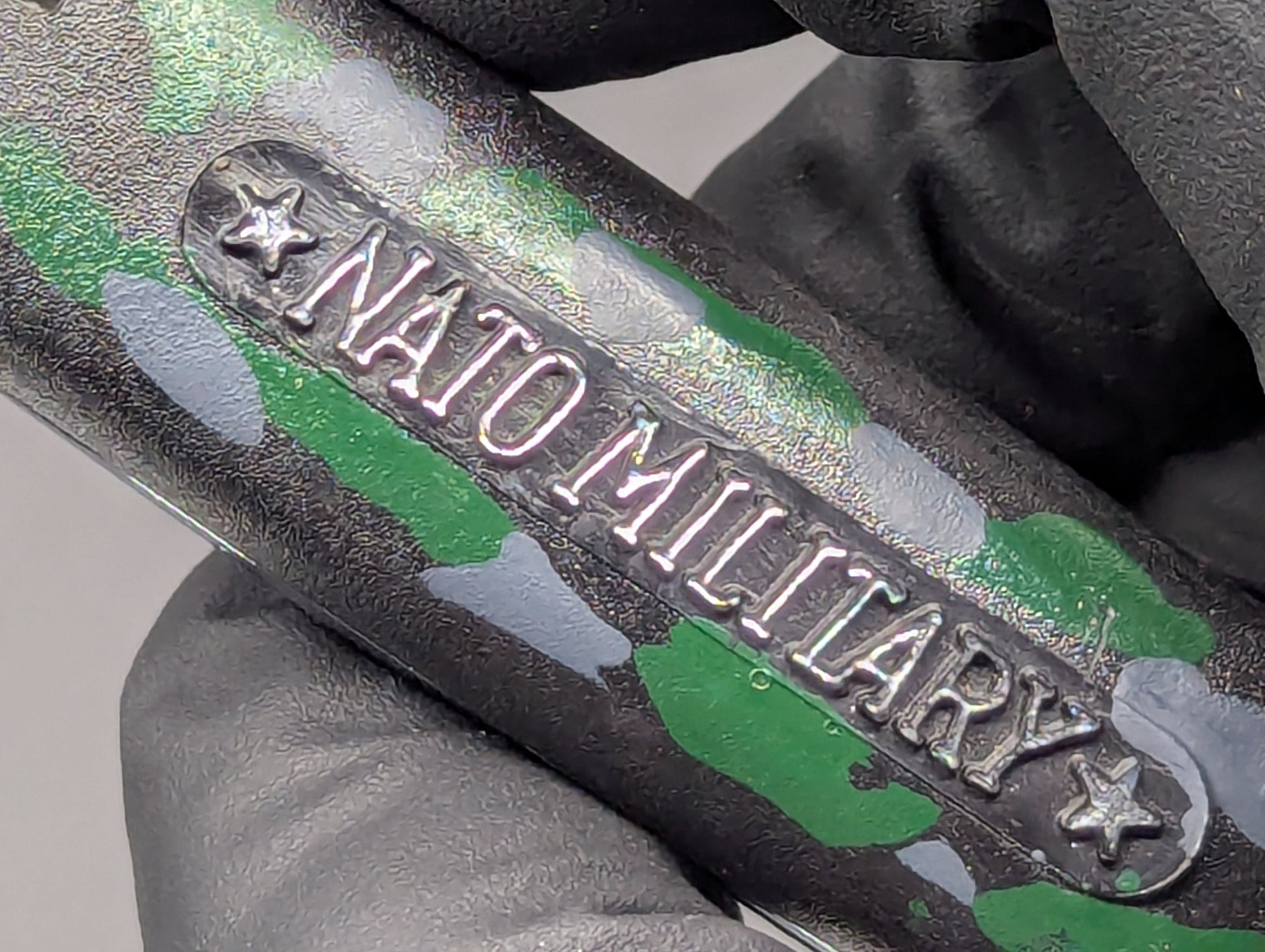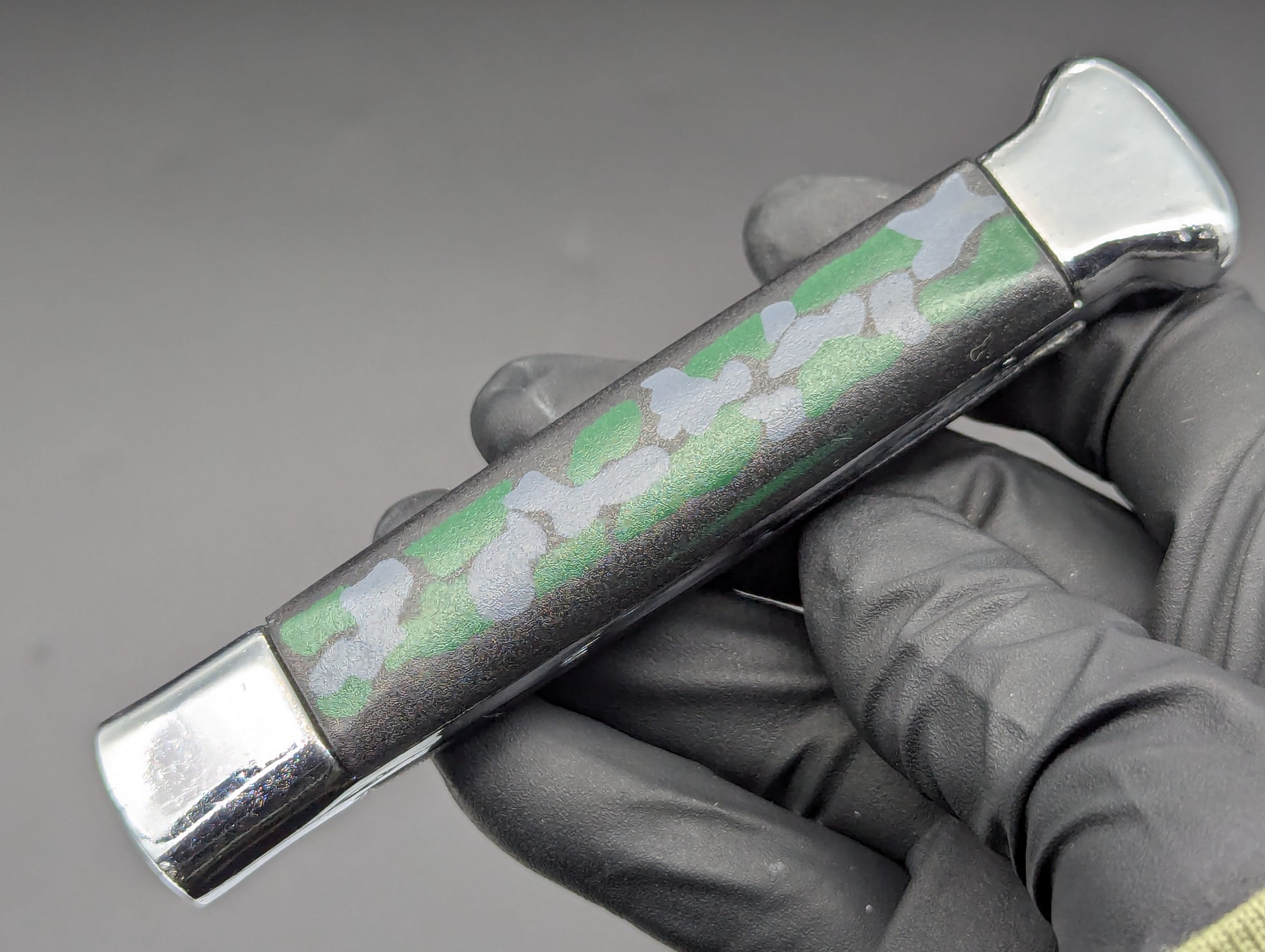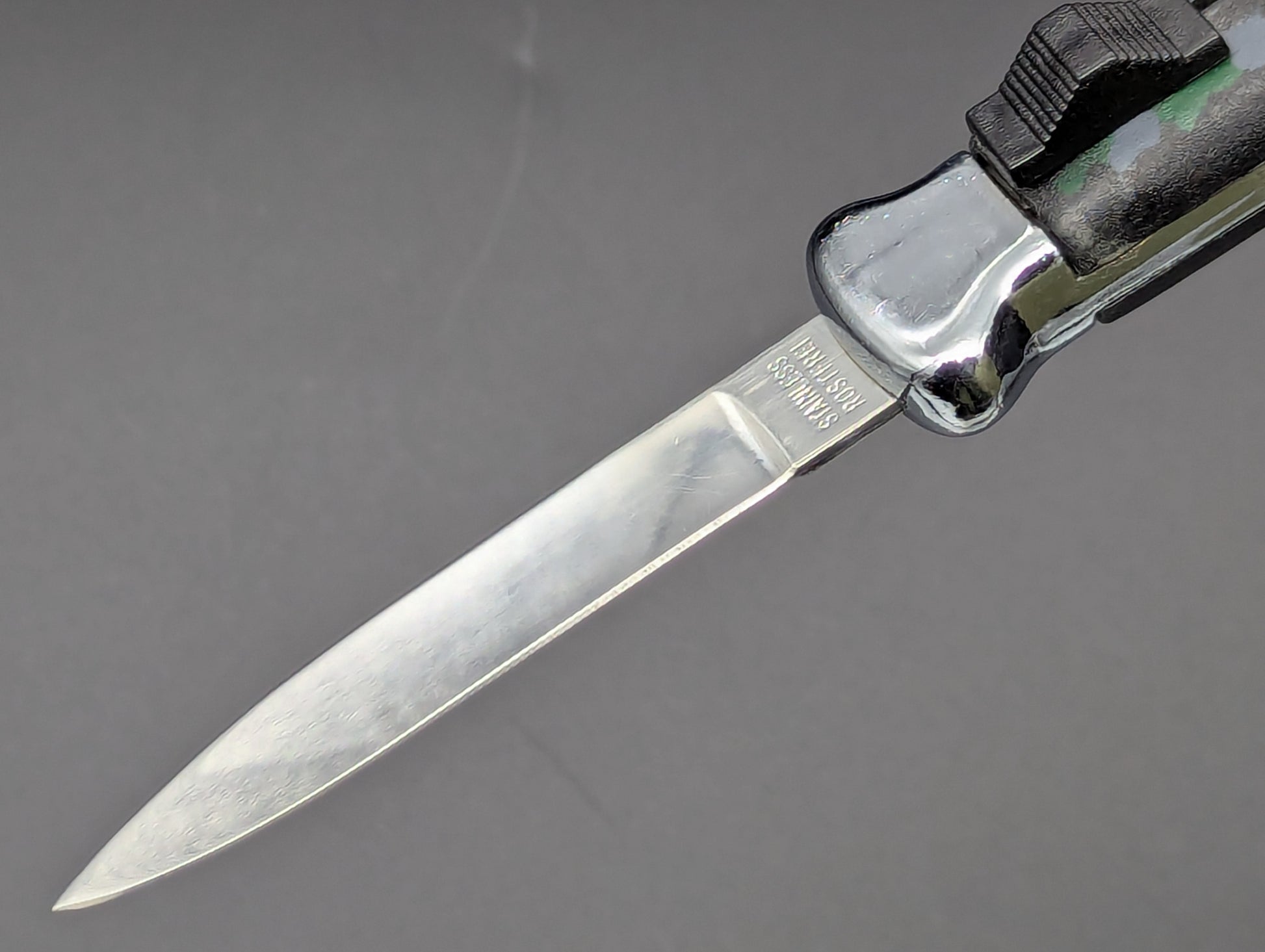 OLD SCHOOL MEDIUM WEIGHT NATO MILITARY OTF KNIFE. GREEN AND GREY CAMO SCALES WITH CHROMED BOLSTERS. HIGHER QUALITY MEDIUM WEIGHT VERSION. CLEAN BLADE AND HANDLE. WORKS PERFECTLY. THESE ARE JUST COLLECTIBLES THE OLD MECHANISMS THAT OPEN AND CLOSE THESE ARE SOMEWHAT DELICATE! DO NOT RAPID FIRE THESE, YOU WILL WARM UP THE METAL OF THE SPRING MEDICAL AND THEY WILL WARP AND EVENTUALLY MISFIRE! GREAT COLLECTIBLE ITEM!