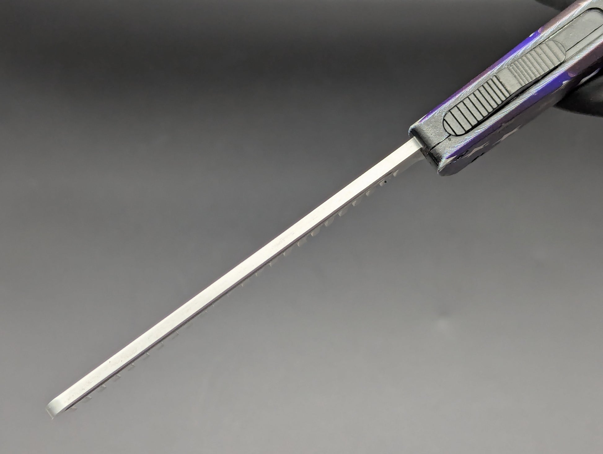 LOTS OF OLD SCHOOL FUN WITH A NEW SCHOOL TWIST! NICE HEAVYWEIGHT ALUMINUM ZINC BODY AND STAINLESS COMB "BLADE". DUAL ACTION AUTOMATIC OPENING AND CLOSING ACTION WITH THE PUSH OF THE BUTTON! EACH INCLUDES BLACK NYLON SNAP ENCLOSURE CASE. OVERALL LENGTH: 9.5" COMB LENGTH: 3.75"