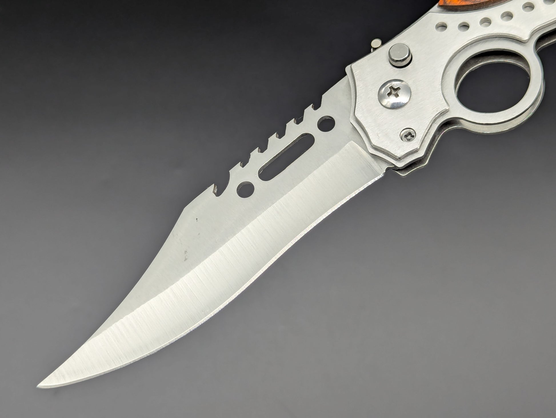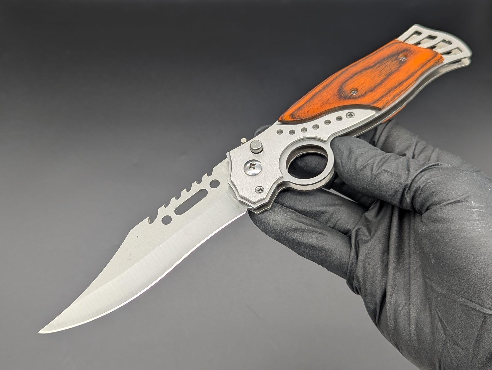 OLD SCHOOL ROSEWOOD SCALED AUTOMATIC OPENING KNIFE! YOU MAY OR MAY NOT REMEMBER THESE! SOLID STAINLESS STEEL CONSTRUCTION WITH ROSEWOOD SCALES AND FINGER RING "CIGAR CUTTER". SAFETY LOCK WORKS IN OPEN AND CLOSED POSITIONS! THIS IS A SIZABLE KNIFE! 9.5" OVERALL LENGTH. 4" BLADE LENGTH. EACH INCLUDES CLASSIC GREEN CAMOUFLAGE NYLON VELCRO ENCLOSED SHEATH