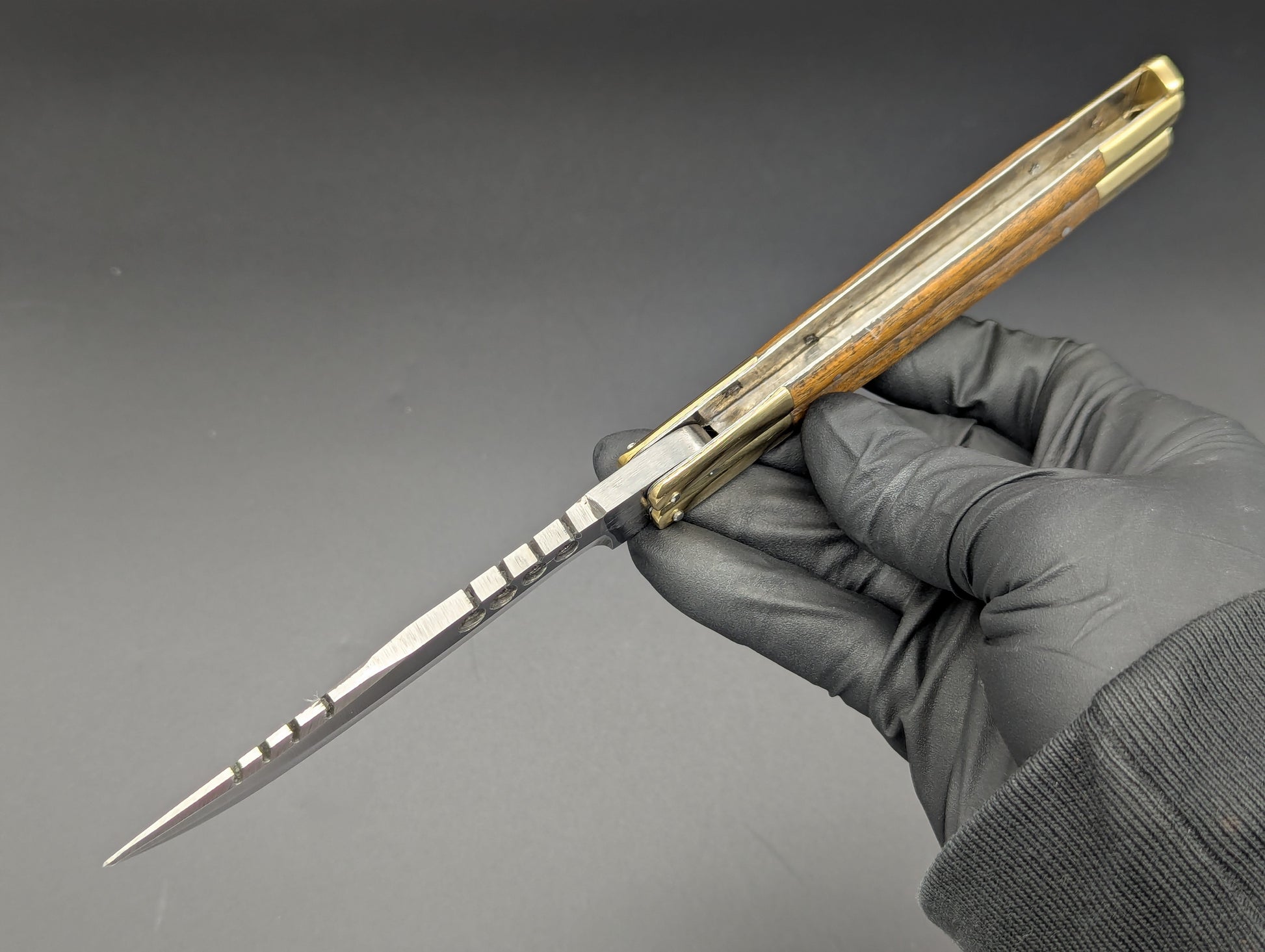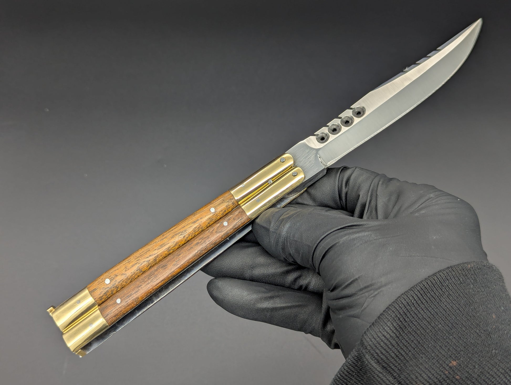 FRESHLY MADE IN THE PHILIPPINES. TAAL BATANGAS SPECIFICALLY. 9" OVERALL LENGTH TRADITIONAL HANDMADE BALISONG KNIVES. SLIM NARRAWOOD STYLE. THIS MODEL FEATURES A SINGLE EDGE CLIP POINT 4 HOLE RAMBO STYLE BLADE. BRASS, WOOD & STEEL. SIMPLICITY AT IT'S FINEST