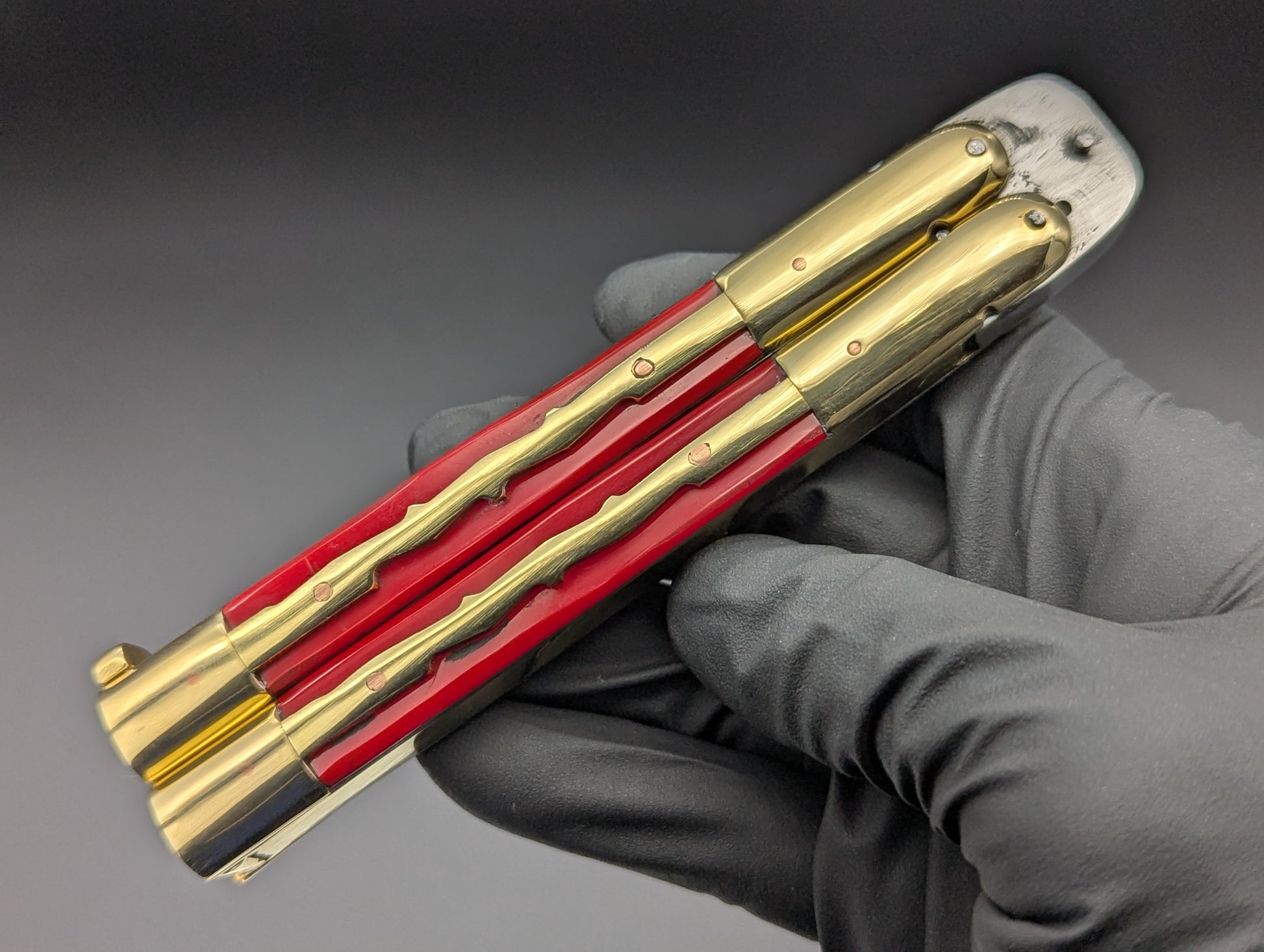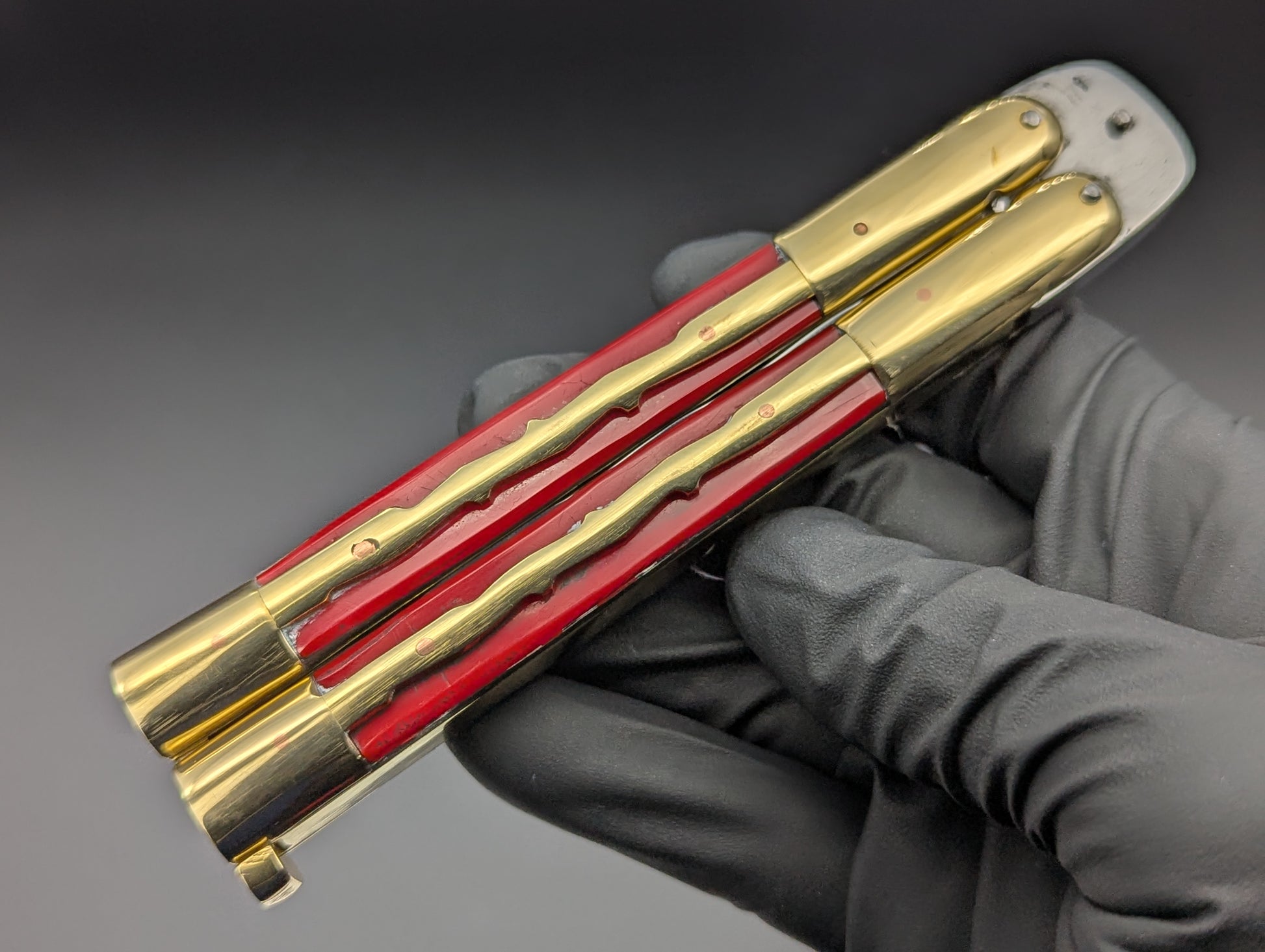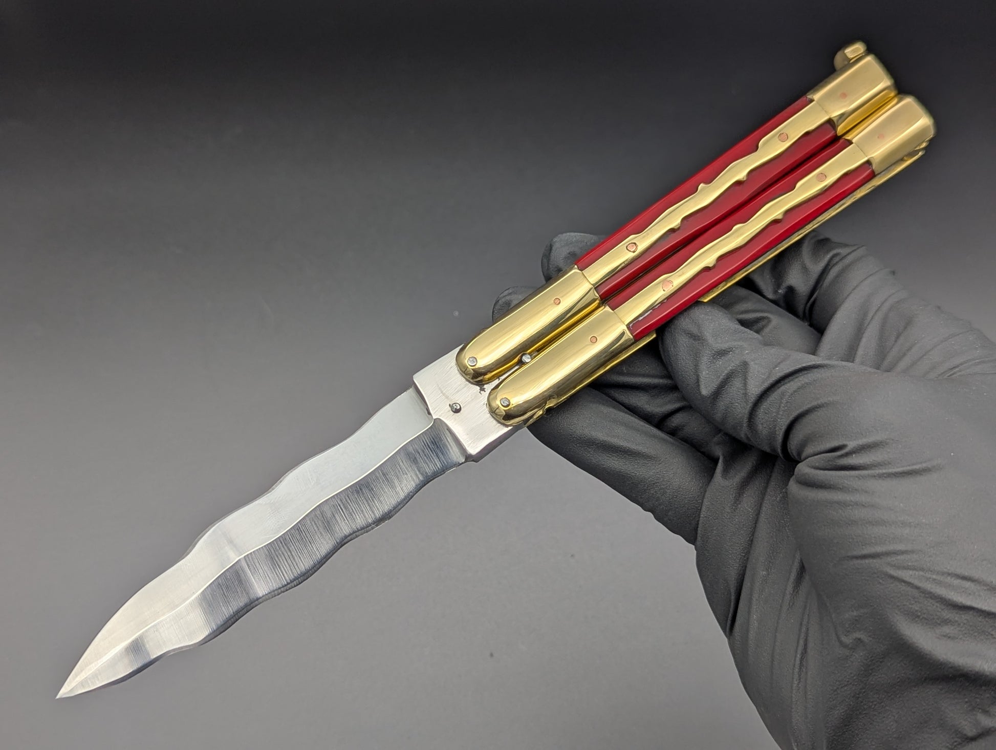 JUST IN! 9" OL PHILIPPINES HANDMADE BALISONG WITH DOUBLE EDGED KRIS BLADE. TRADITIONAL KALAPKUP HANDLE DESIGN WITH BRASS TRIBAL PATTERN OVERLAYING BLOOD RED COMPOSITE SCALES WITH BRASS EVERYTHING! TOP SHELF "SPECIAL" FHM MODEL WEIGHING IN AT 210 GRAMS.