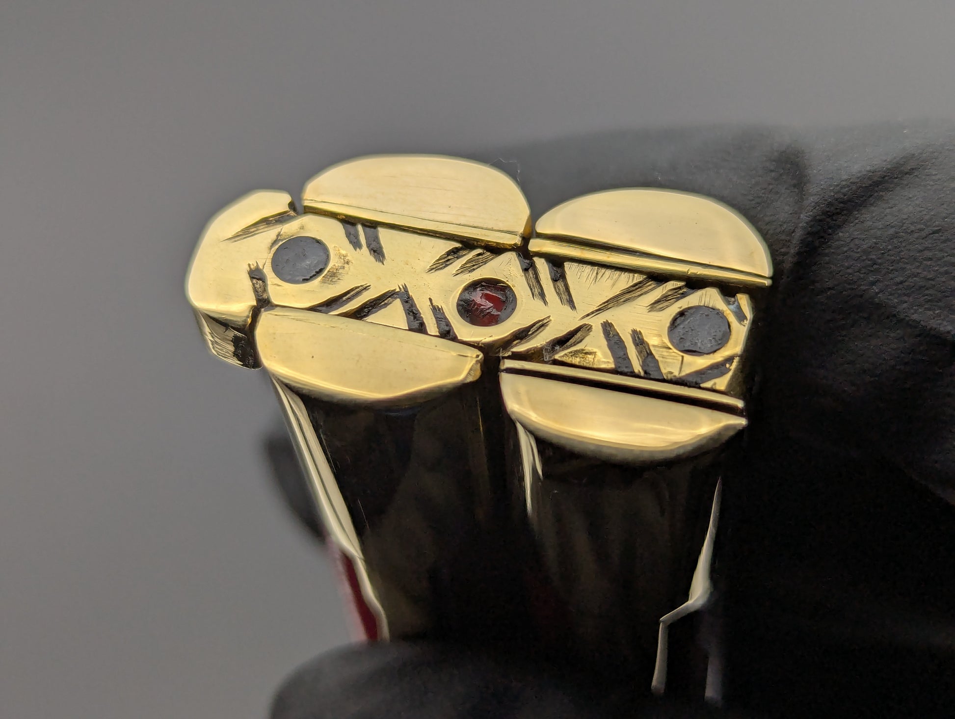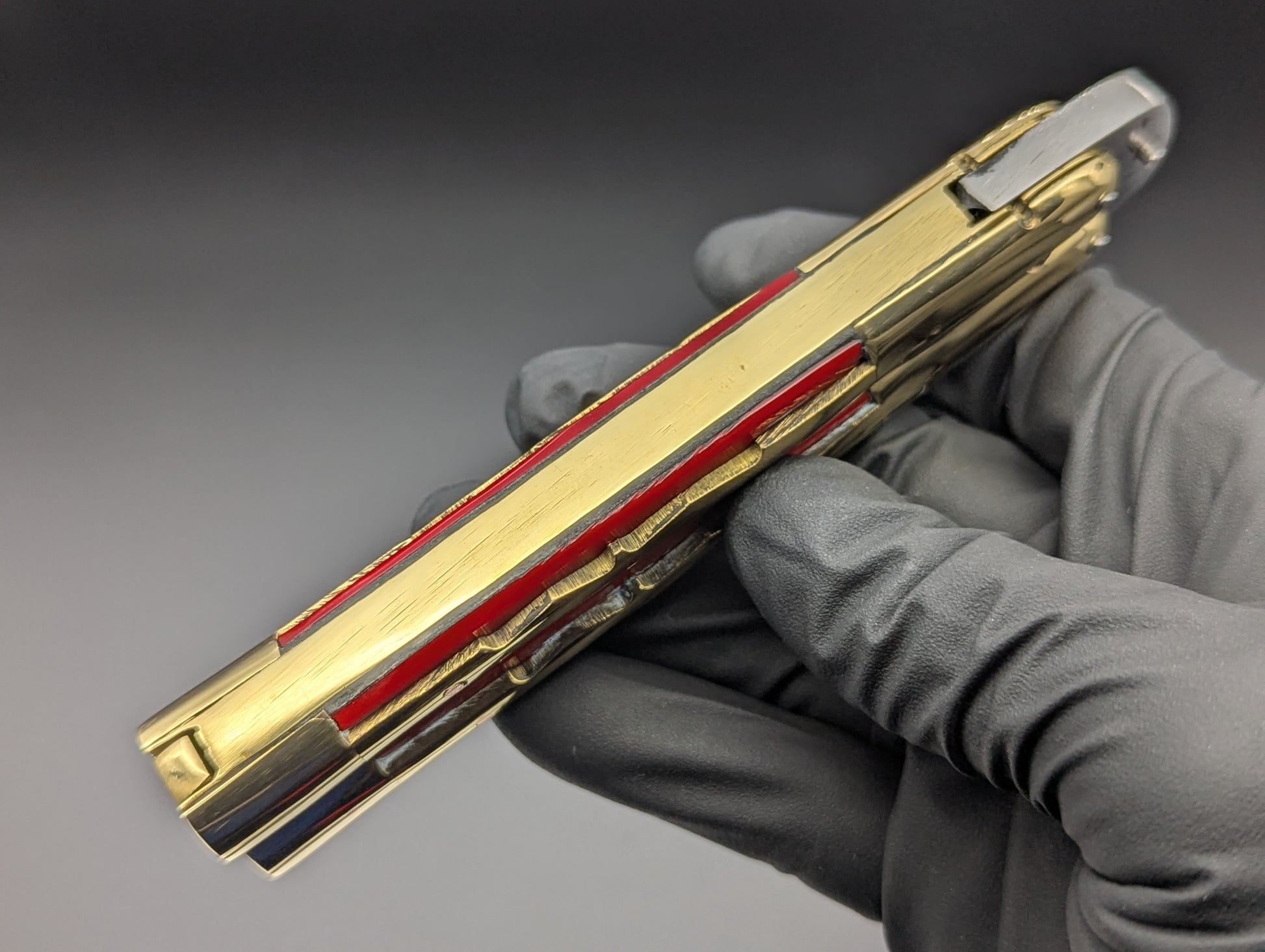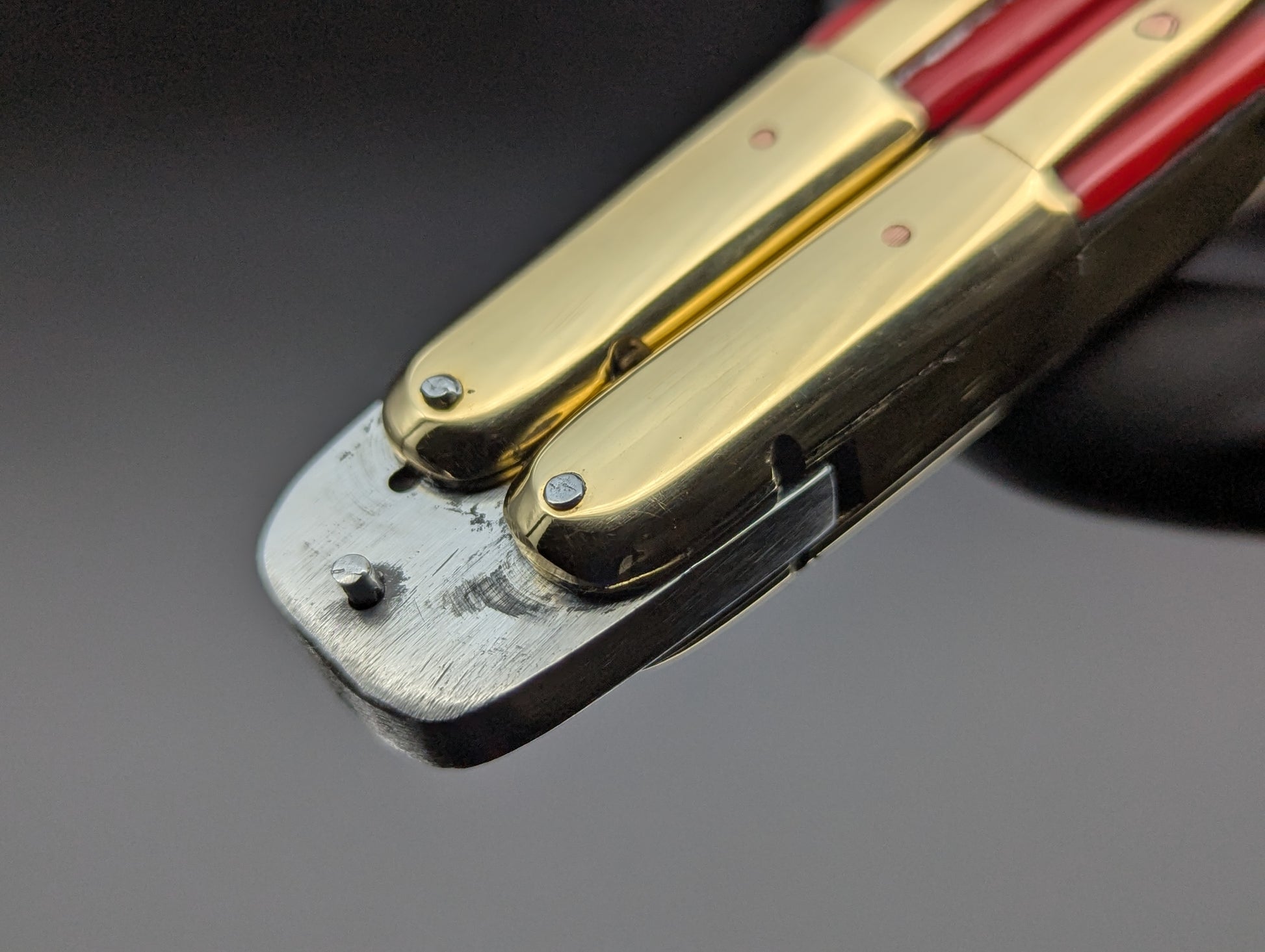 JUST IN! 9" OL PHILIPPINES HANDMADE BALISONG WITH DOUBLE EDGED KRIS BLADE. TRADITIONAL KALAPKUP HANDLE DESIGN WITH BRASS TRIBAL PATTERN OVERLAYING BLOOD RED COMPOSITE SCALES WITH BRASS EVERYTHING! TOP SHELF "SPECIAL" FHM MODEL WEIGHING IN AT 210 GRAMS.