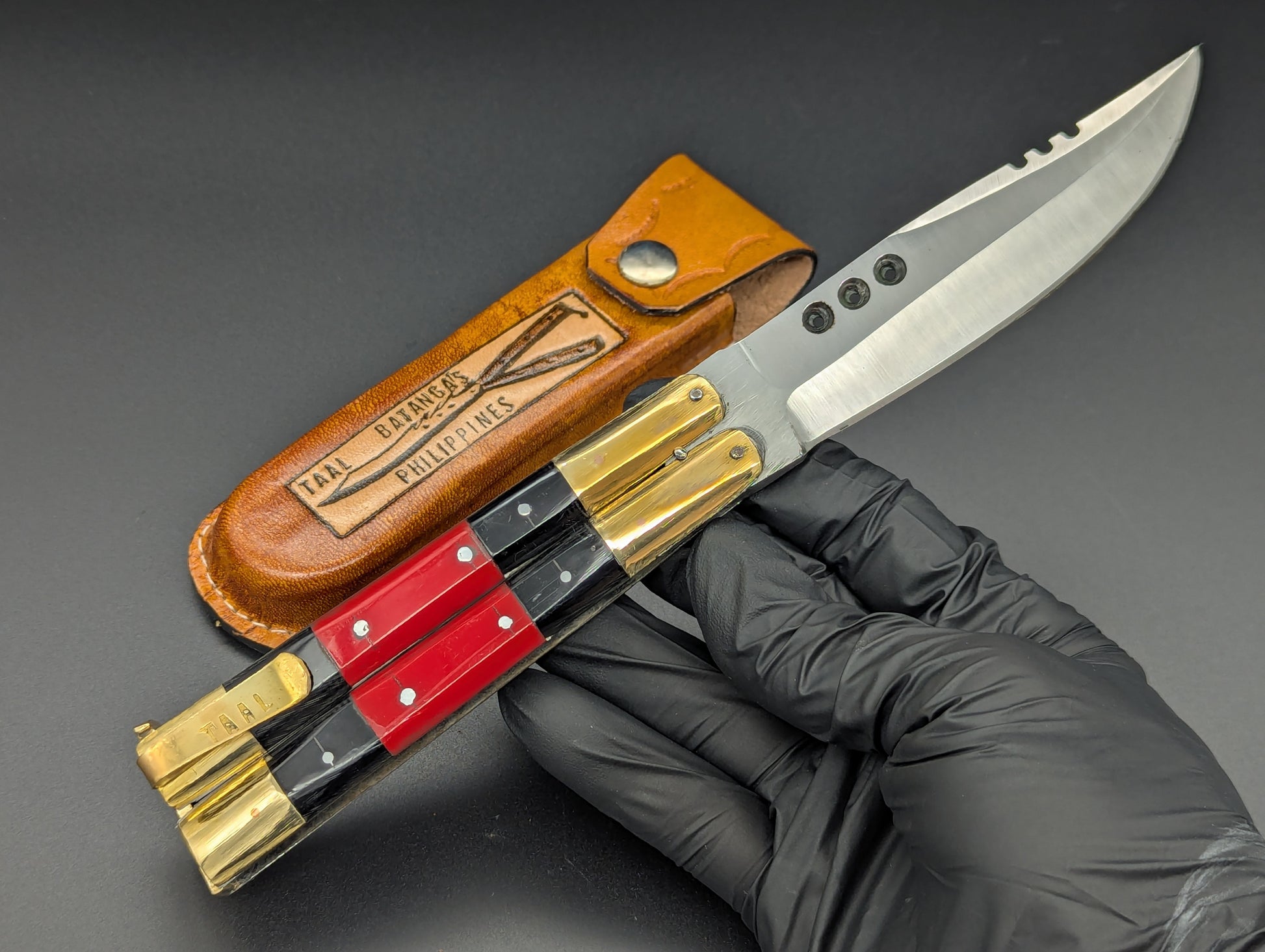 FRESH STOCK PHILIPPINES HANDMADE BALISONG. 9" OL RED & BLACK STACKED COMPOSITE SCALES. BRASS HANDLES & SAFETY LATCH. THIS MODEL FEATURES A PINNED BRASS POCKET CLIP. WIDE 4" STEEL "RAMBO " STYLE CLIP POINT BLADES. ALSO INCLUDES HANDMADE TAAL BATANGAS BALISONG LEATHER SHEATH. COLORS MAY VARY FROM BLACK TO BROWN SHEATHS FYI..